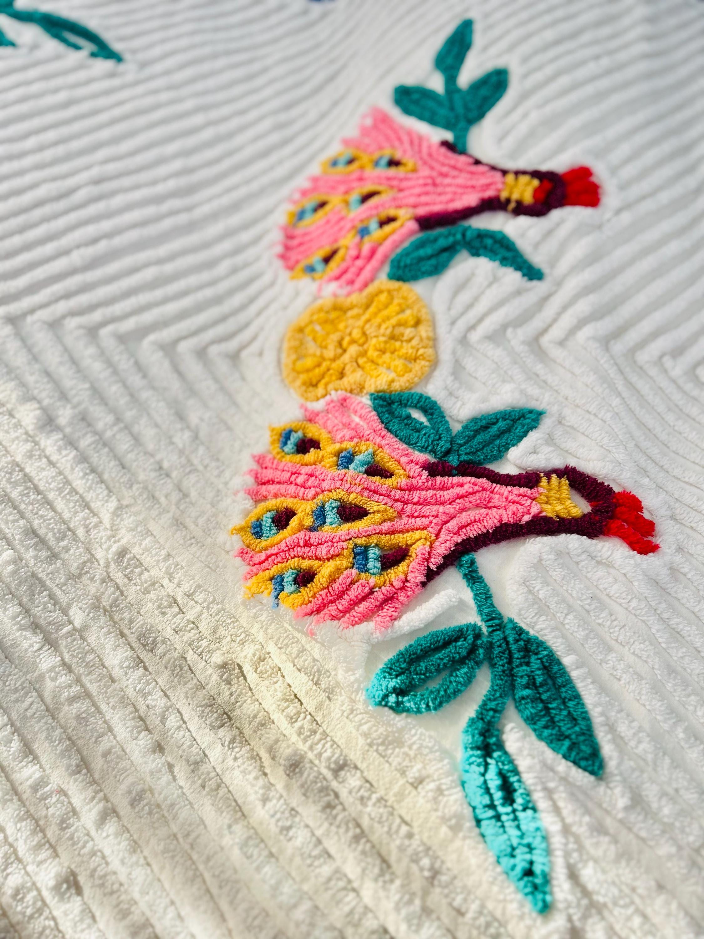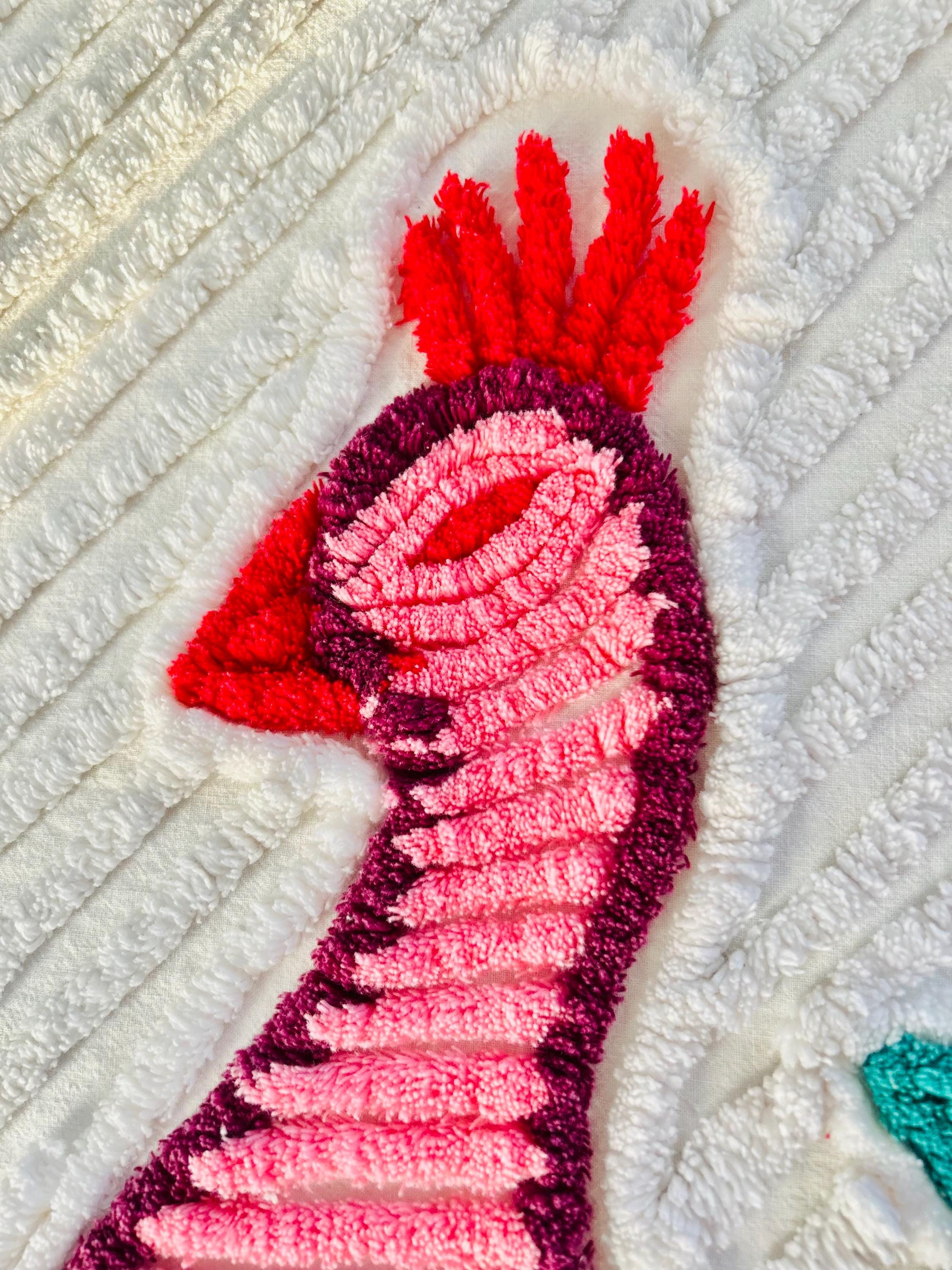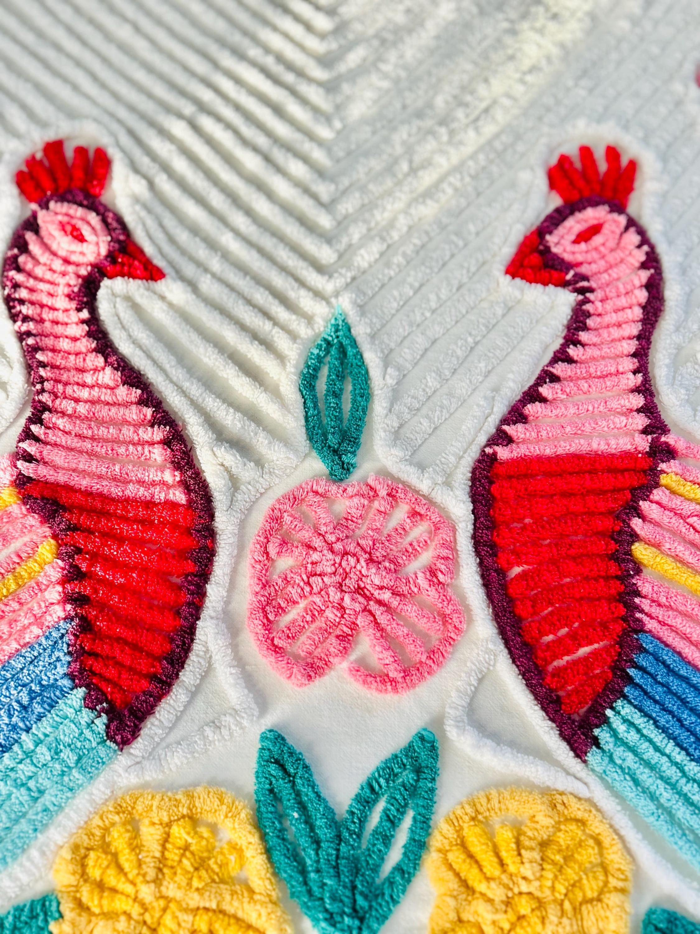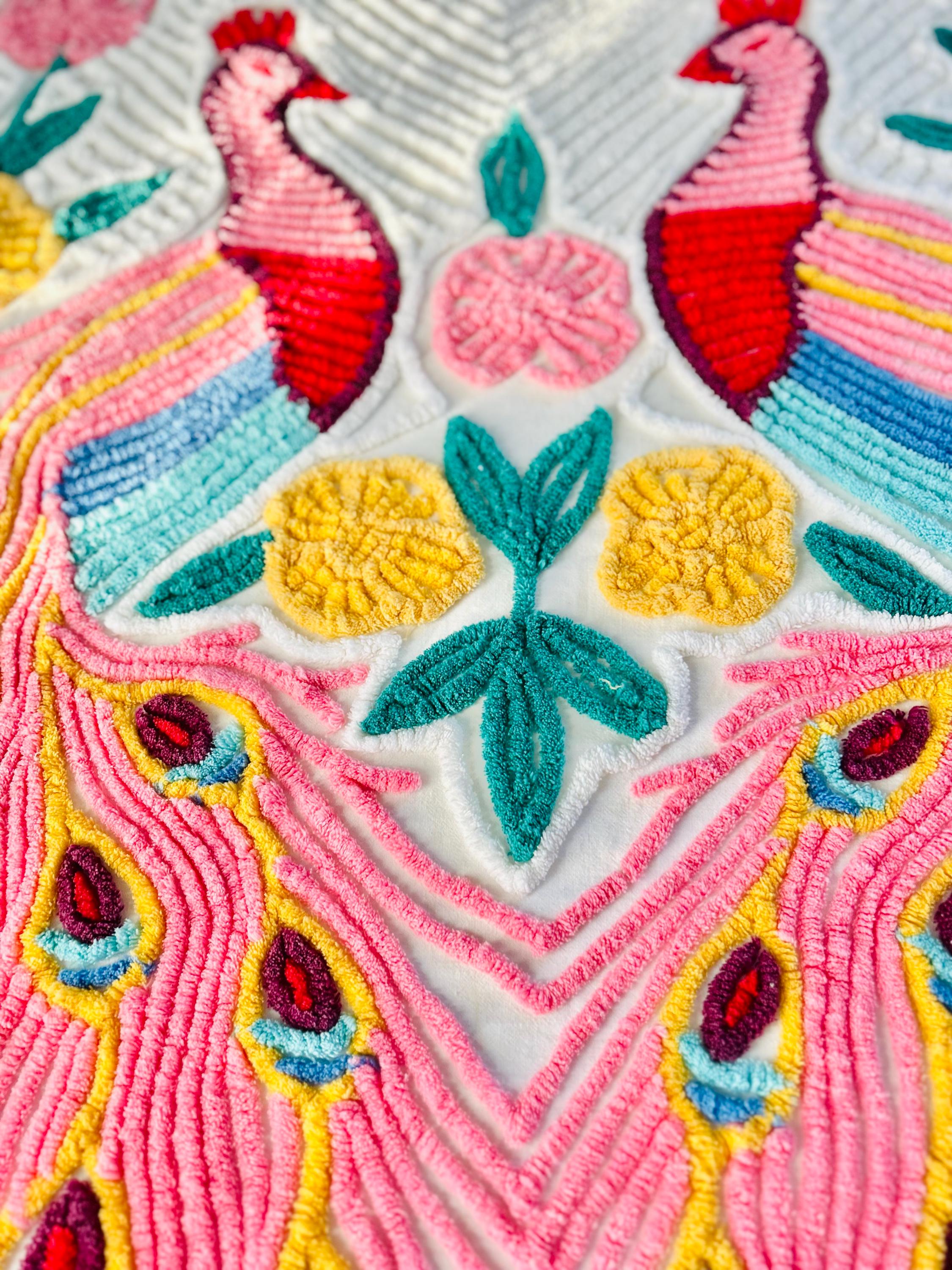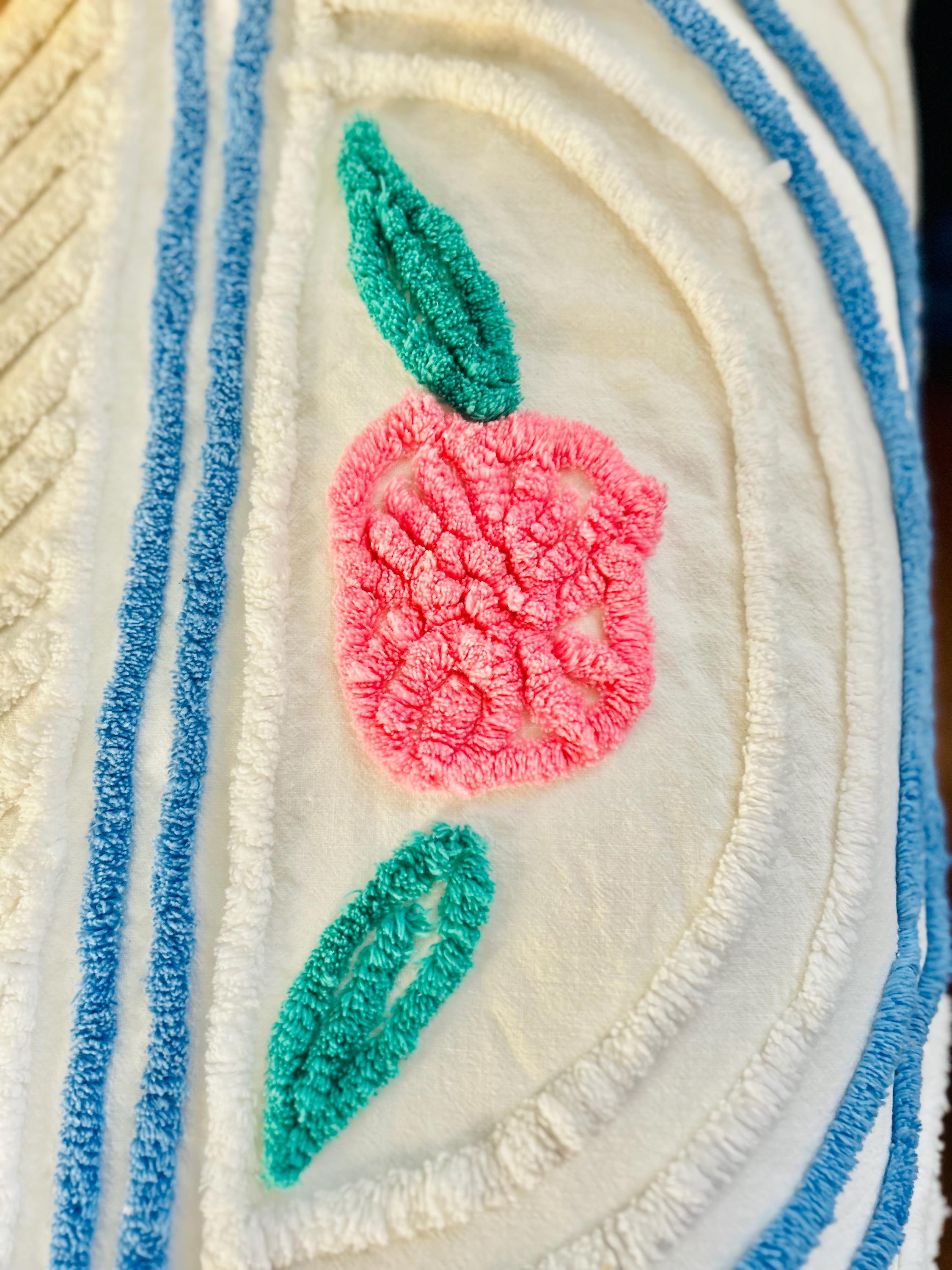This Double Peacock Chenille bedspread is circa 1950s-1960s and is bright and fluffy all over with no bald spots, holes or stains. The top is straight across while the bottom two edges are curved (see photos).