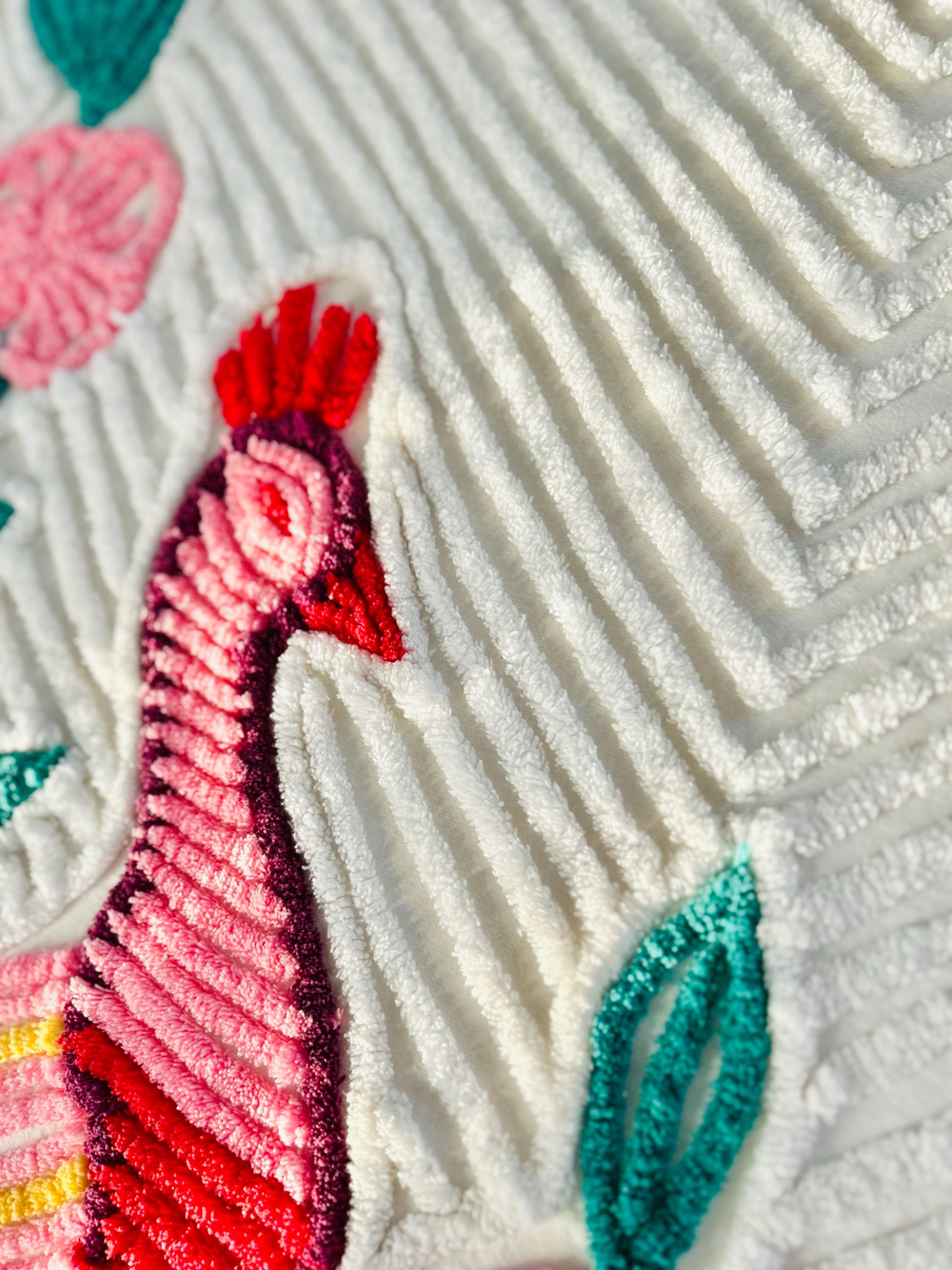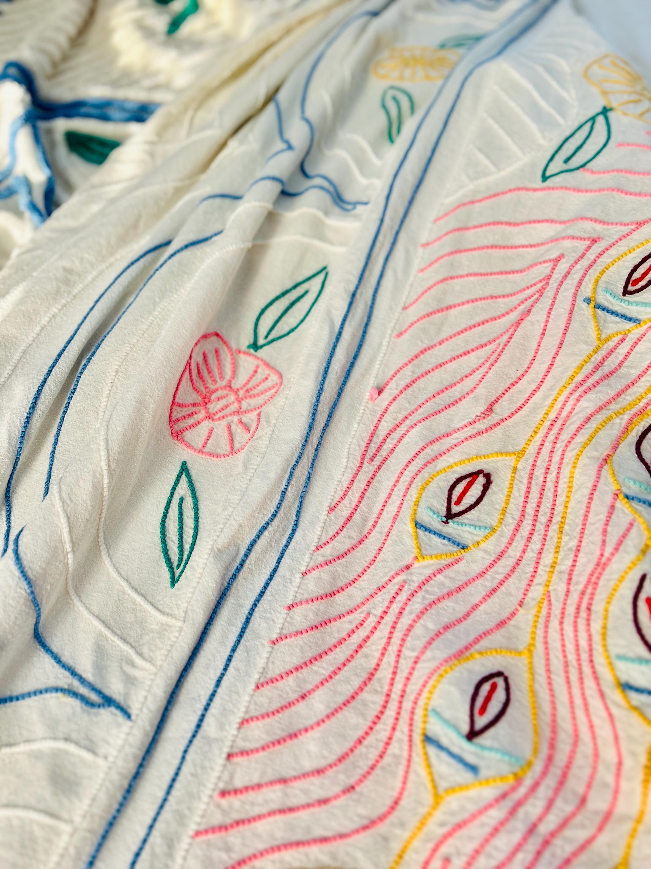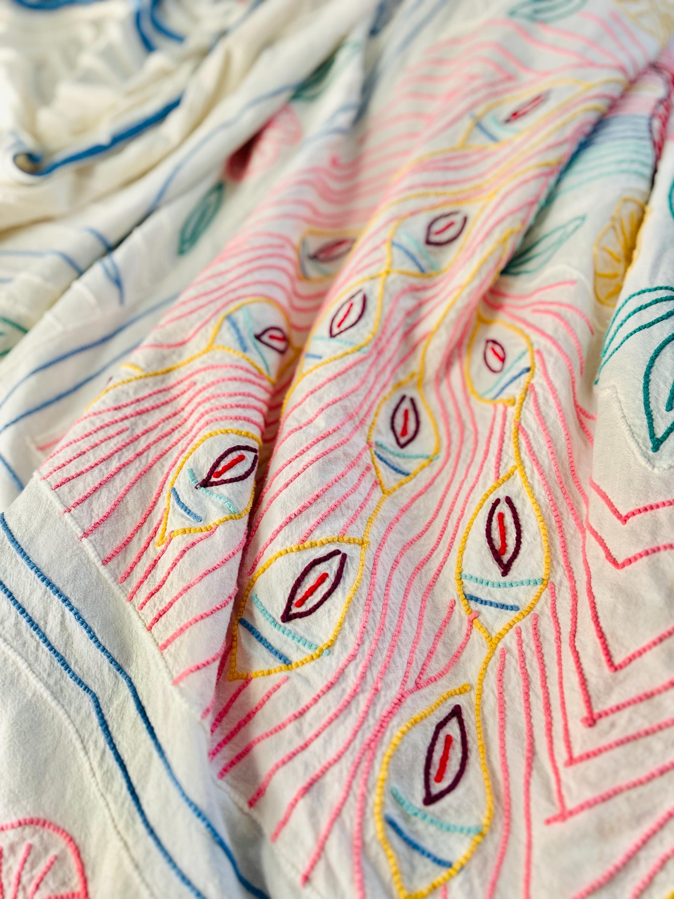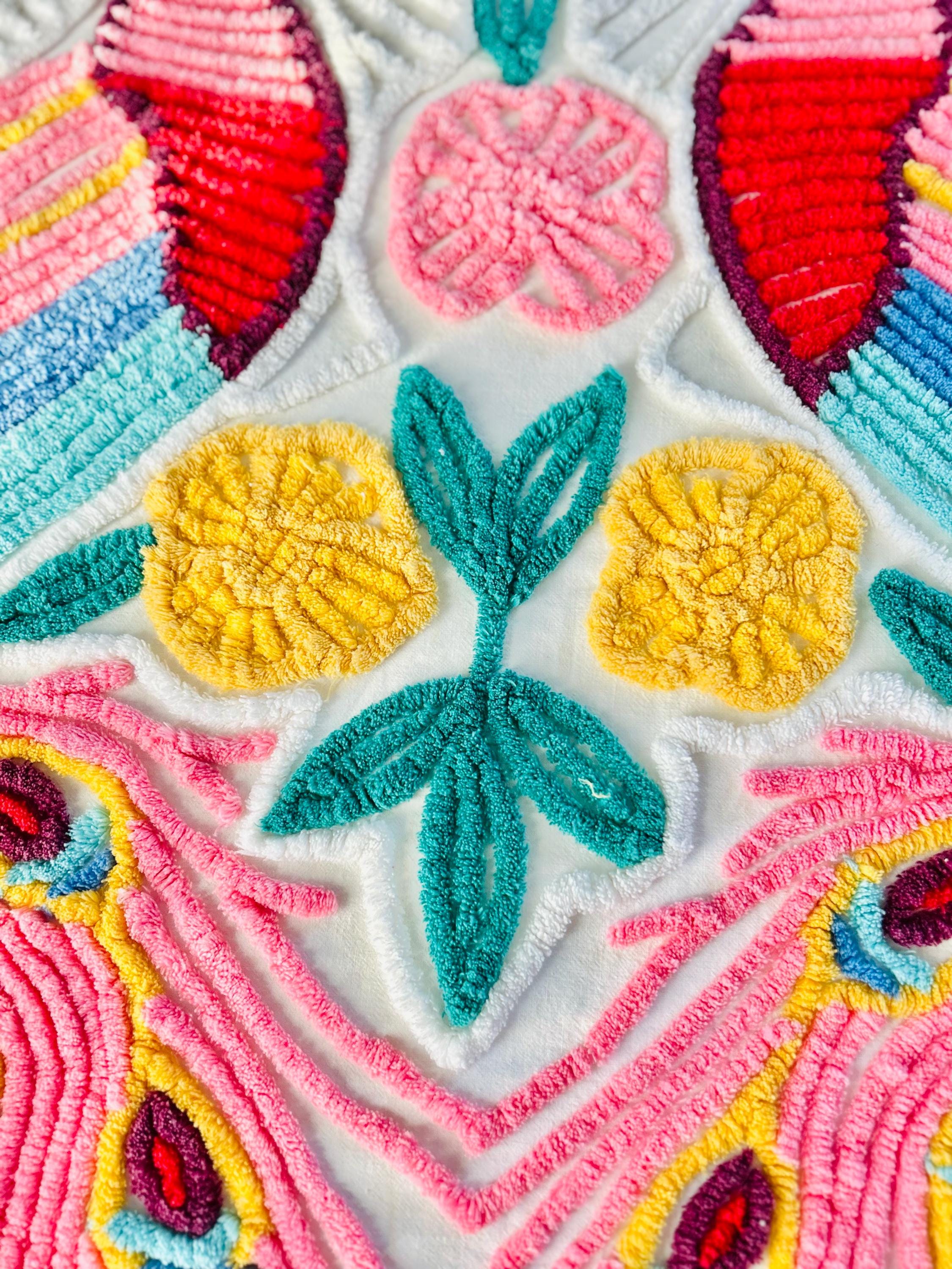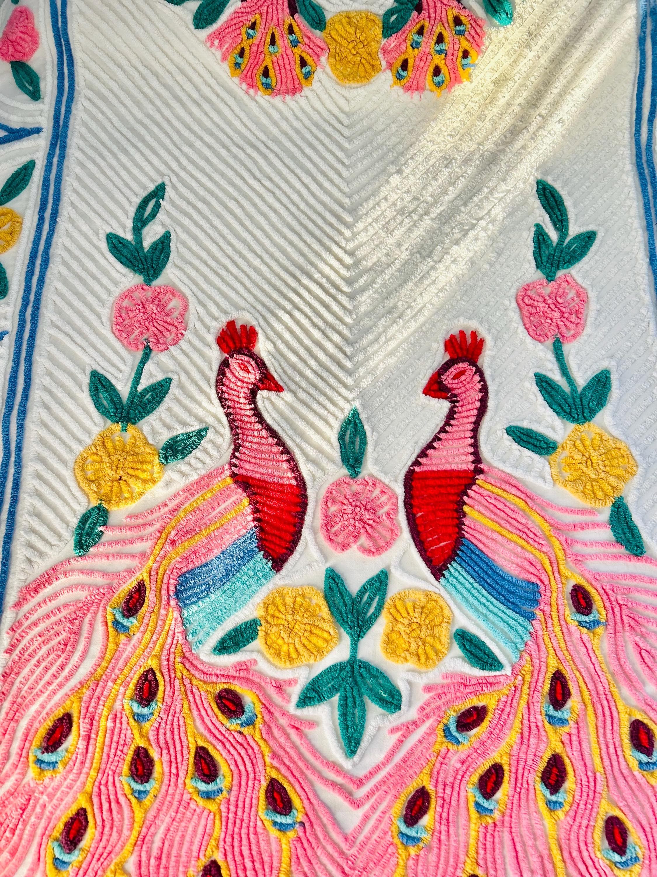 This Double Peacock Chenille bedspread is circa 1950s-1960s and is bright and fluffy all over with no bald spots, holes or stains. The top is straight across while the bottom two edges are curved (see photos).