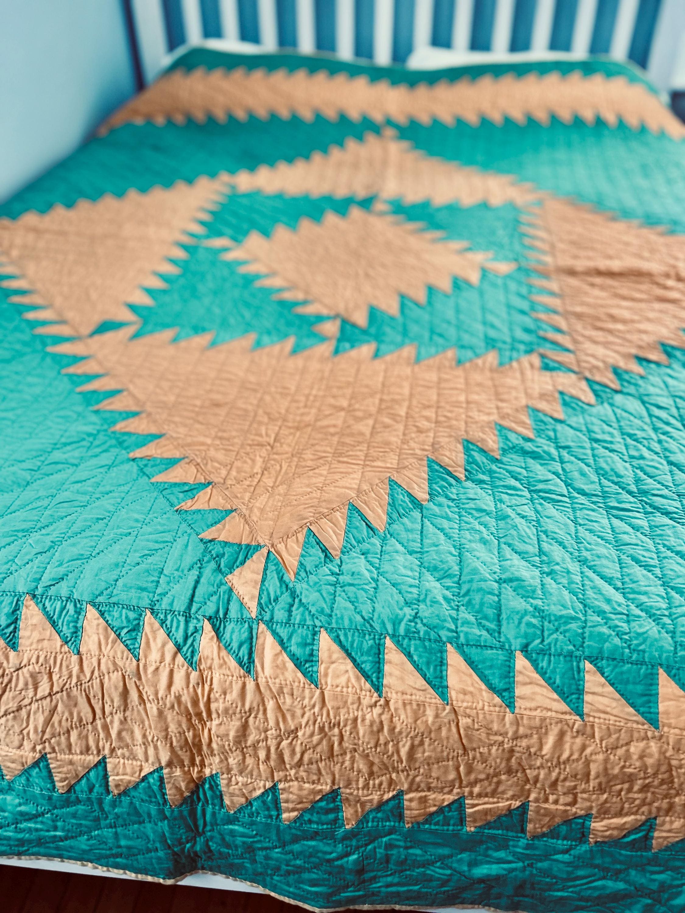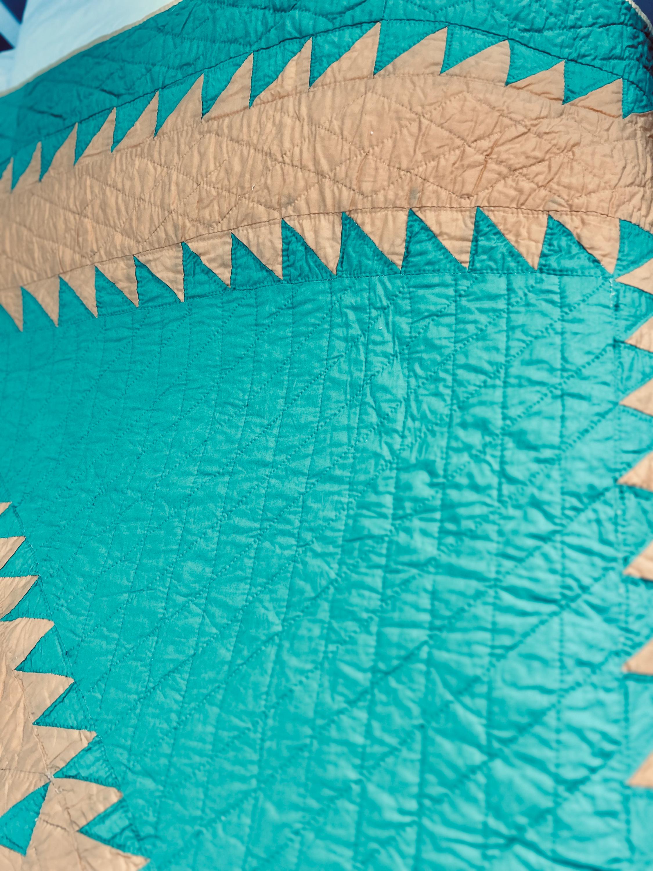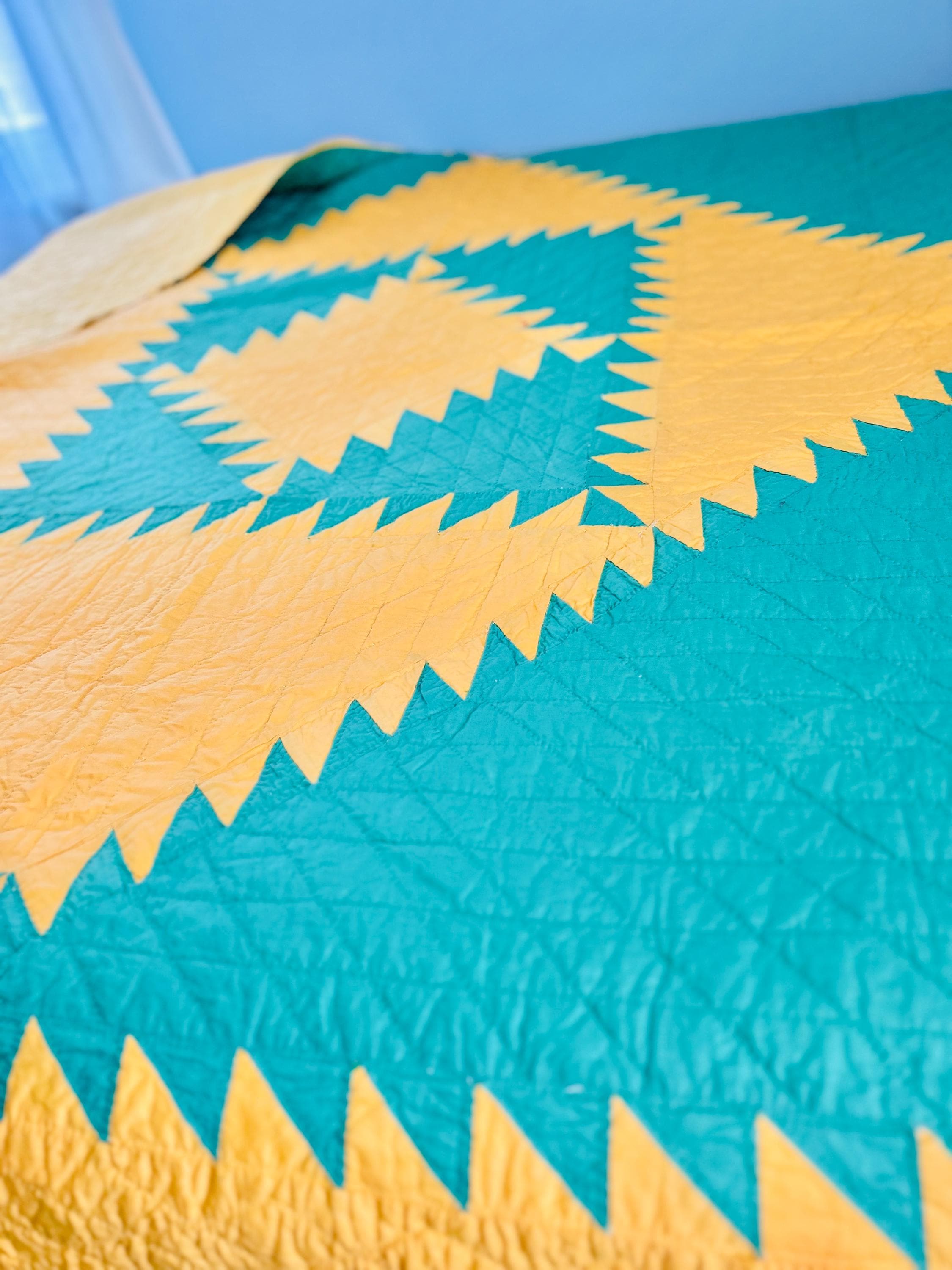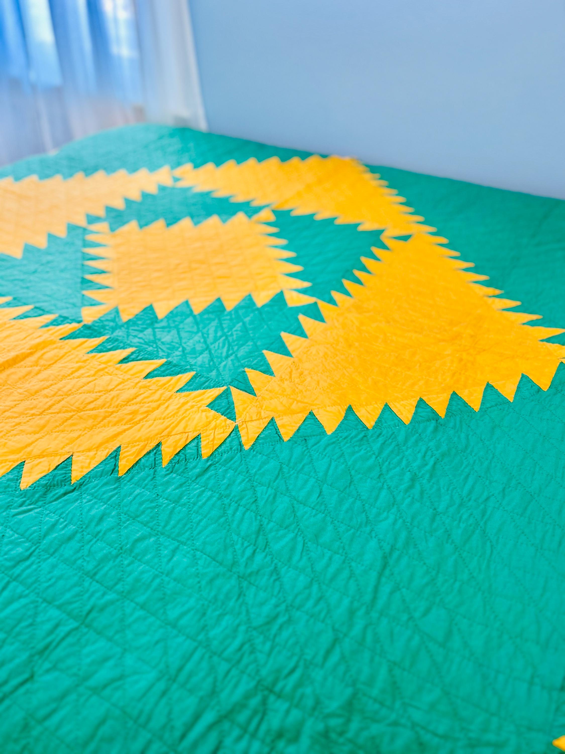 This Green and Yellow Sawtooth Quilt, 1910-1930s, has been precisely pieced and hand-quilted. The hand-quilting is in outlines of the patchwork and in diamonds in the body as well as along the four-sided border.