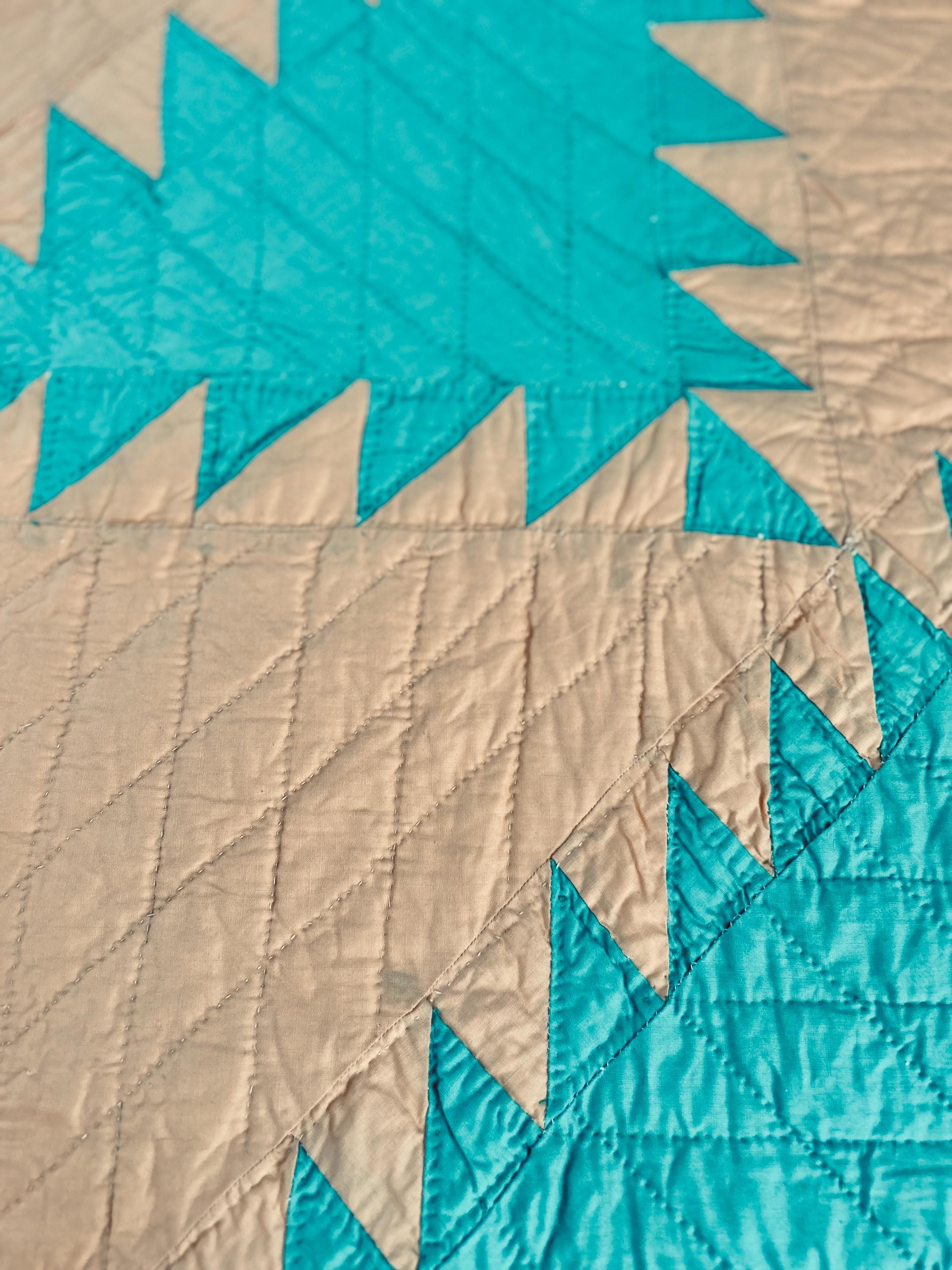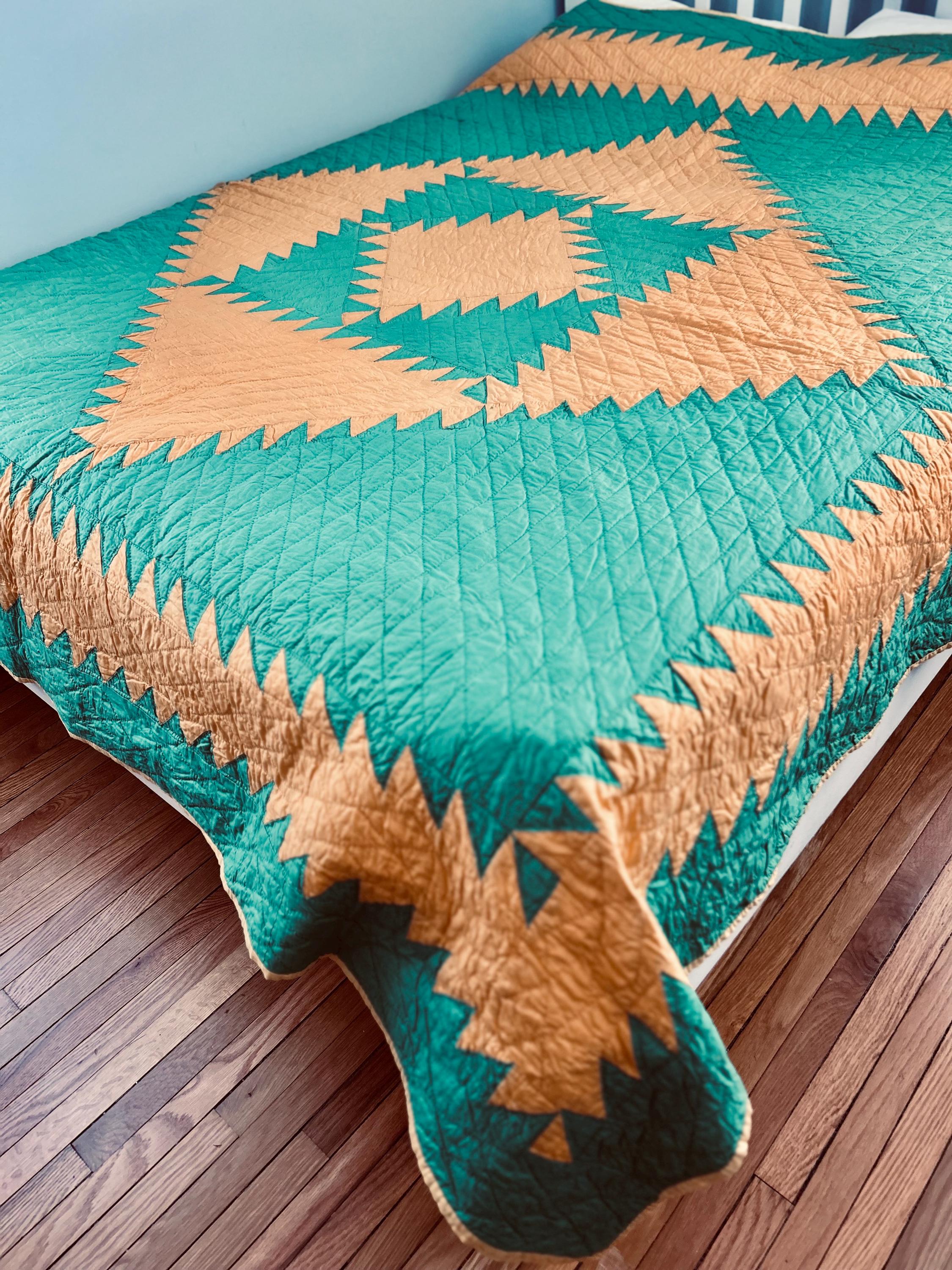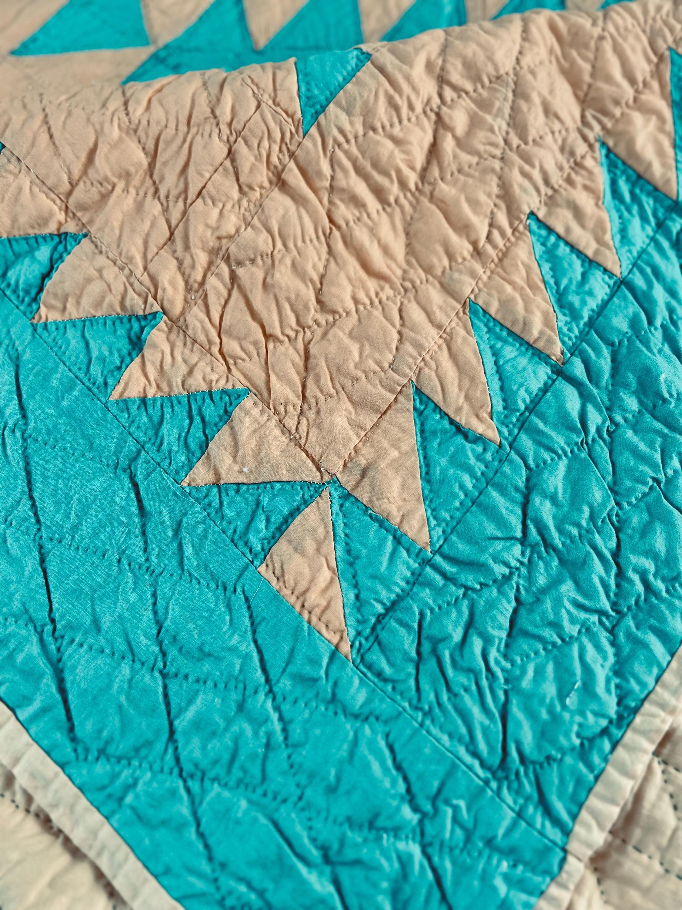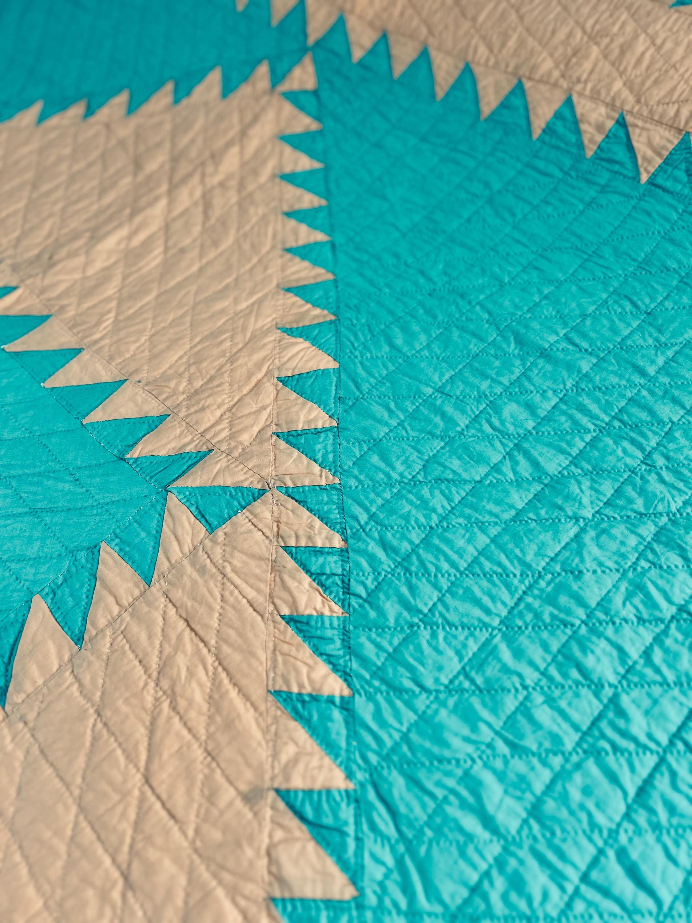 This Green and Yellow Sawtooth Quilt, 1910-1930s, has been precisely pieced and hand-quilted. The hand-quilting is in outlines of the patchwork and in diamonds in the body as well as along the four-sided border.