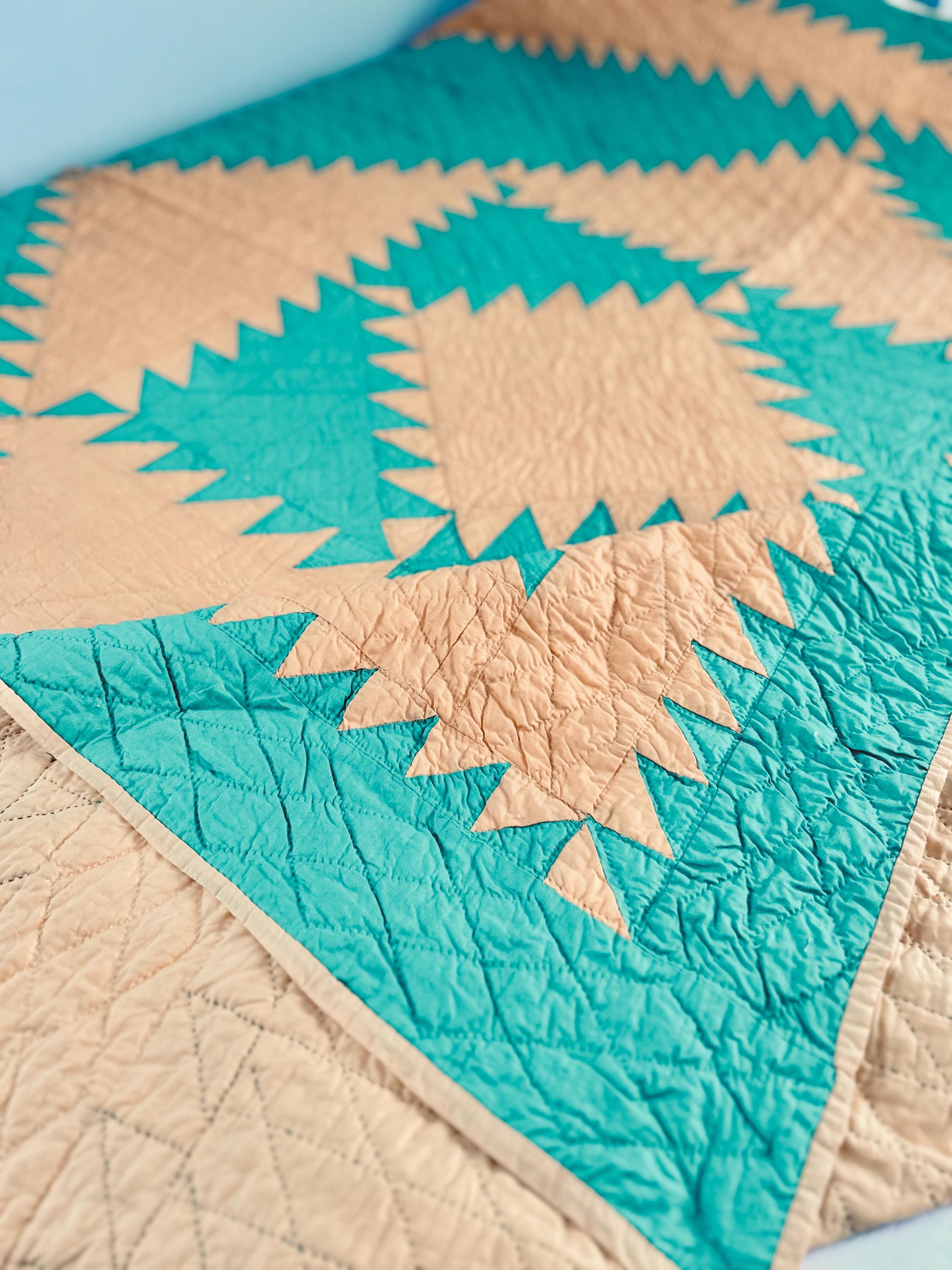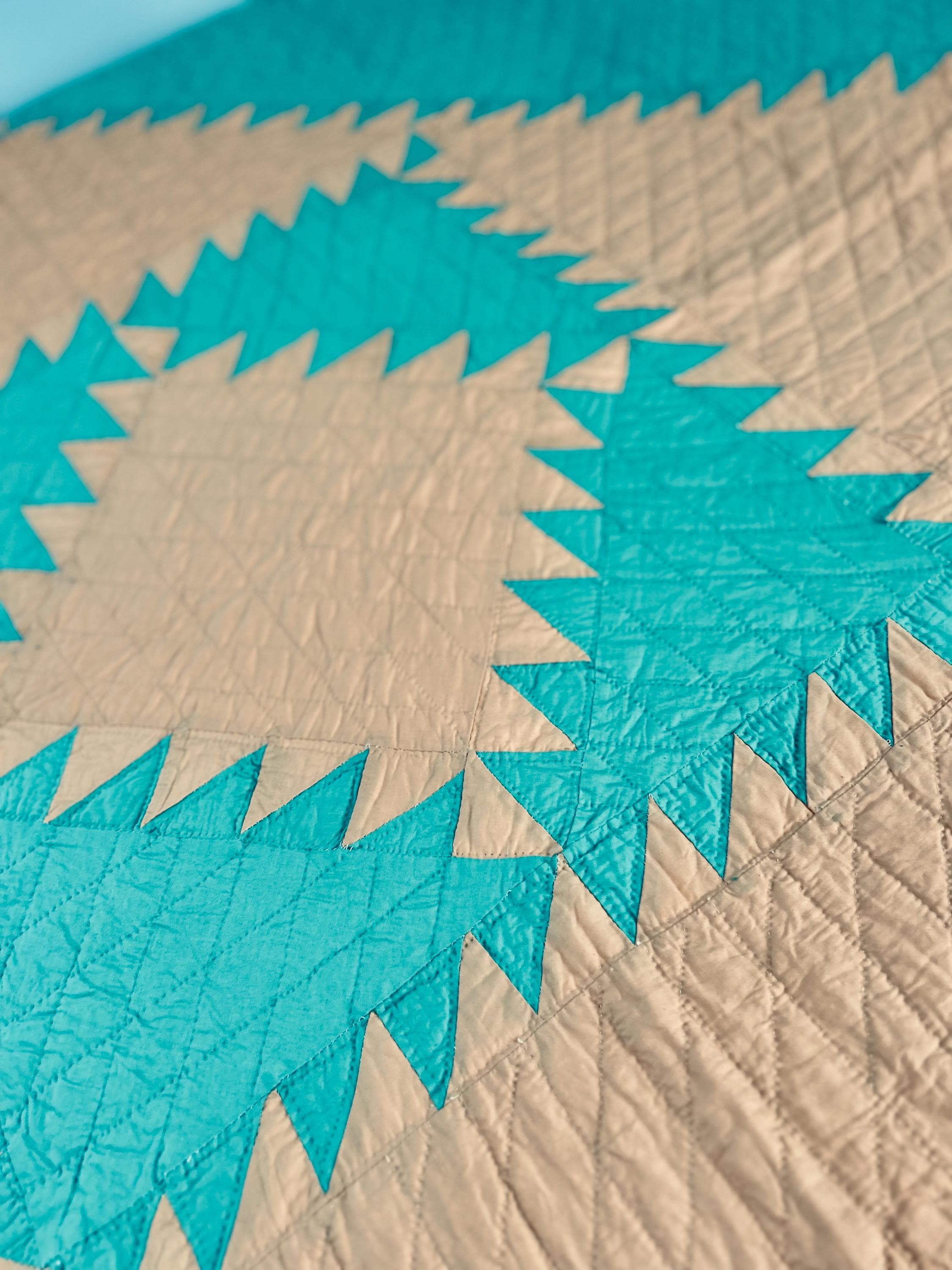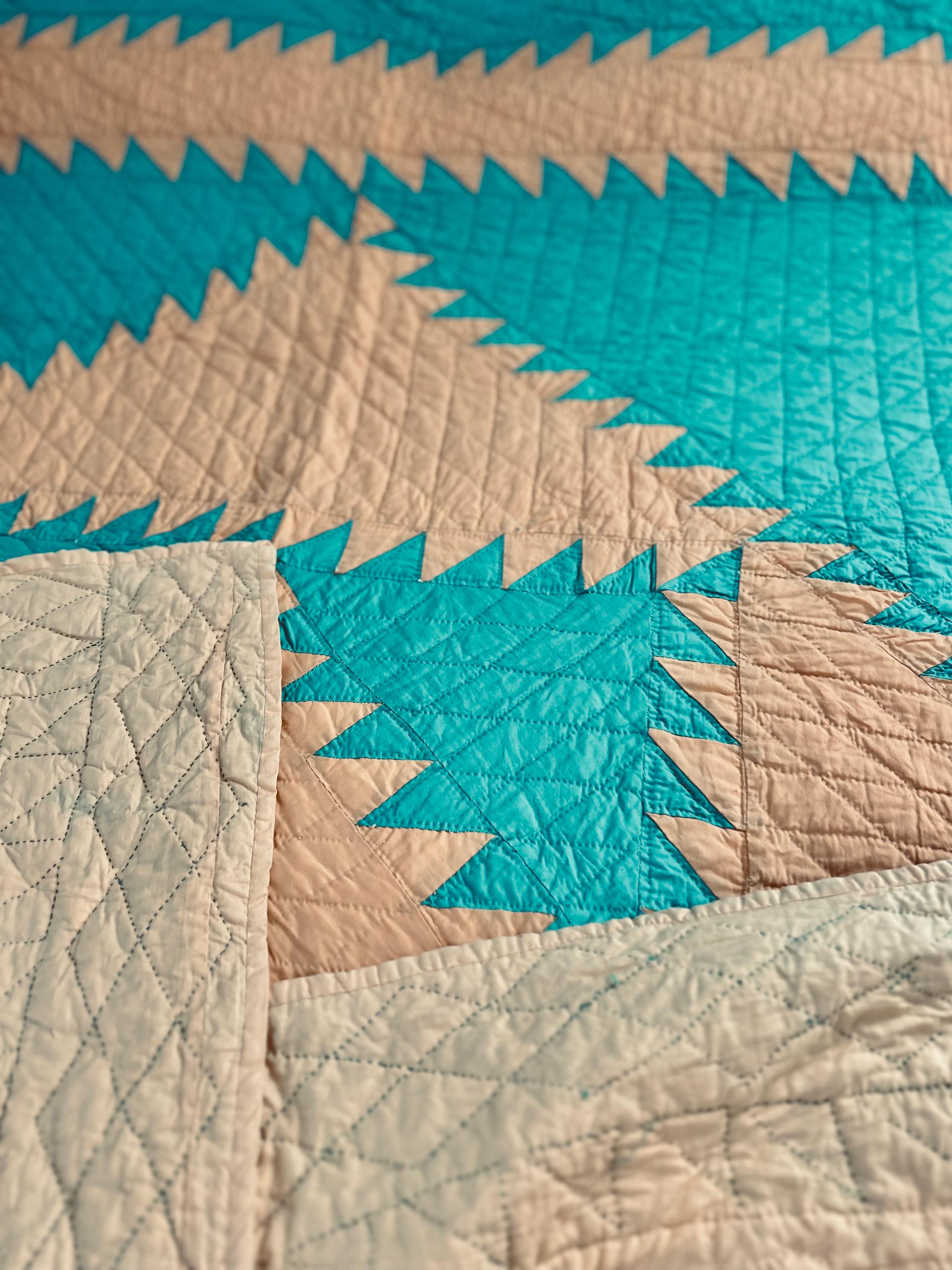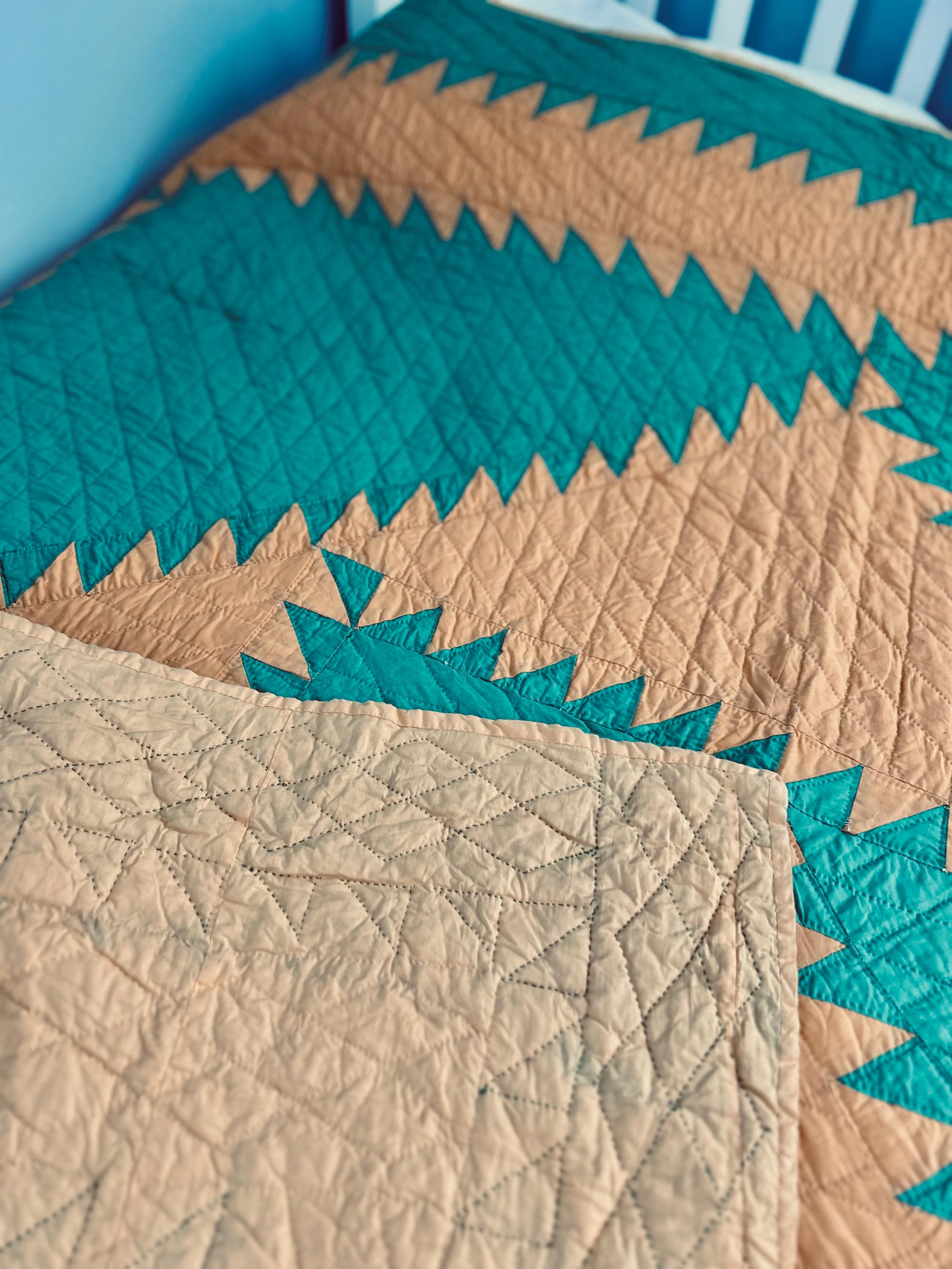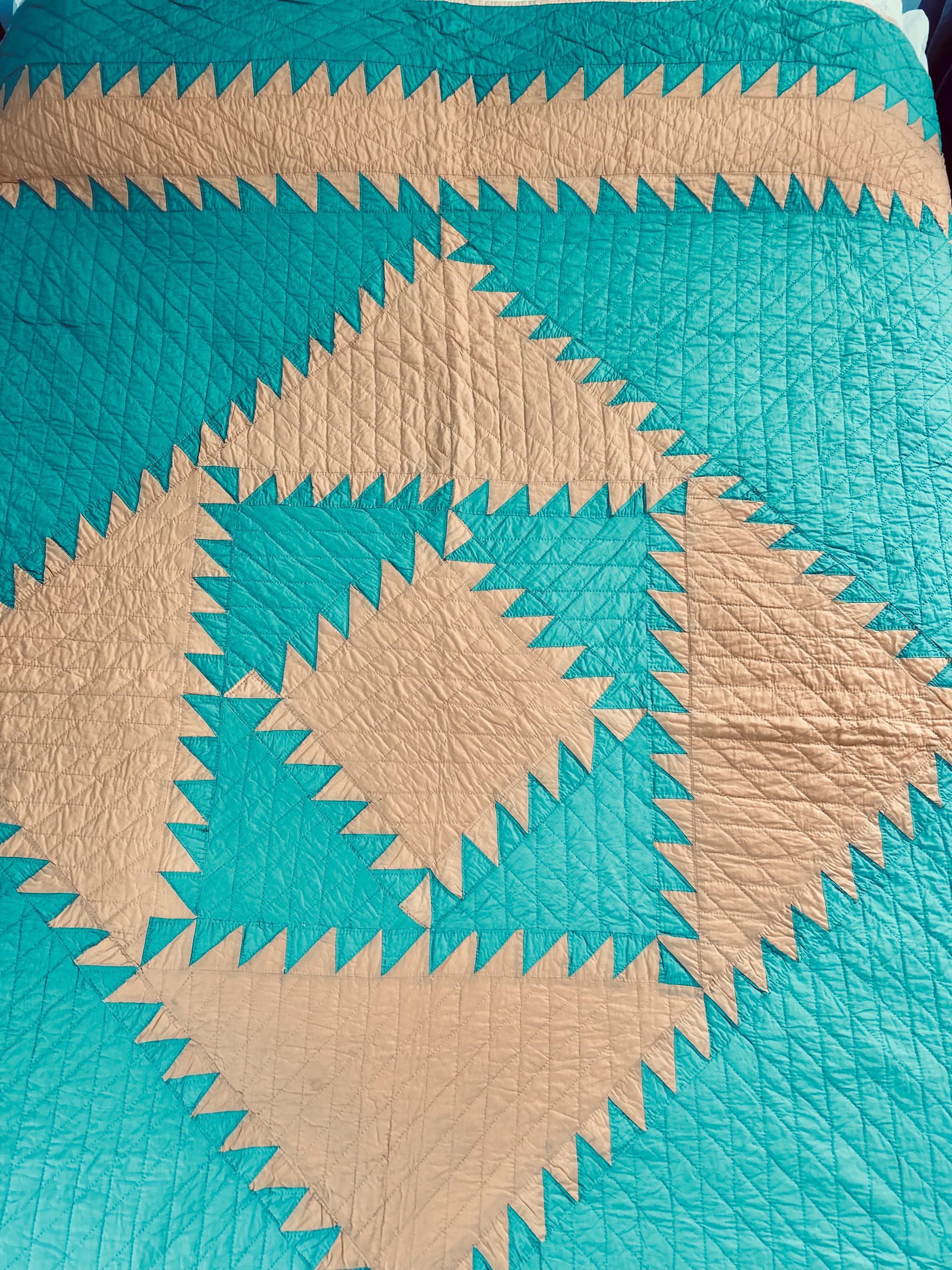 This Green and Yellow Sawtooth Quilt, 1910-1930s, has been precisely pieced and hand-quilted. The hand-quilting is in outlines of the patchwork and in diamonds in the body as well as along the four-sided border.