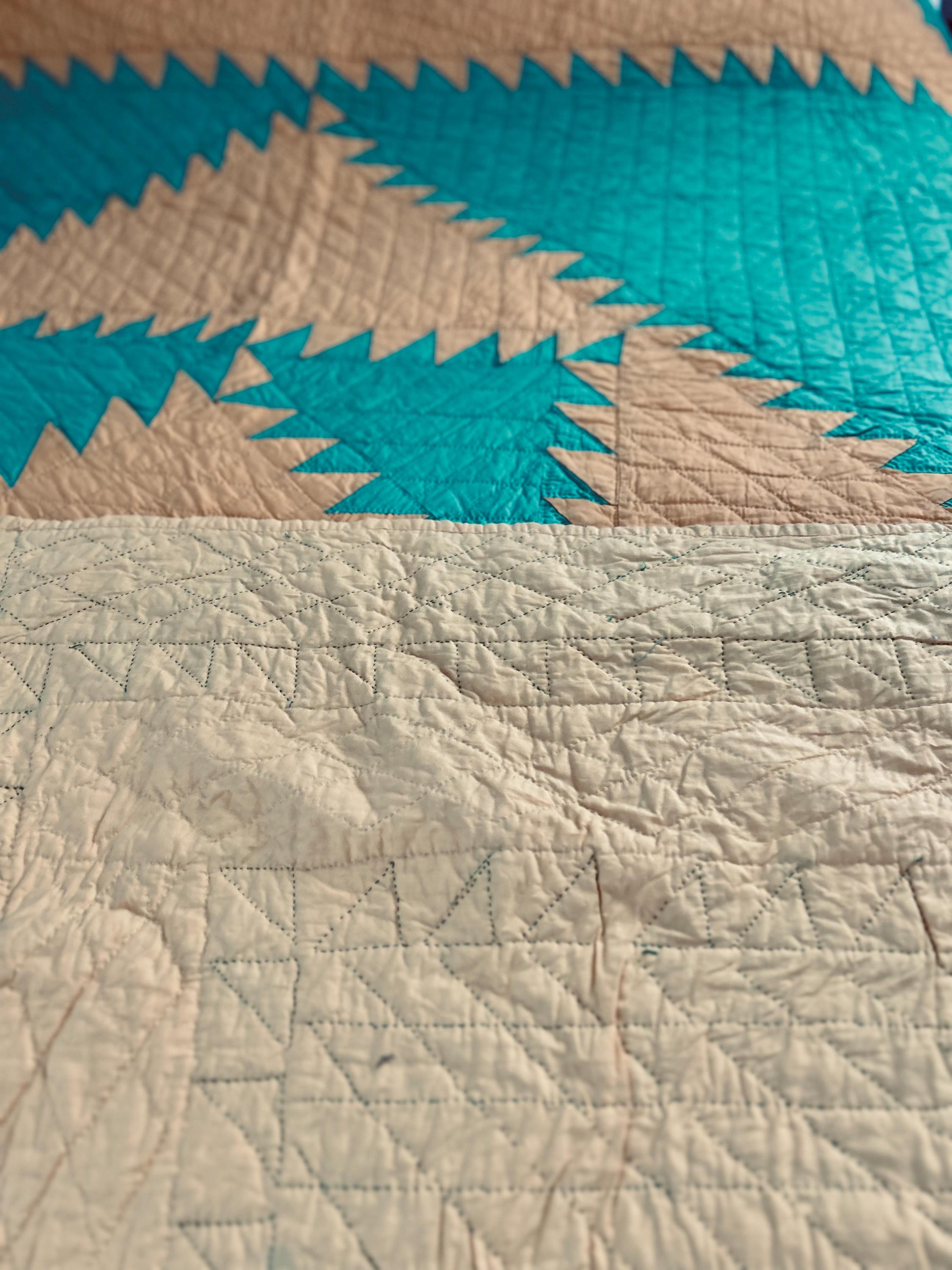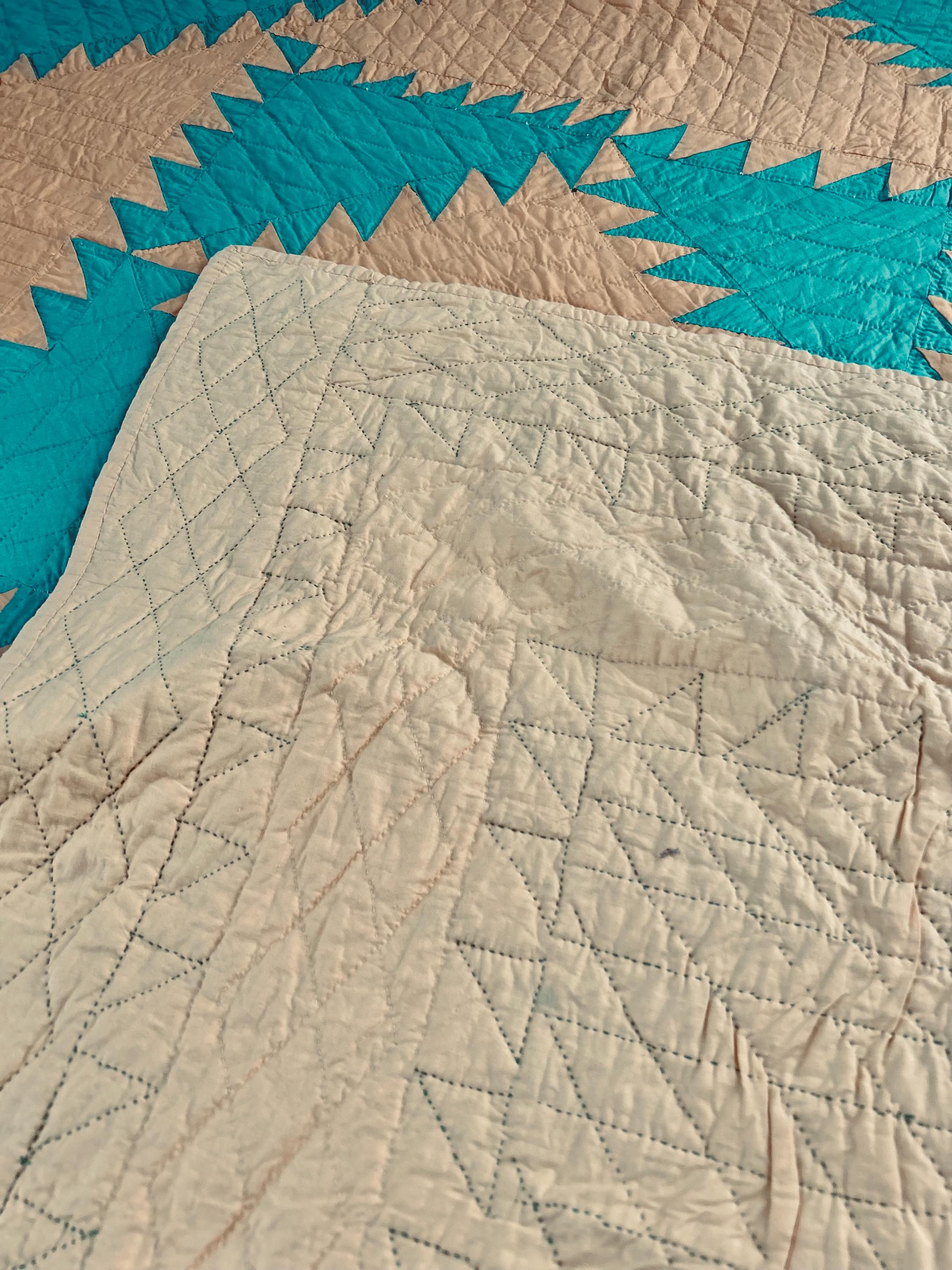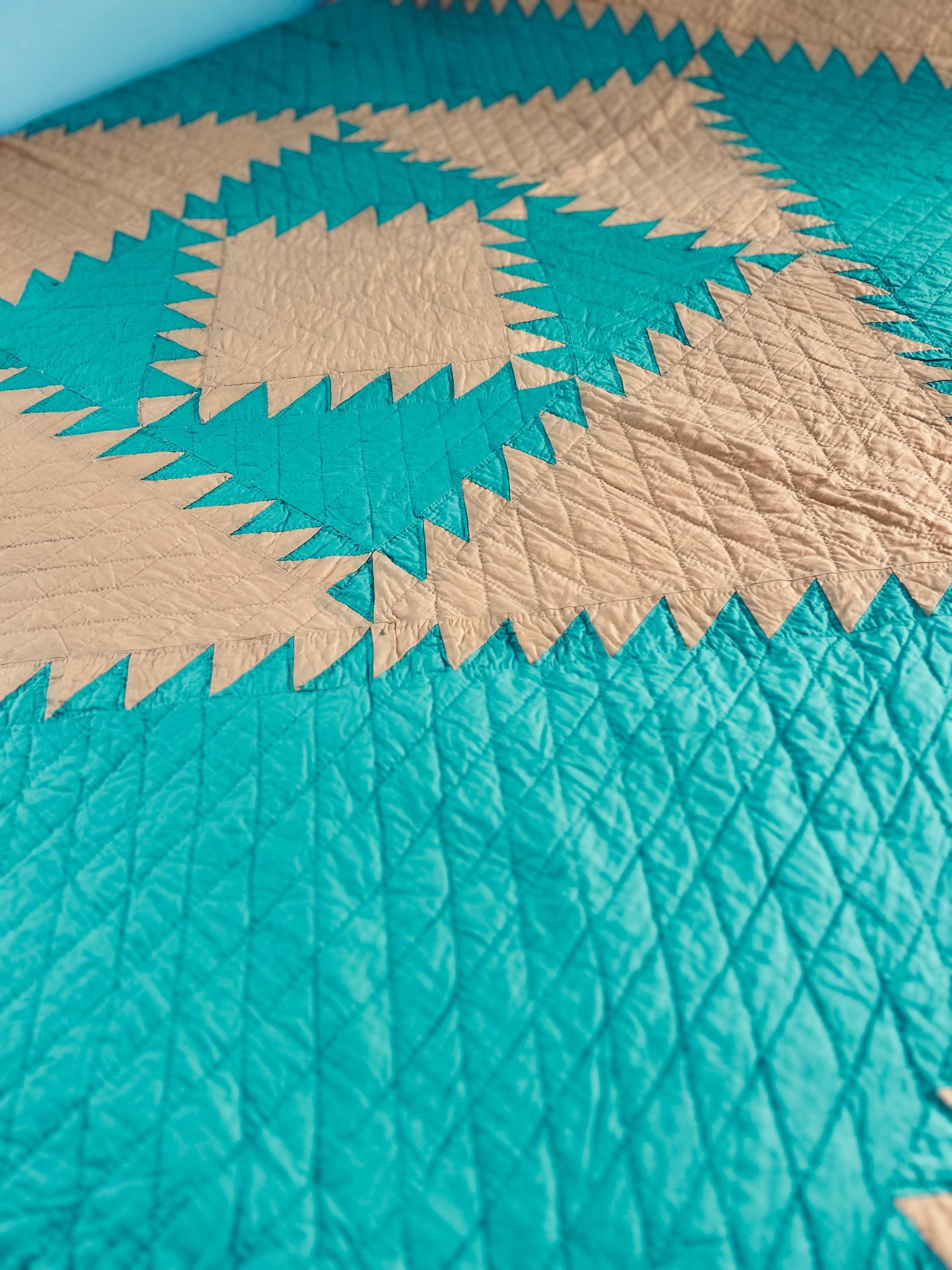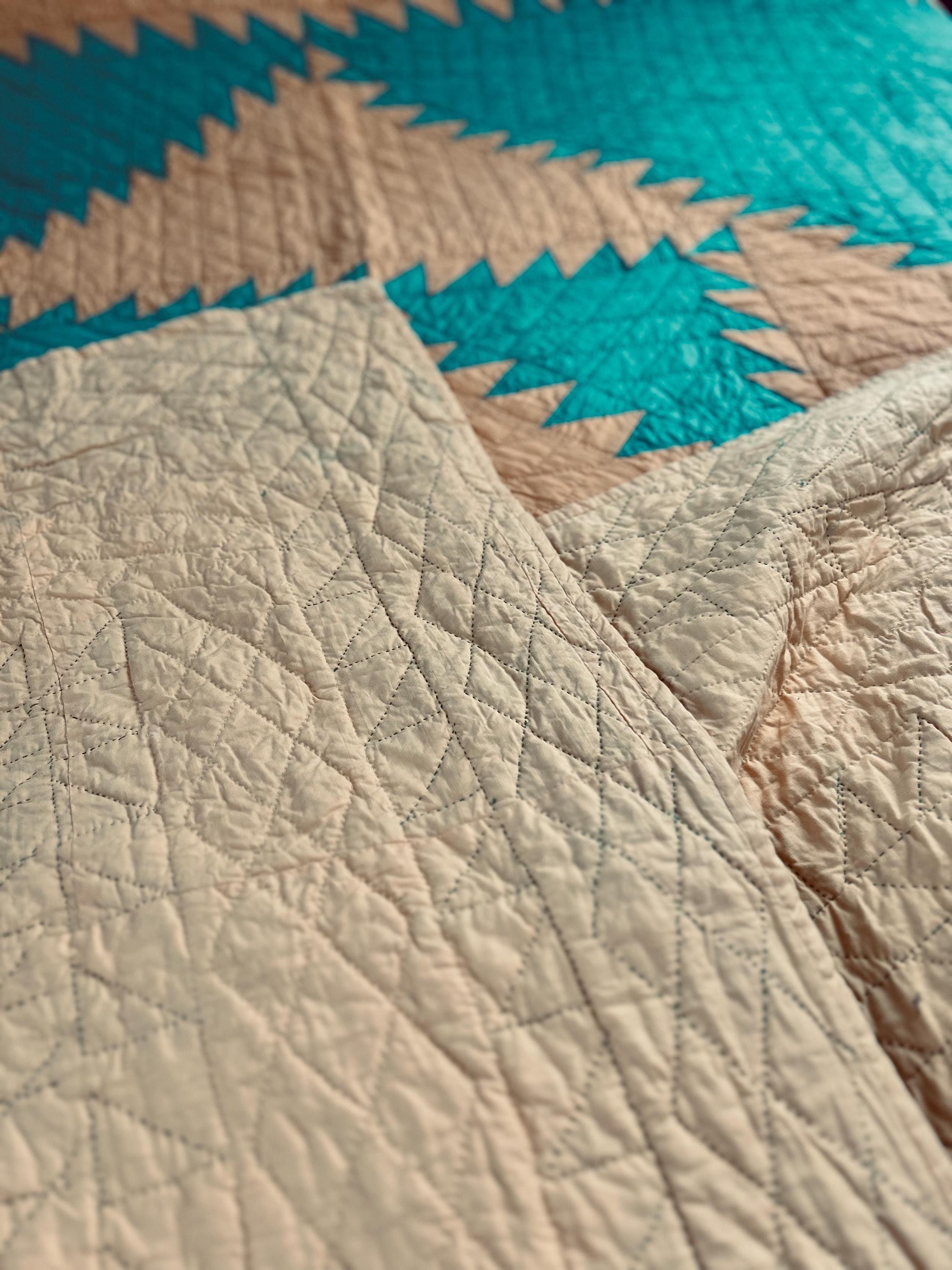 This Green and Yellow Sawtooth Quilt, 1910-1930s, has been precisely pieced and hand-quilted. The hand-quilting is in outlines of the patchwork and in diamonds in the body as well as along the four-sided border.
