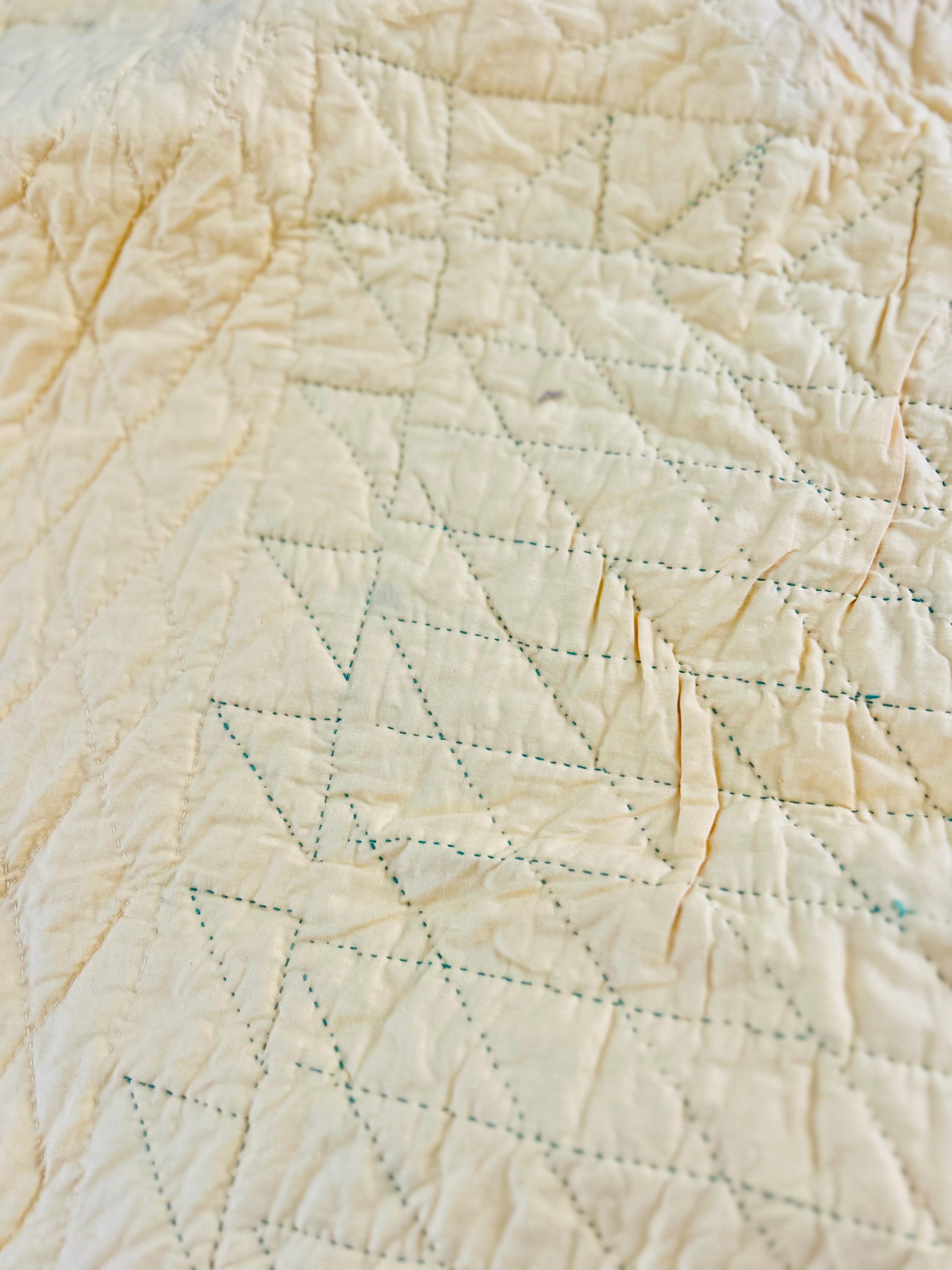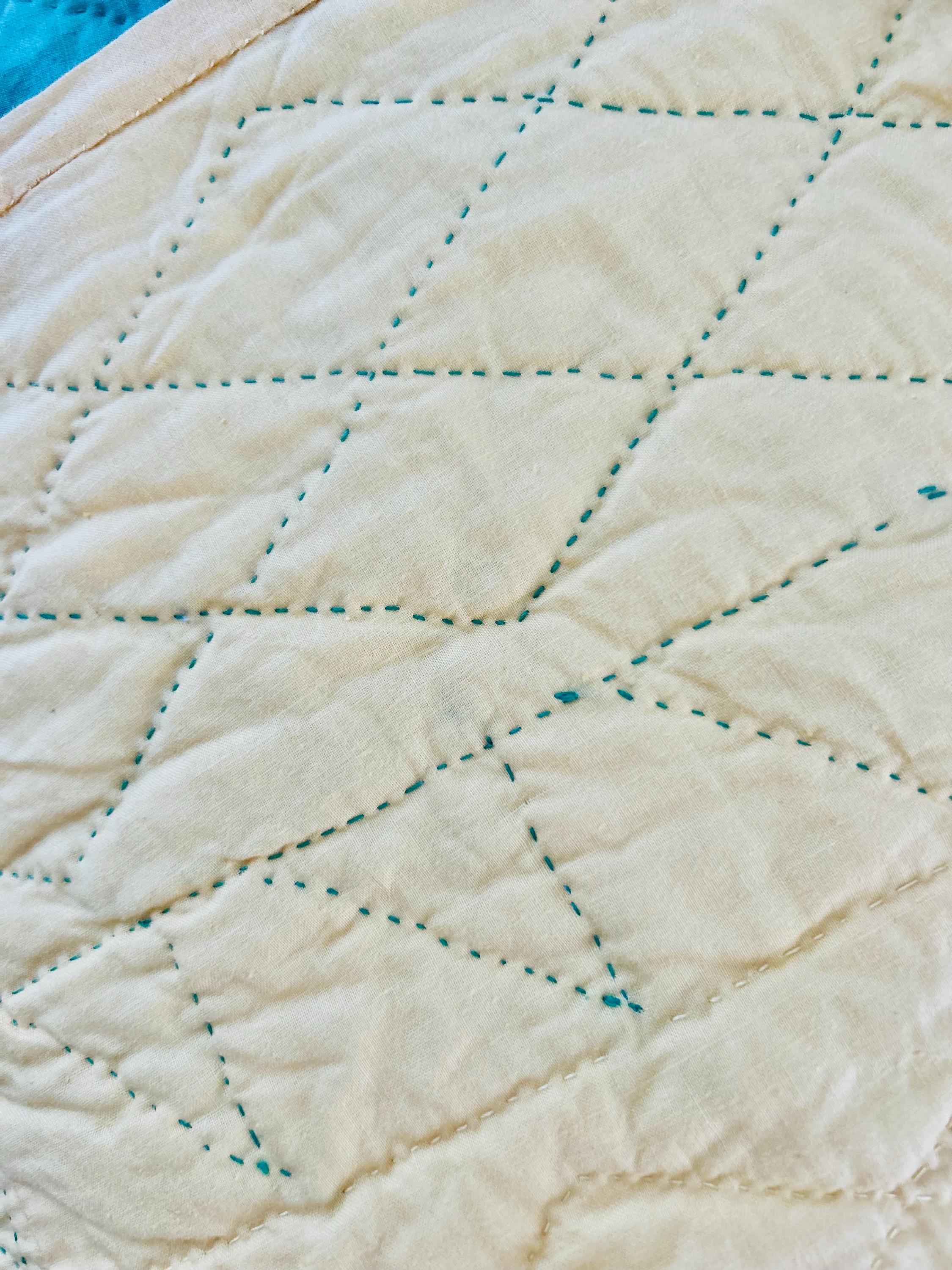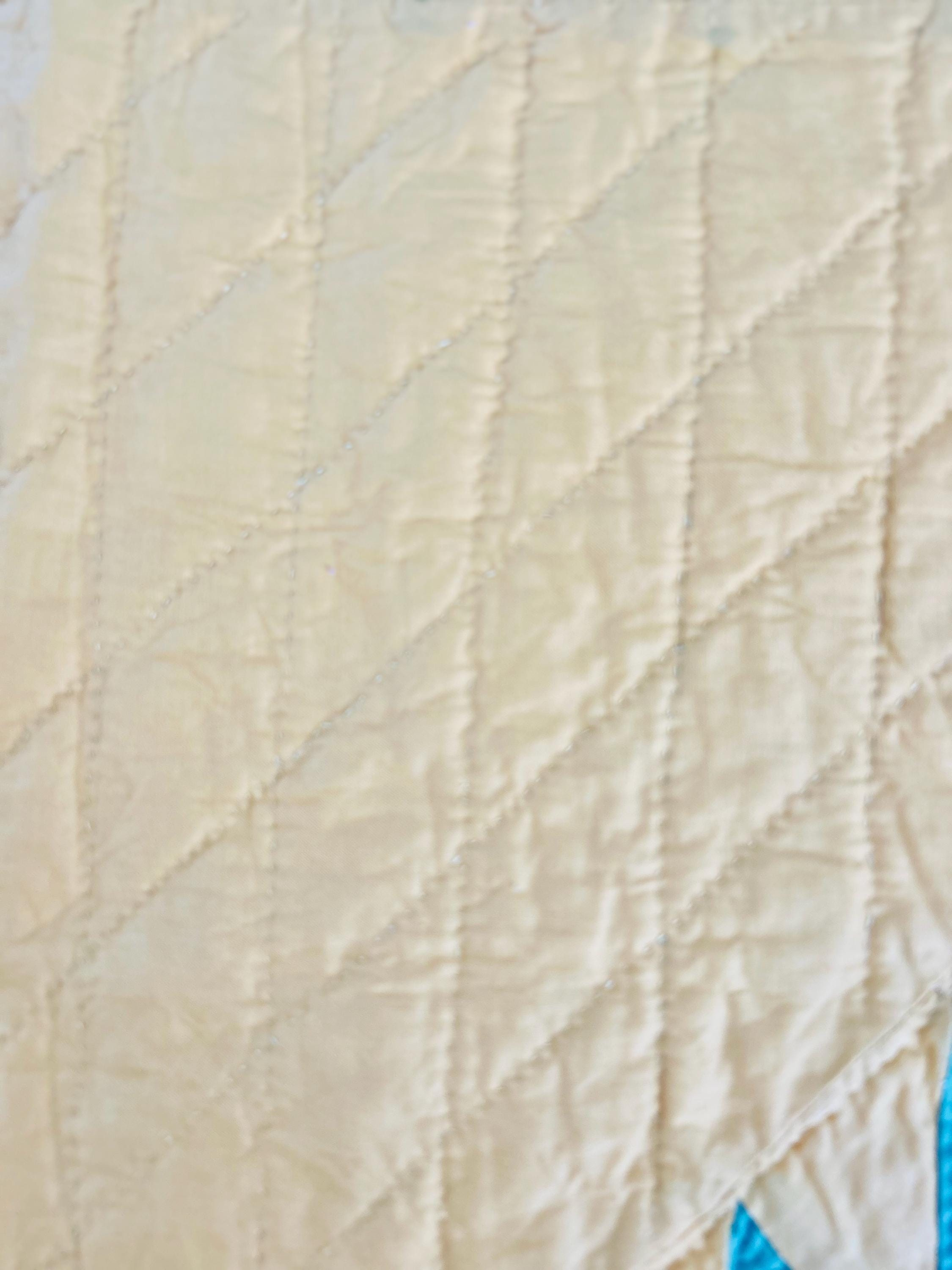 The back is off white cotton where the quilting -- in green and yellow thread -- can best be seen. The back fabric has been turned to the front and hand-stitched to form the binding. The cotton batting is lightweight.