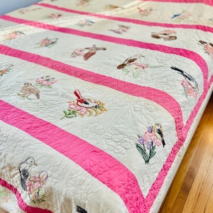 The quilt measures 84 inches by 88 inches and comes from a smoke-free and pet-free home. Shown on a queen-size bed.