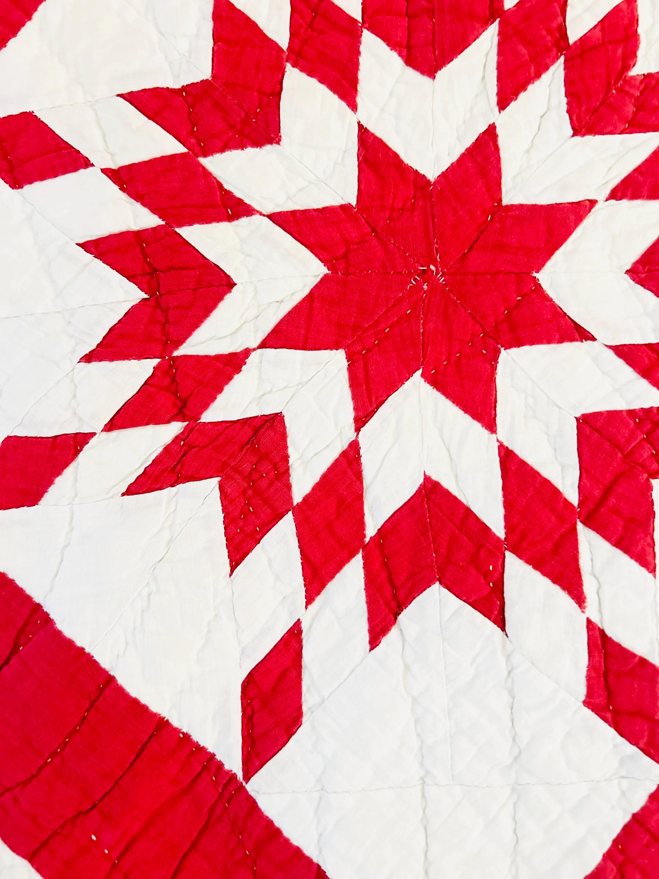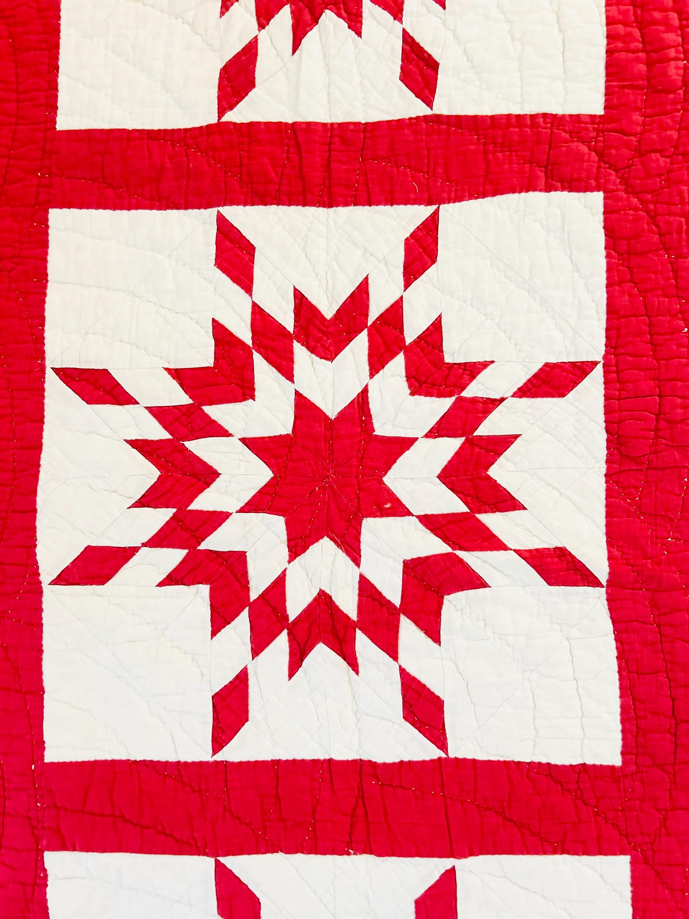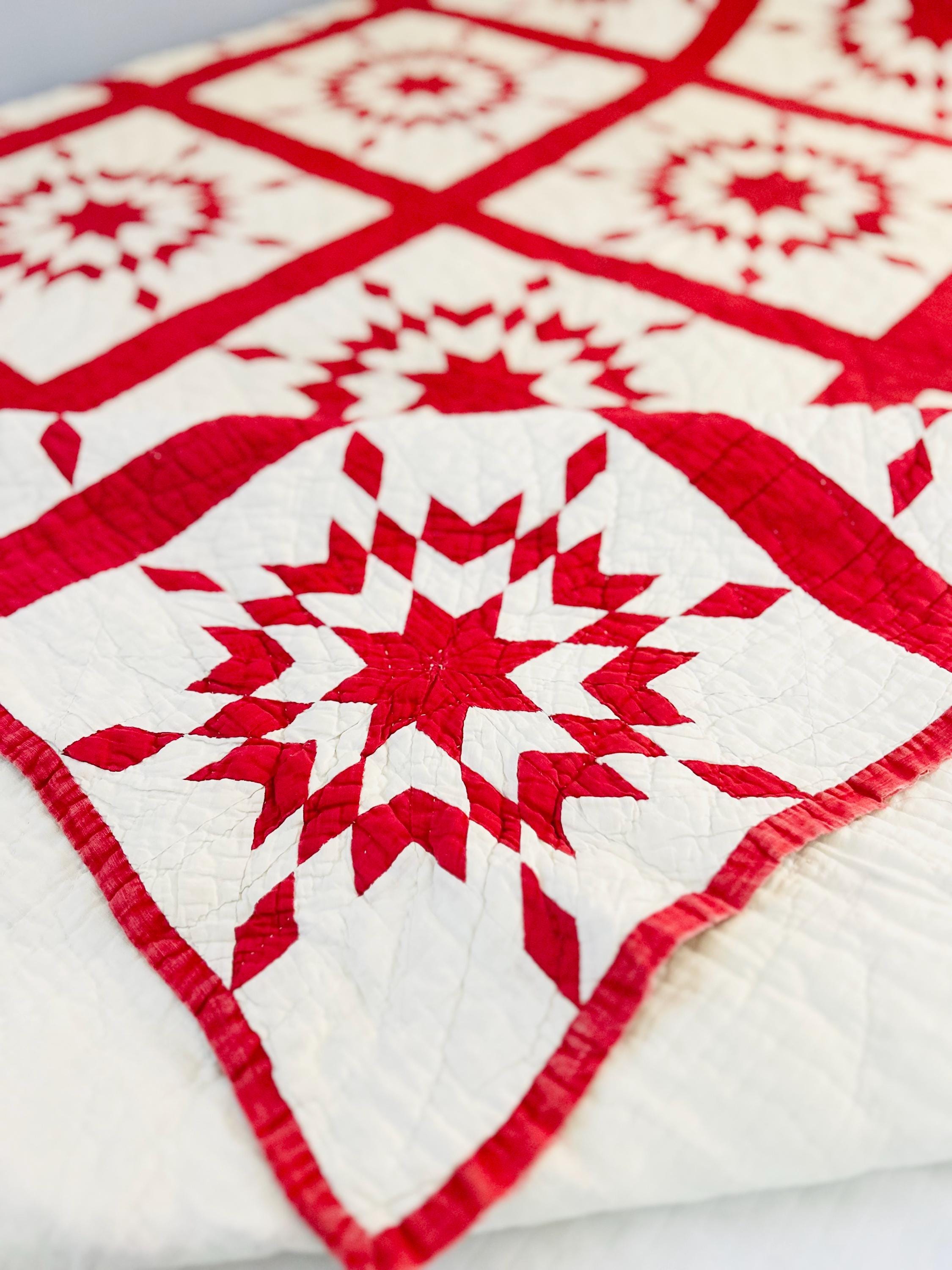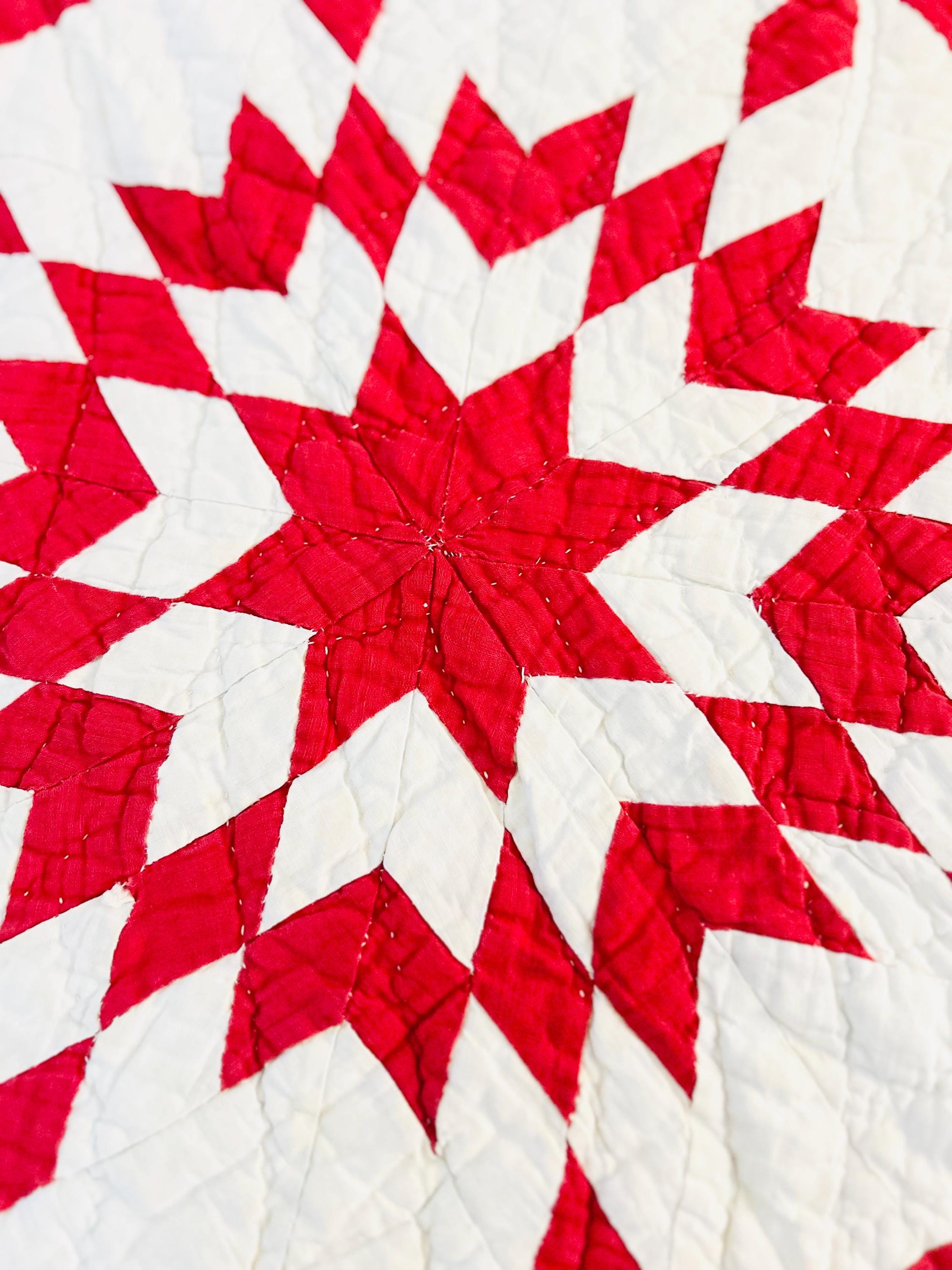 This striking Prairie Star Quilt, circa 1900-1920s, has been beautifully pieced then quilted in a repeating shell pattern throughout the quilt.