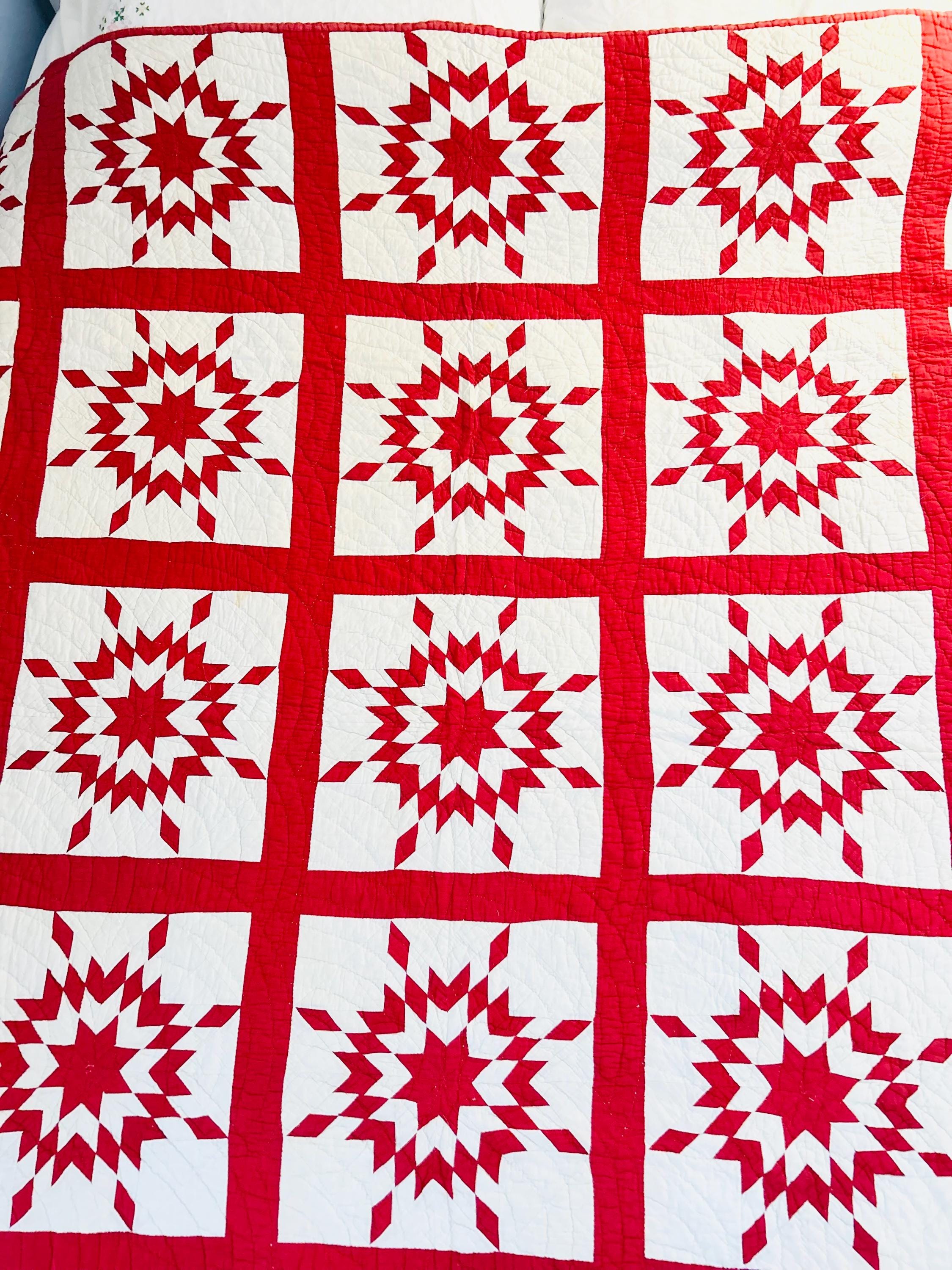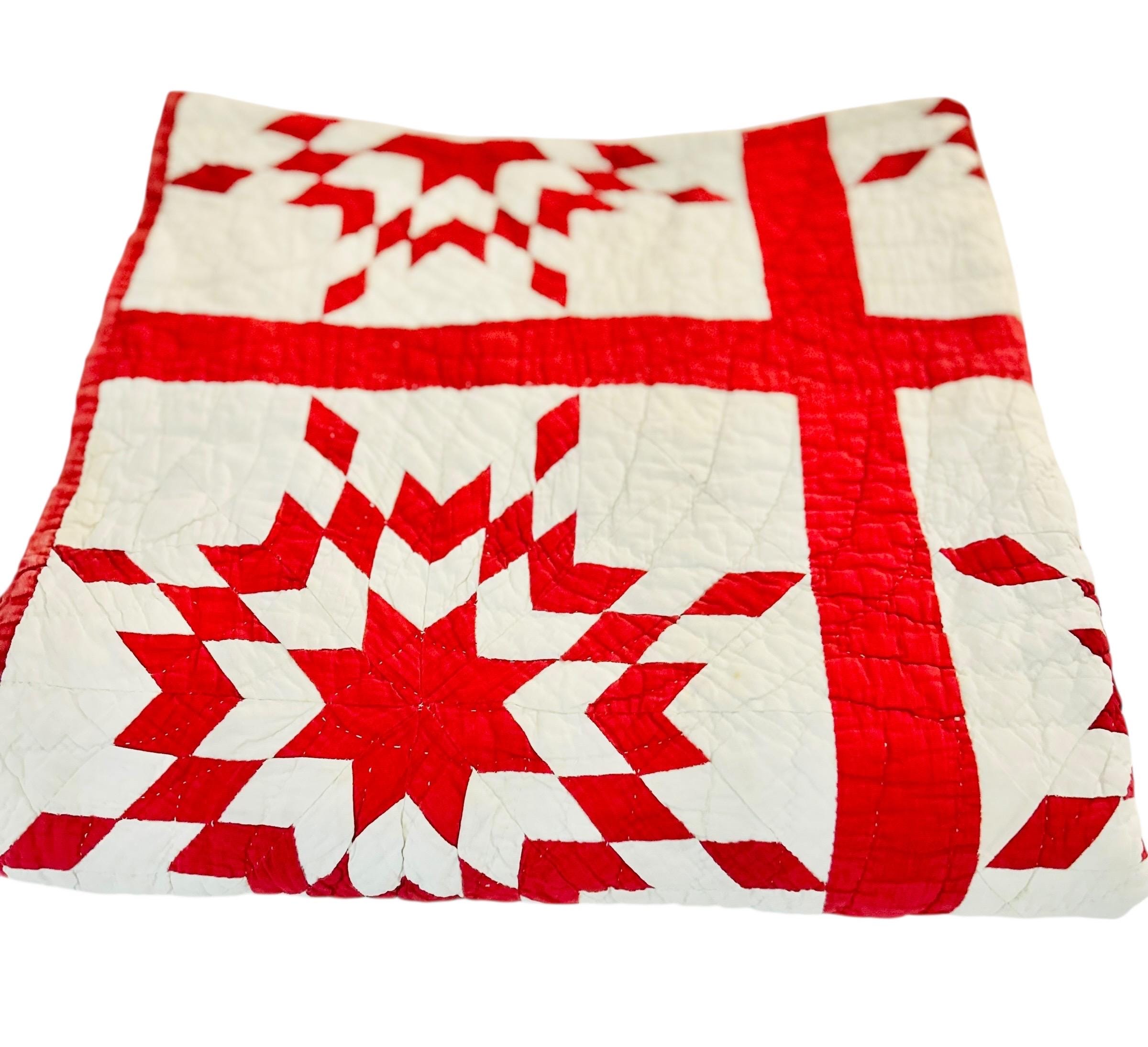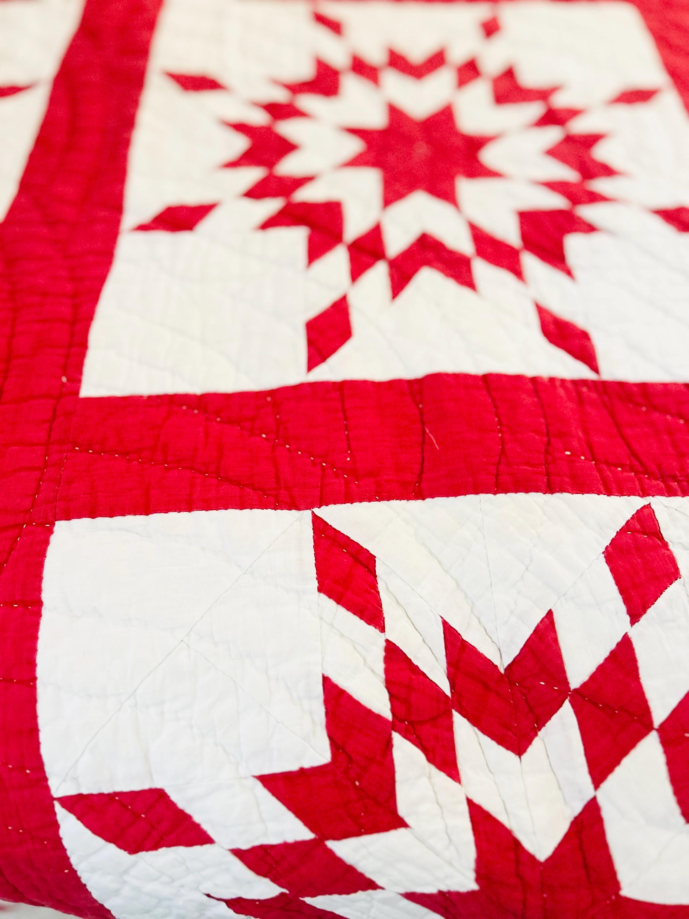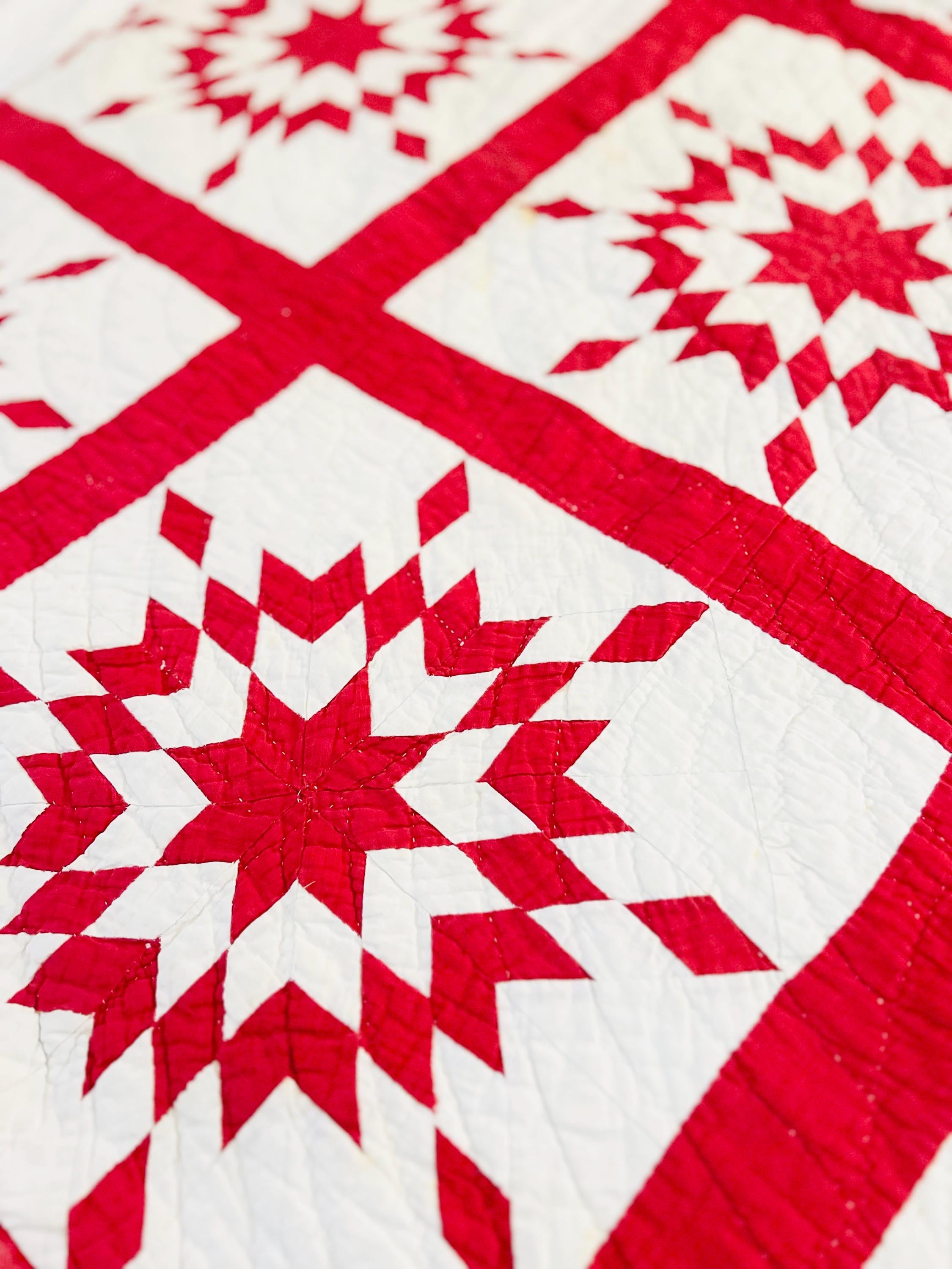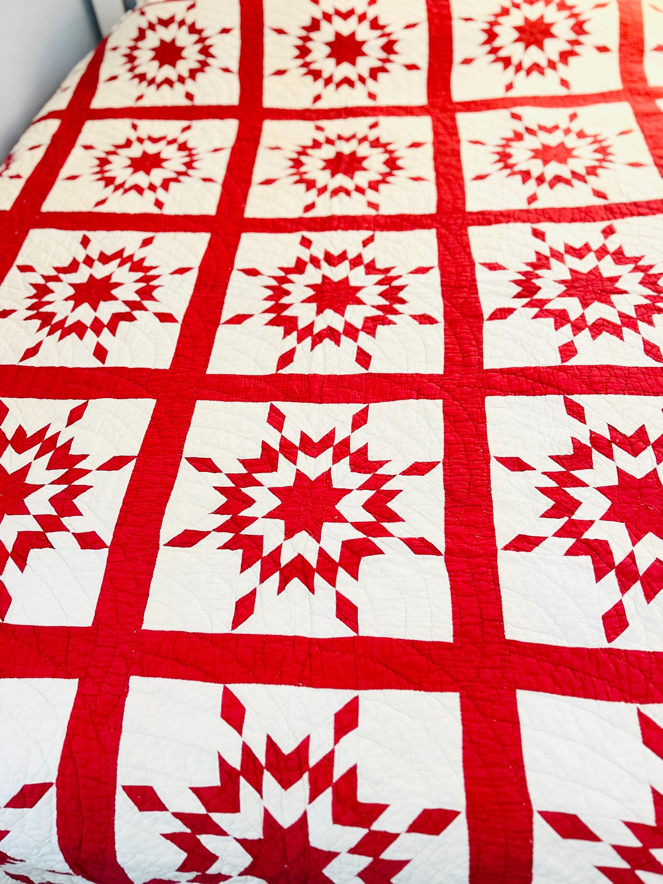 This striking Prairie Star Quilt, circa 1900-1920s, has been beautifully pieced then quilted in a repeating shell pattern throughout the quilt.