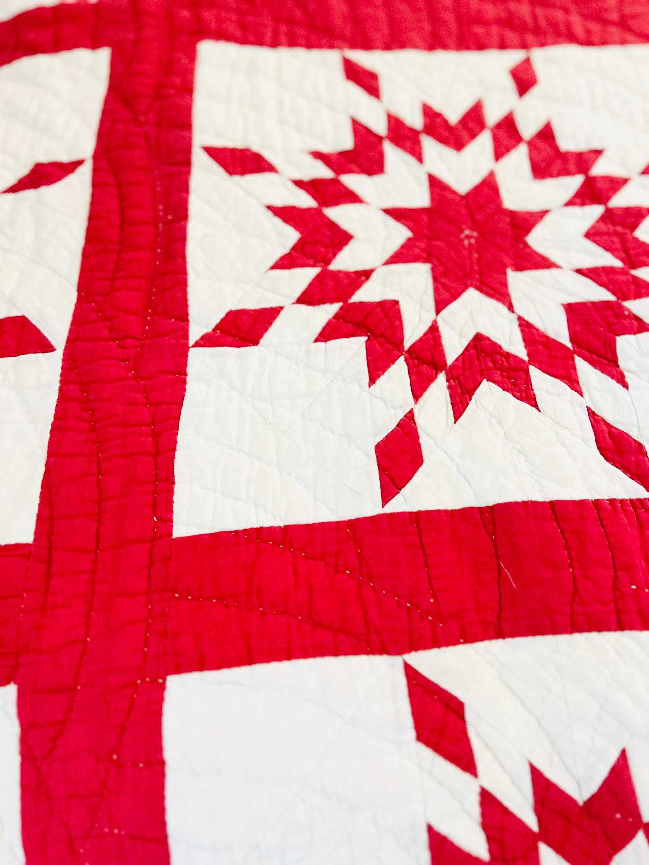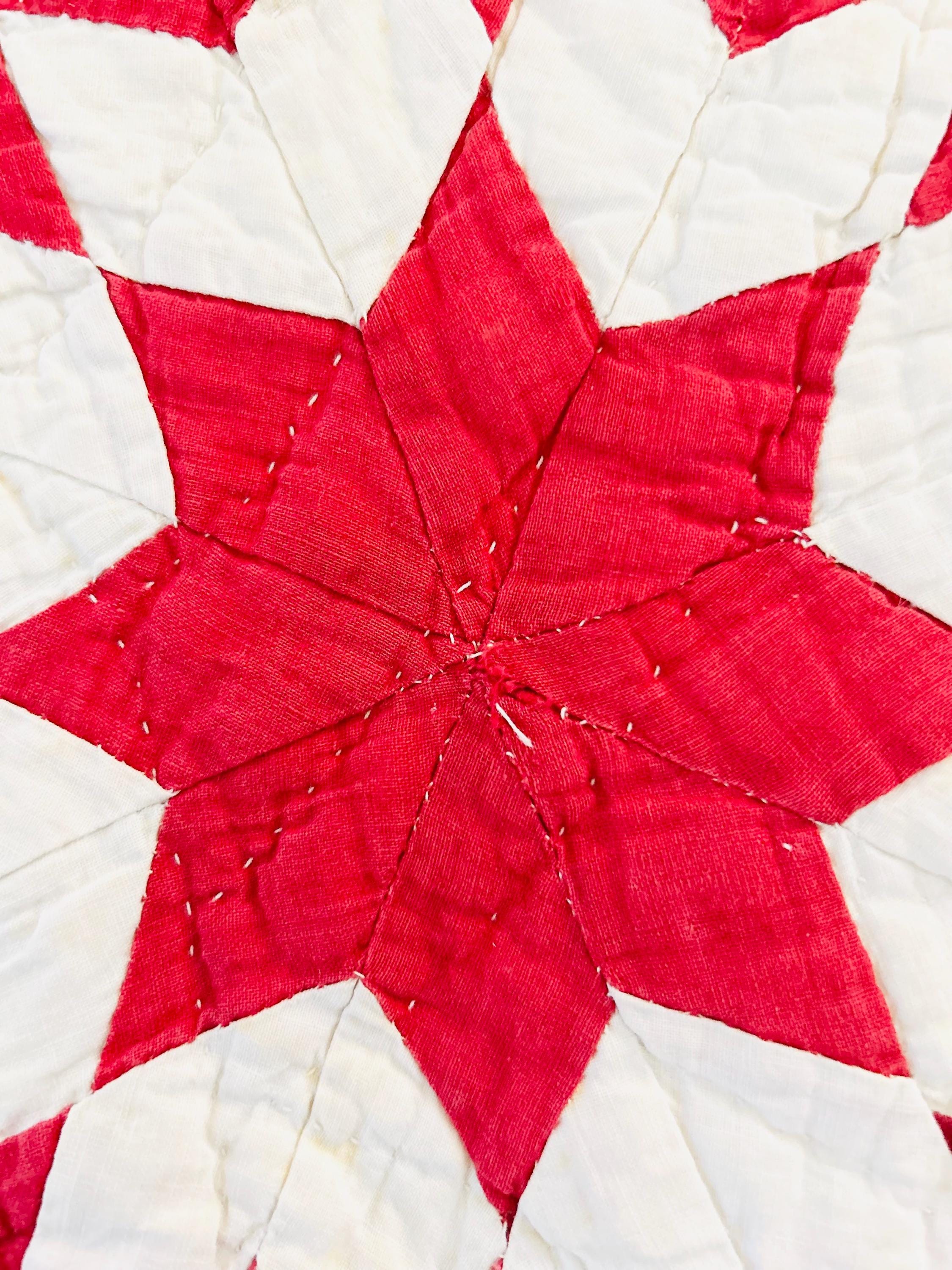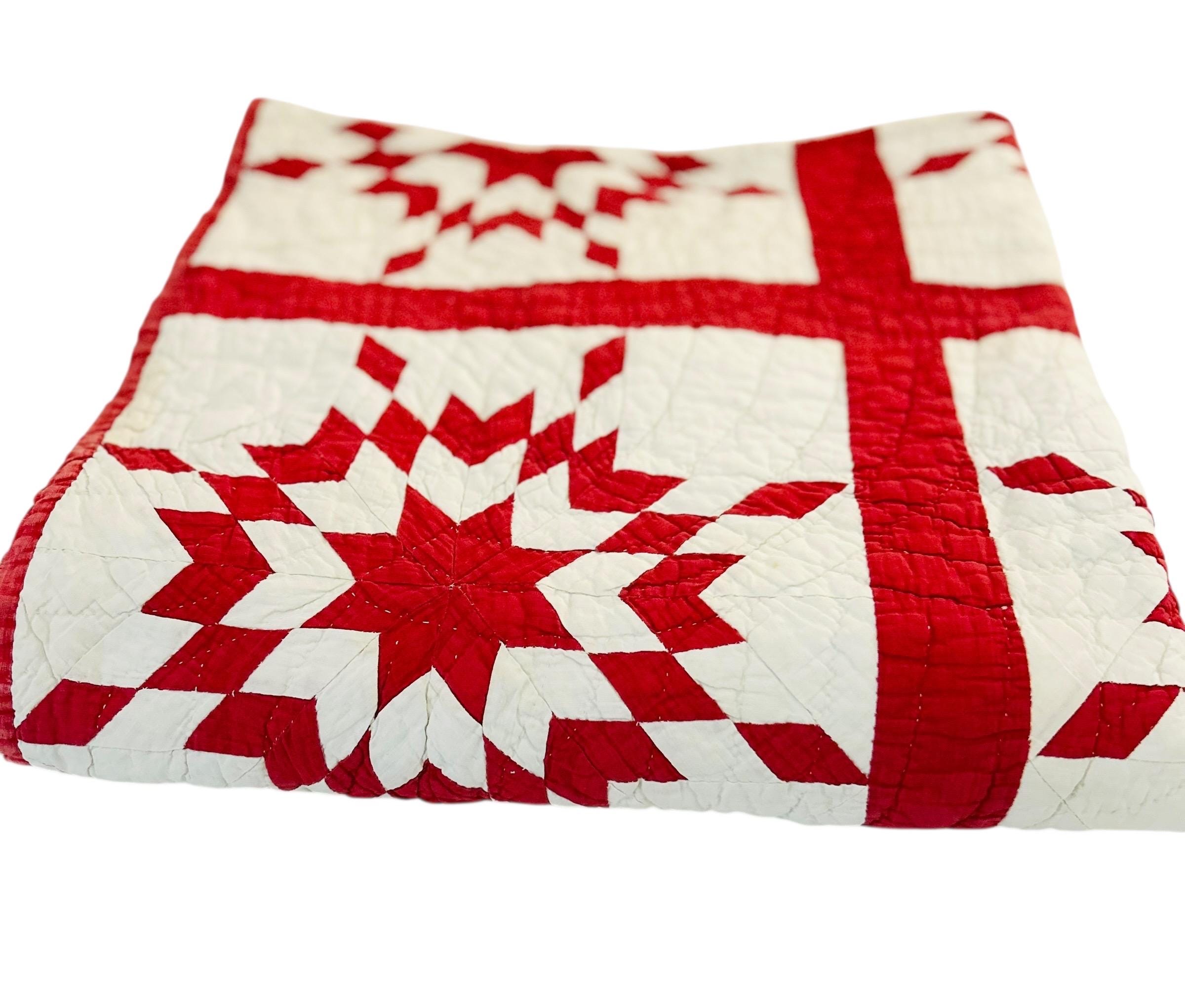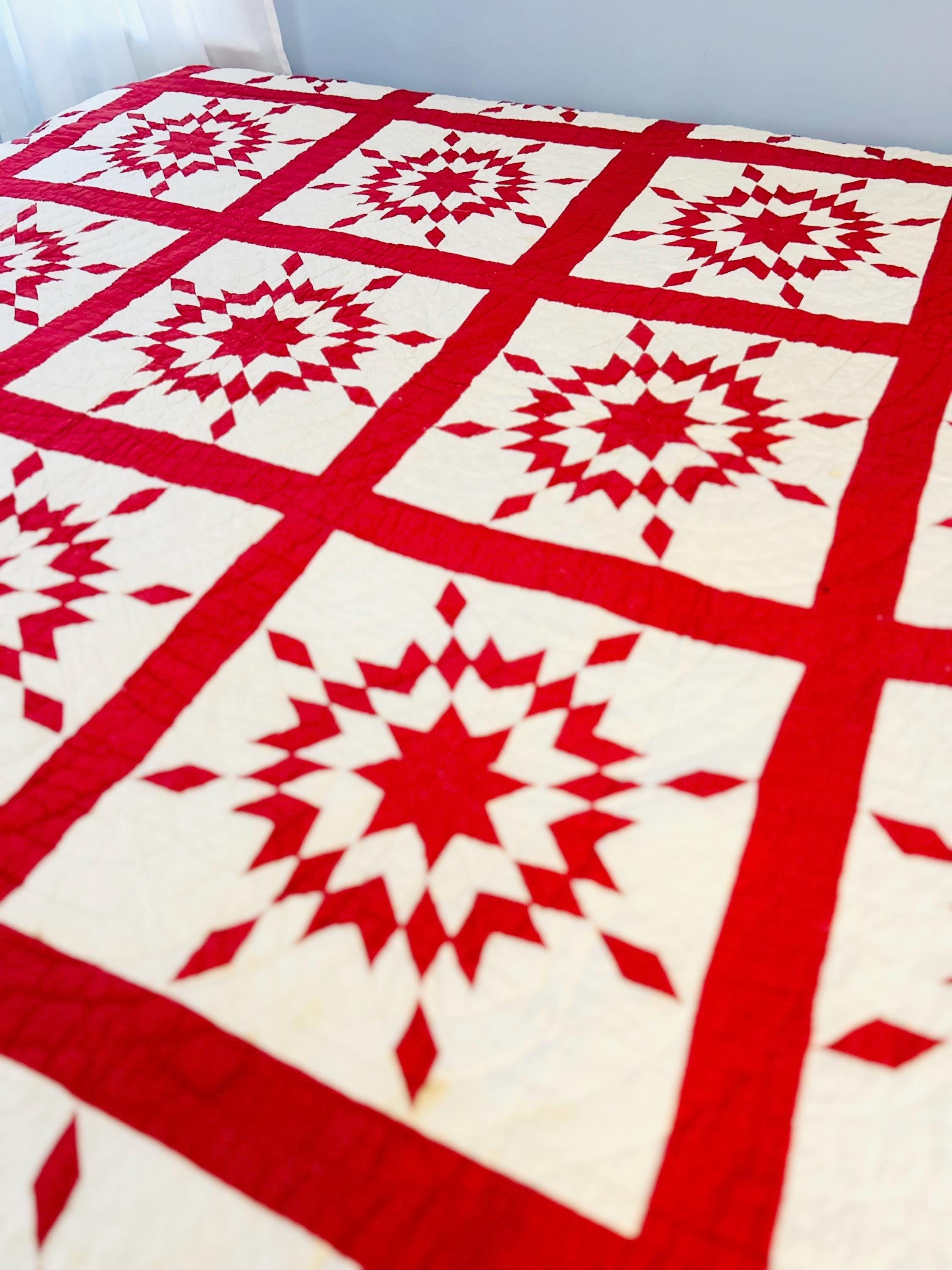 This striking Prairie Star Quilt, circa 1900-1920s, has been beautifully pieced then quilted in a repeating shell pattern throughout the quilt.