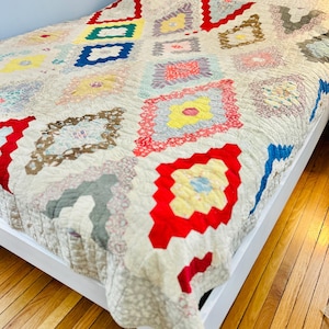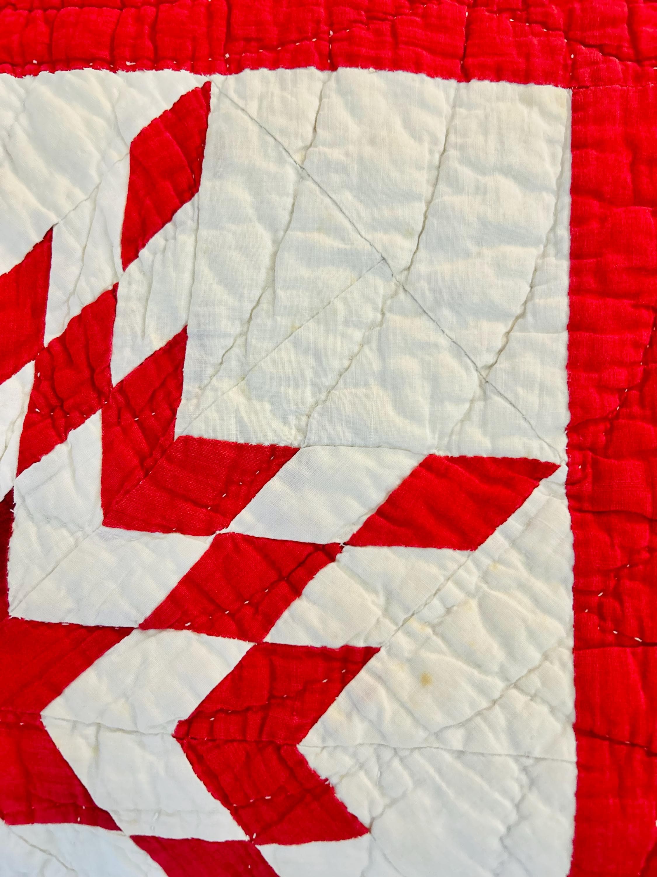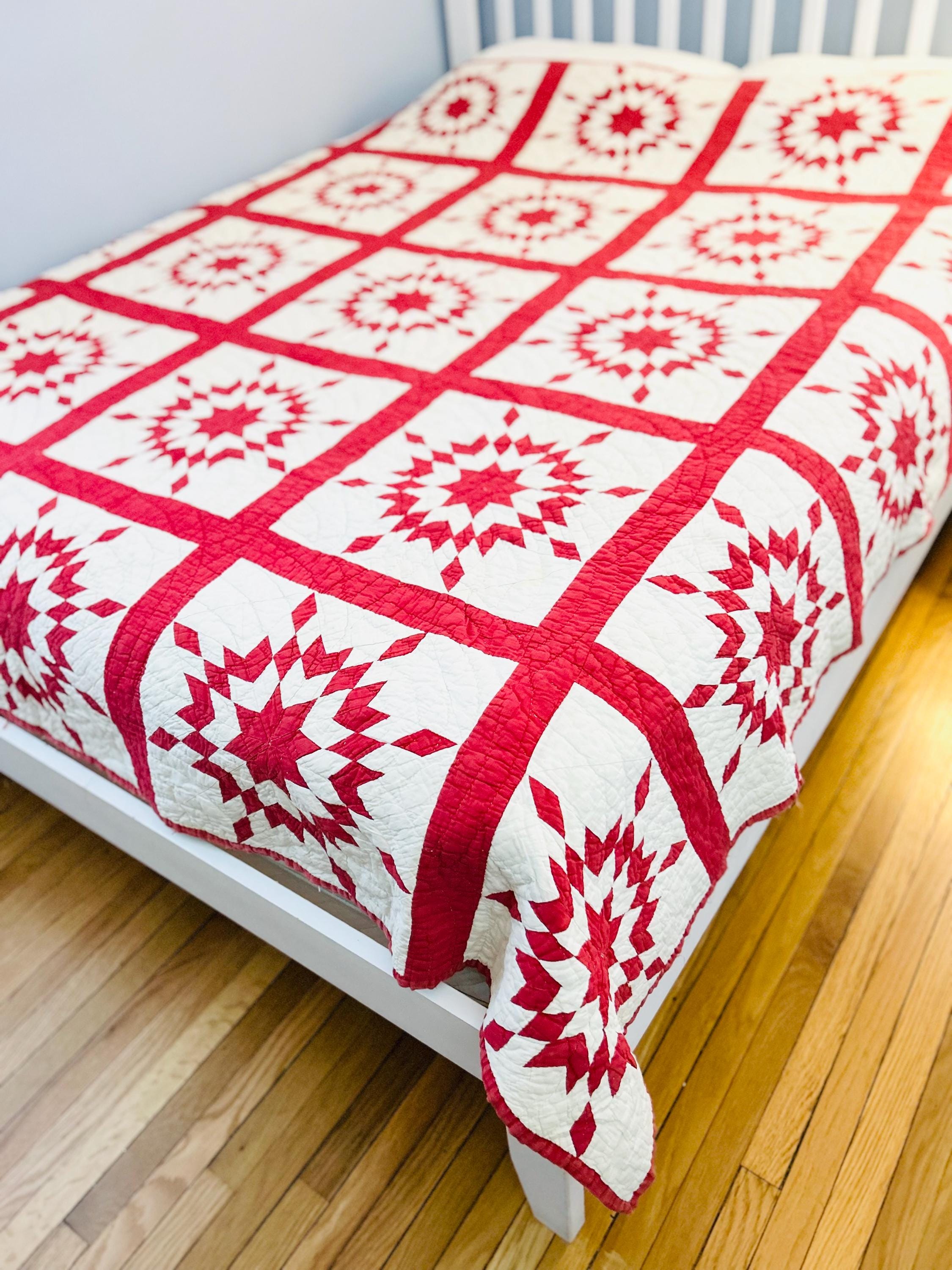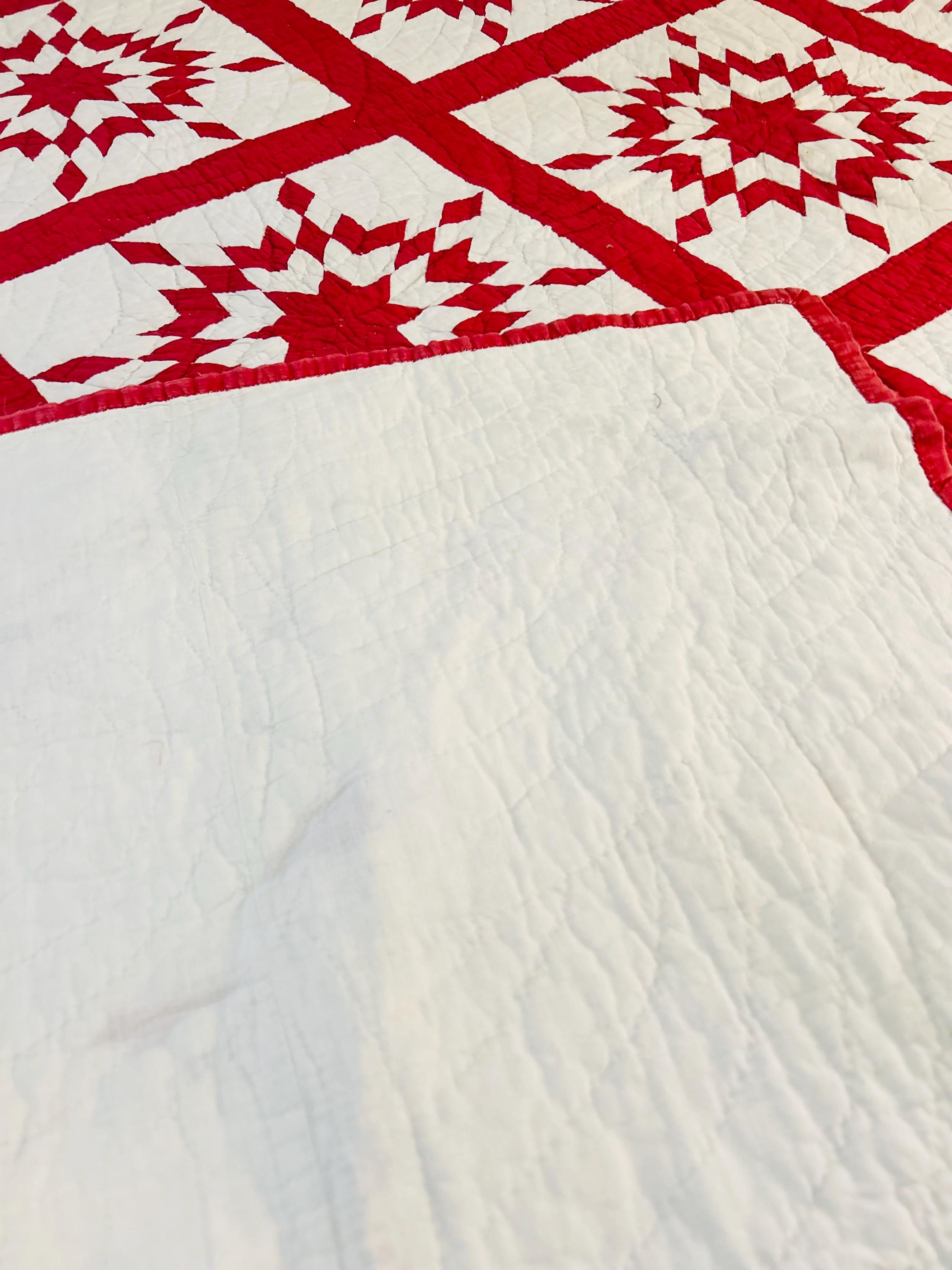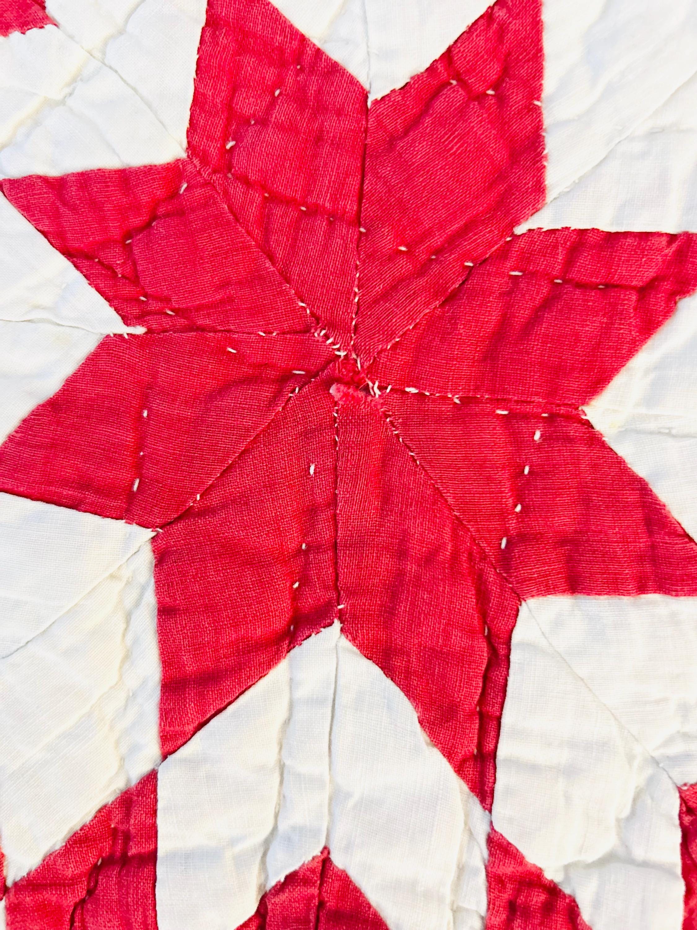 This striking Prairie Star Quilt, circa 1900-1920s, has been beautifully pieced then quilted in a repeating shell pattern throughout the quilt.