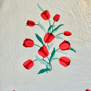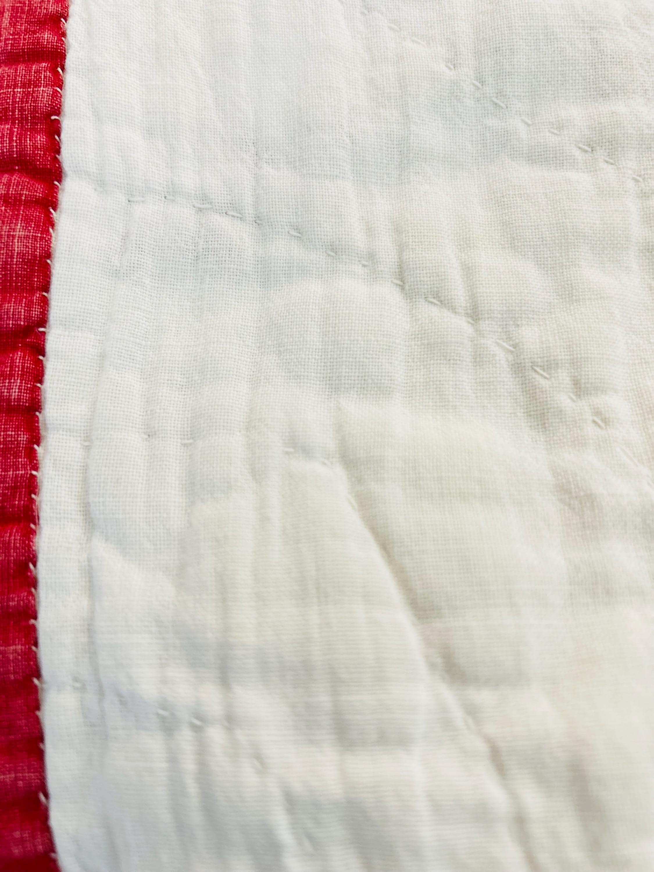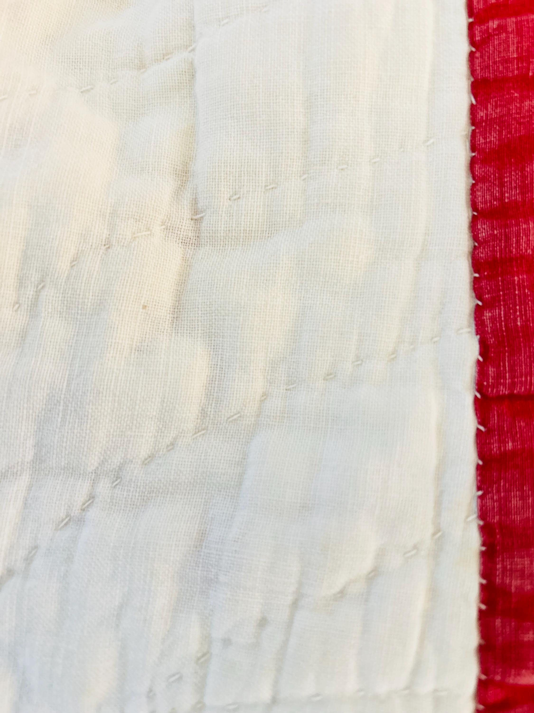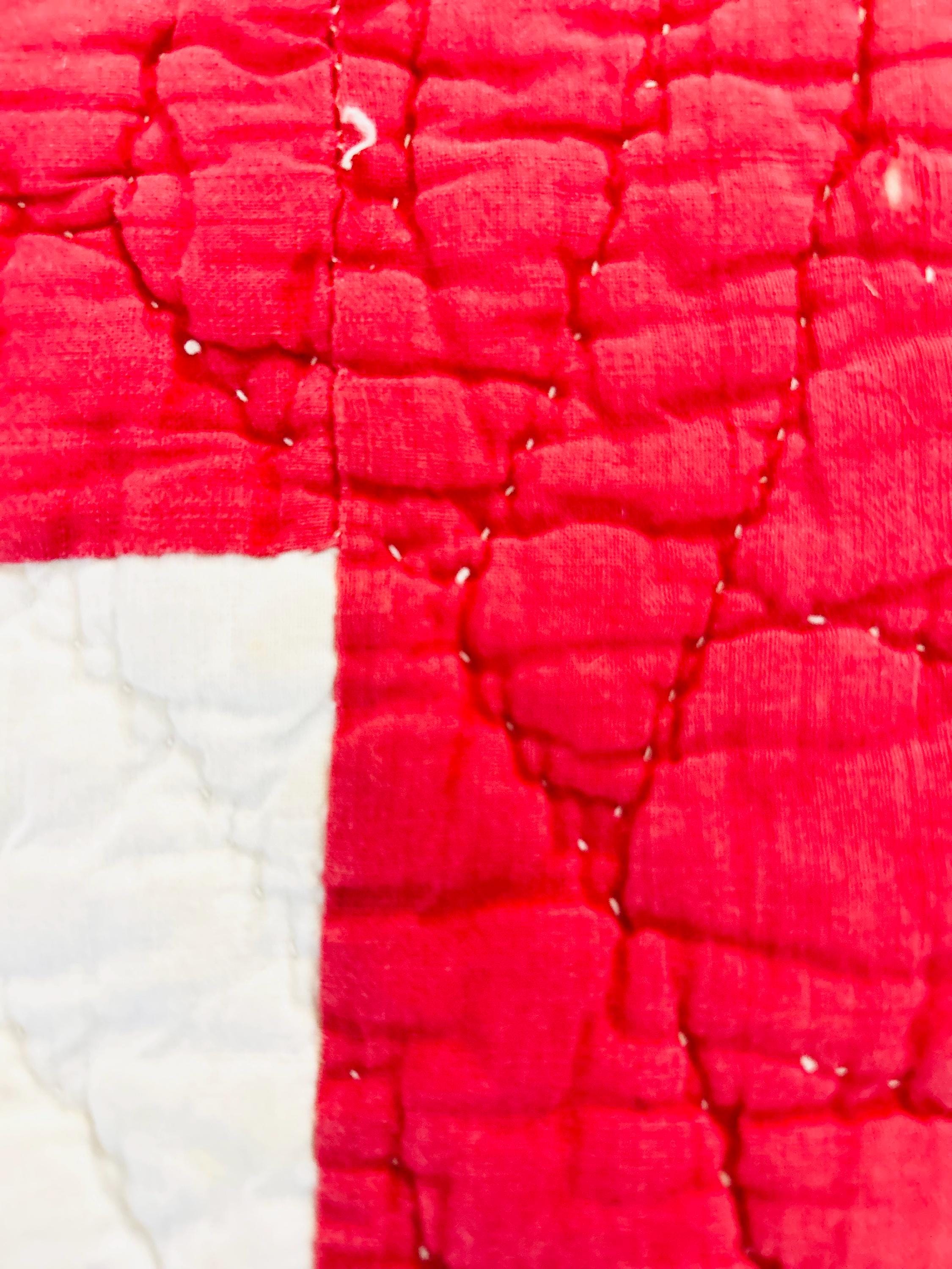 The back is off-white cotton while the binding is red cotton that has been machine stitched to the front and hand-stitched to the back. The unsized cotton batting is lightweight.