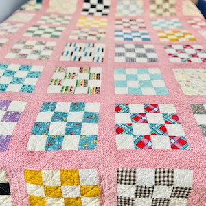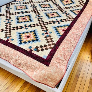 The quilt is clean and soft and measures 78 inches by 78 inches and comes from a smoke-free and pet-free home. Pictured on a queen-size bed.