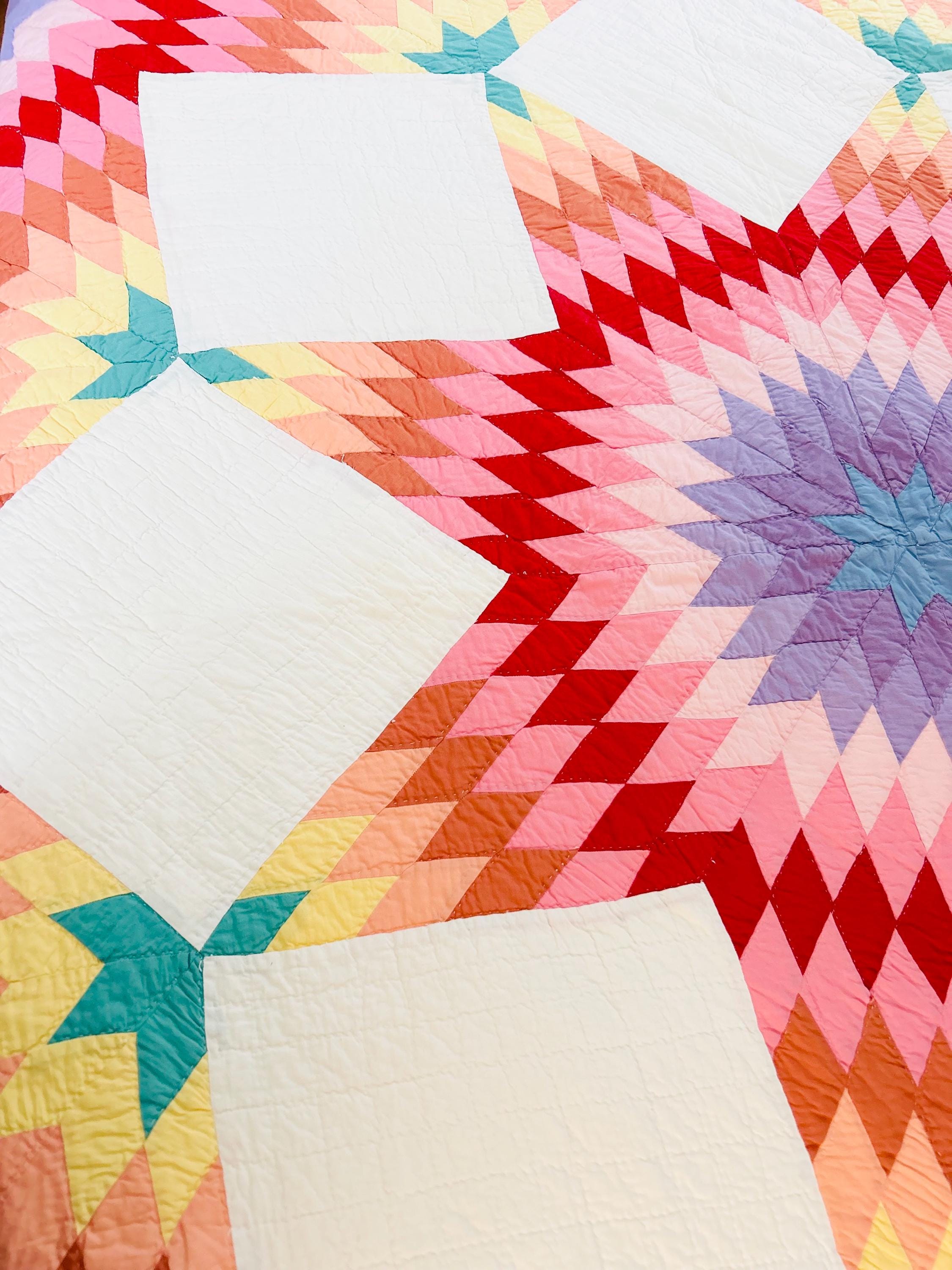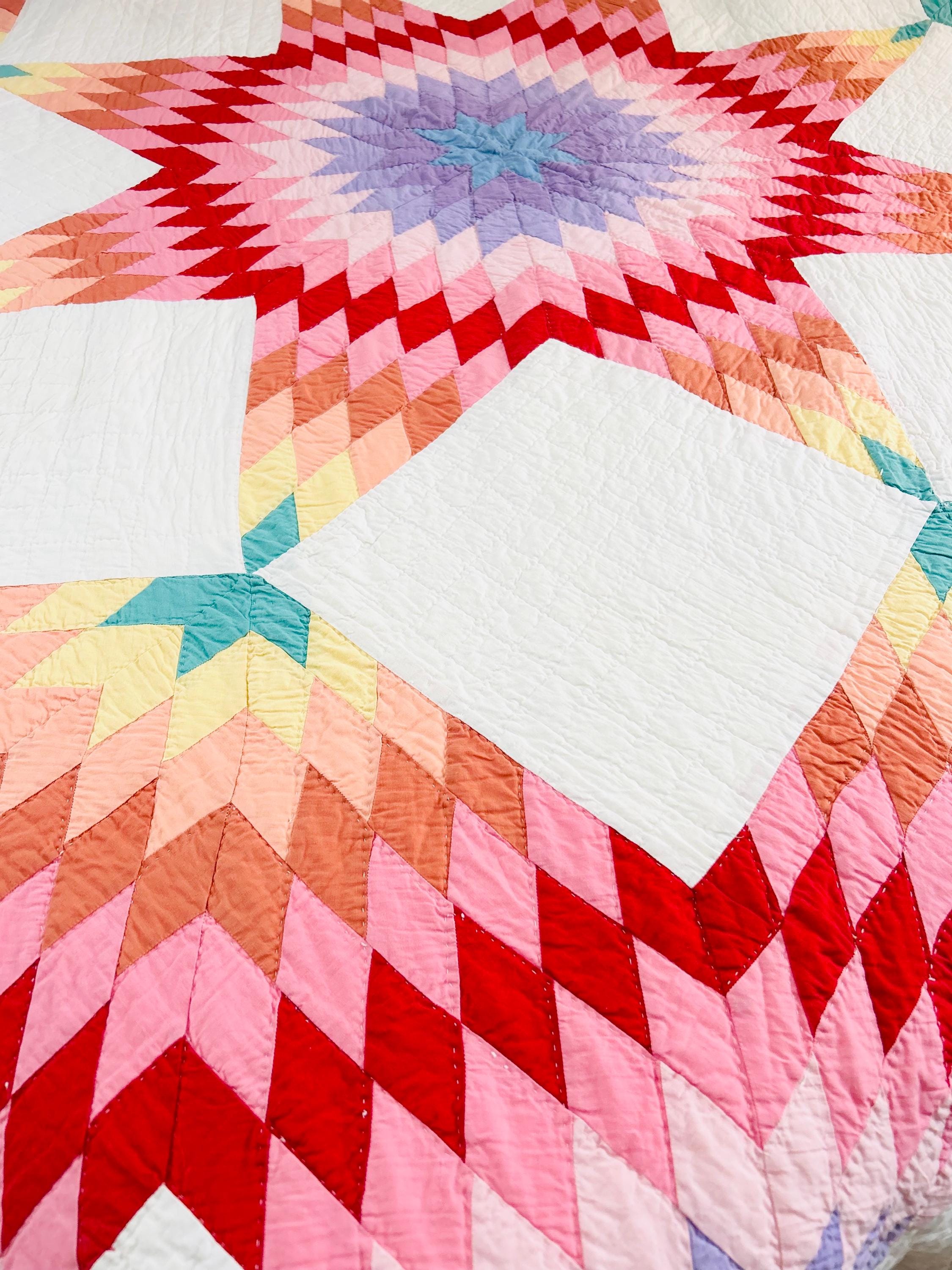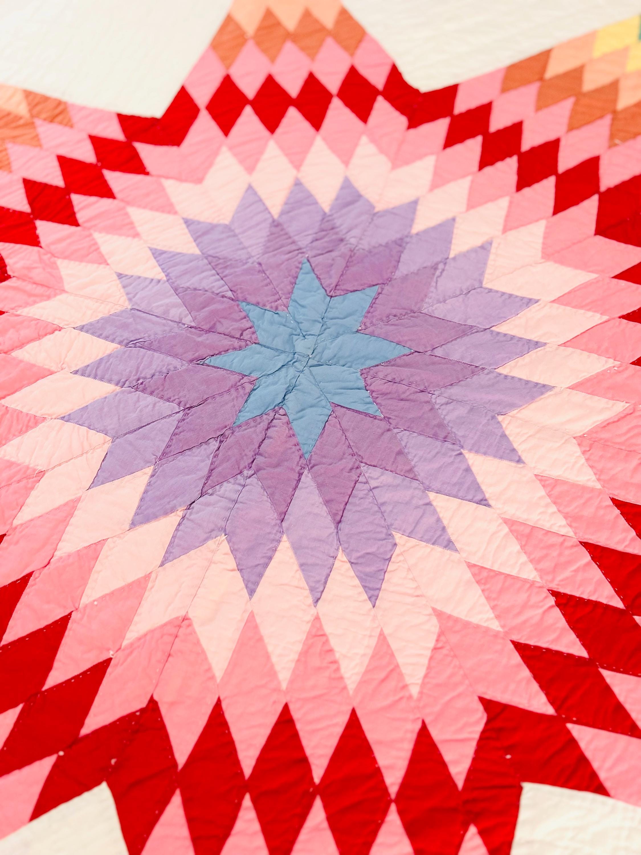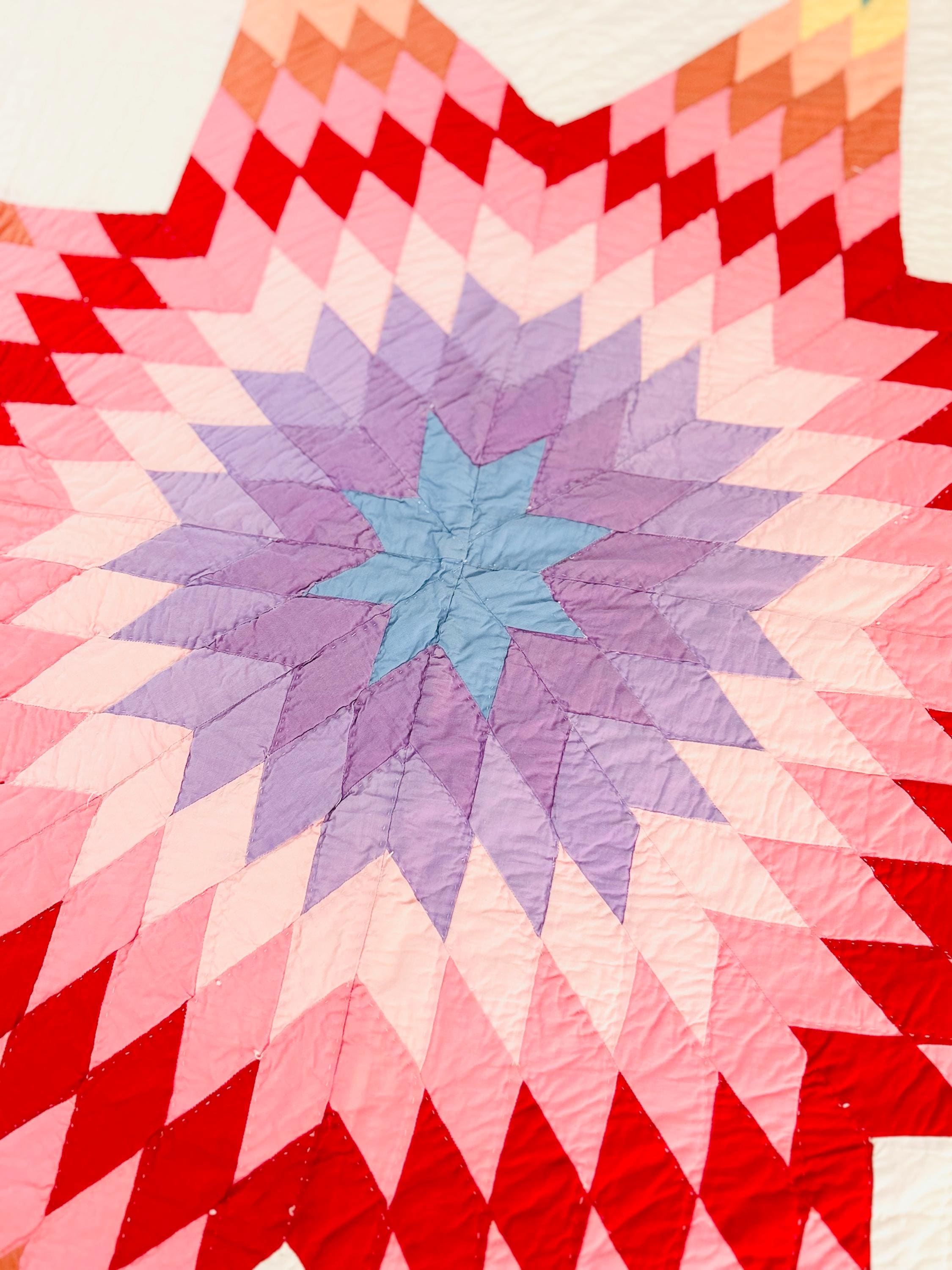This wonderful Broken Star Quilt, circa 1930-1940s, is beautifully pieced (with one hardly noticeable, small piecing misstep in one of the dark pink rows). The quilting is entirely by hand and in outlines of all of the more than 2,000 diamonds and in a diamond pattern in the white areas.