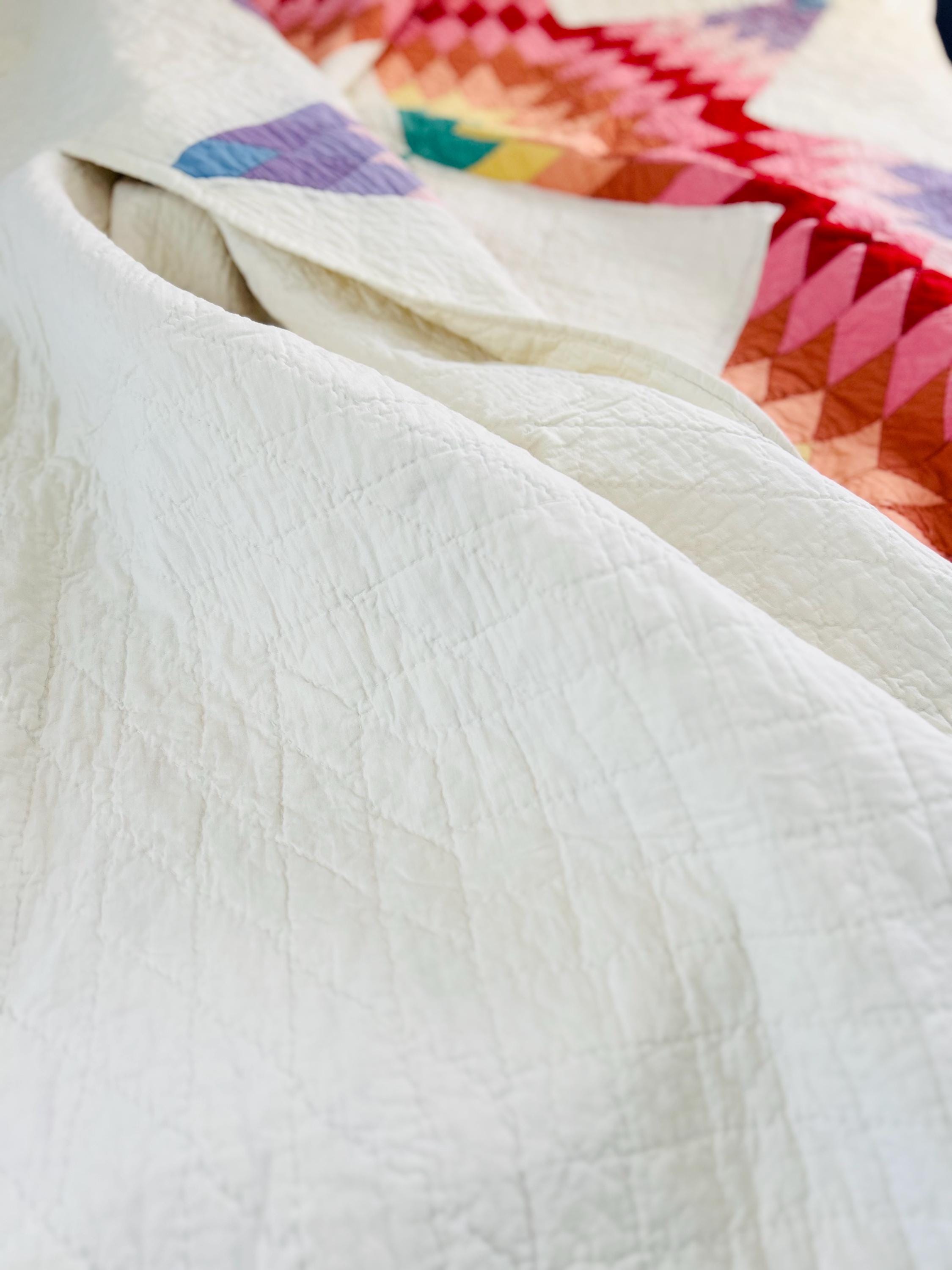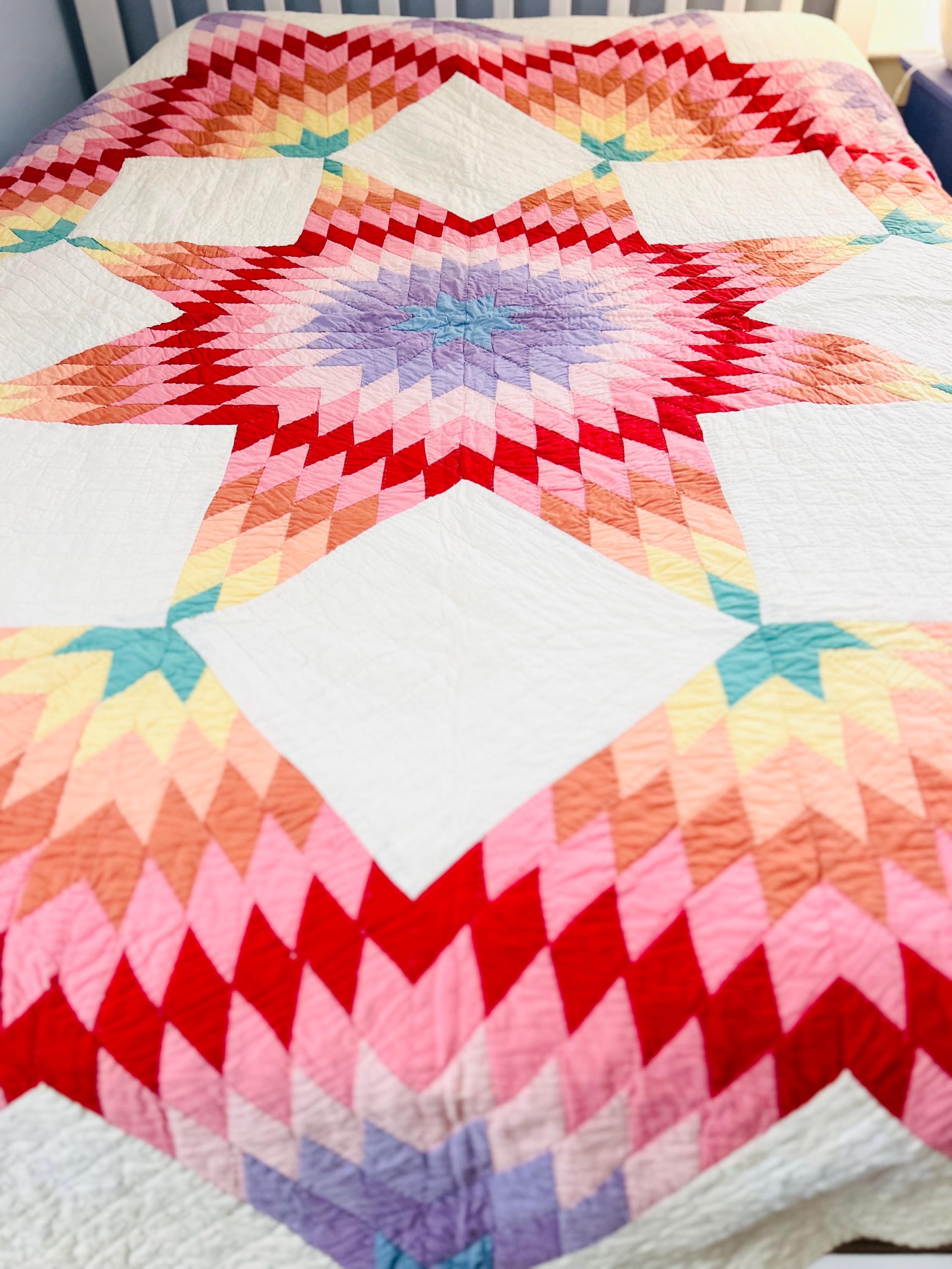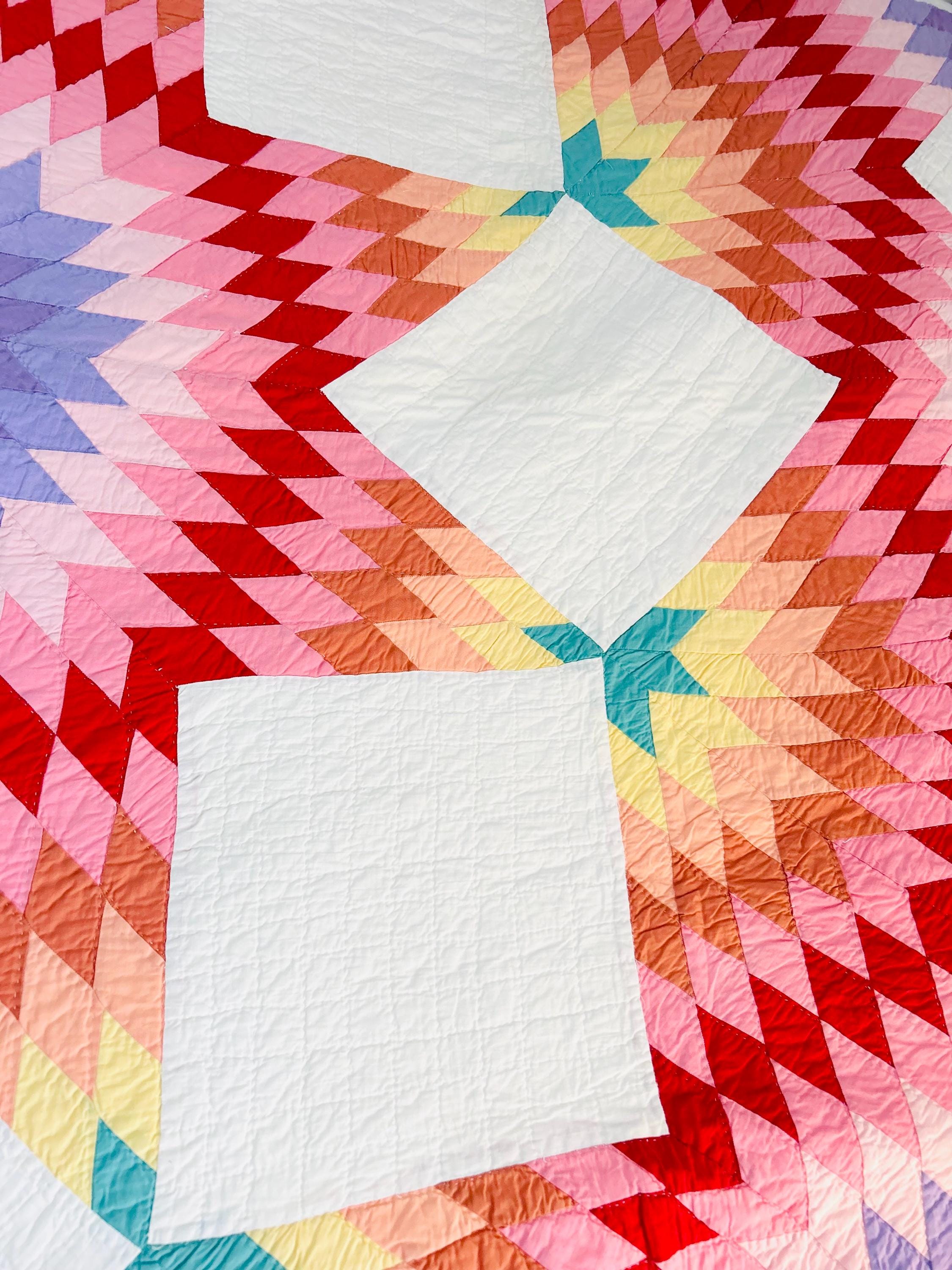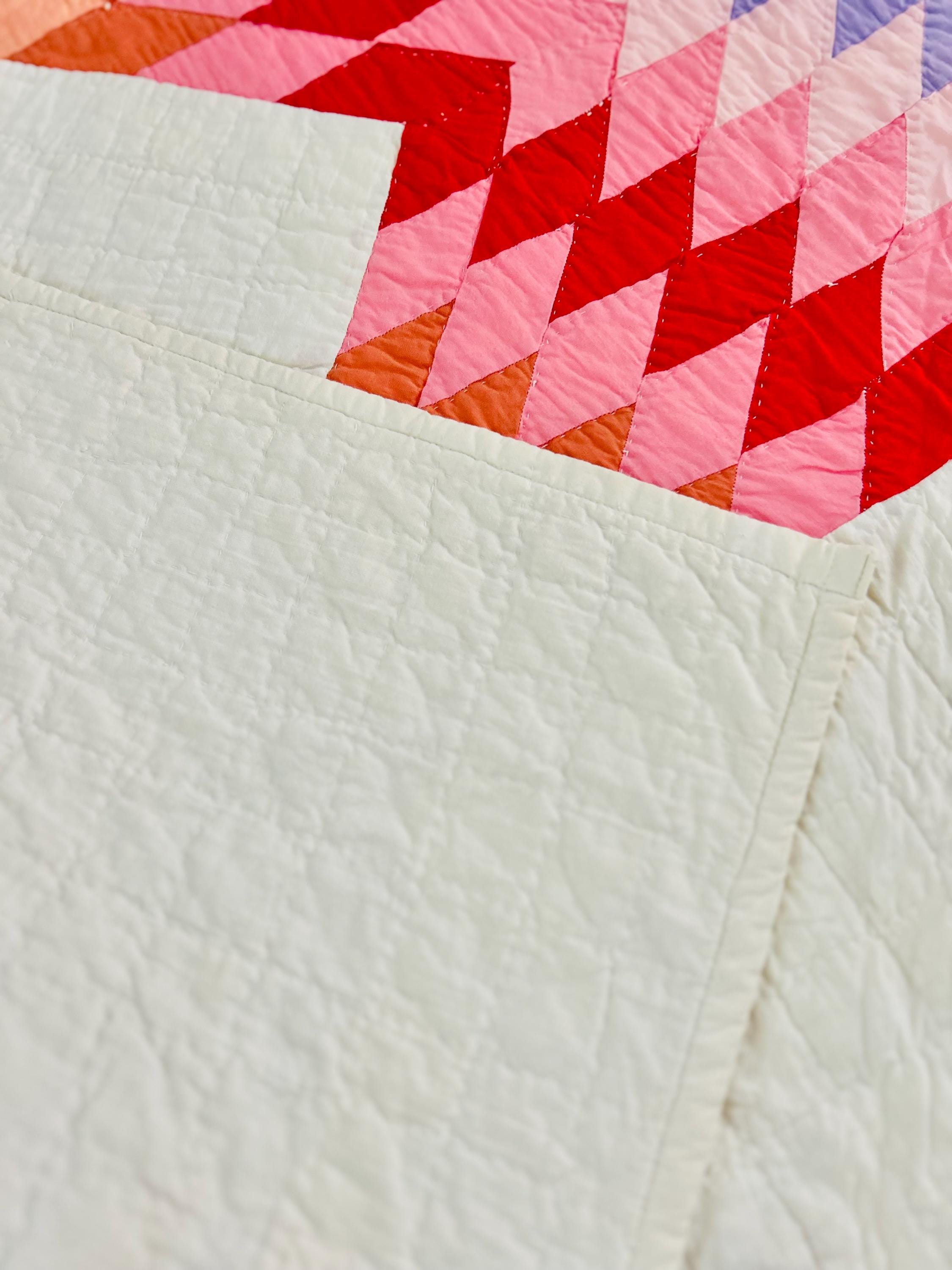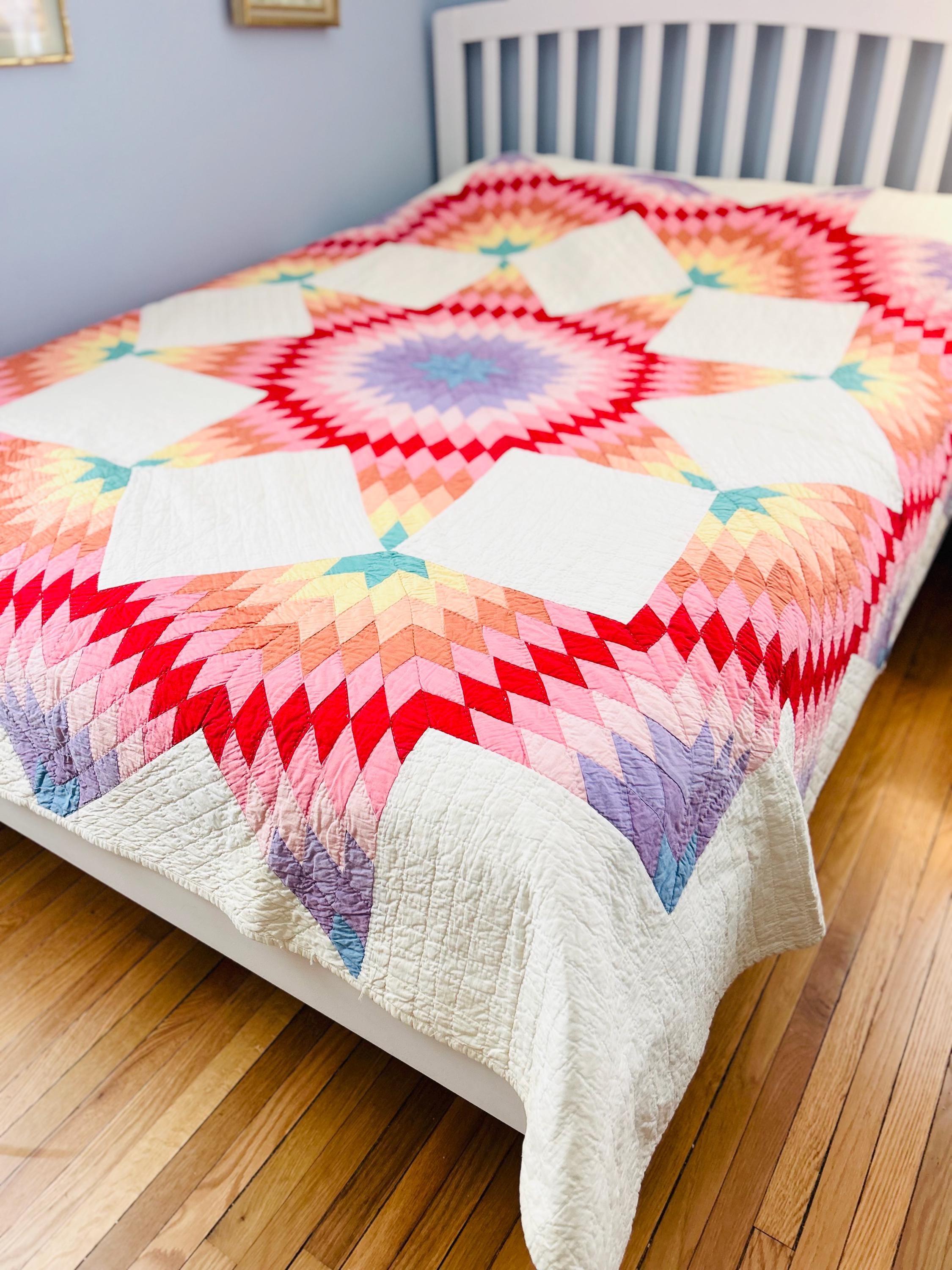 This wonderful Broken Star Quilt, circa 1930-1940s, is beautifully pieced (with one hardly noticeable, small piecing misstep in one of the dark pink rows). The quilting is entirely by hand and in outlines of all of the more than 2,000 diamonds and in a diamond pattern in the white areas.