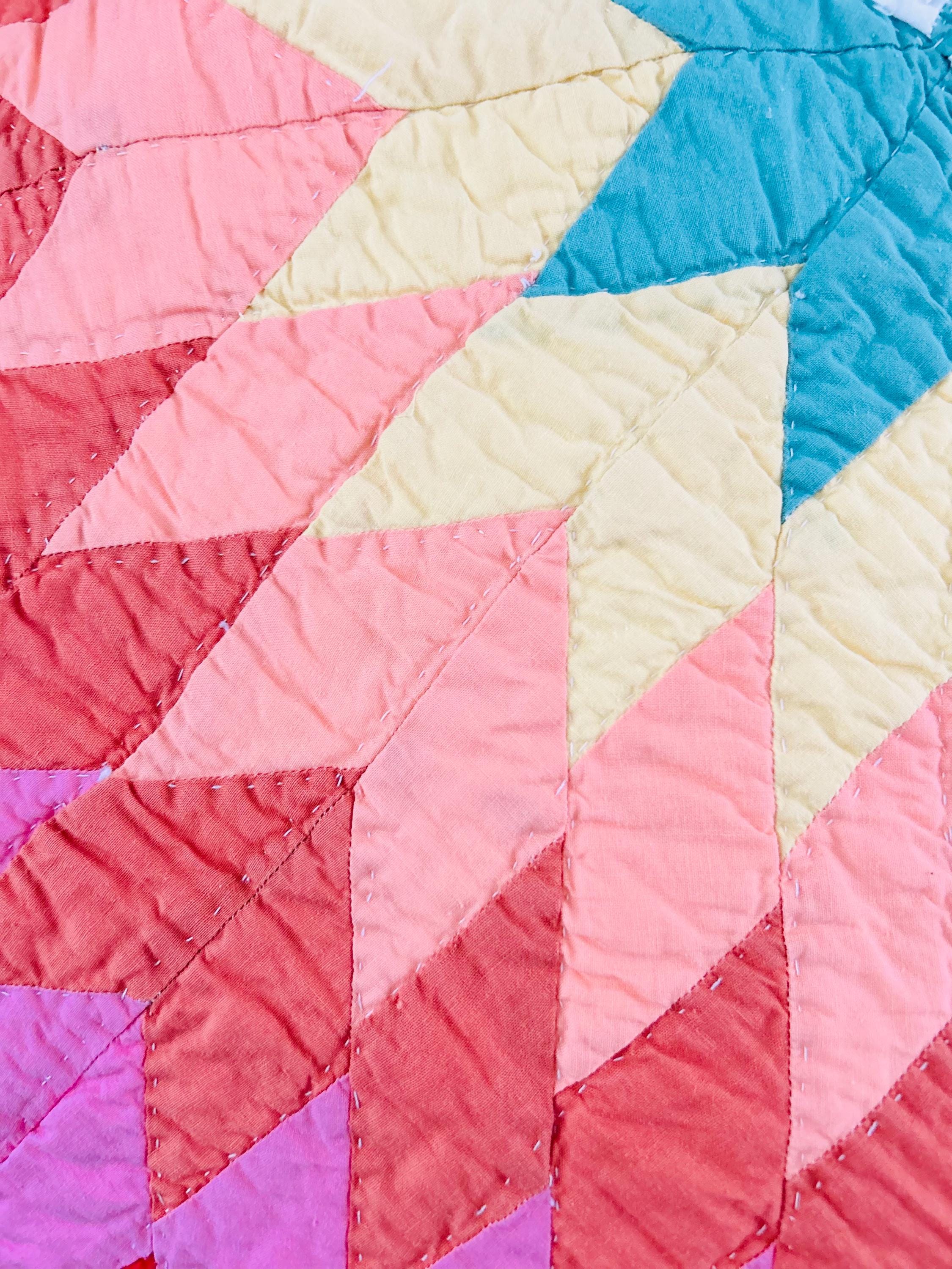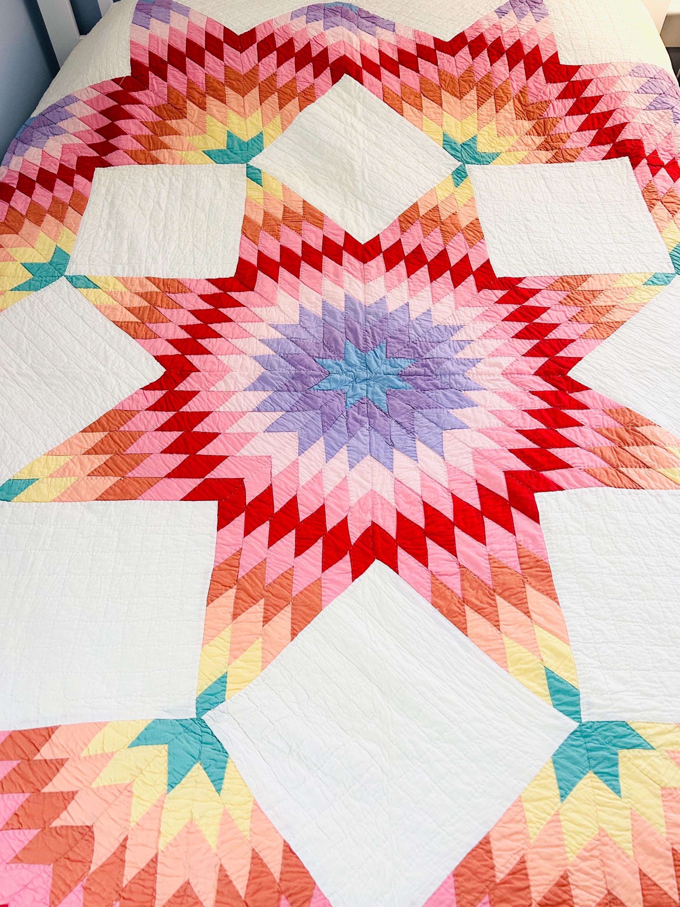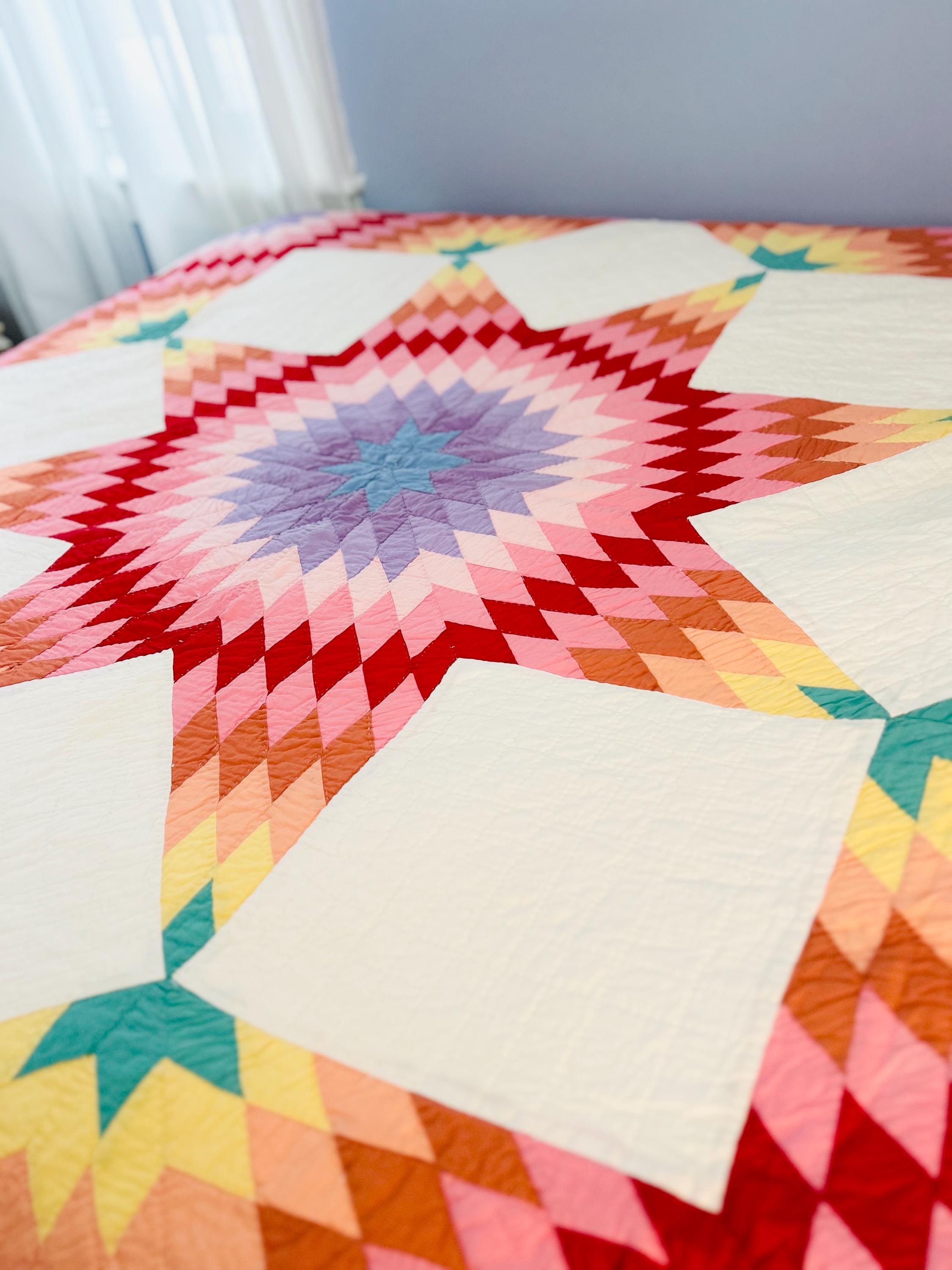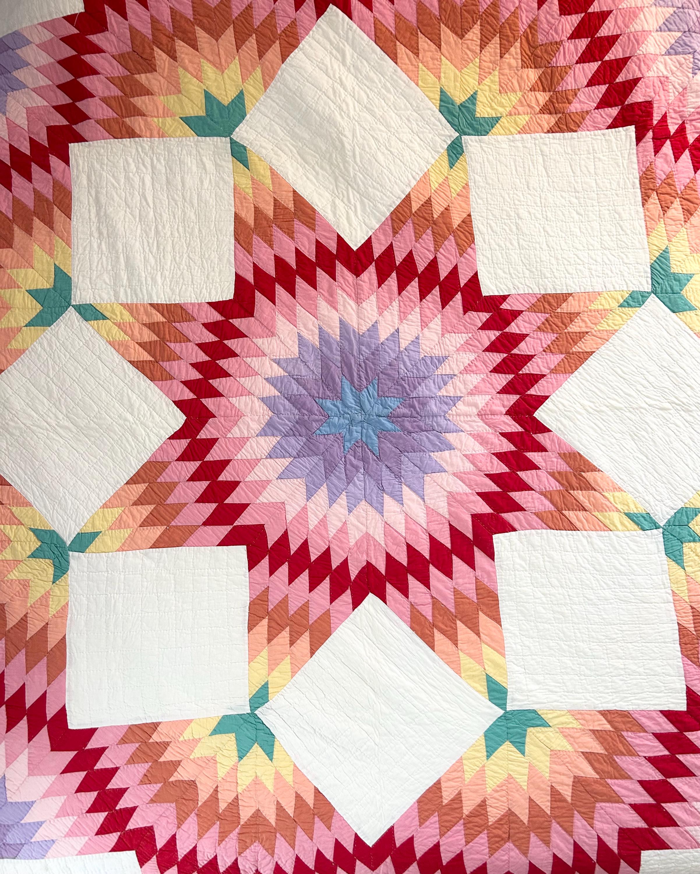 This wonderful Broken Star Quilt, circa 1930-1940s, is beautifully pieced (with one hardly noticeable, small piecing misstep in one of the dark pink rows). The quilting is entirely by hand and in outlines of all of the more than 2,000 diamonds and in a diamond pattern in the white areas.
