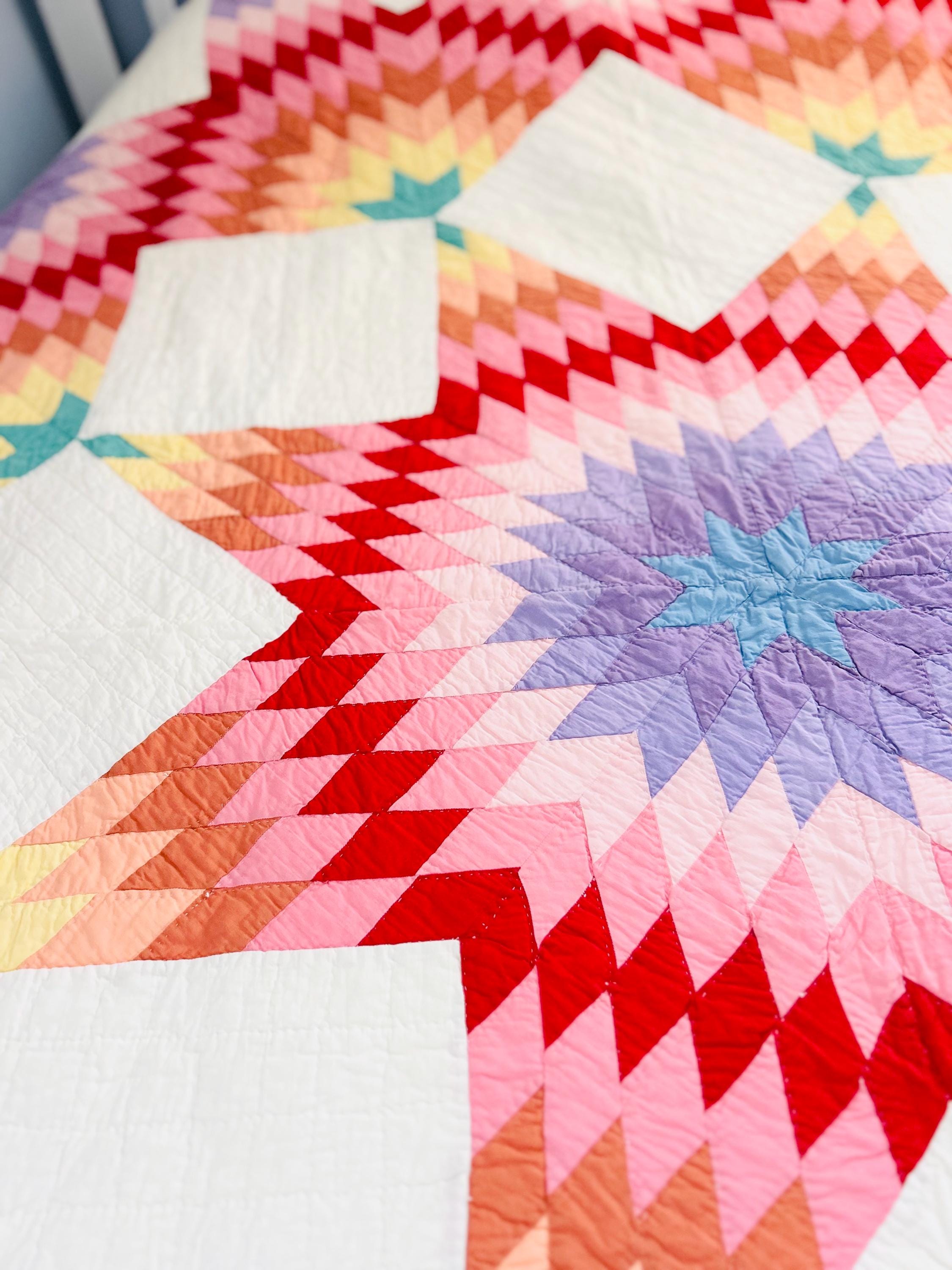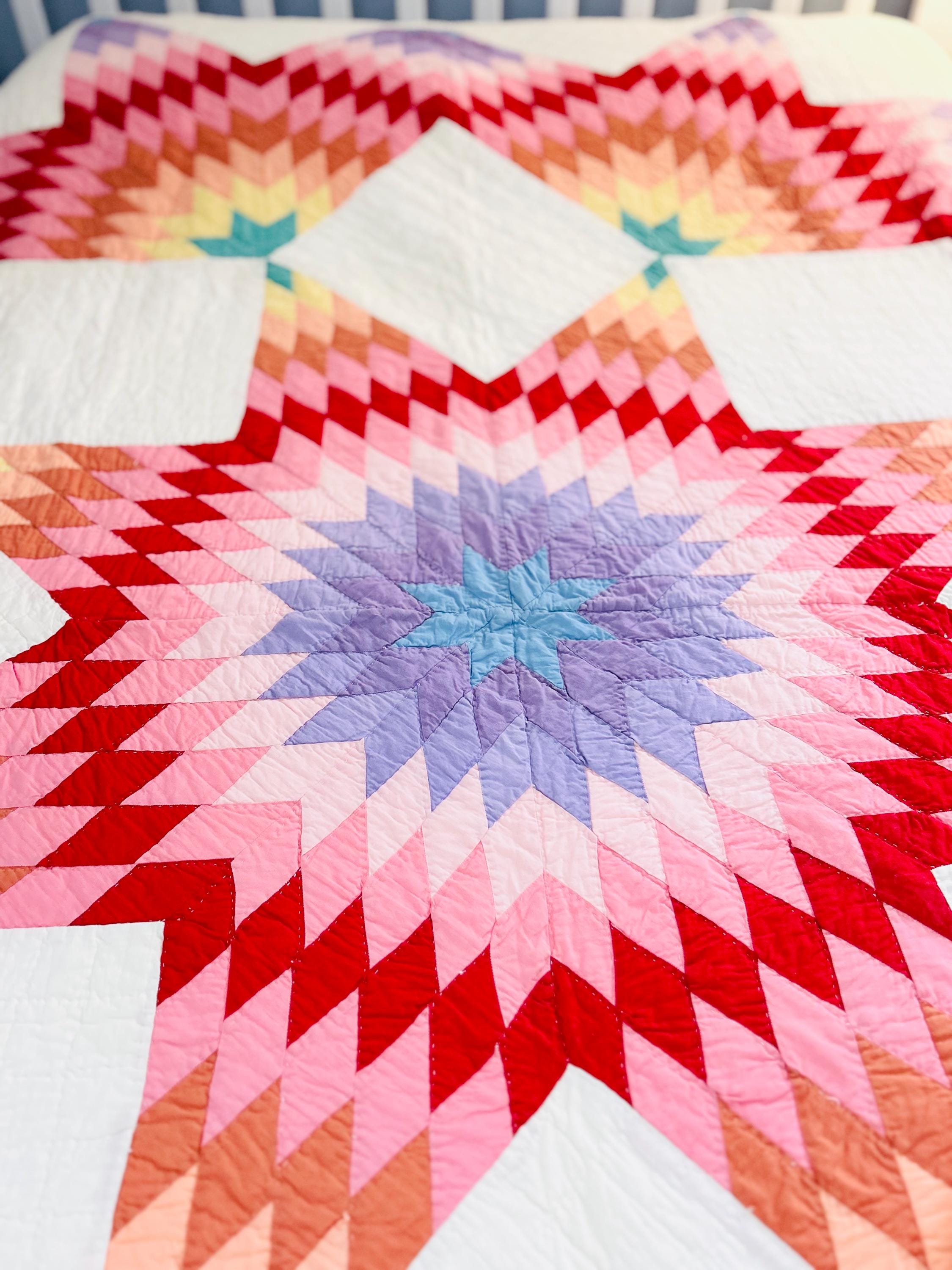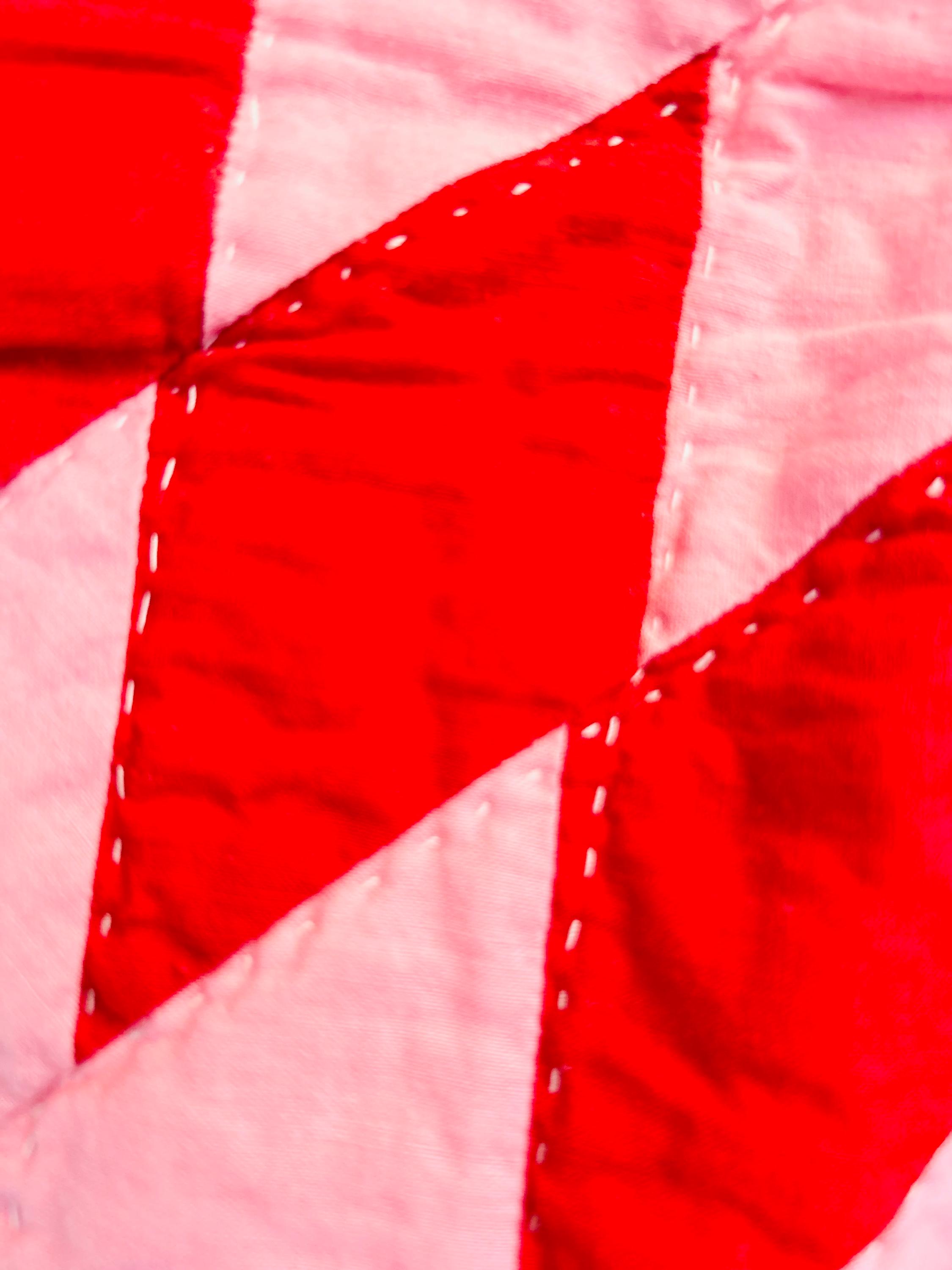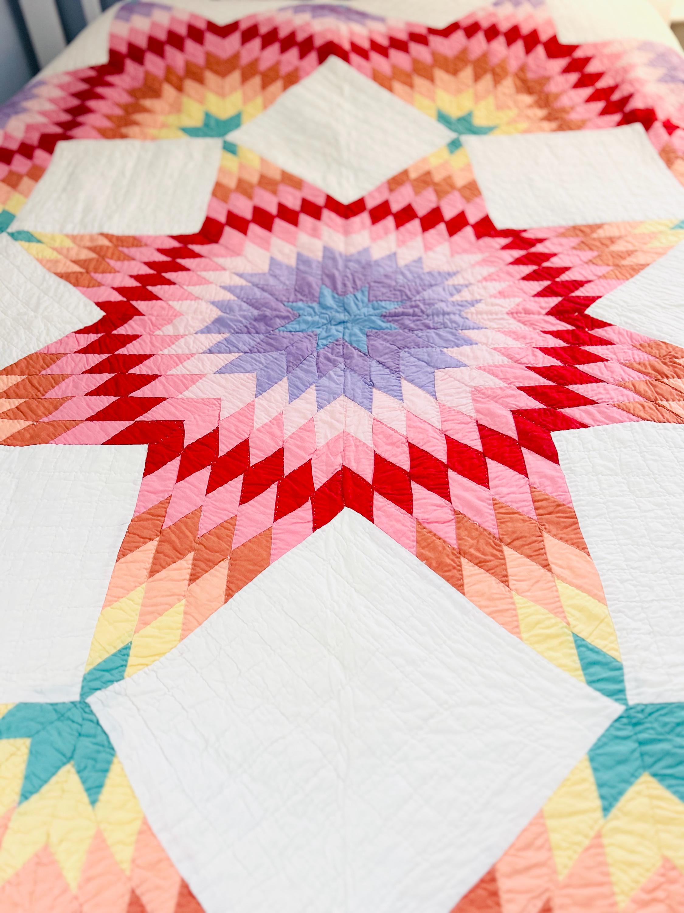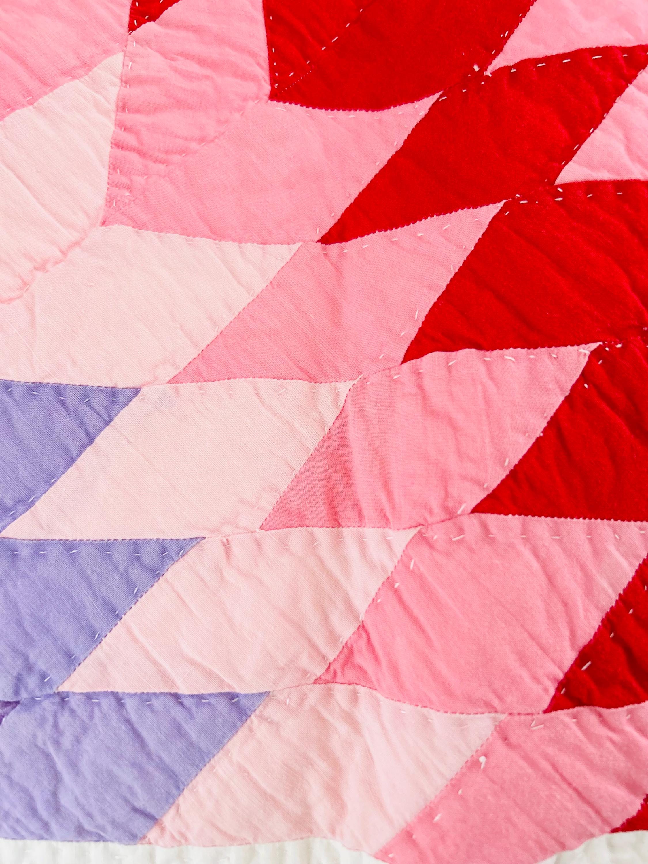 This wonderful Broken Star Quilt, circa 1930-1940s, is beautifully pieced (with one hardly noticeable, small piecing misstep in one of the dark pink rows). The quilting is entirely by hand and in outlines of all of the more than 2,000 diamonds and in a diamond pattern in the white areas.