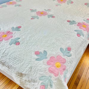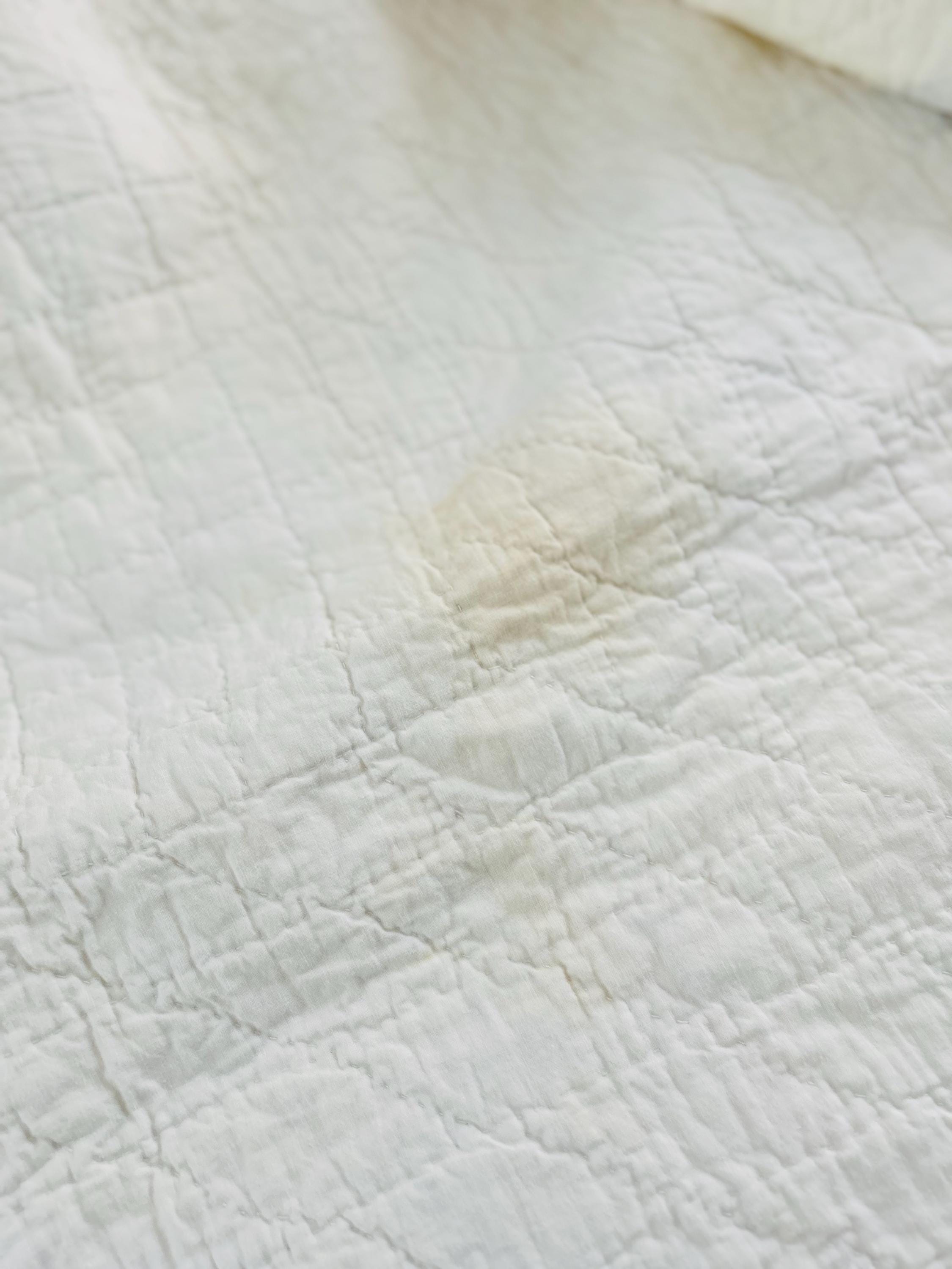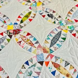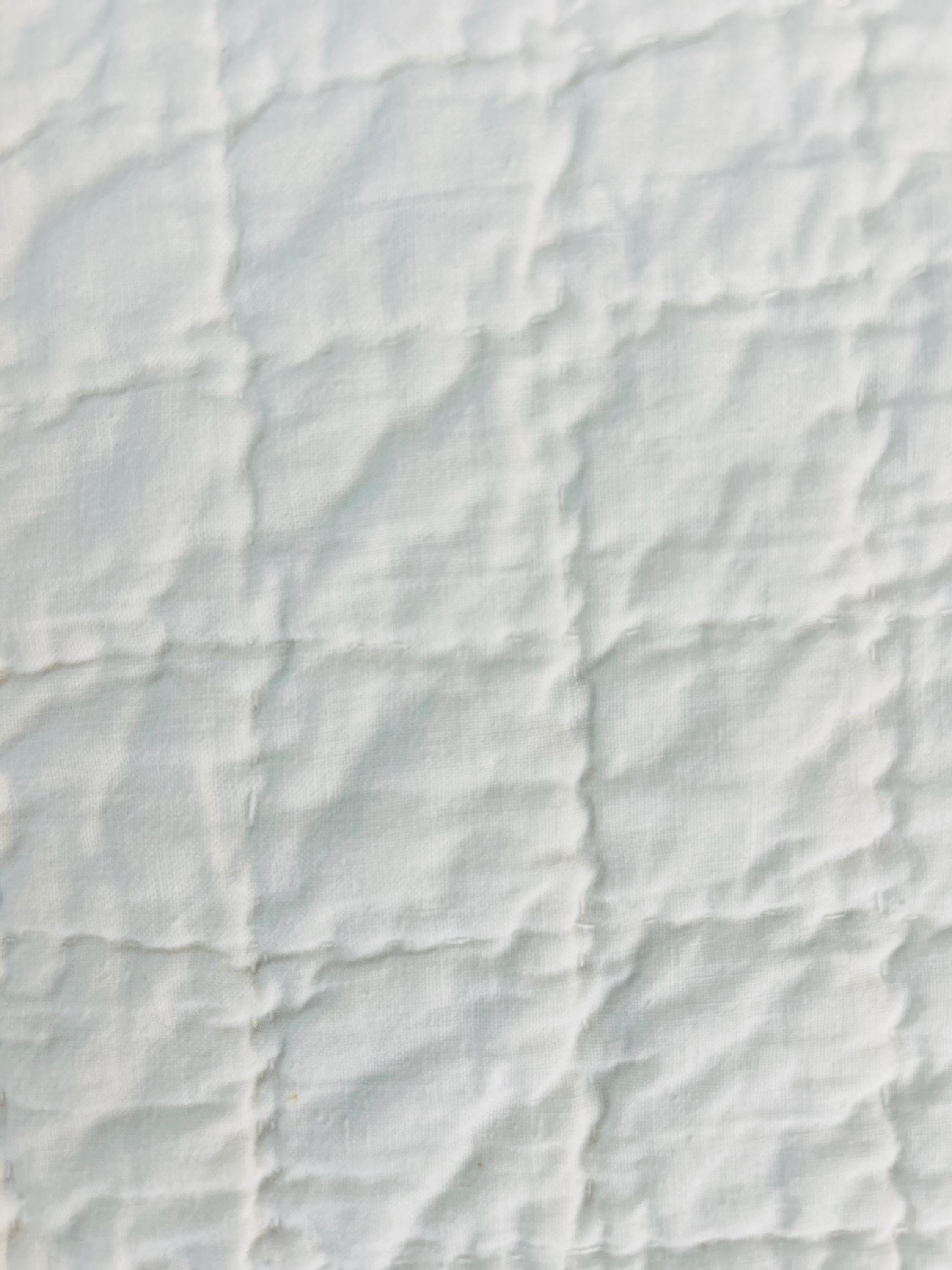 The back is white cotton which has been turned to the front and machine stitched to form the binding. The cotton batting is lightweight.