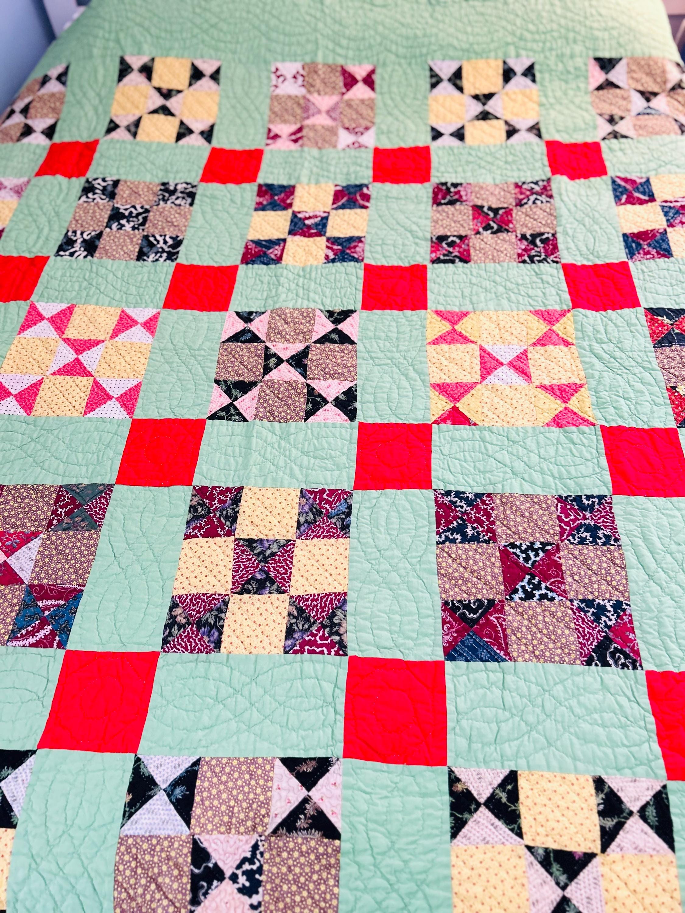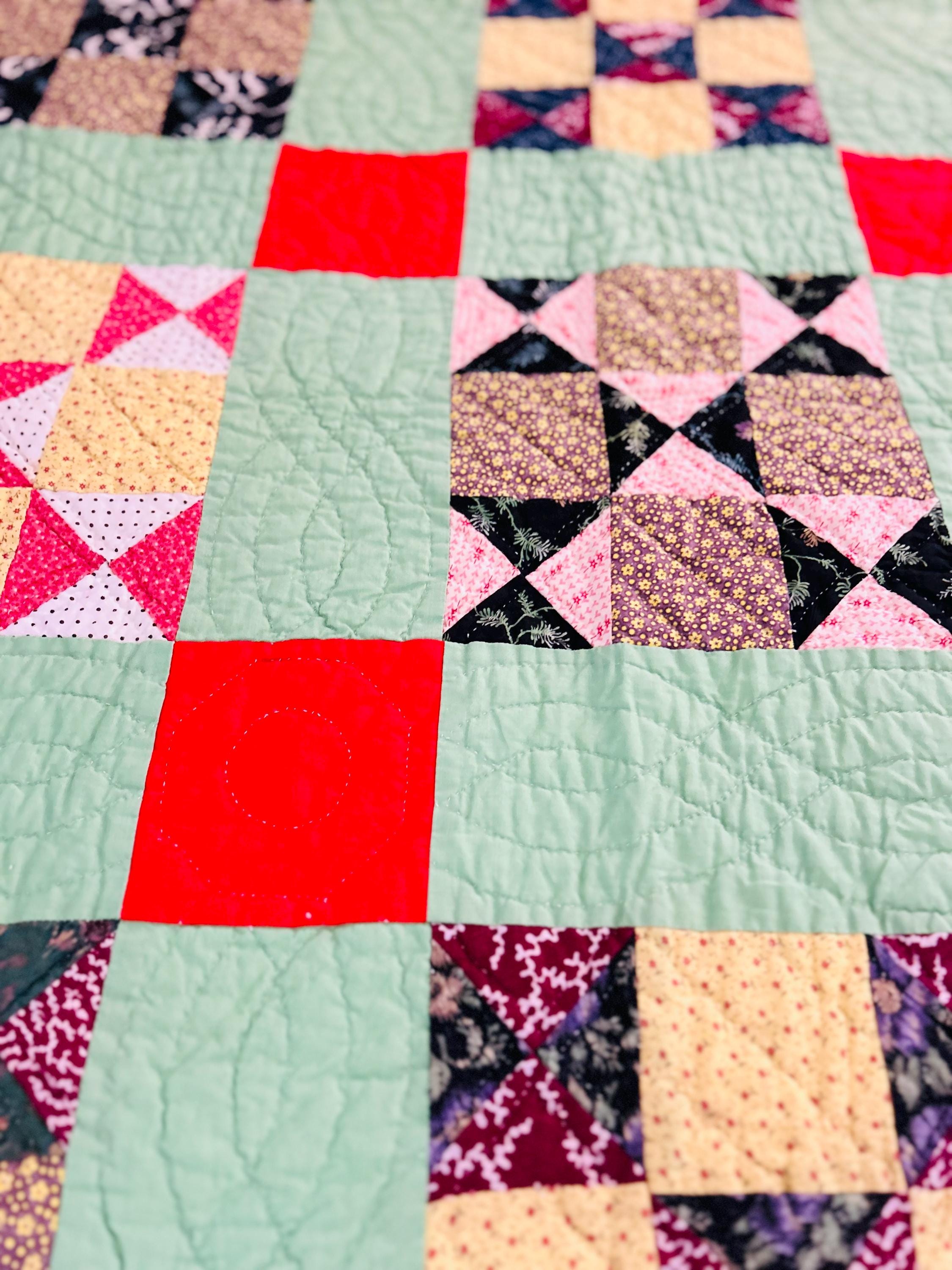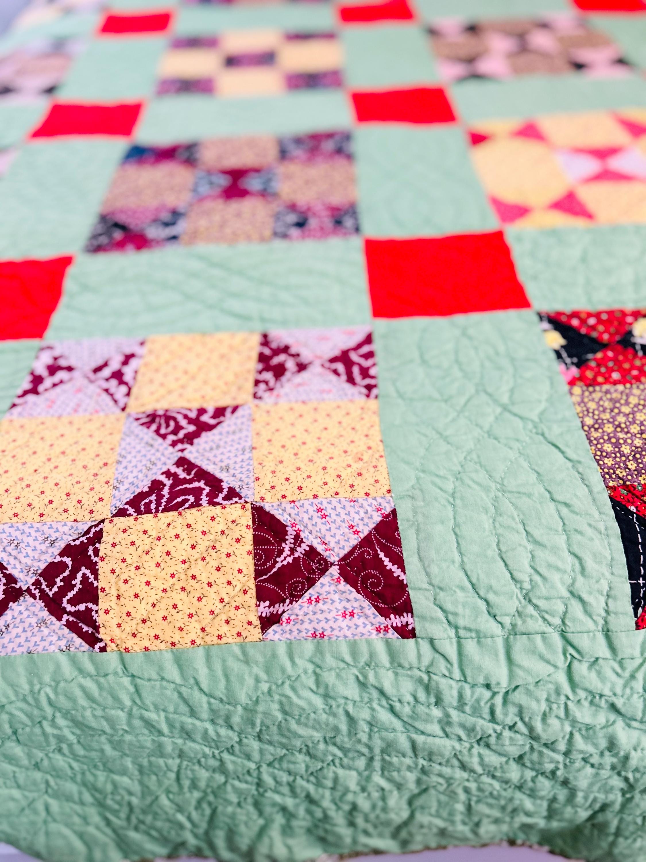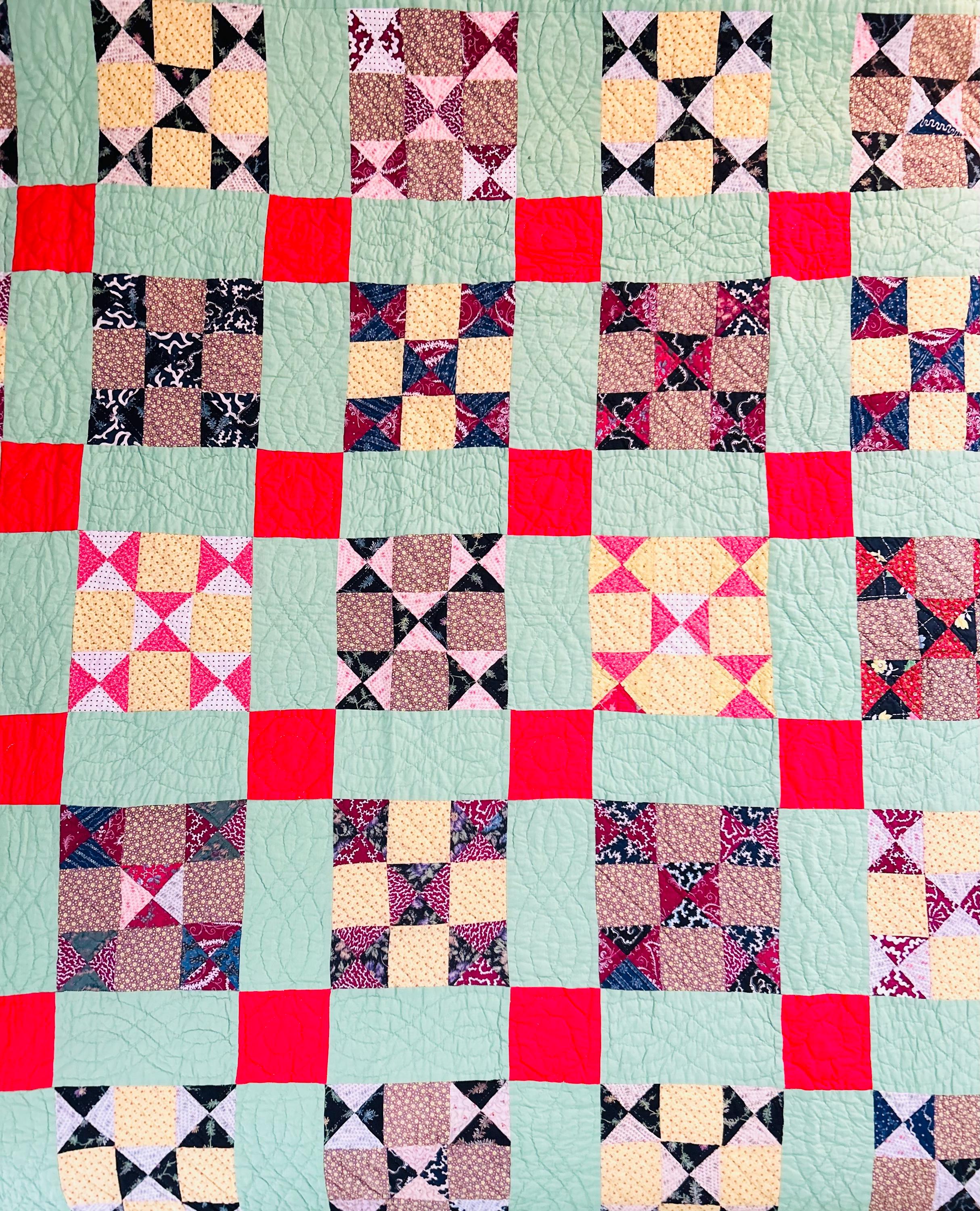 Nine-Patch and Old Tippecanoe Quilt from the 1940s to 1950s. This quilt has been expertly hand-quilted in a braided rope pattern in the sashing and along the four-sided border.