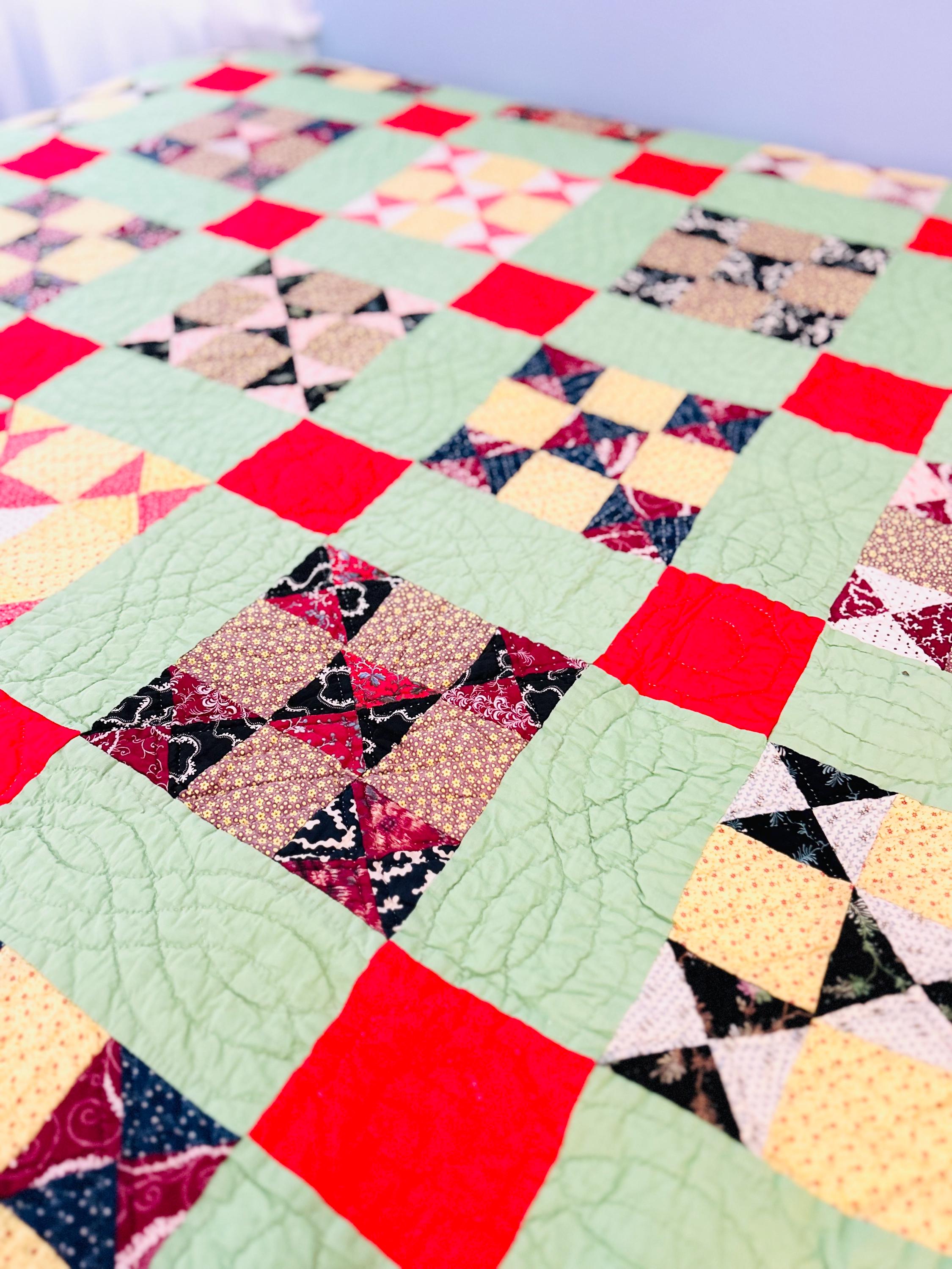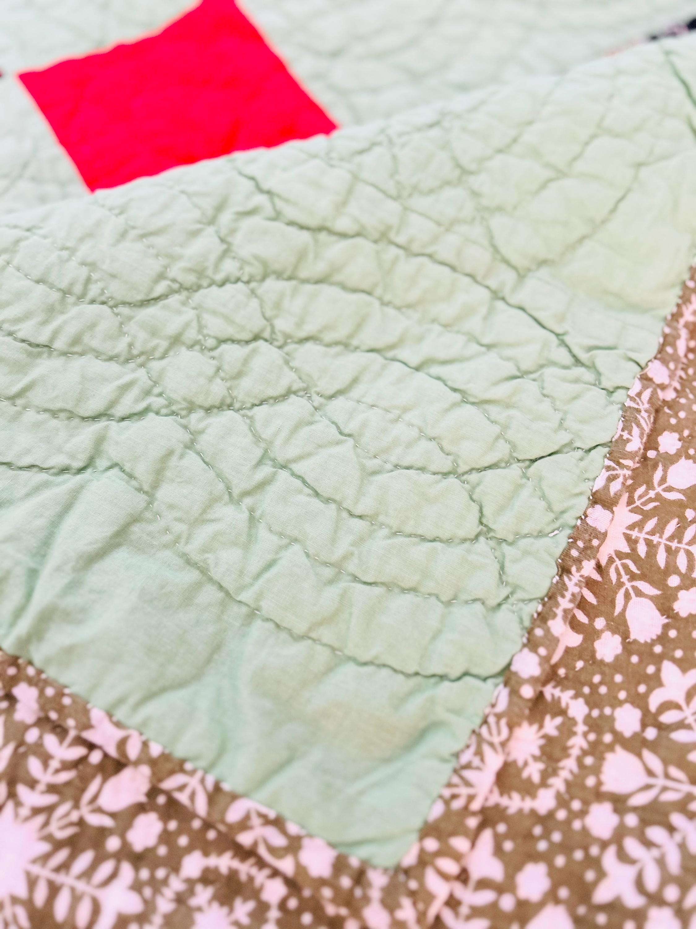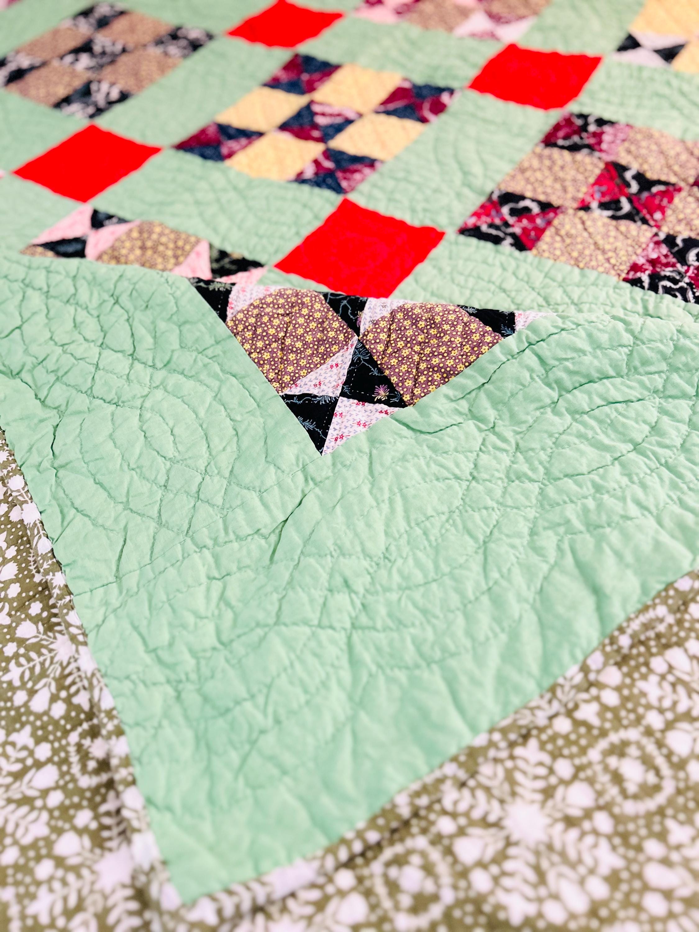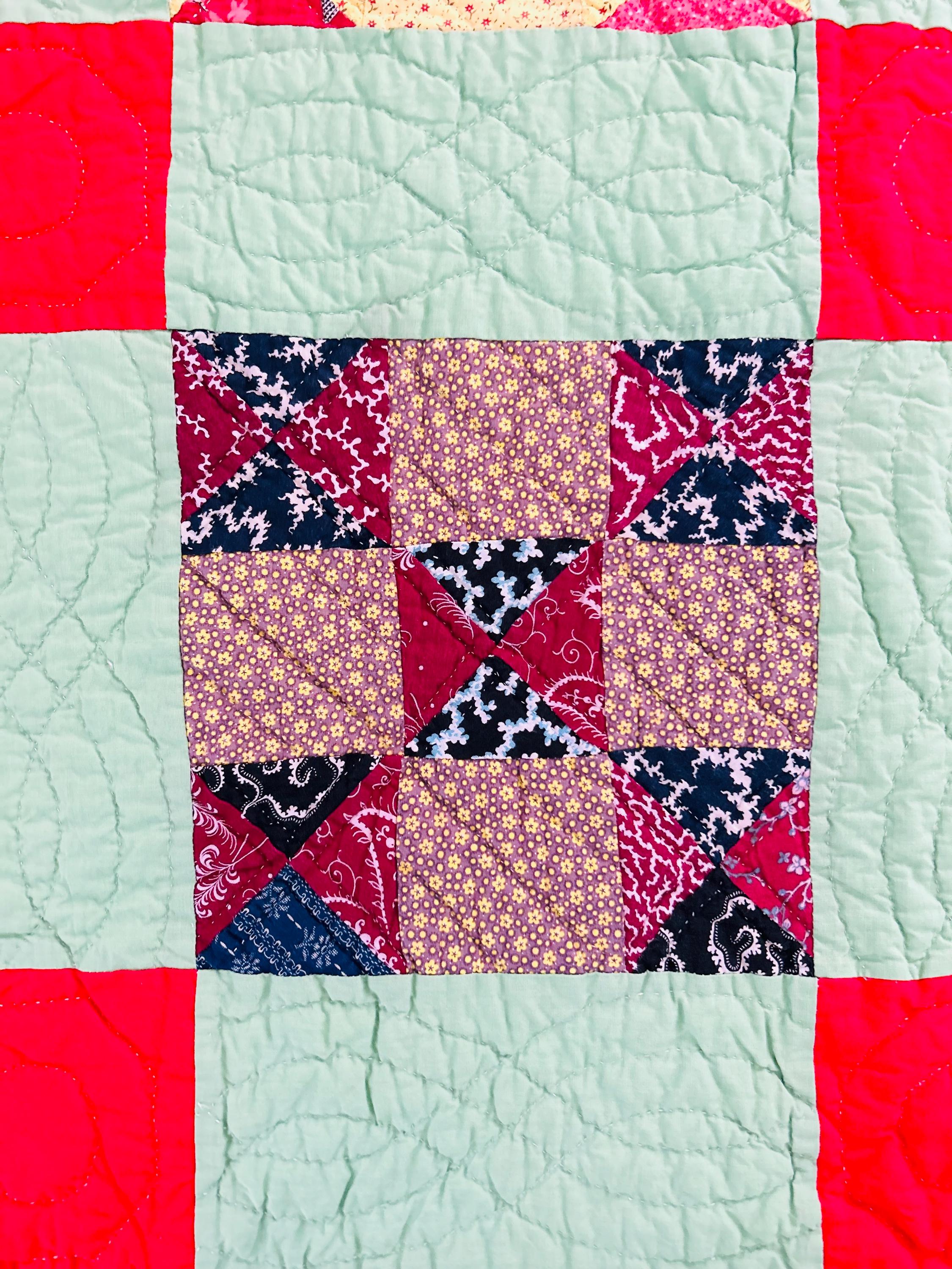 Nine-Patch and Old Tippecanoe Quilt from the 1940s to 1950s. This quilt has been expertly hand-quilted in a braided rope pattern in the sashing and along the four-sided border.