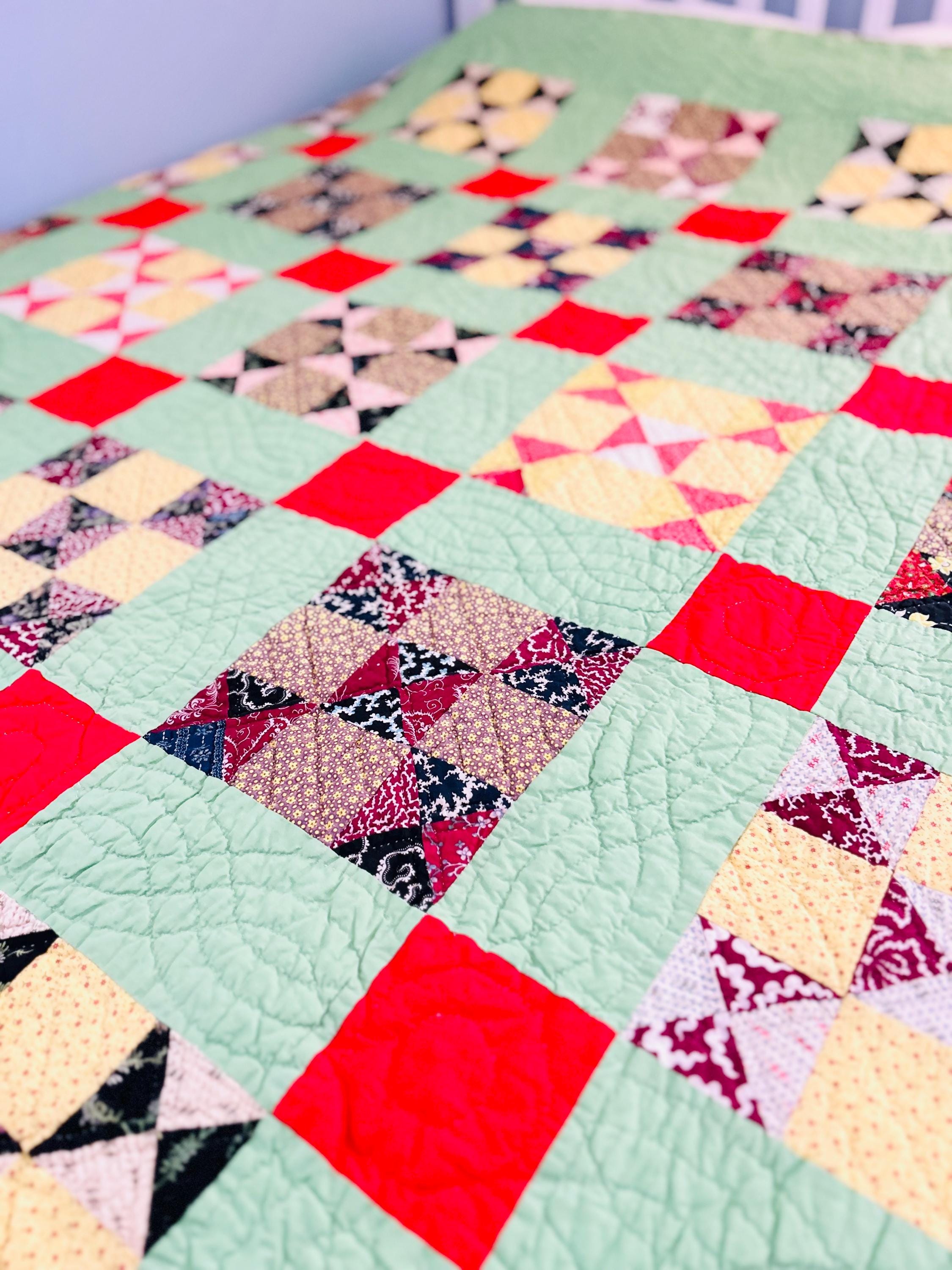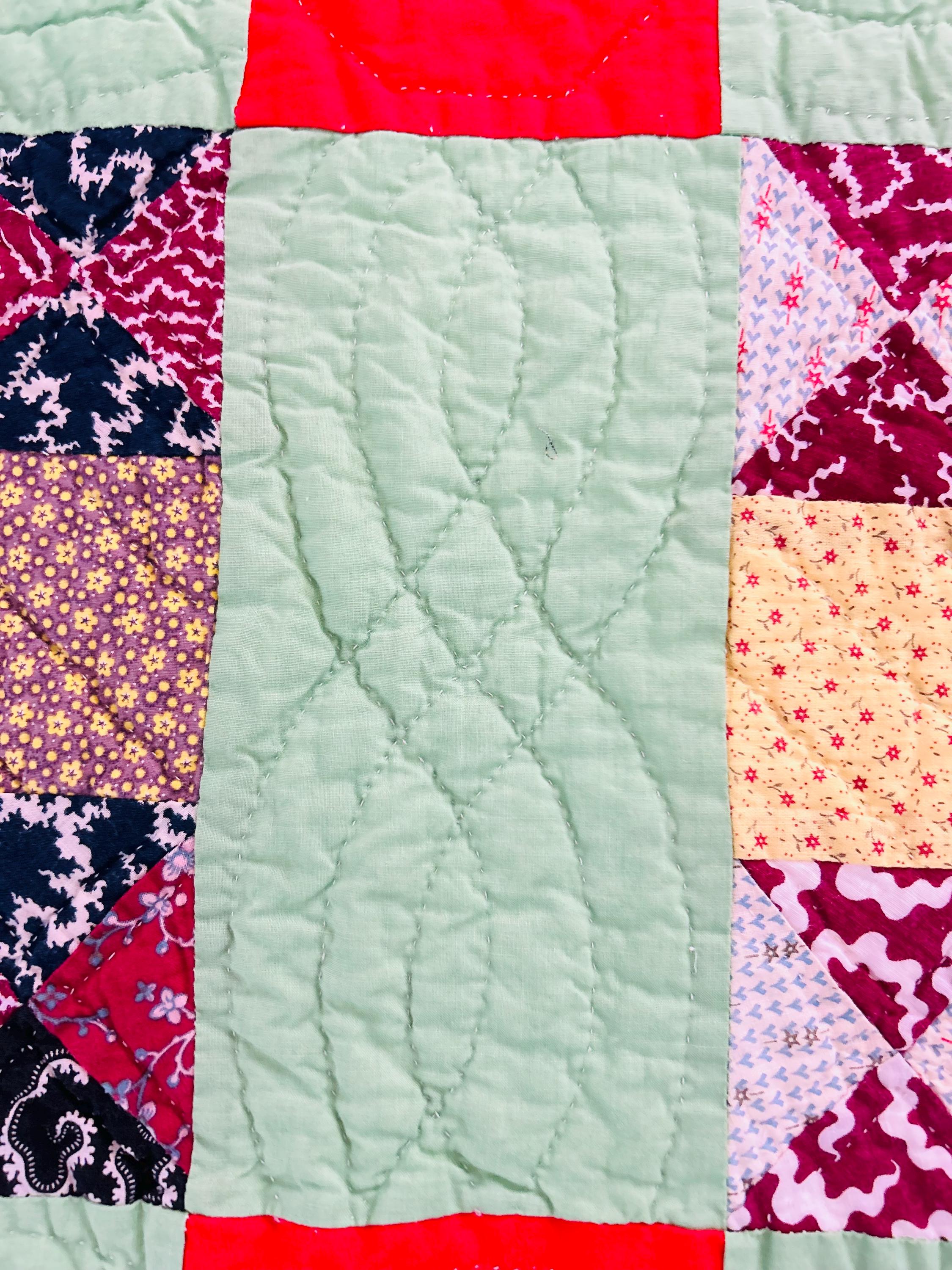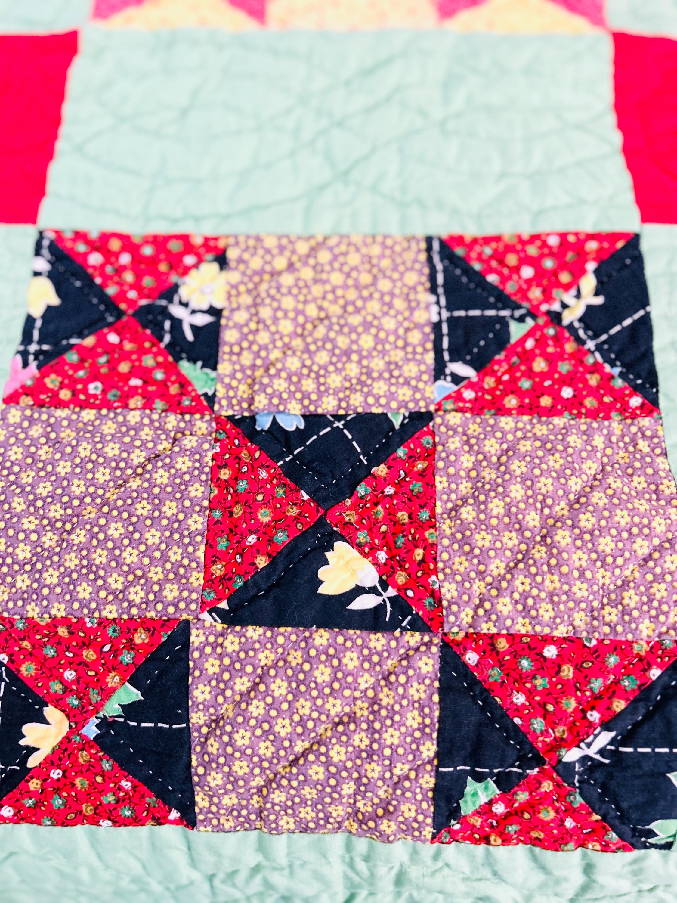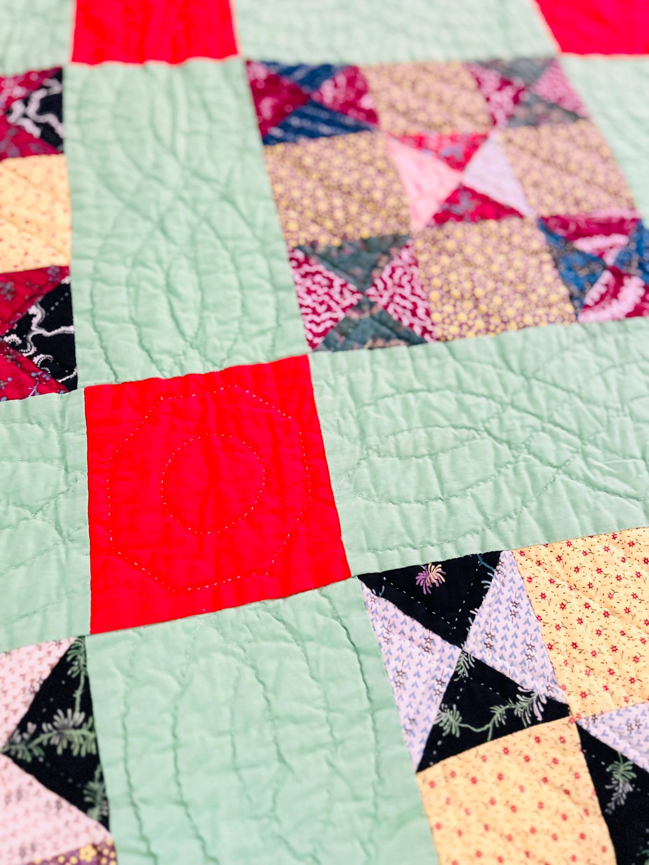 Nine-Patch and Old Tippecanoe Quilt from the 1940s to 1950s. This quilt has been expertly hand-quilted in a braided rope pattern in the sashing and along the four-sided border.