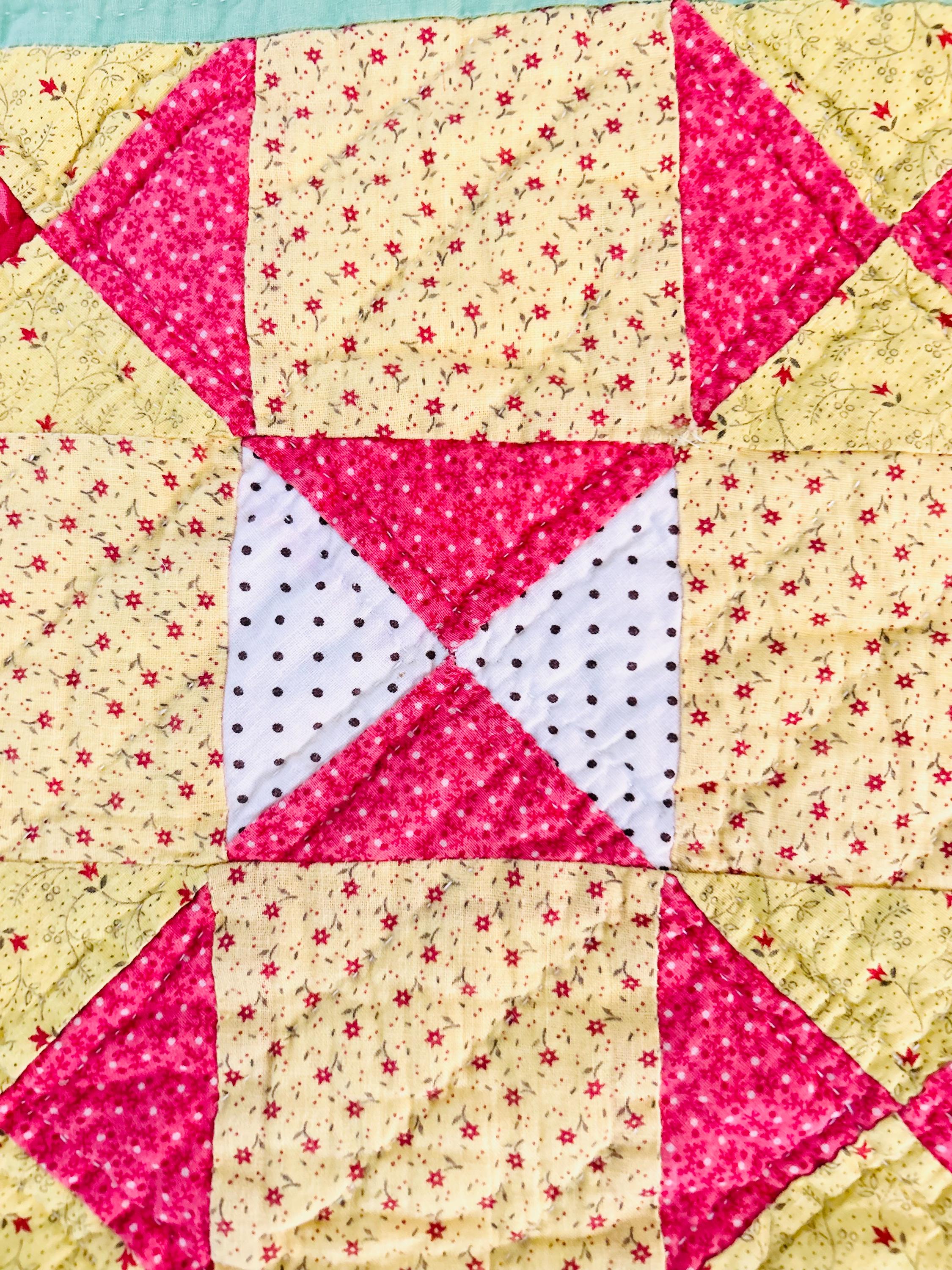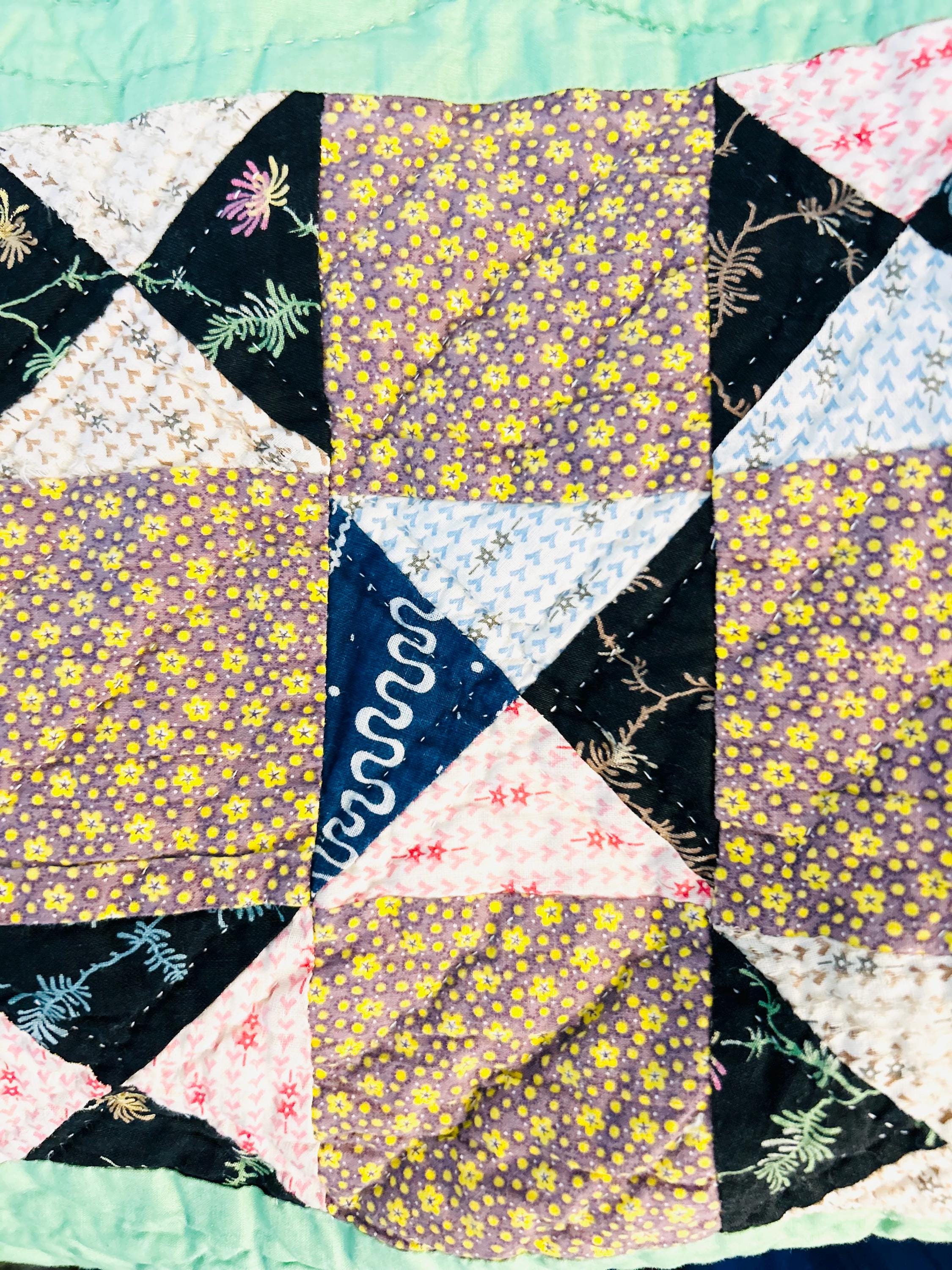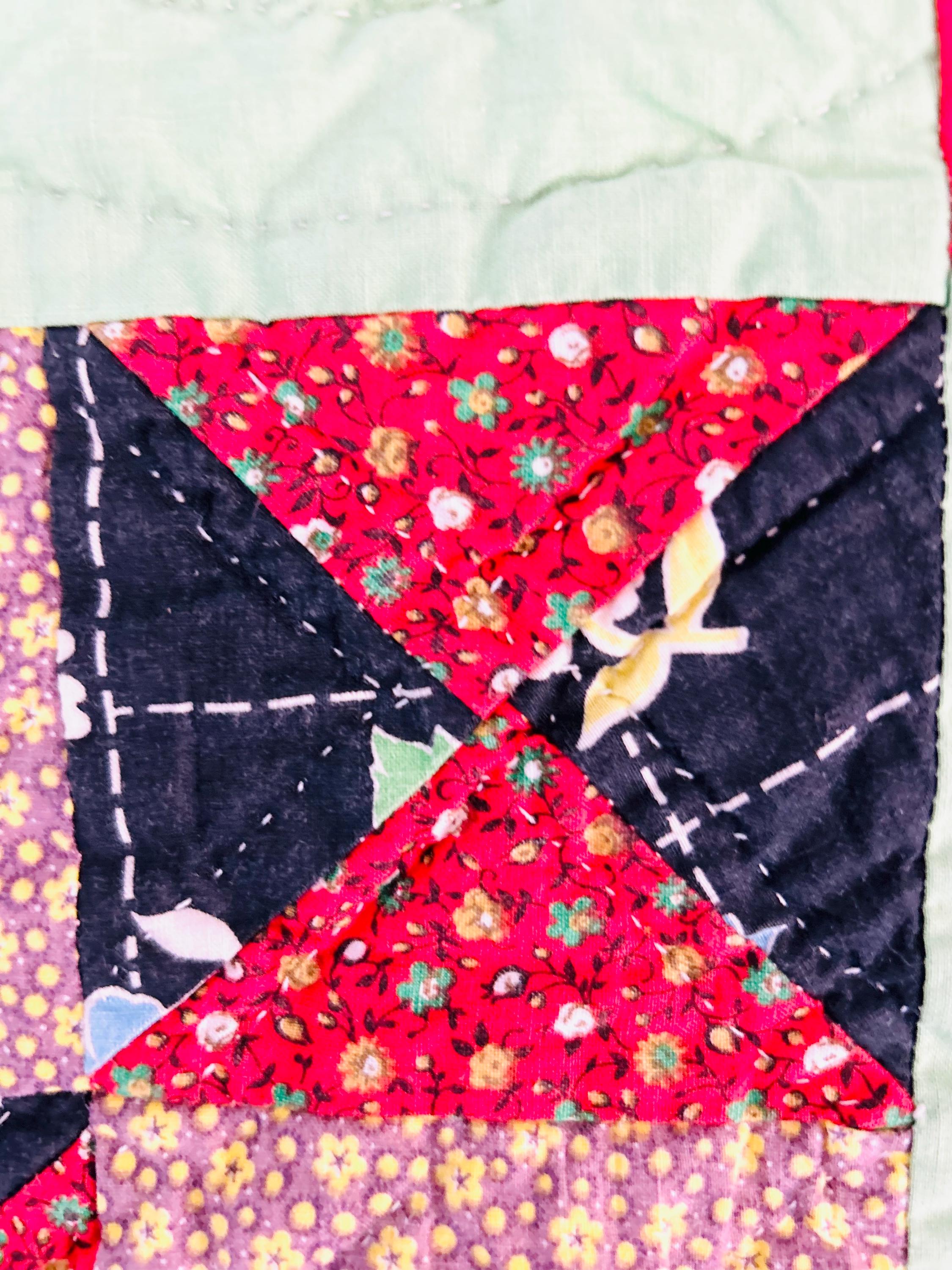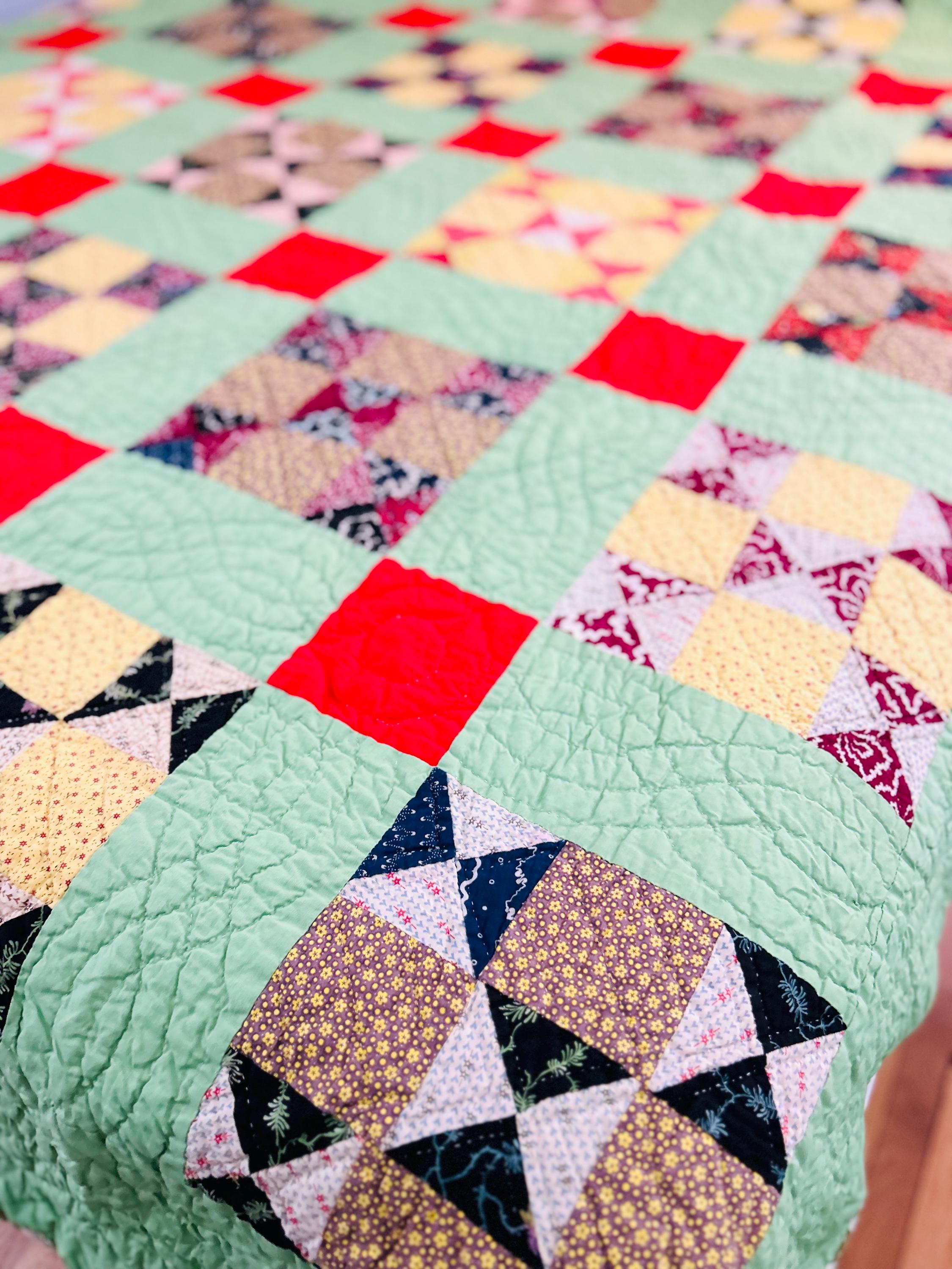 Nine-Patch and Old Tippecanoe Quilt from the 1940s to 1950s. This quilt has been expertly hand-quilted in a braided rope pattern in the sashing and along the four-sided border.