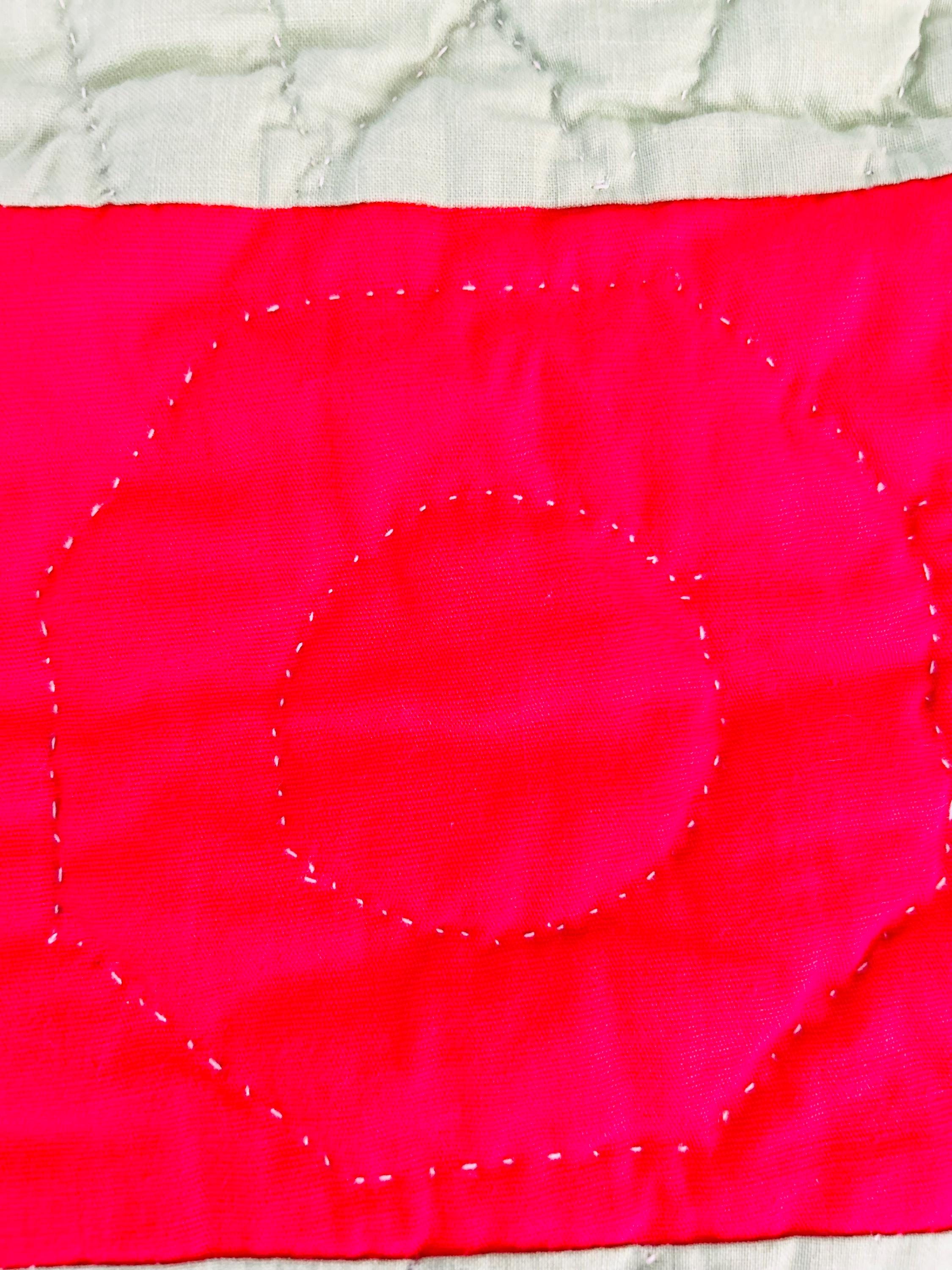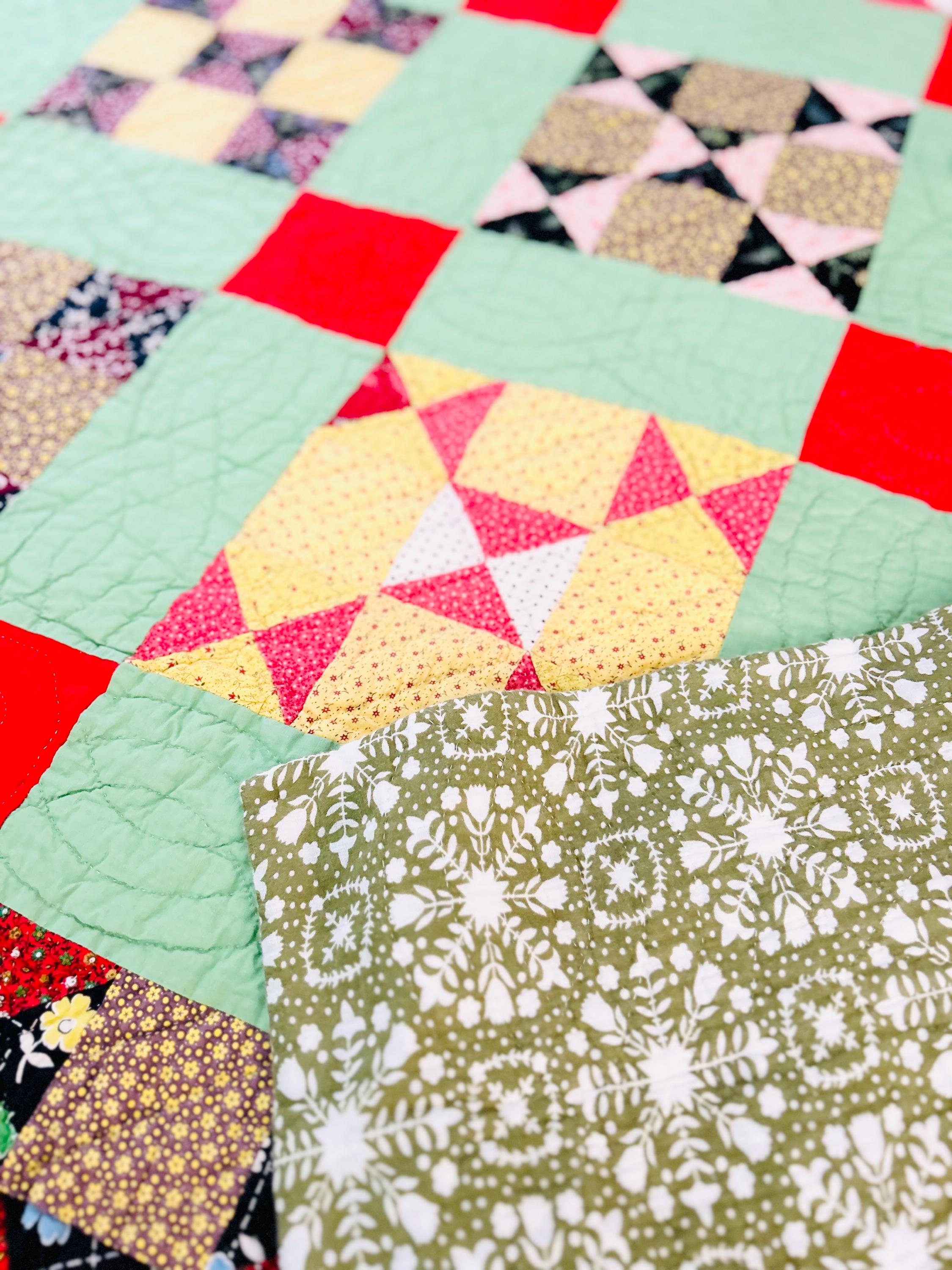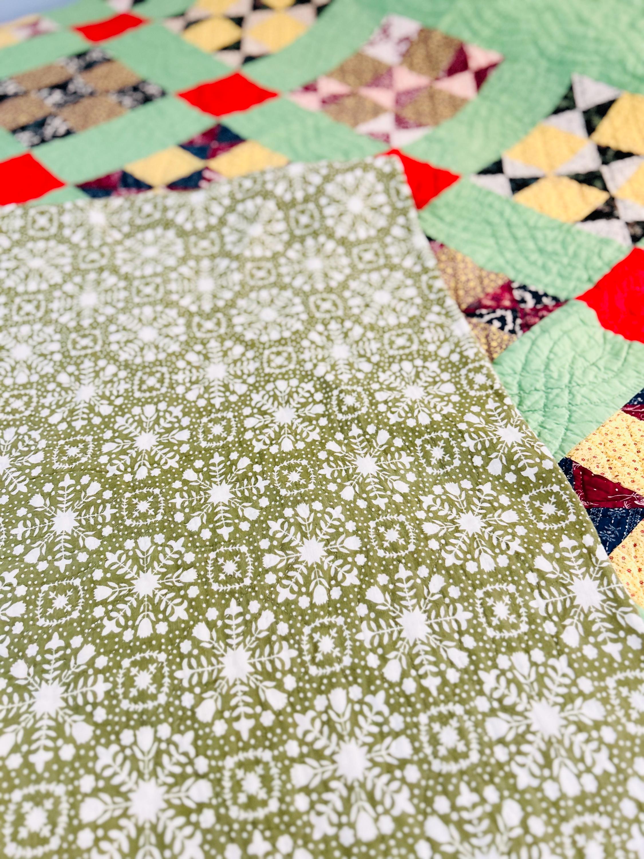 The back is a green snowflake cotton that has been turned to the front and hand-stitched to form the binding. The batting is lightweight.