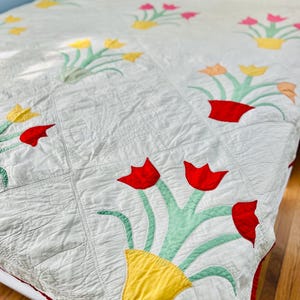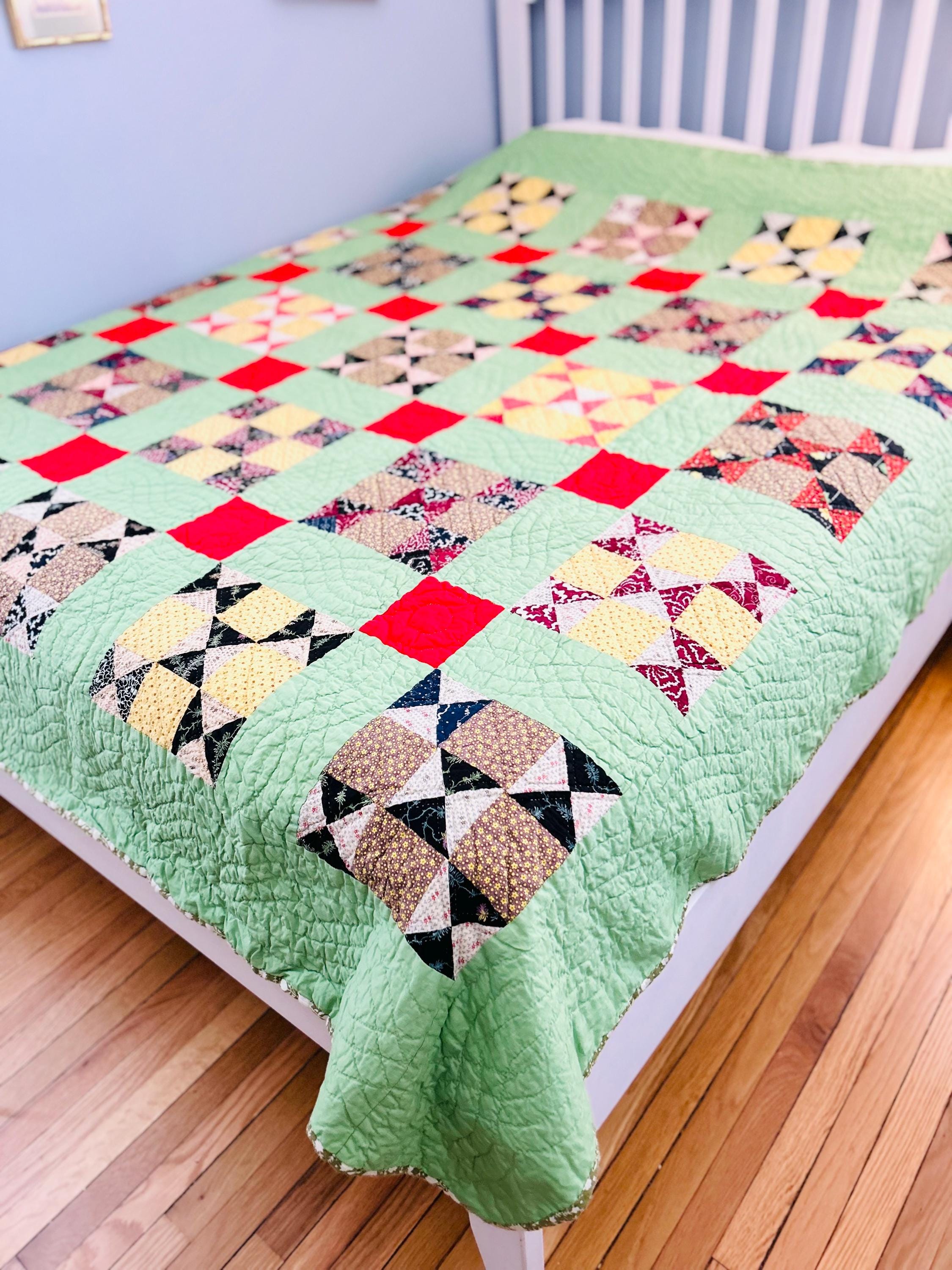 The quilt has been soaked, hand-washed and line-dried. It measures 78 inches by 82 inches and comes from a smoke-free and pet-free home. Shown on a queen-size bed.