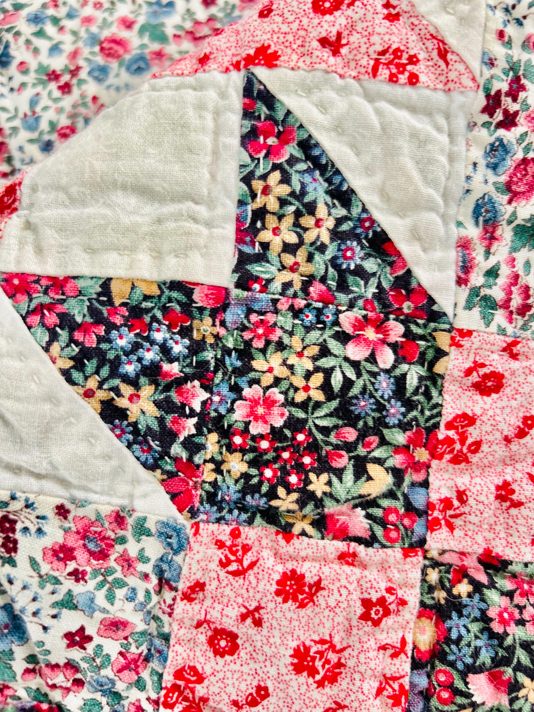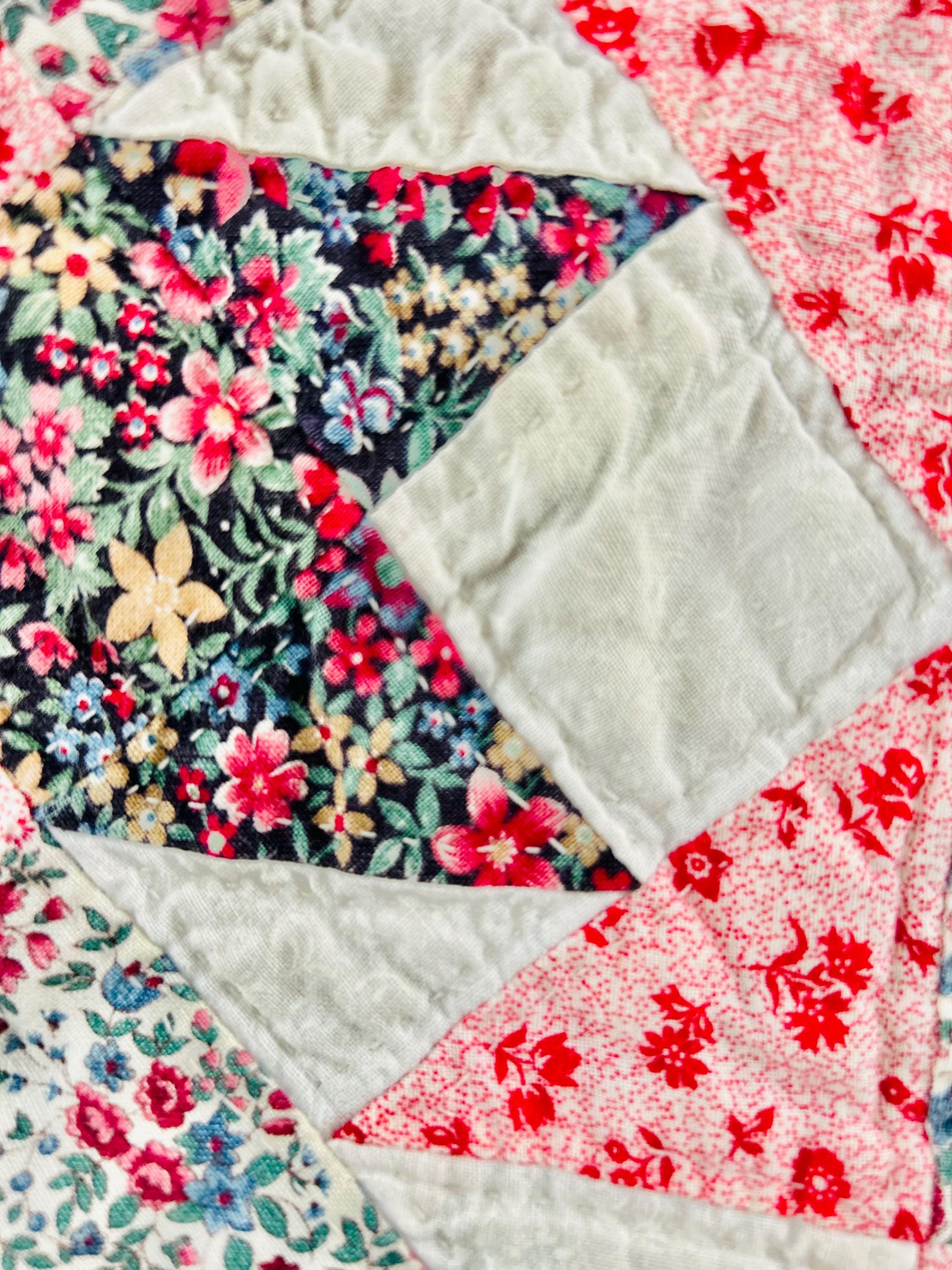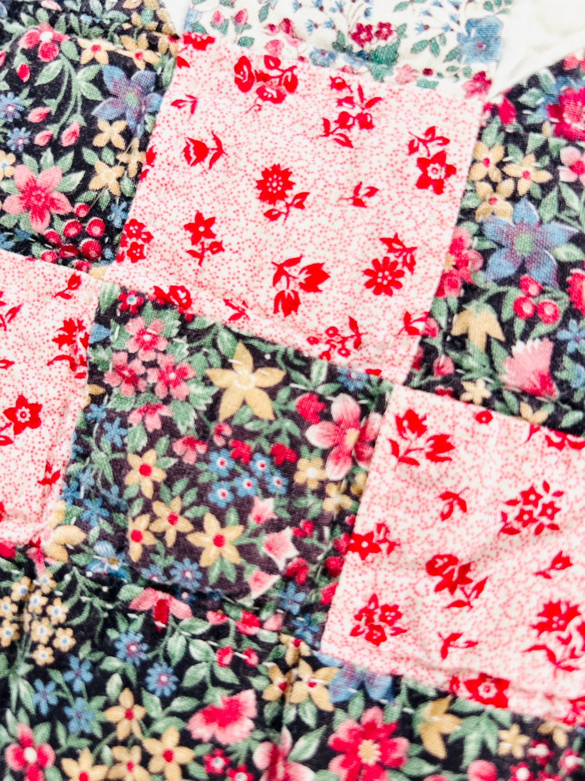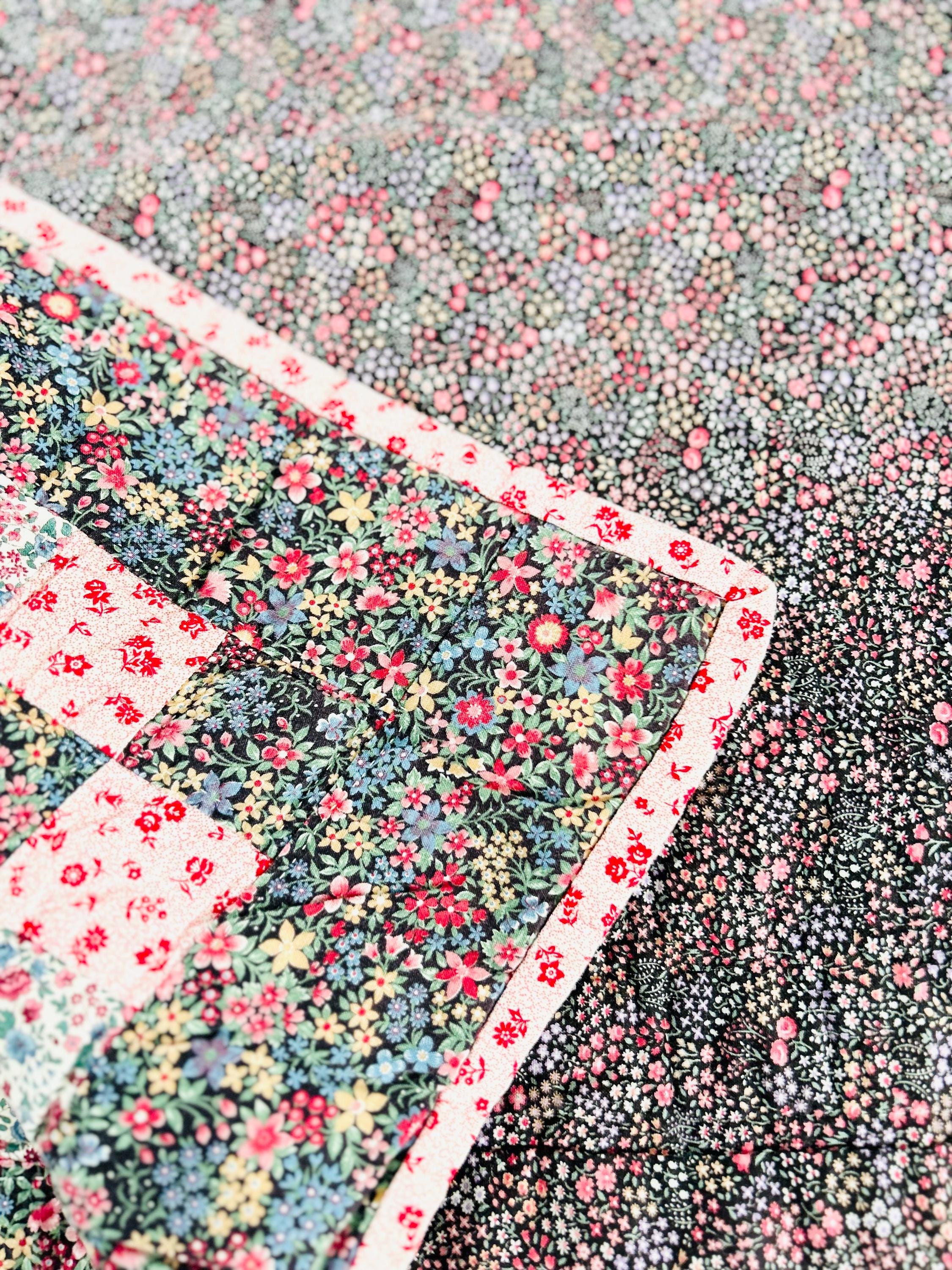 The back is a dark floral pattern while the binding is pink and red floral cotton that has been machine stitched to both sides. The batting is lightweight.