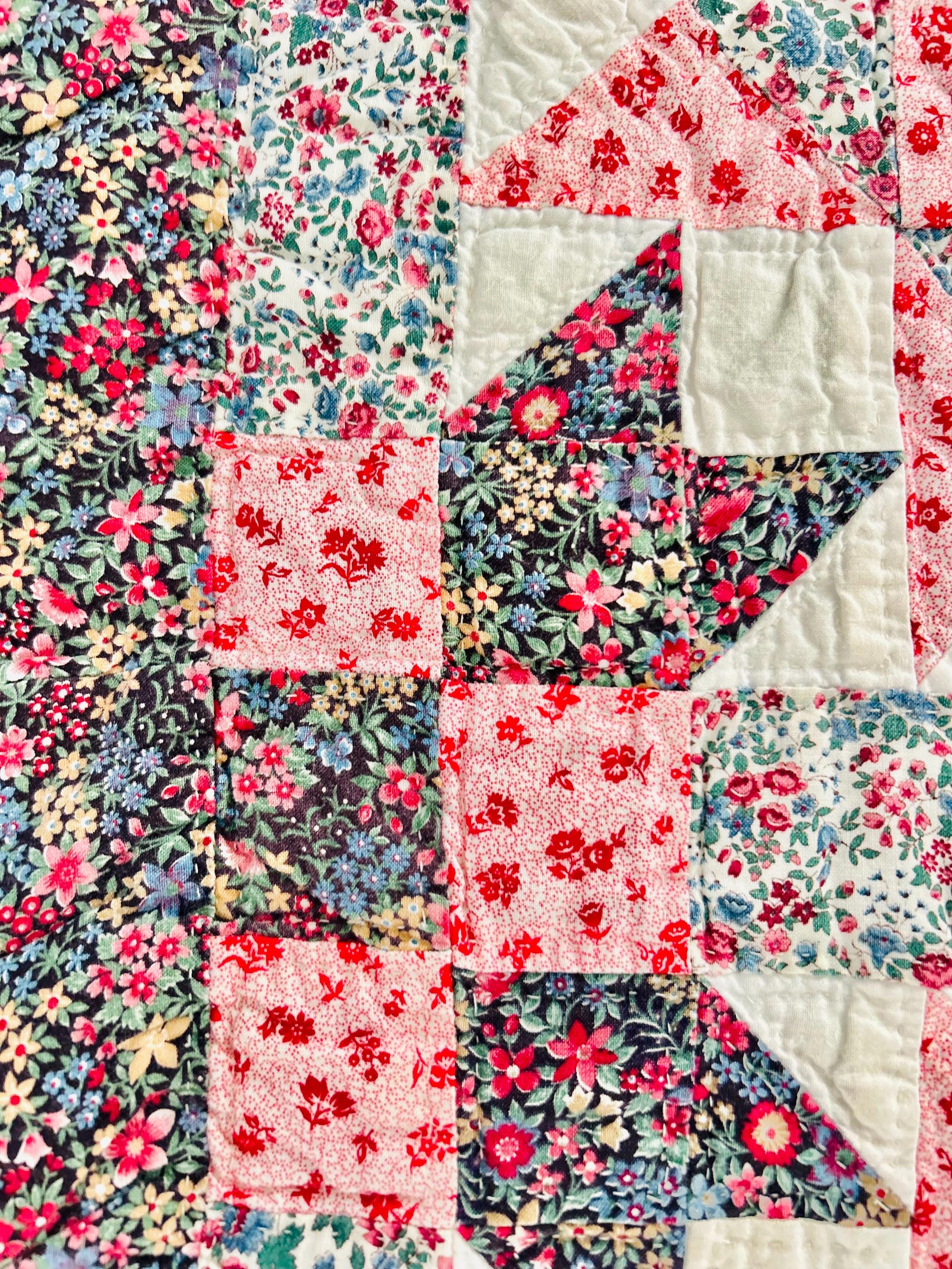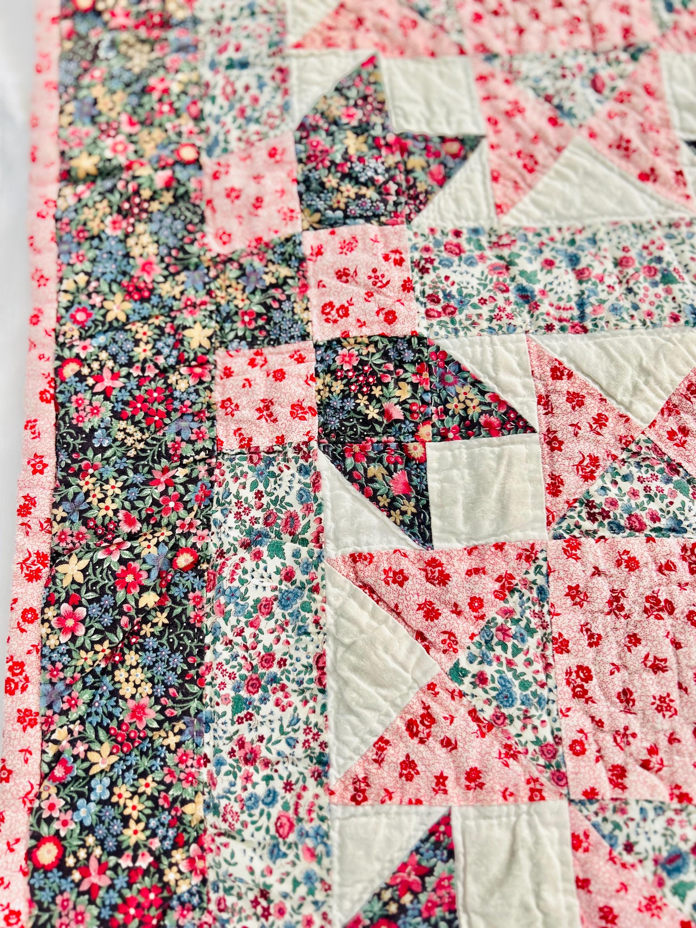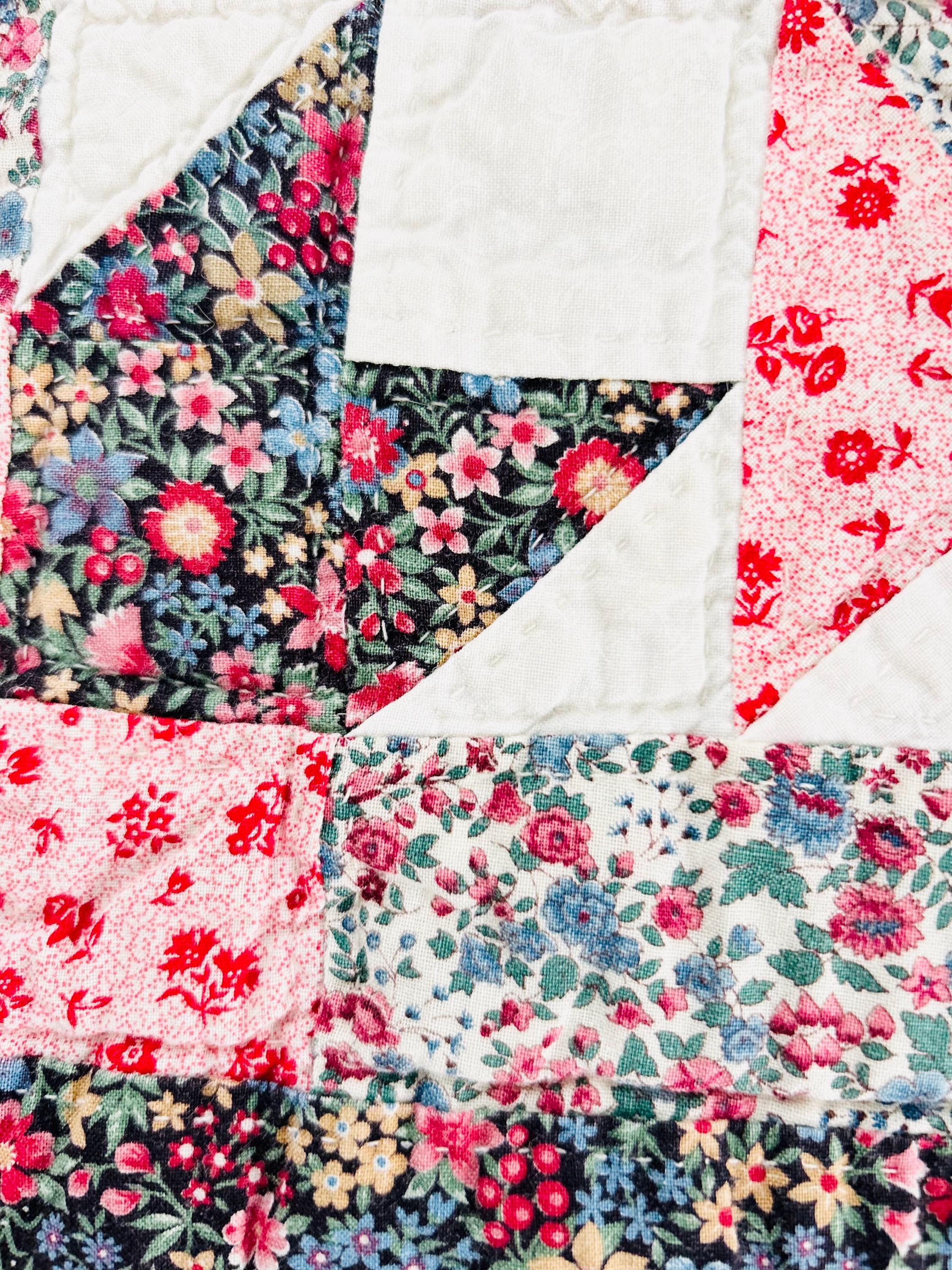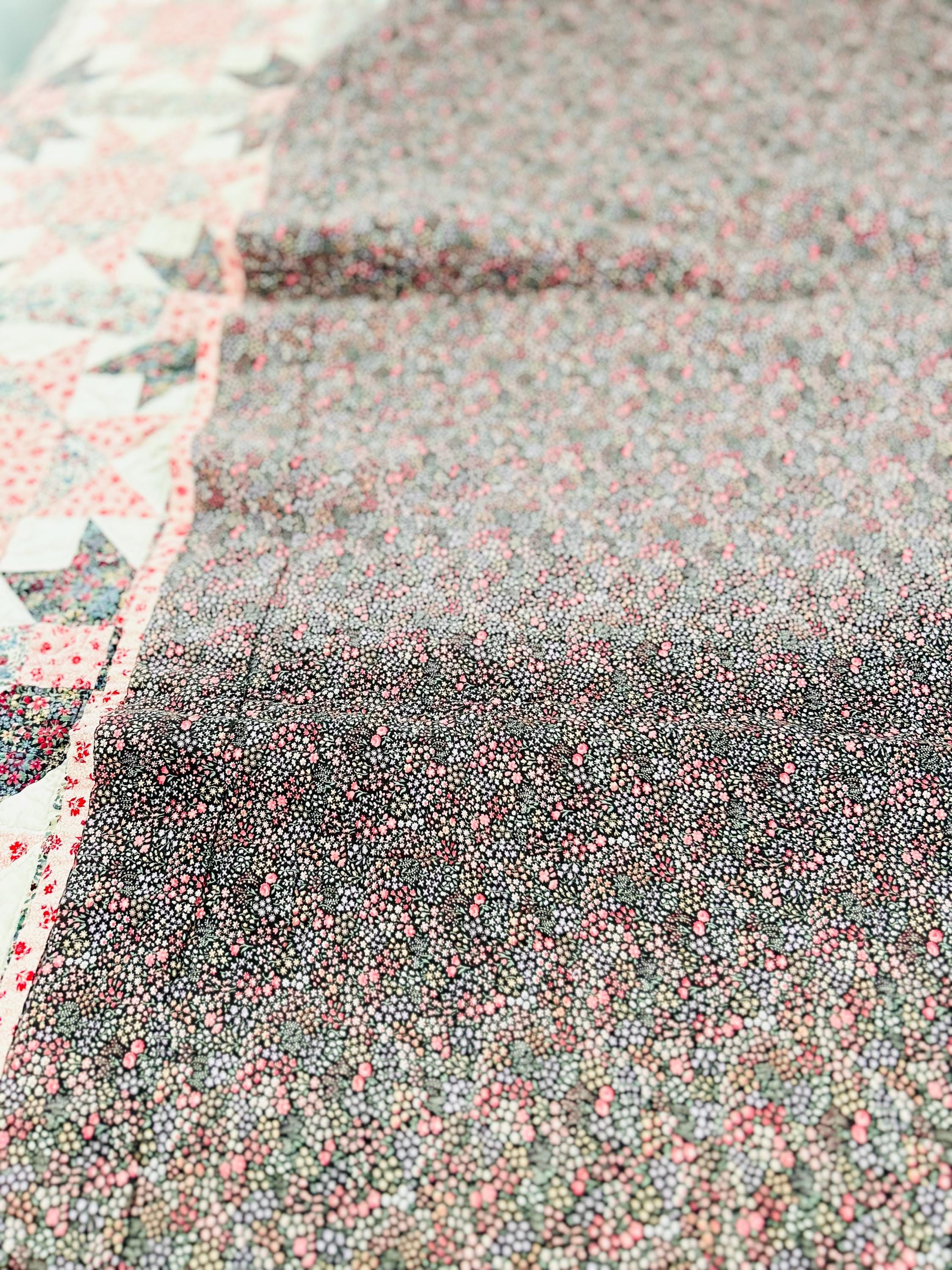 The back is a dark floral pattern while the binding is pink and red floral cotton that has been machine stitched to both sides. The batting is lightweight.