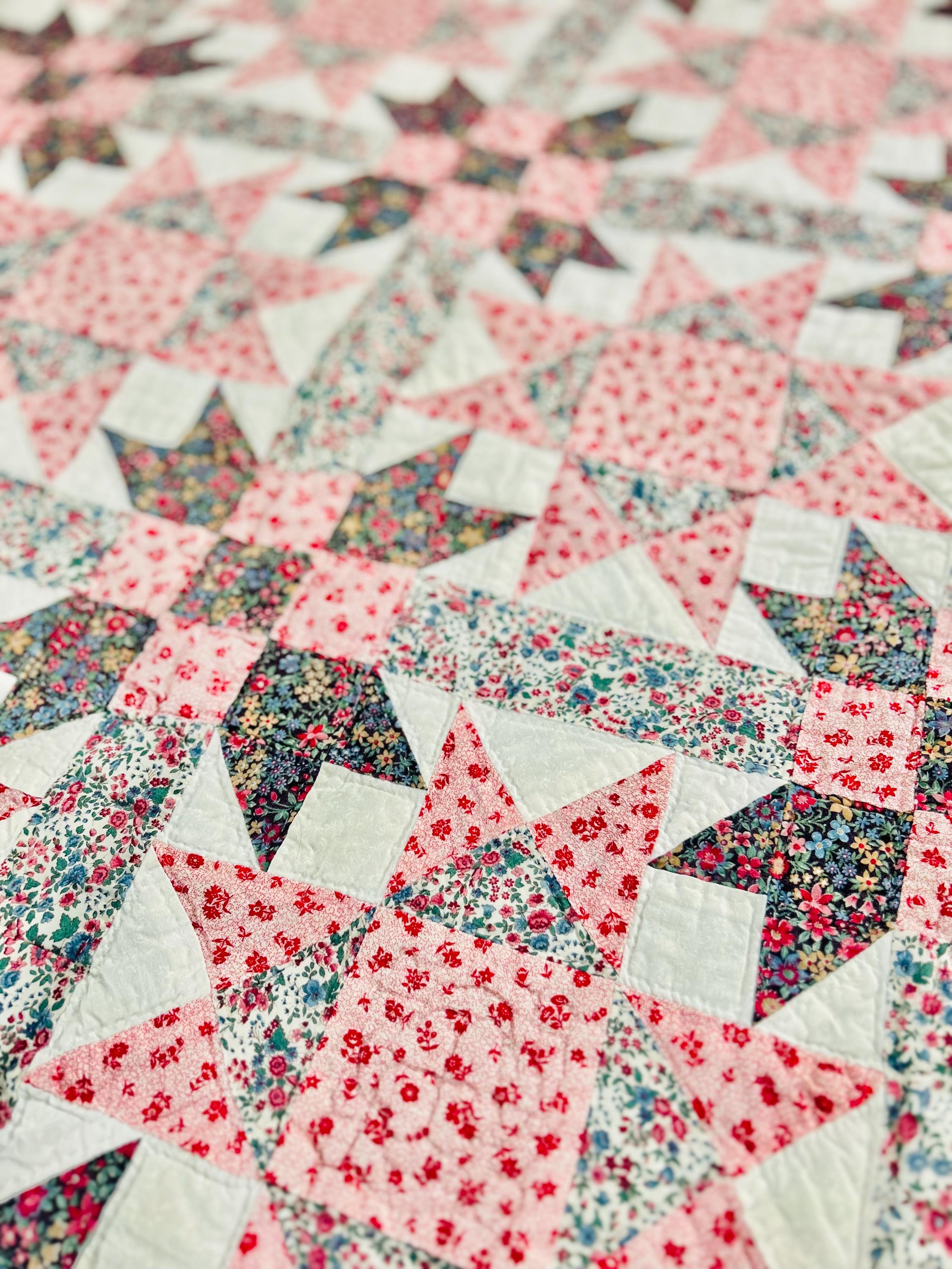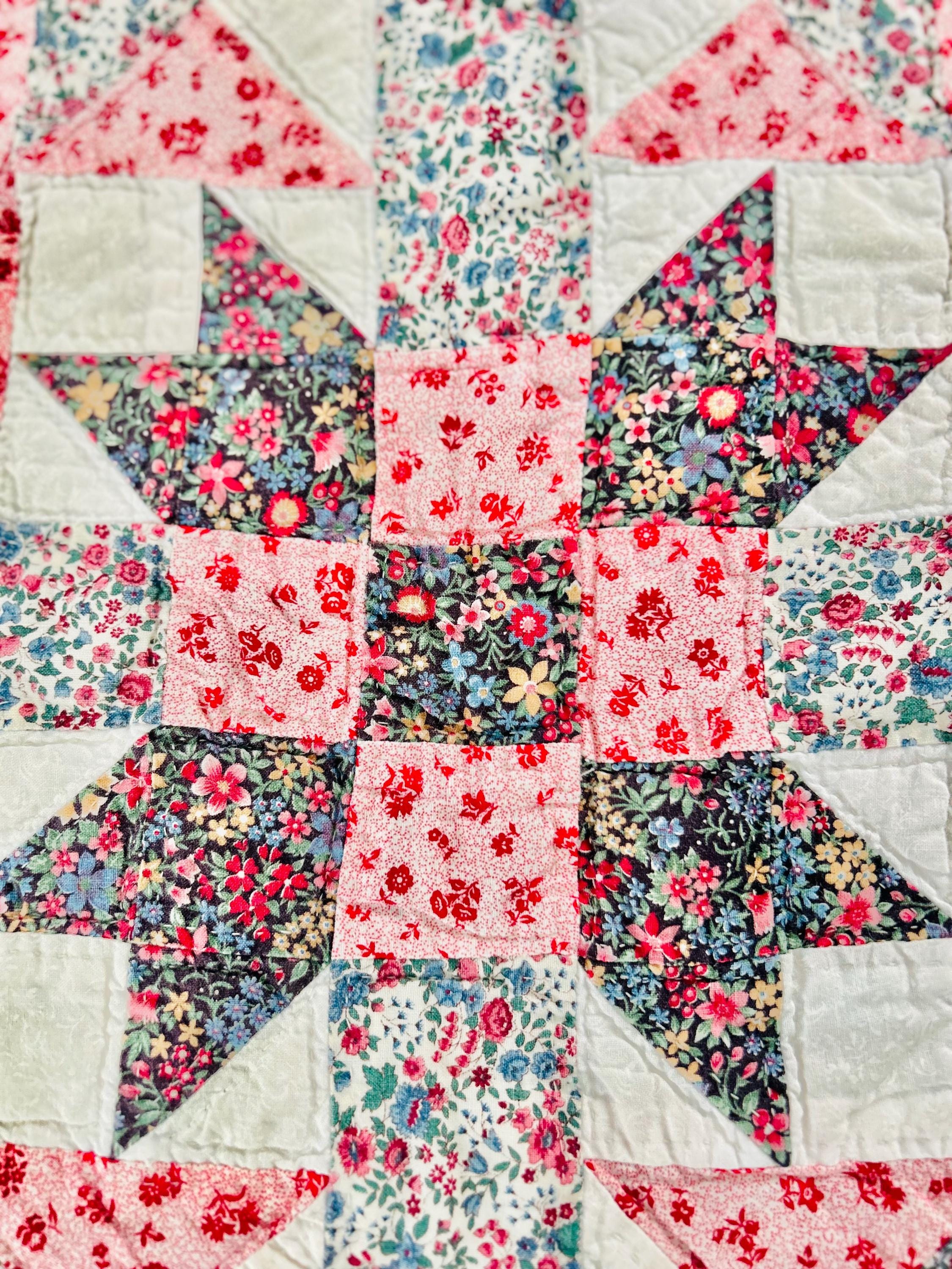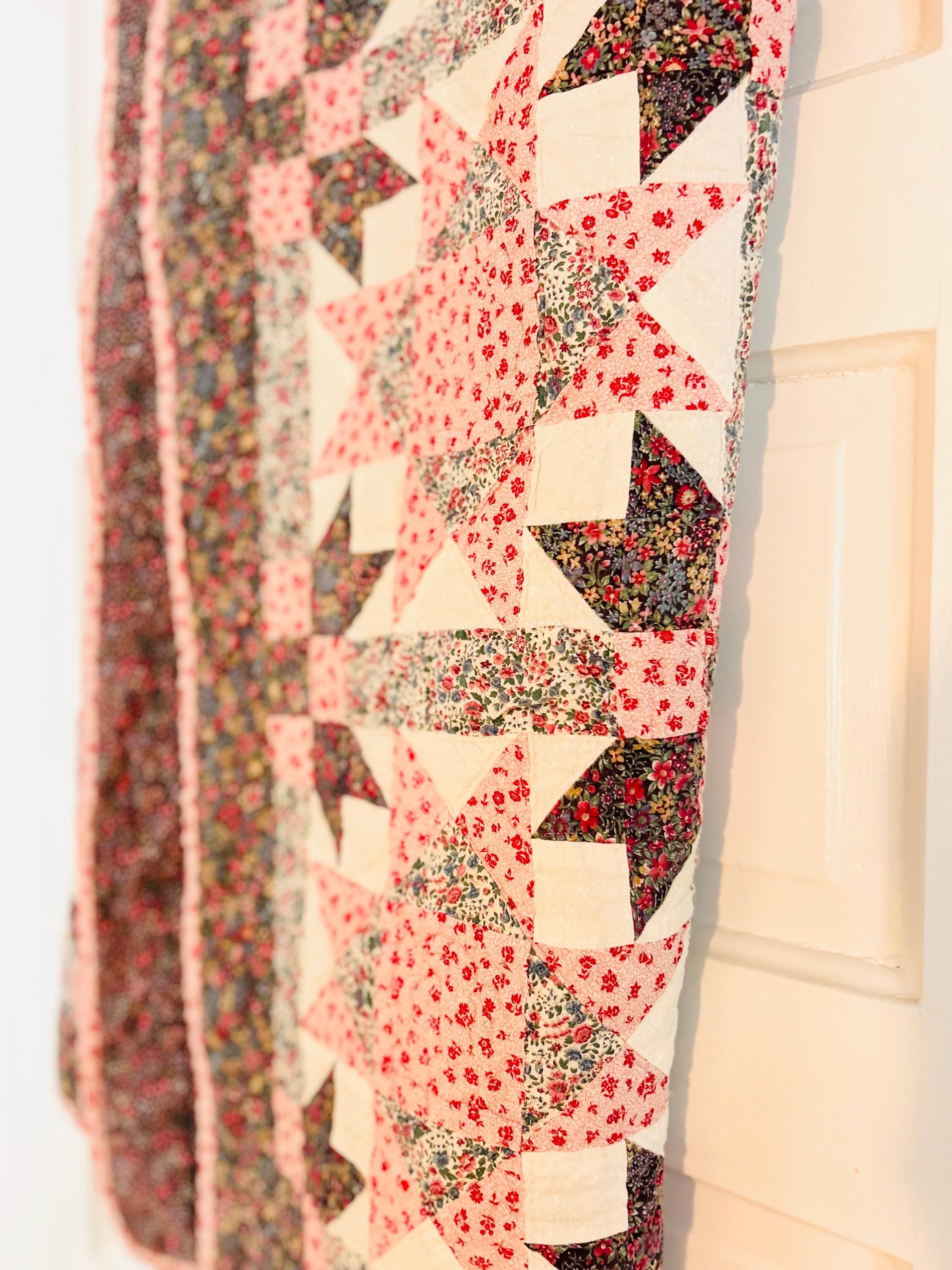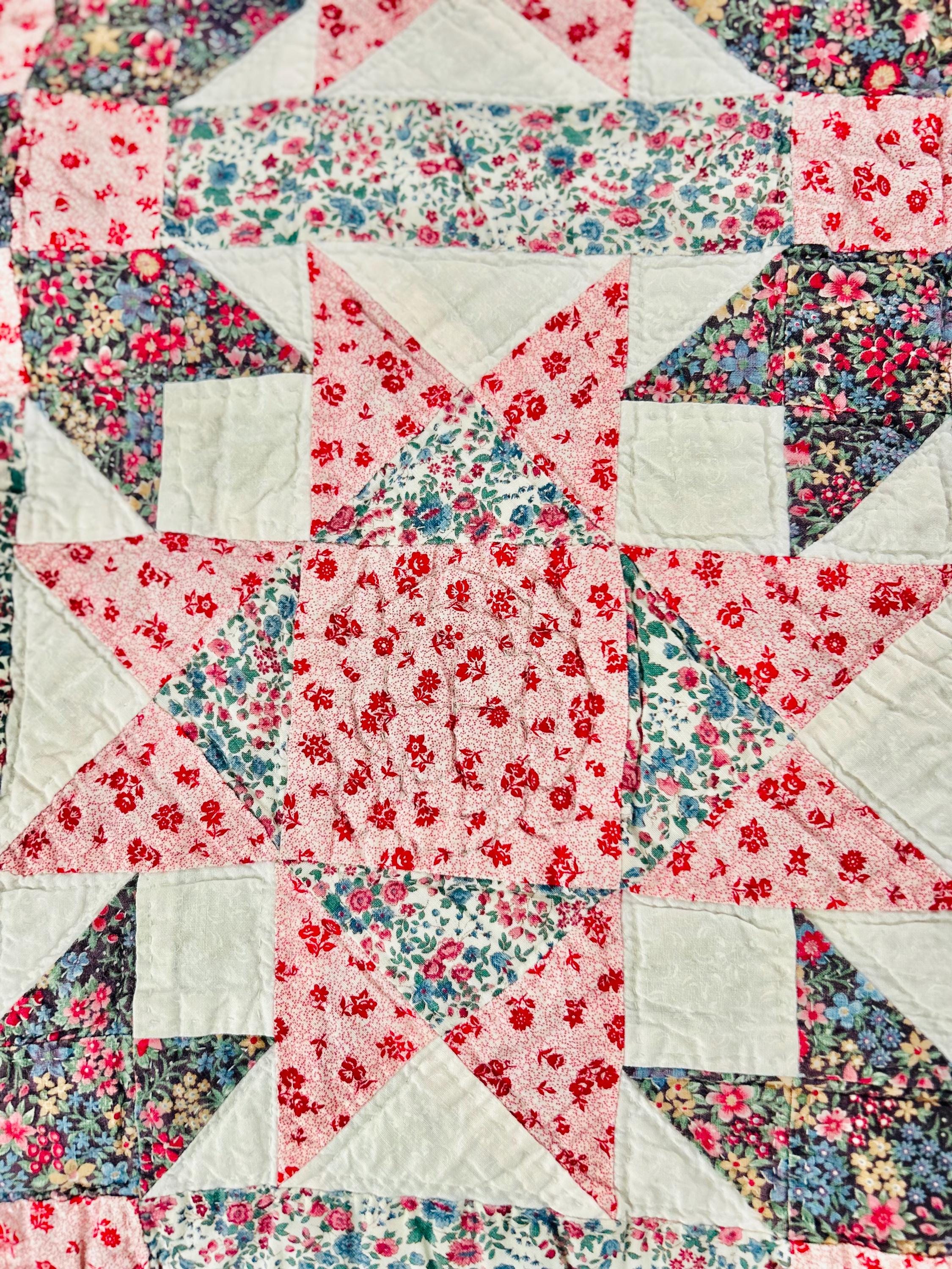 The back is a dark floral pattern while the binding is pink and red floral cotton that has been machine stitched to both sides. The batting is lightweight.