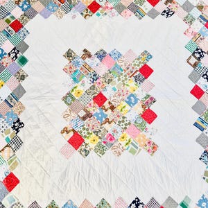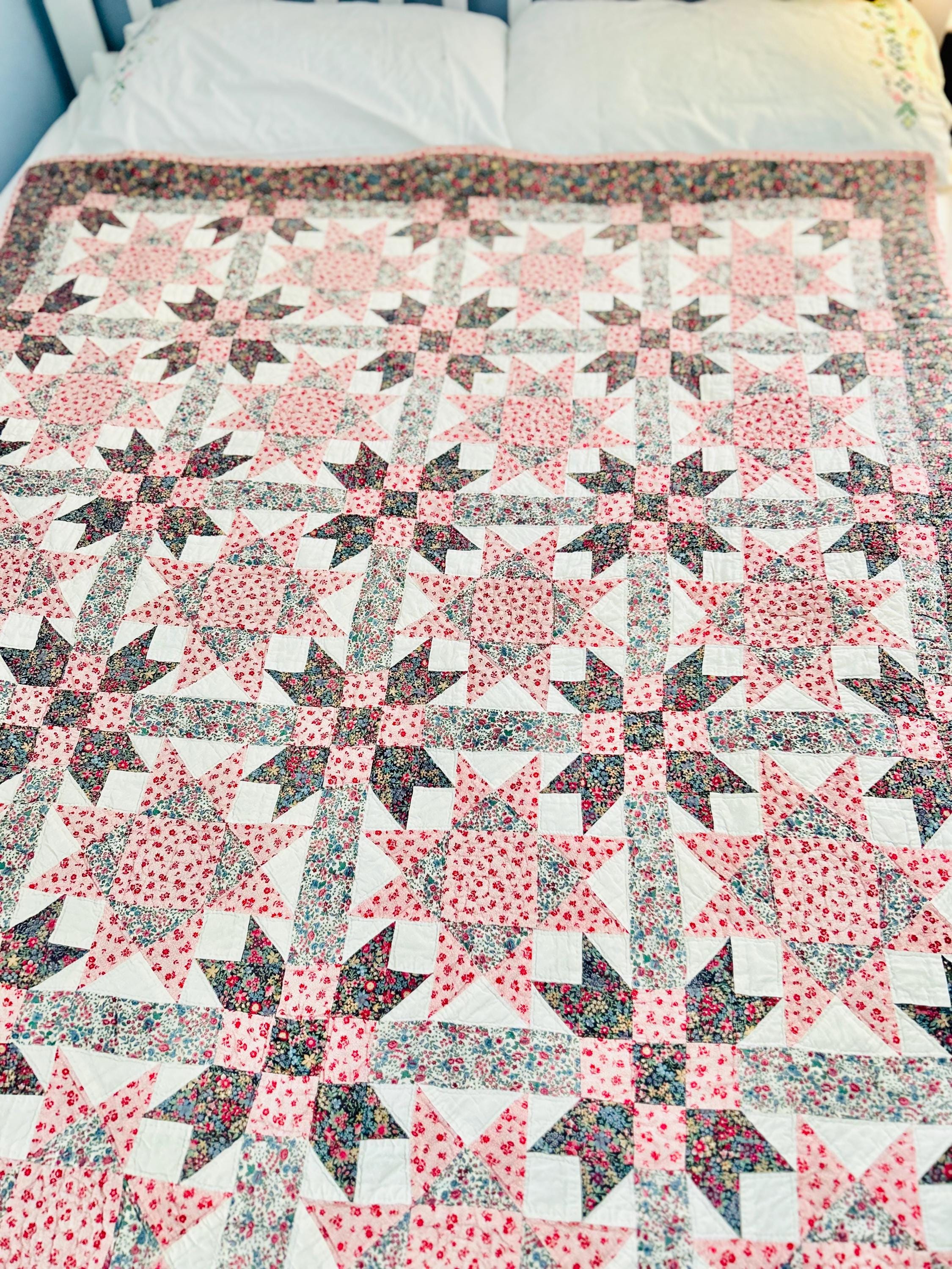 It is clean, very soft and comes from a smoke-free and pet-free home. The quilt measures 51 inches by 66 inches. Shown on a queen-size bed.