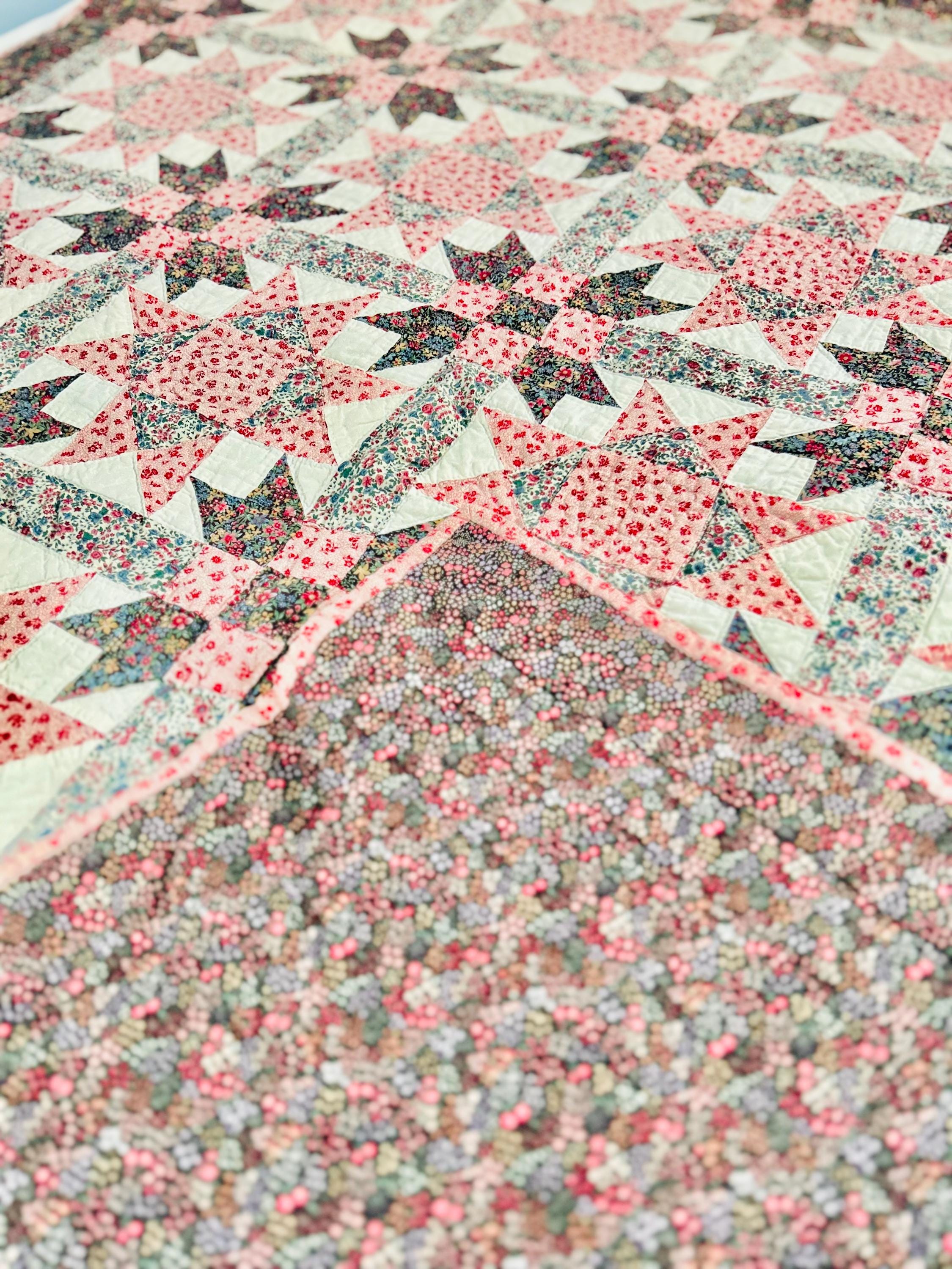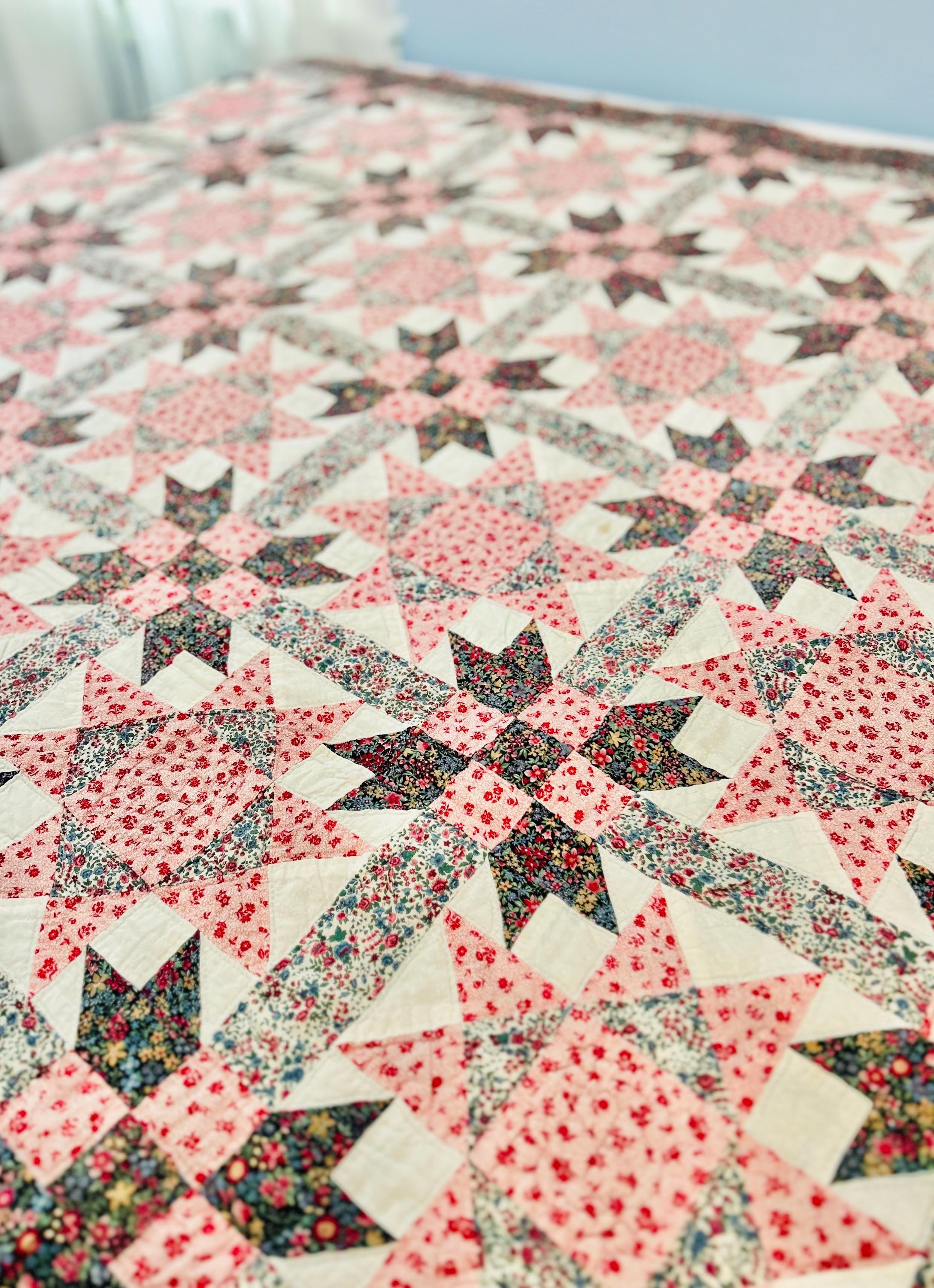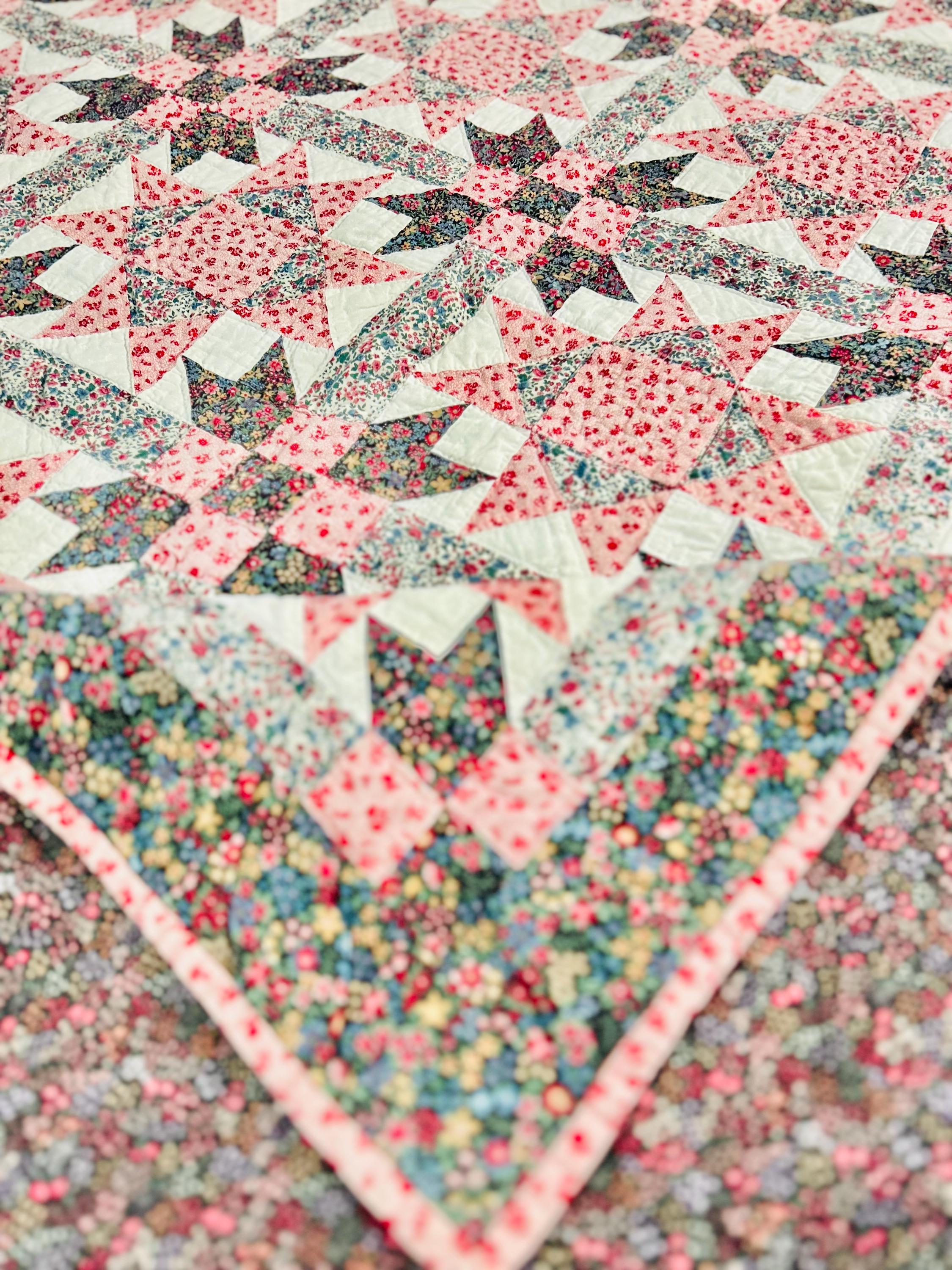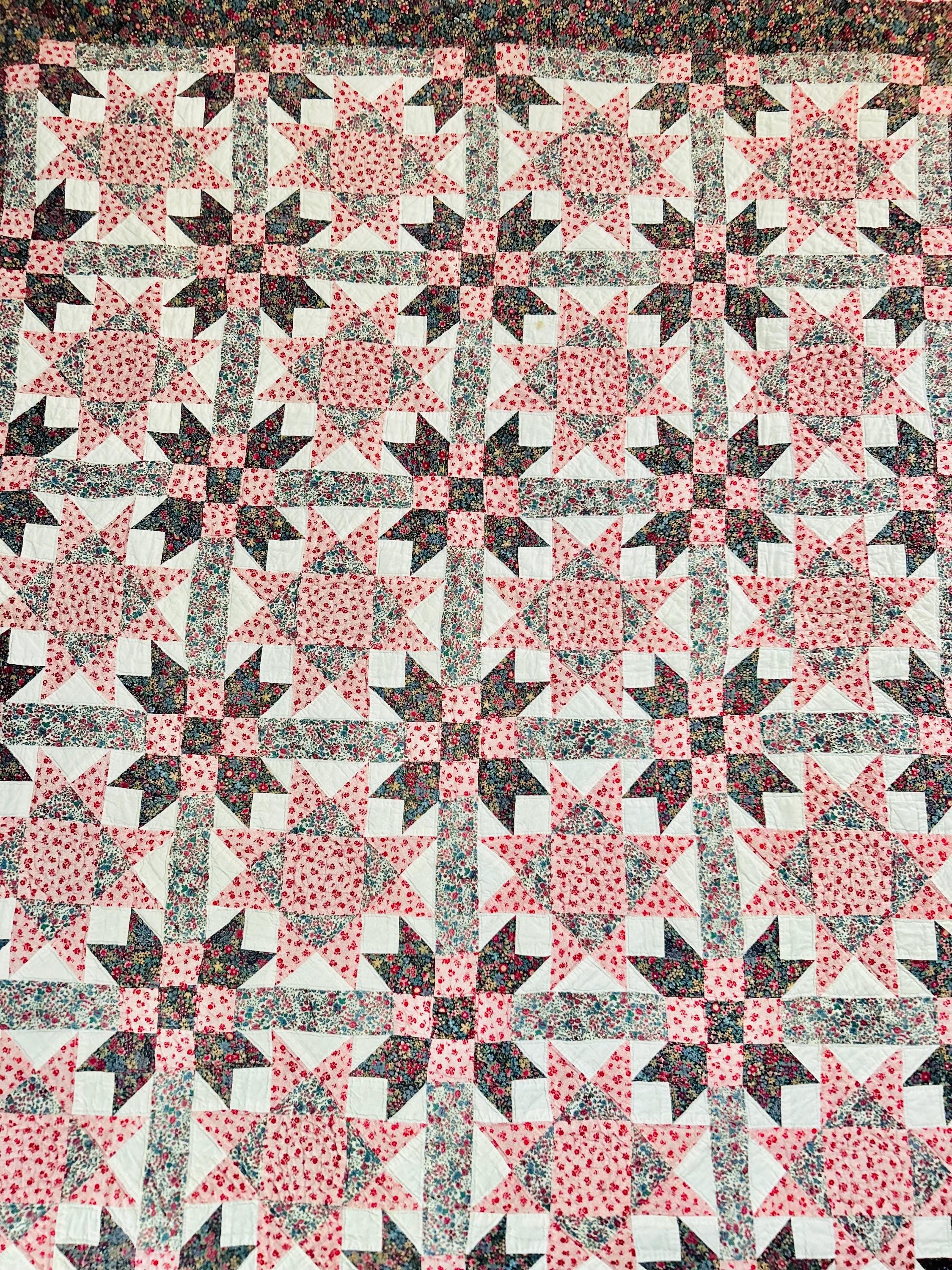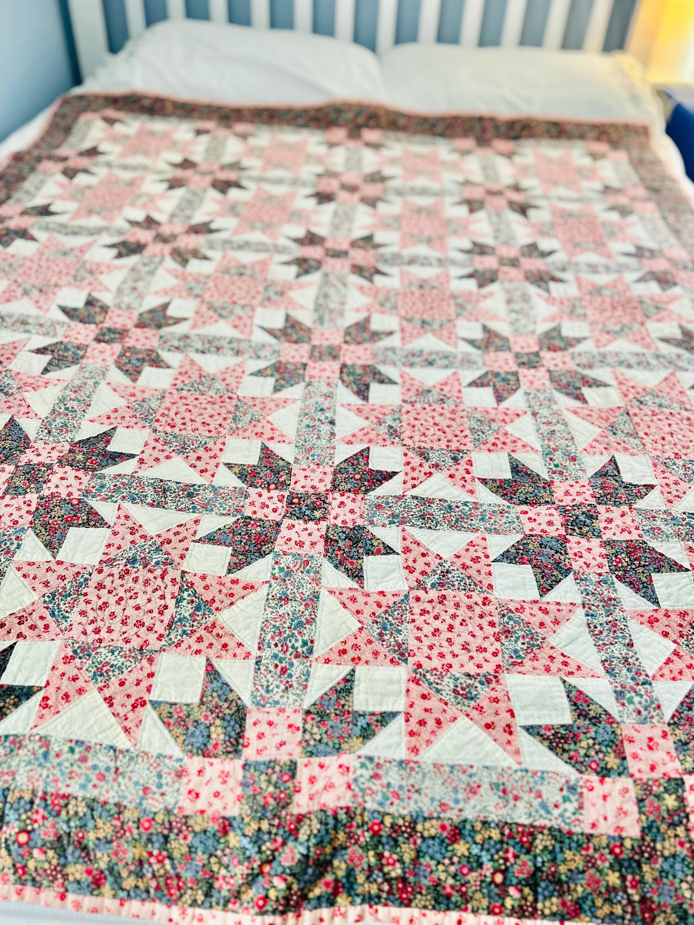 This Ohio Star Quilt, circa 1950-1960s, is entirely hand-quilted in outlines of the patchwork and in straight lines through the four-sided border.