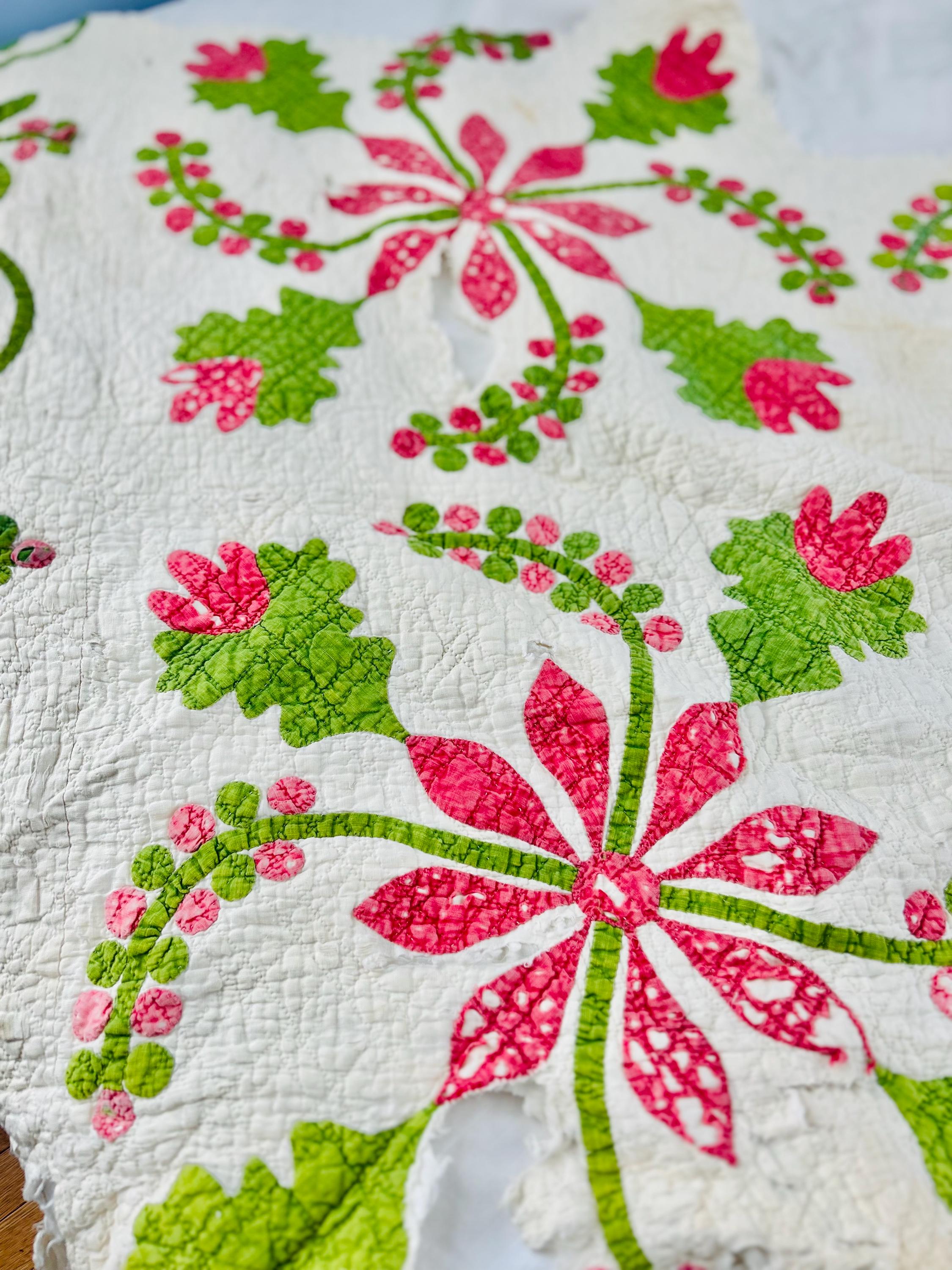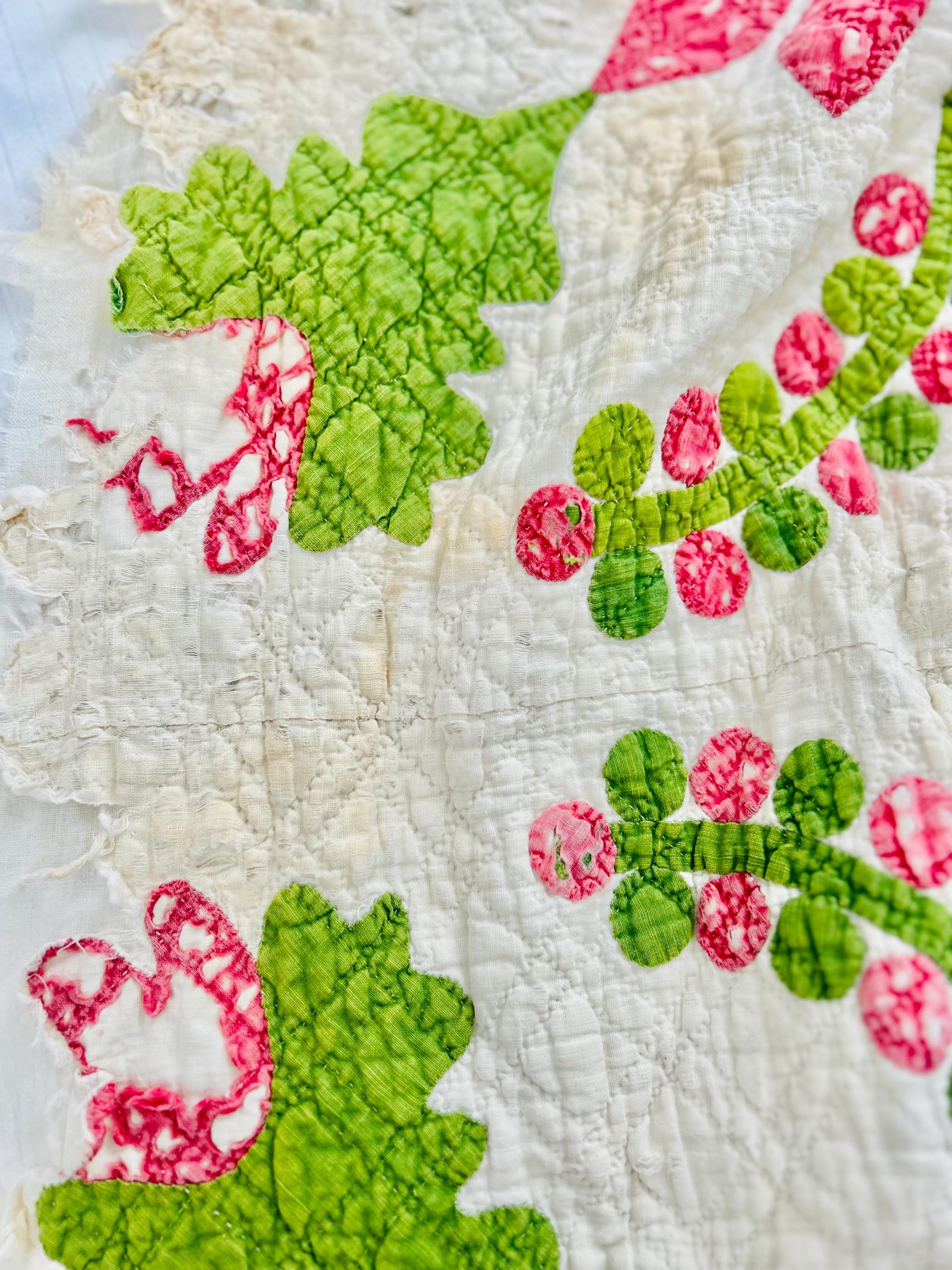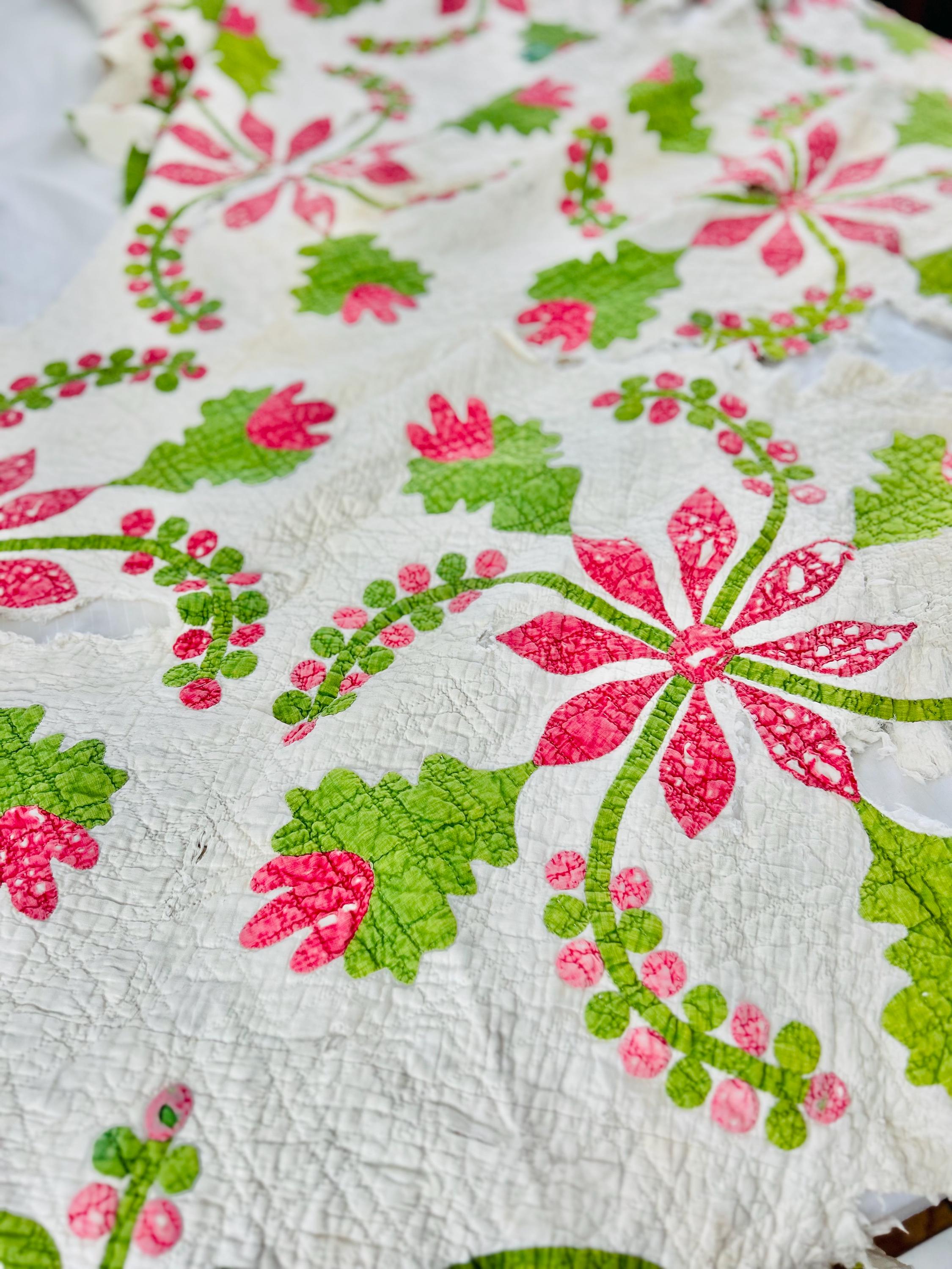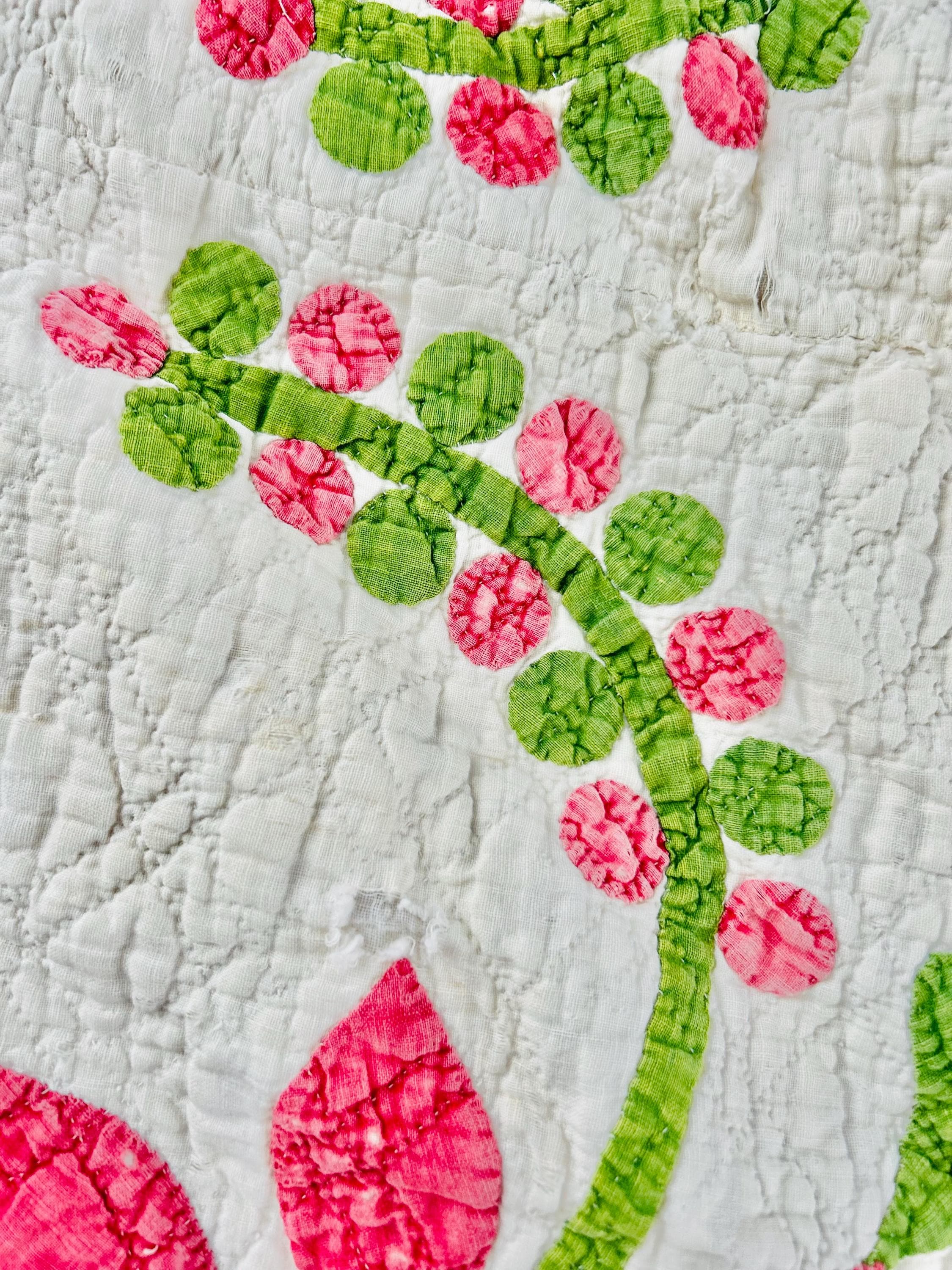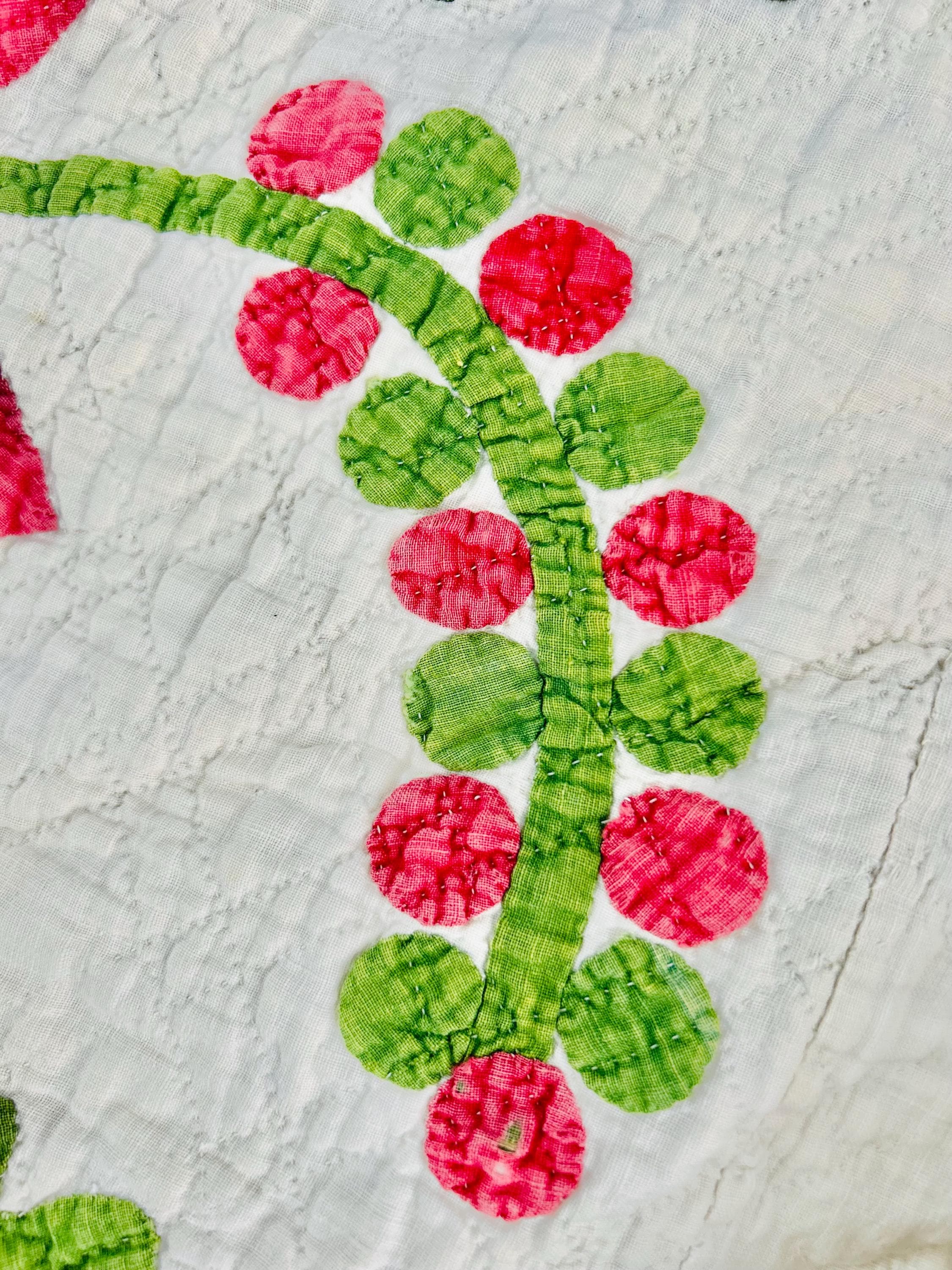 This is essentially 1/3 of a Currants & Coxcomb Quilt from the 1880s. It was found exactly like it is being sold - as an irregularly shaped piece that is about 47 inches by 74 inches that has been cut from a larger quilt, most likely for crafting. The hand-quilting is exquisite and in double diagonals and diamonds.