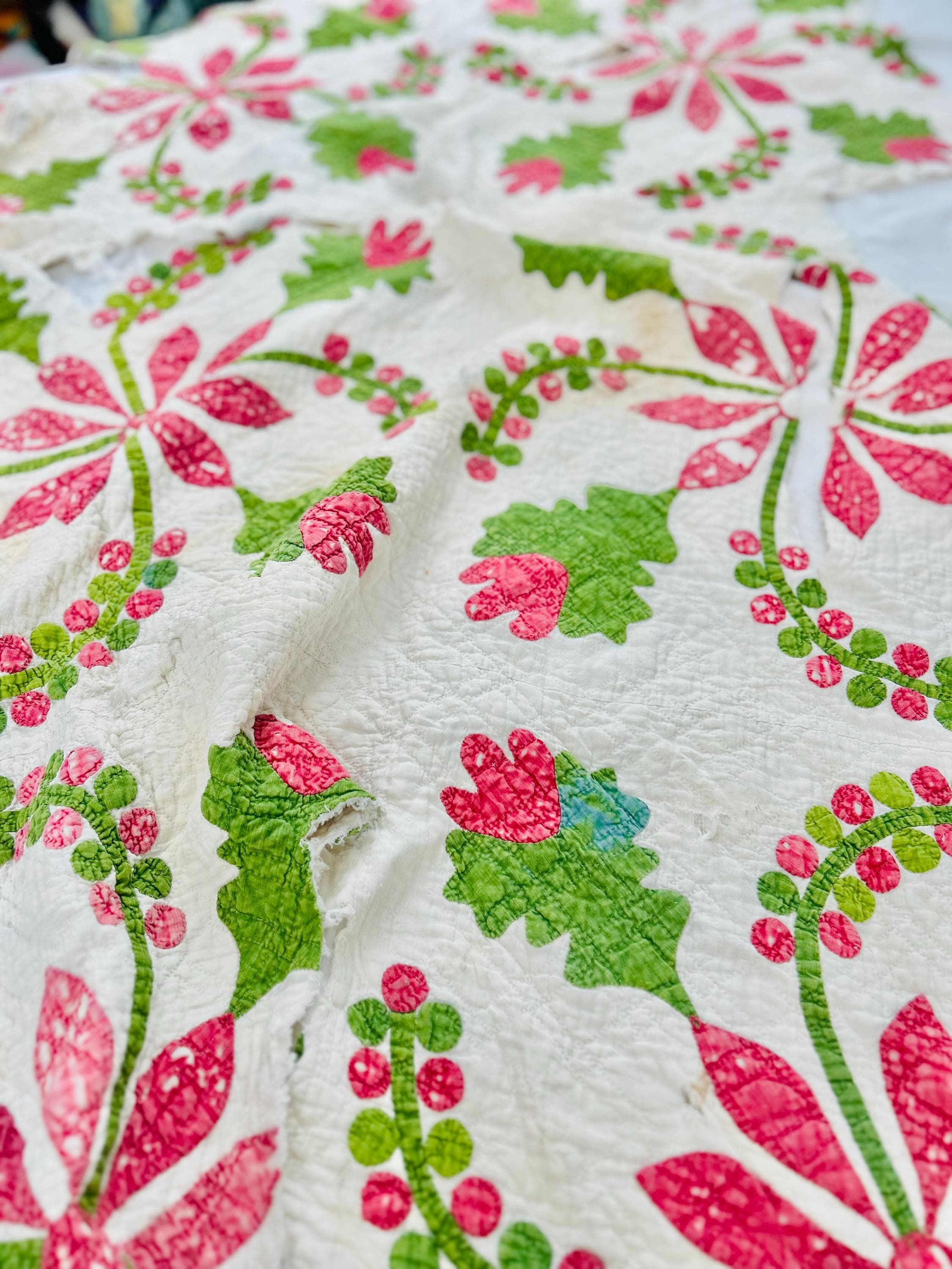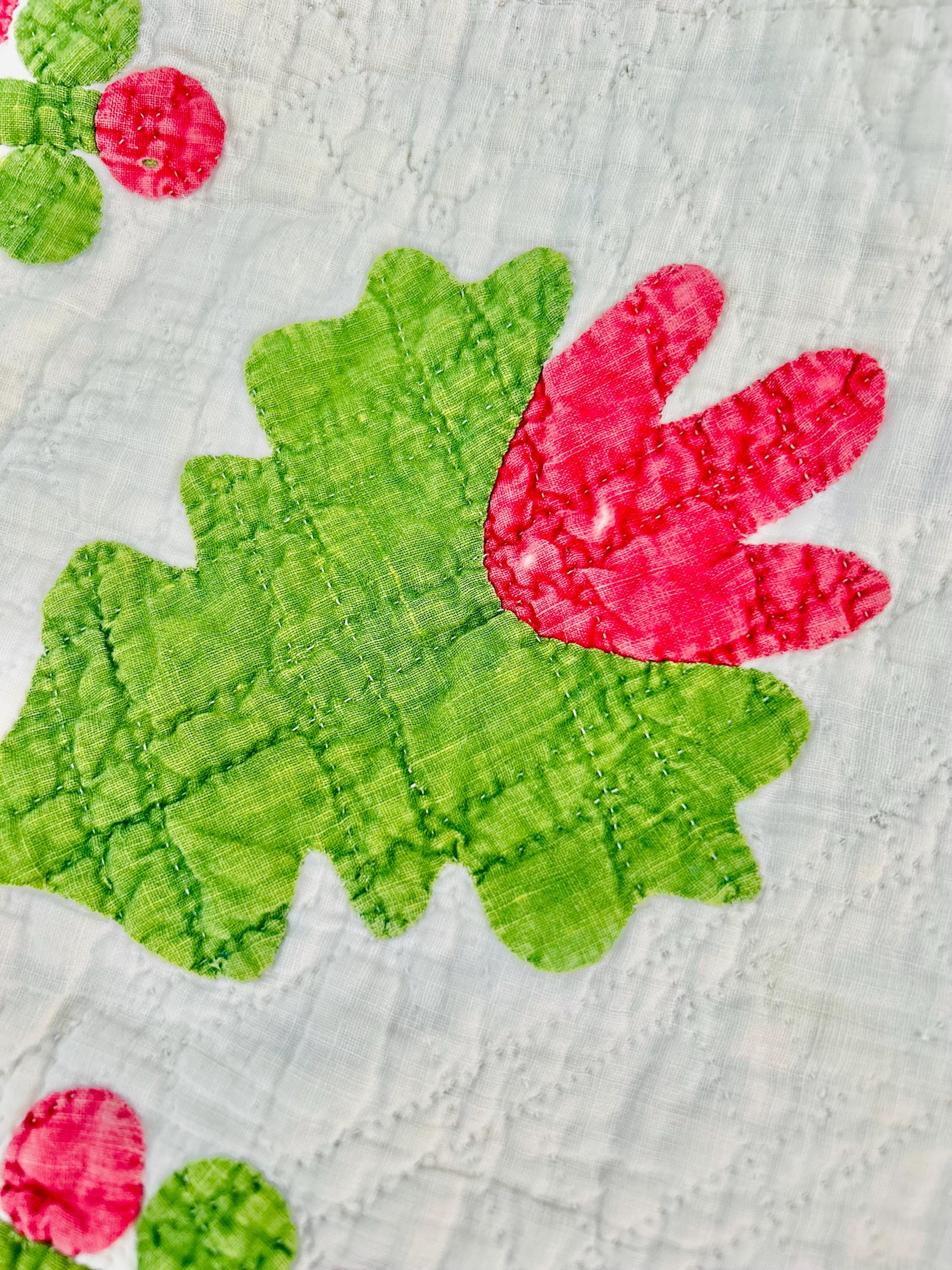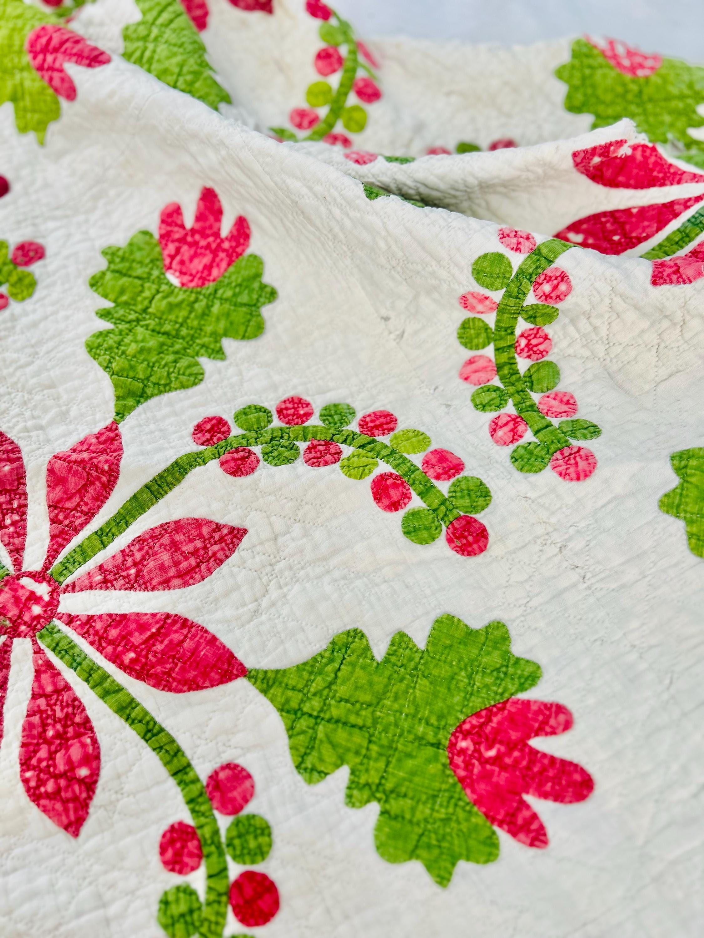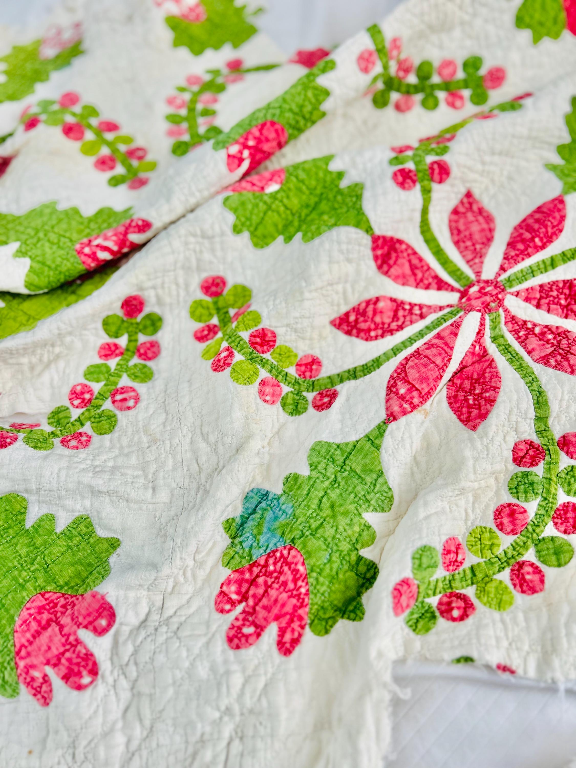 This is essentially 1/3 of a Currants & Coxcomb Quilt from the 1880s. It was found exactly like it is being sold - as an irregularly shaped piece that is about 47 inches by 74 inches that has been cut from a larger quilt, most likely for crafting. The hand-quilting is exquisite and in double diagonals and diamonds.