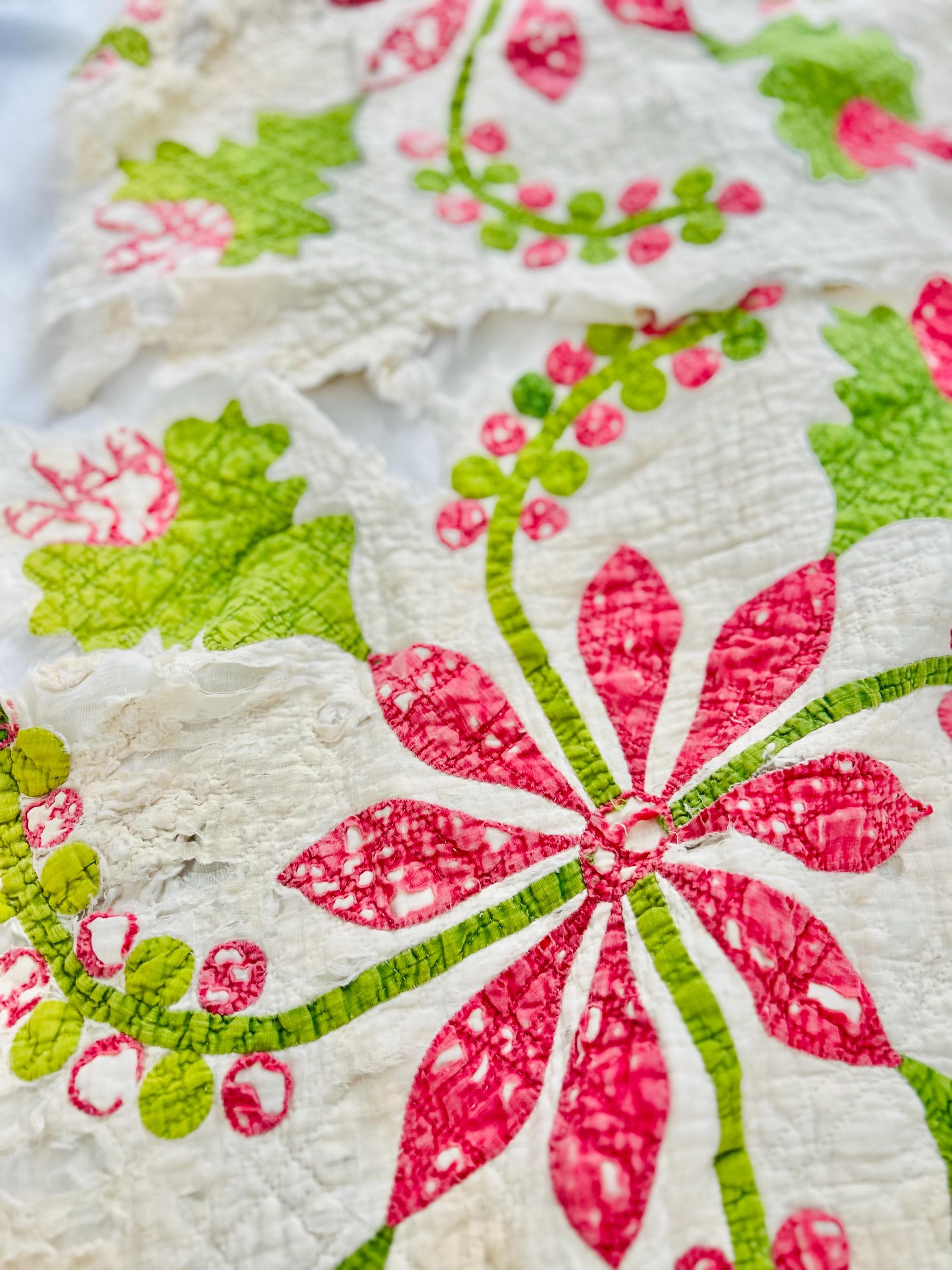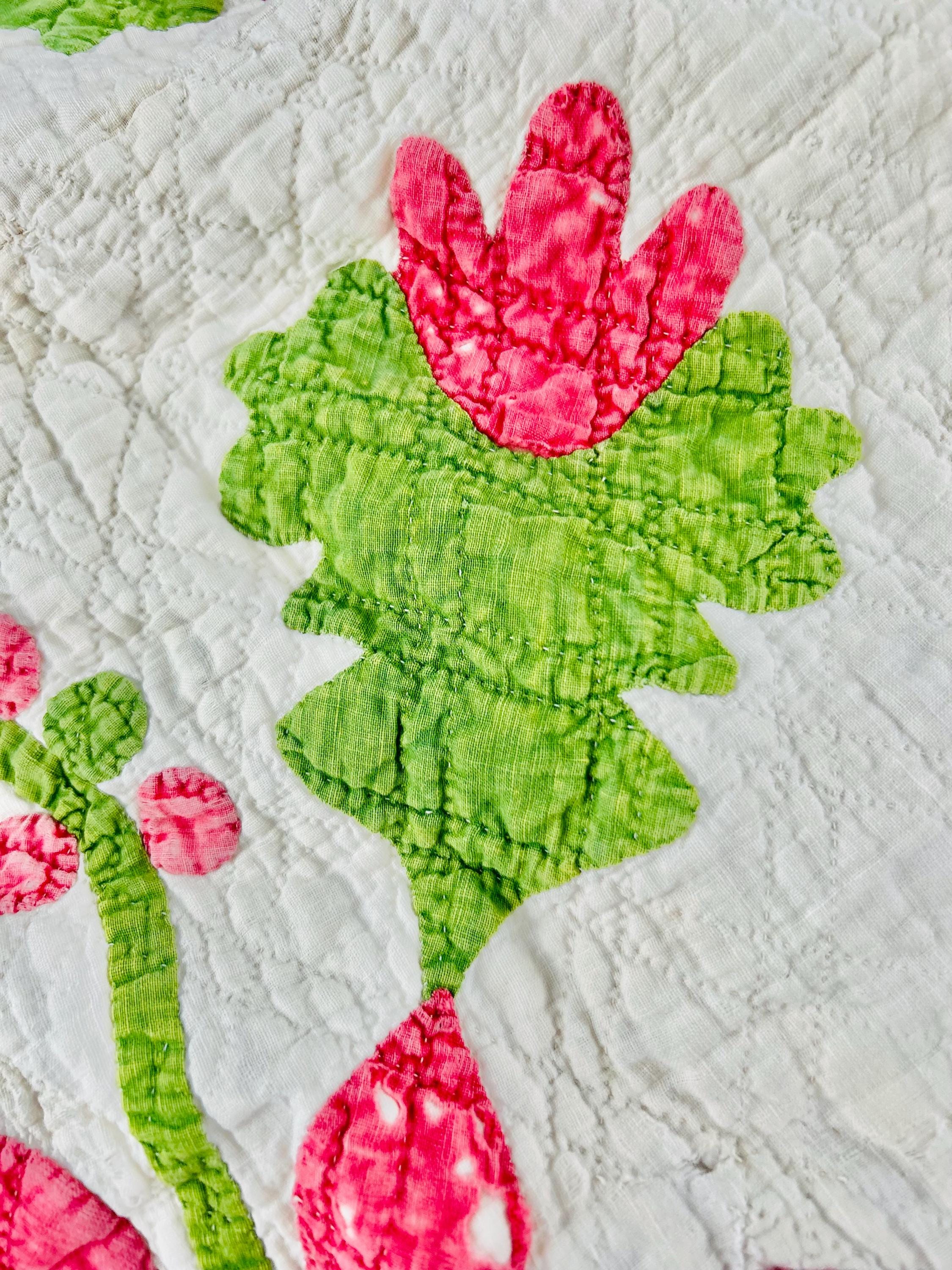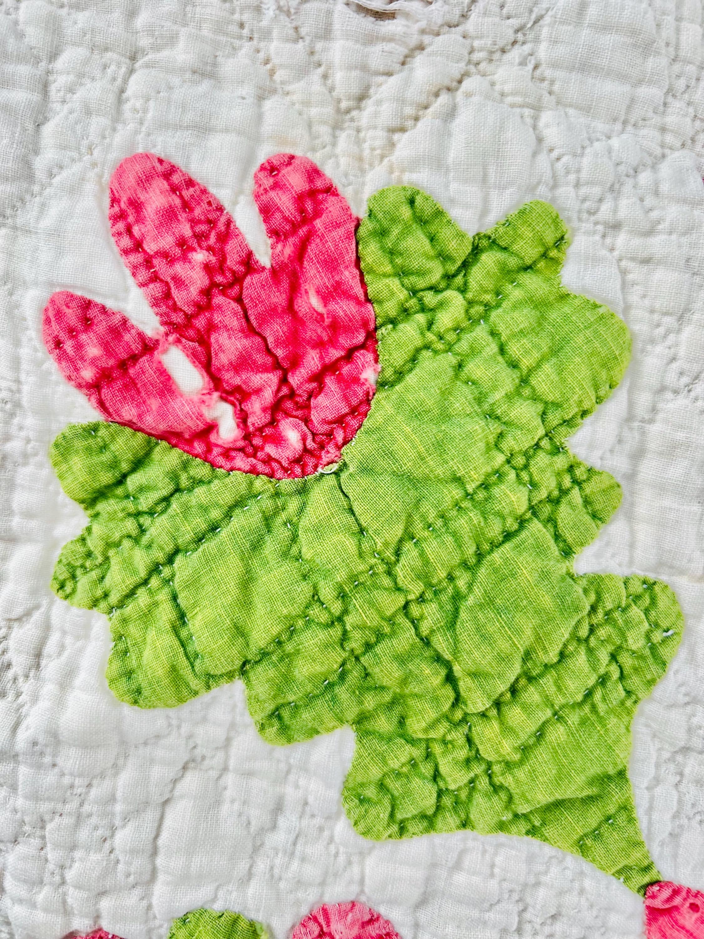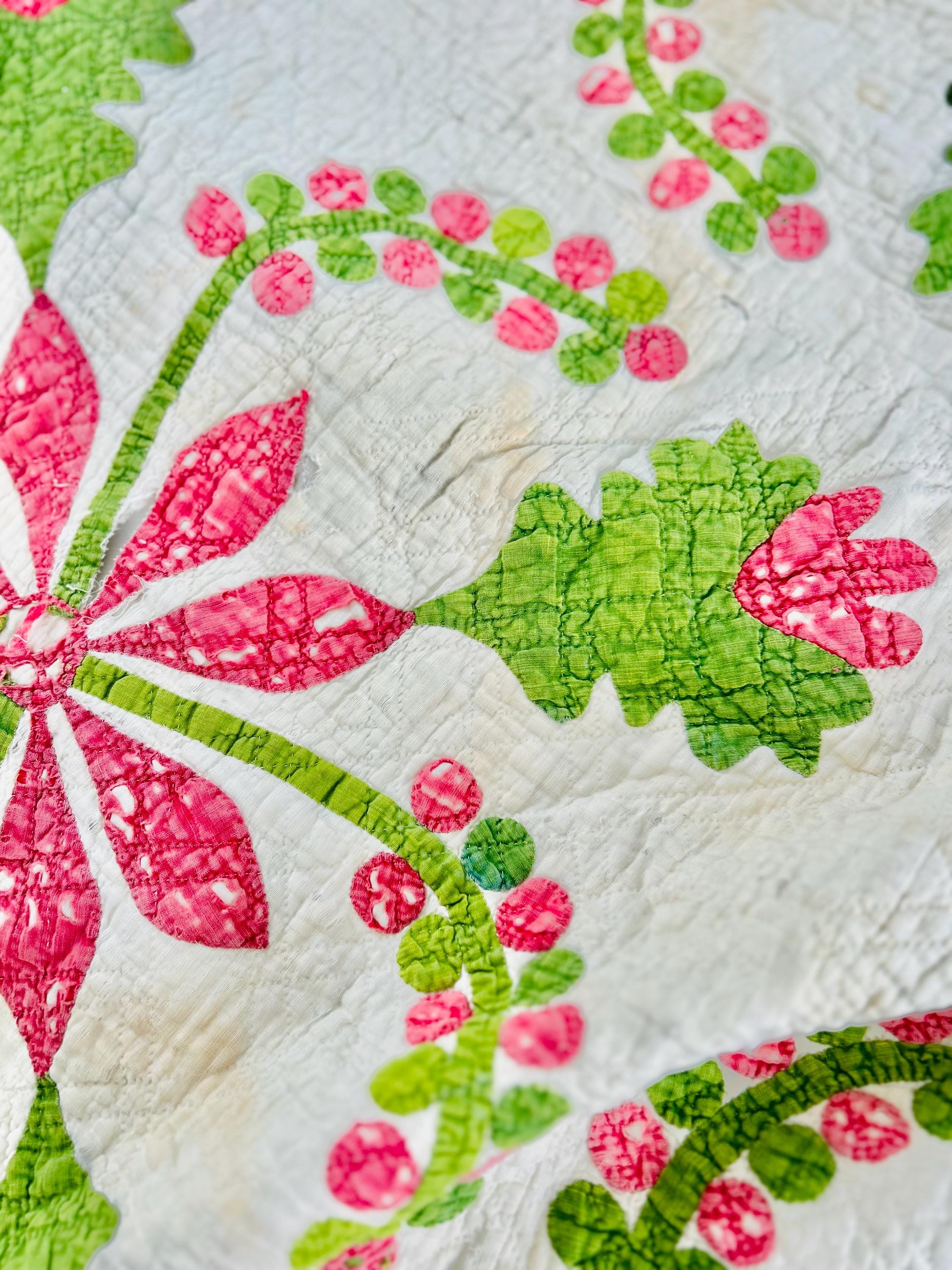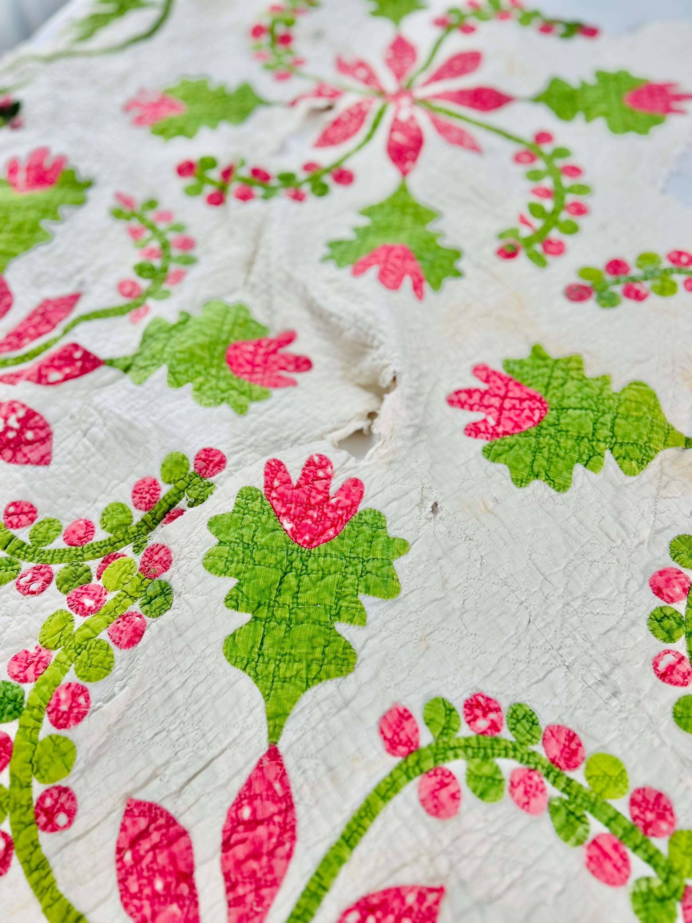 This is essentially 1/3 of a Currants & Coxcomb Quilt from the 1880s. It was found exactly like it is being sold - as an irregularly shaped piece that is about 47 inches by 74 inches that has been cut from a larger quilt, most likely for crafting. The hand-quilting is exquisite and in double diagonals and diamonds.