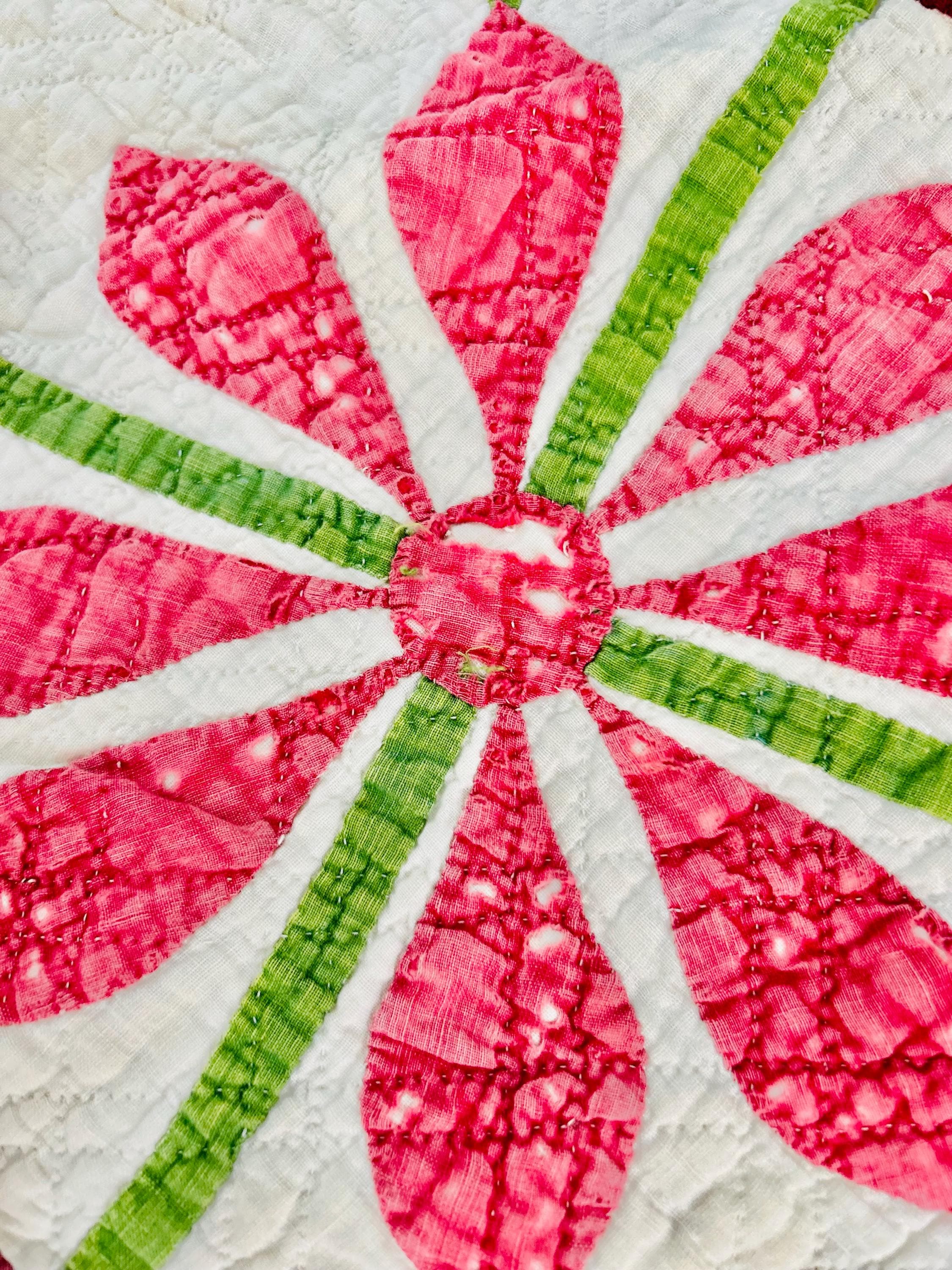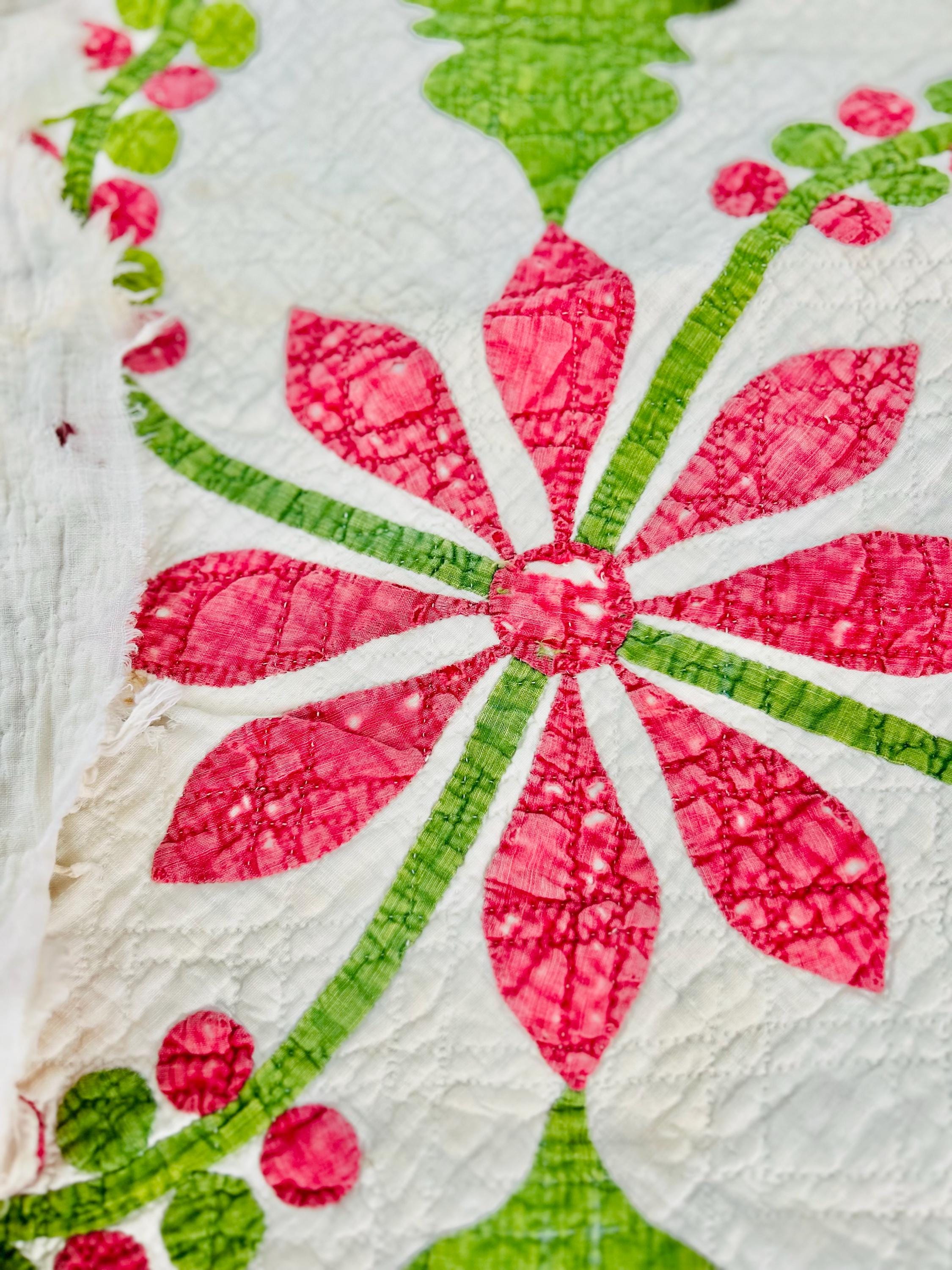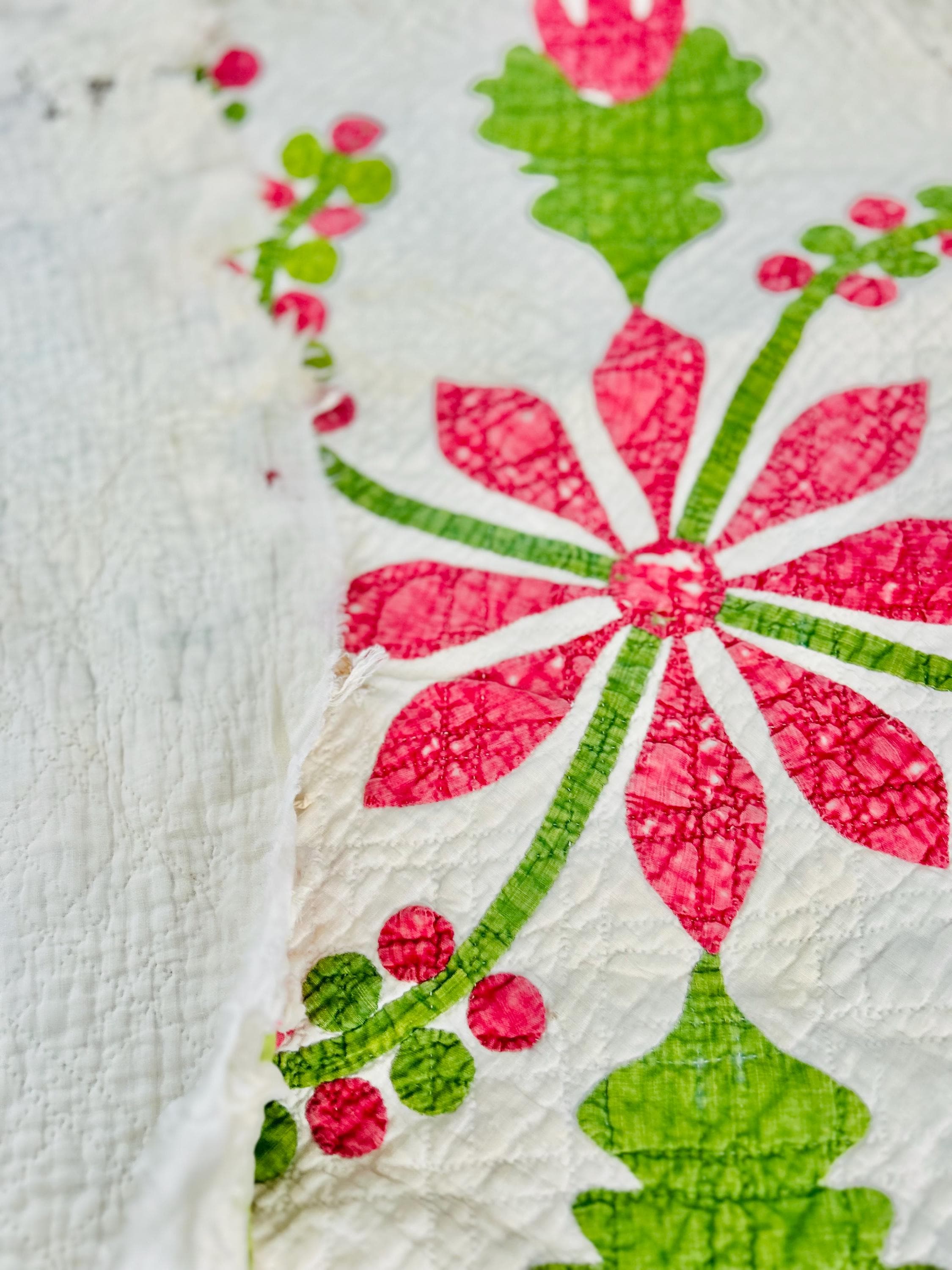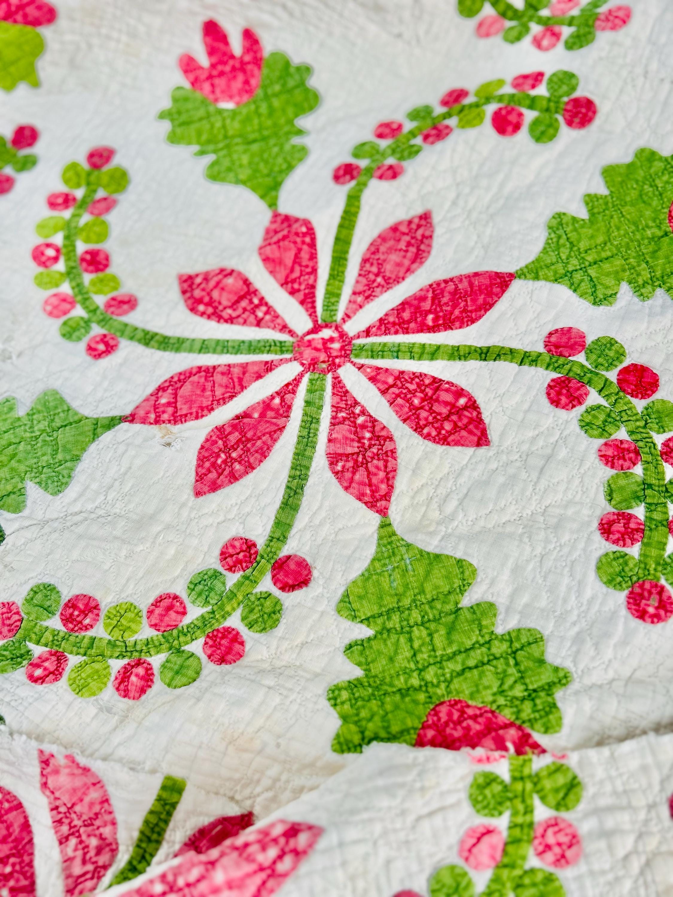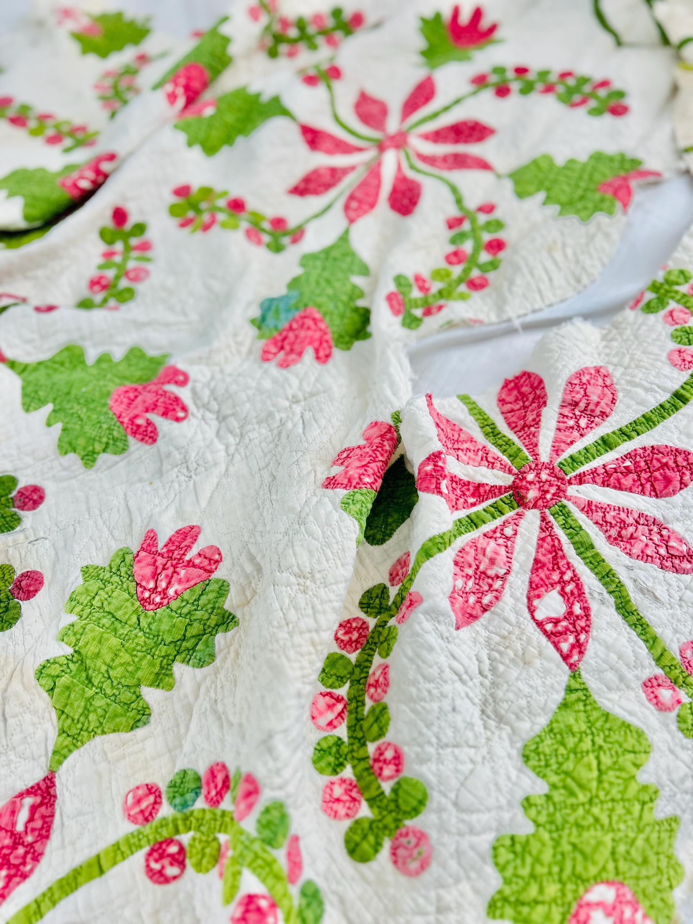 This is essentially 1/3 of a Currants & Coxcomb Quilt from the 1880s. It was found exactly like it is being sold - as an irregularly shaped piece that is about 47 inches by 74 inches that has been cut from a larger quilt, most likely for crafting. The hand-quilting is exquisite and in double diagonals and diamonds.