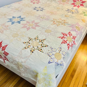 This irregularly shaped quilt remnant is clean, soft and comes from a smoke-free and pet-free home. It measures 47 inches by 74 inches at its largest point.
