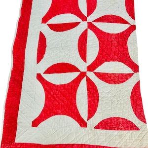 What is left of this quilt is in good condition, with fabric loss in the red fabric, holes, and a few small tan marks. See photos.