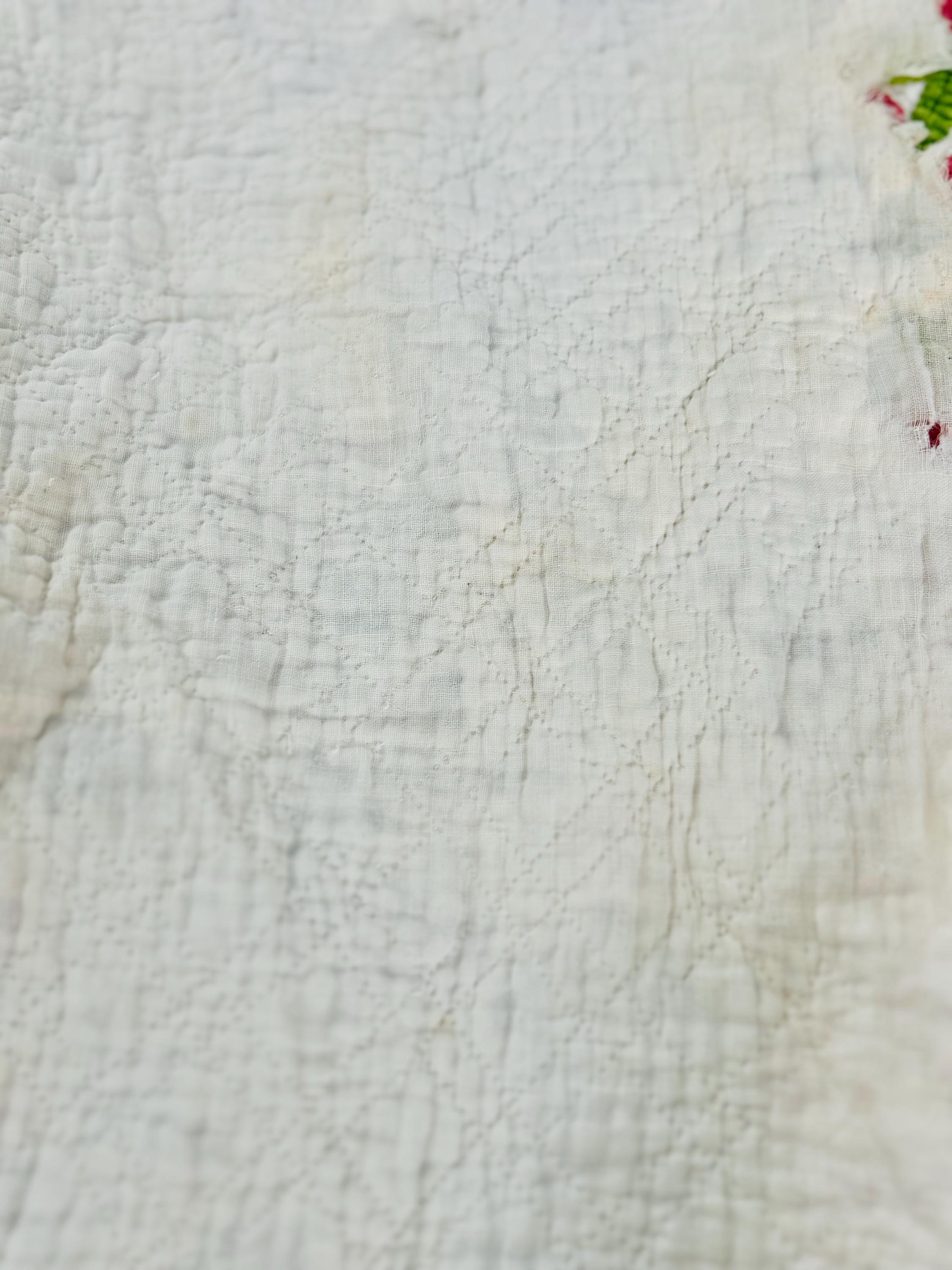 The back is white cotton and the small amount of the green binding that is left in this remnant is in excellent condition and is not fraying. The cotton batting is very lightweight.