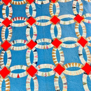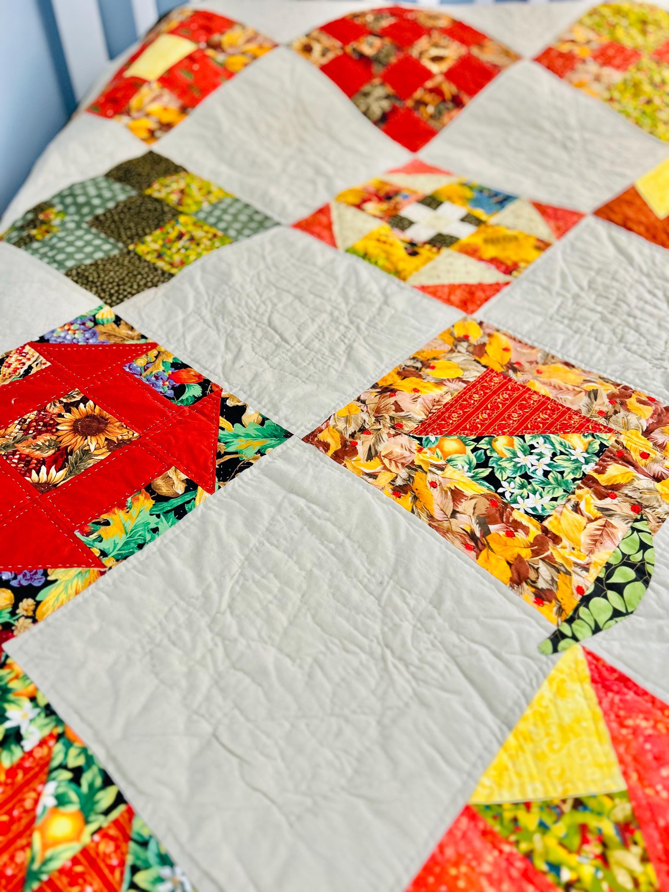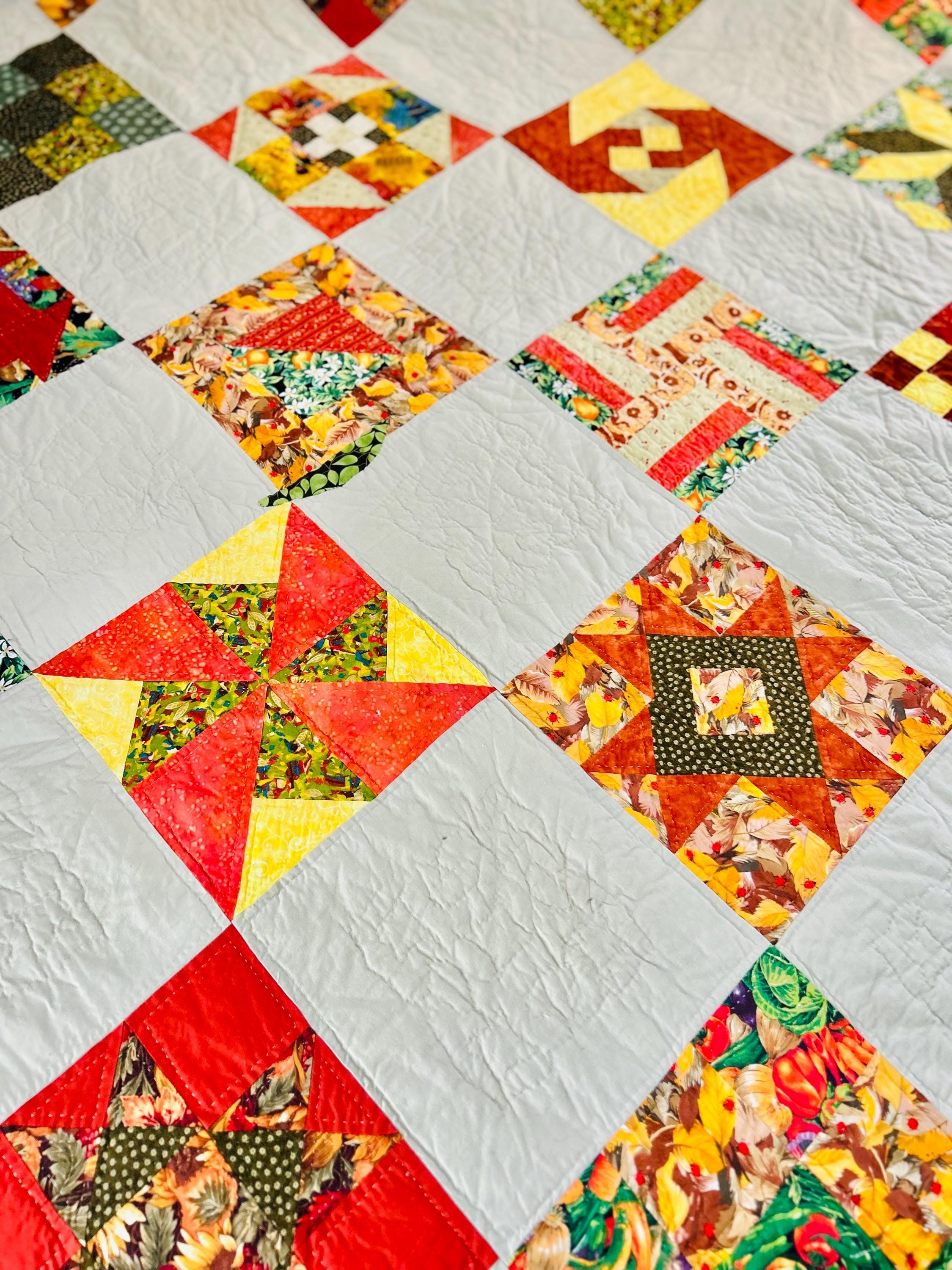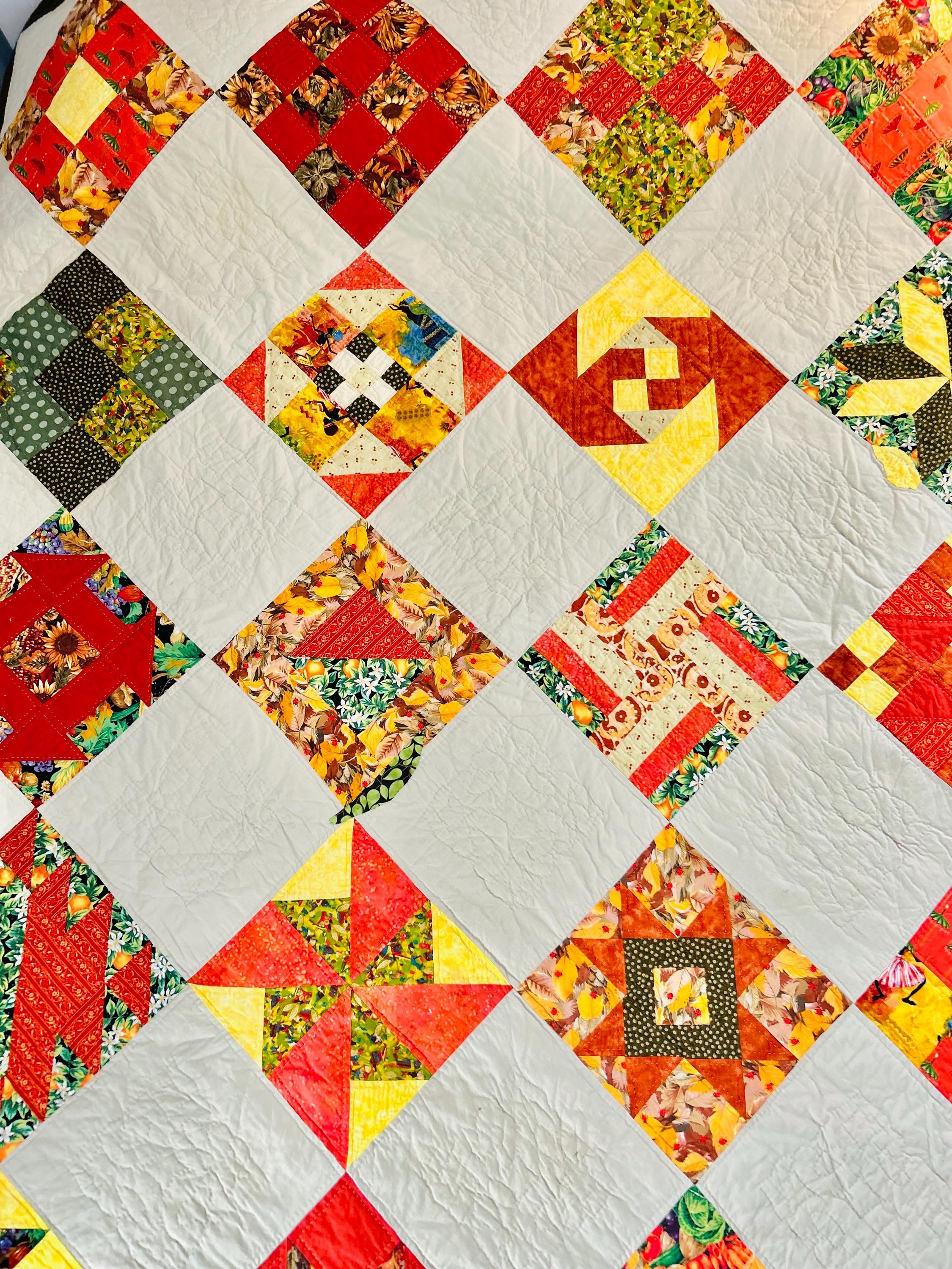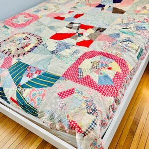 This bright and beautiful Vintage Sampler Quilt, 1970s is made of a variety of quilt block patterns in high-quality cottons, all hand-quilted. The hand-quilting is in outlines of the patchwork and - in the solid center areas - in elaborate flower/geometric patterns. The four-sided border has been quilted in a twisted rope variation.