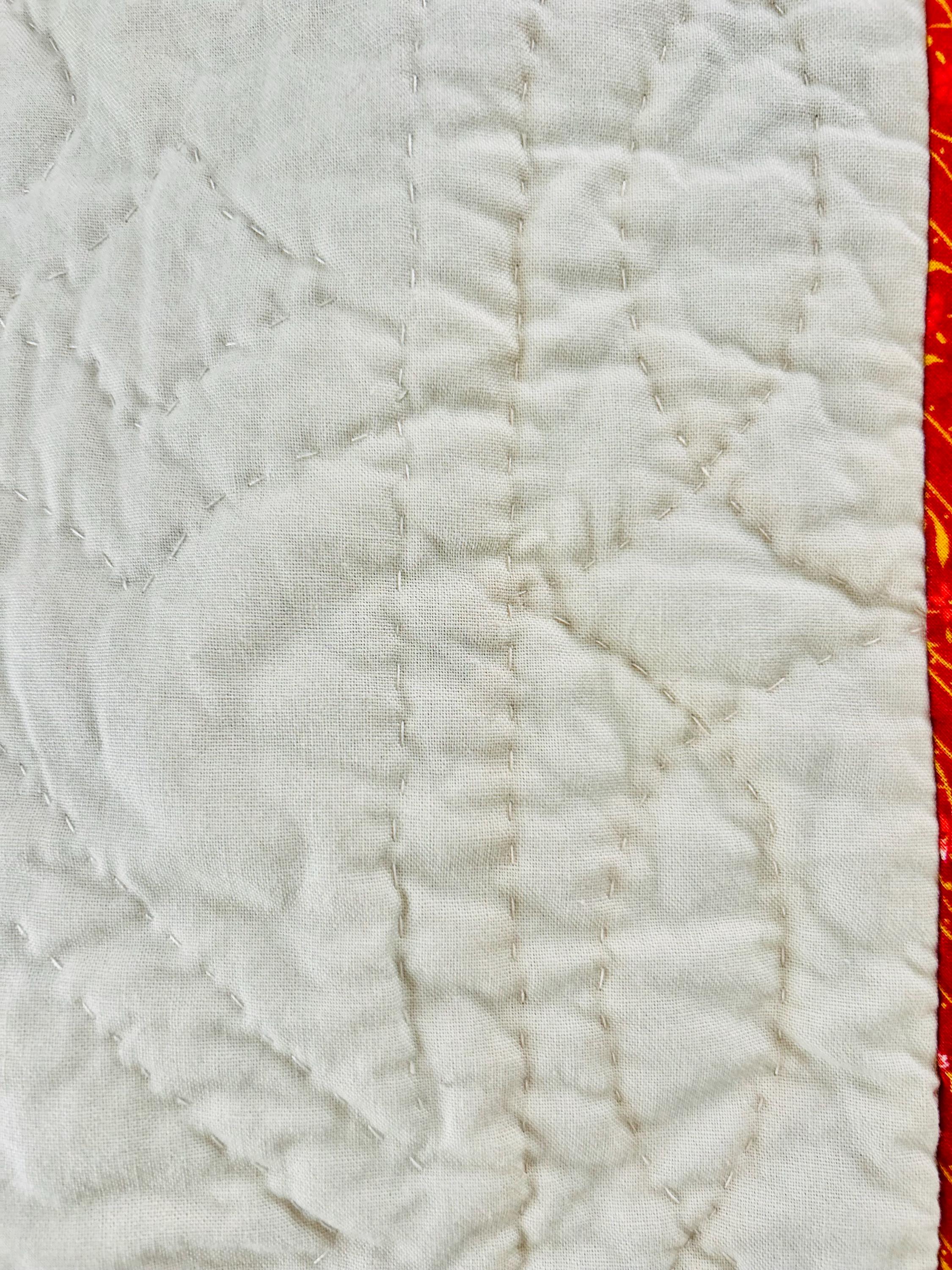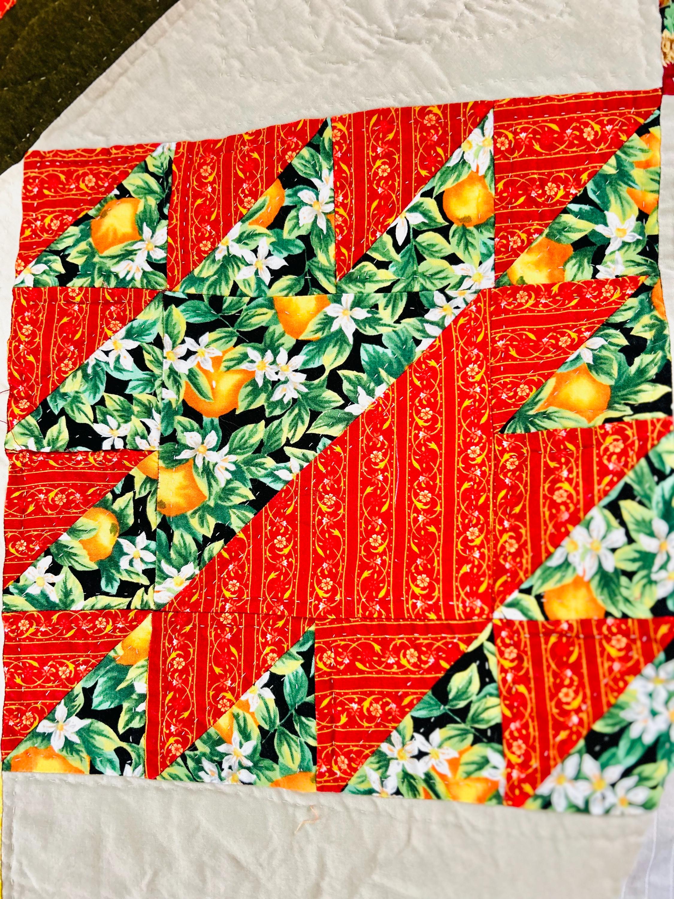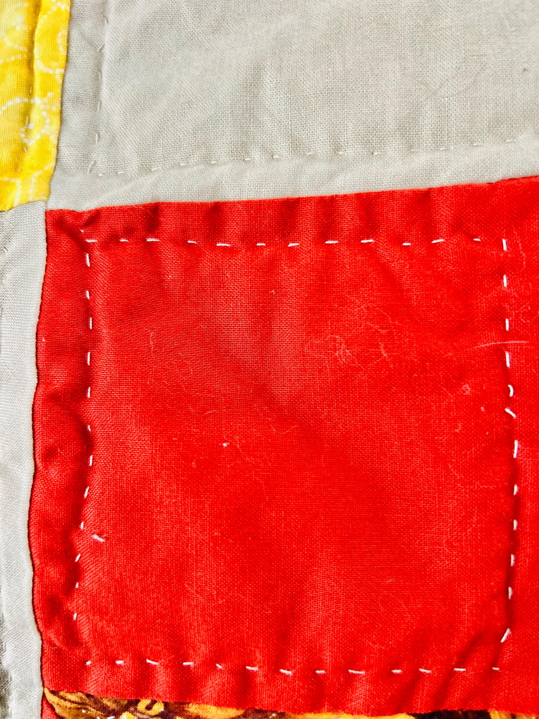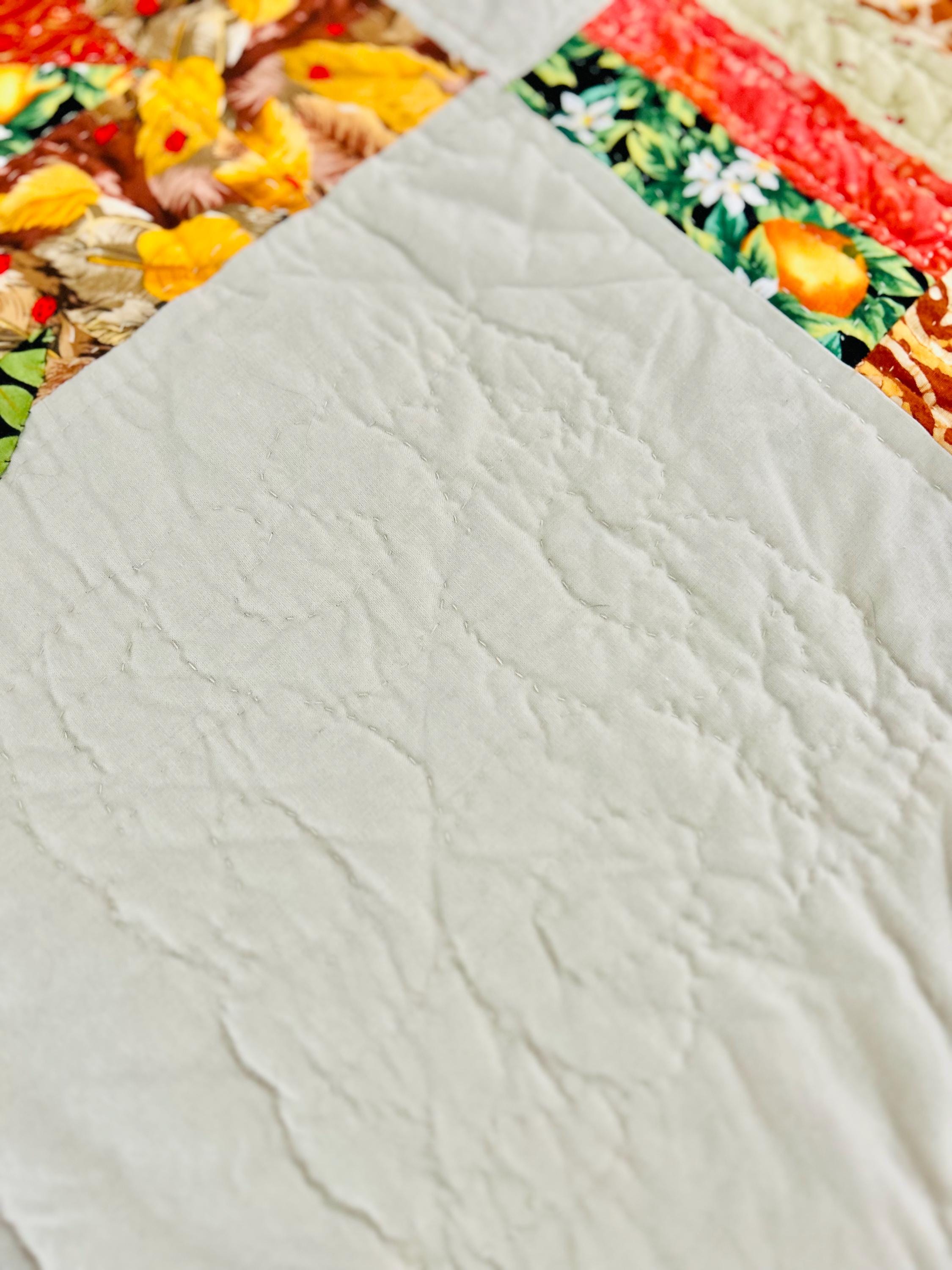 The back is a cotton green, red and yellow geometric pattern bordered on either side by light tan cotton (see photos). The binding is a red and tan floral print that has been machine stitched to both sides . The batting is lightweight.