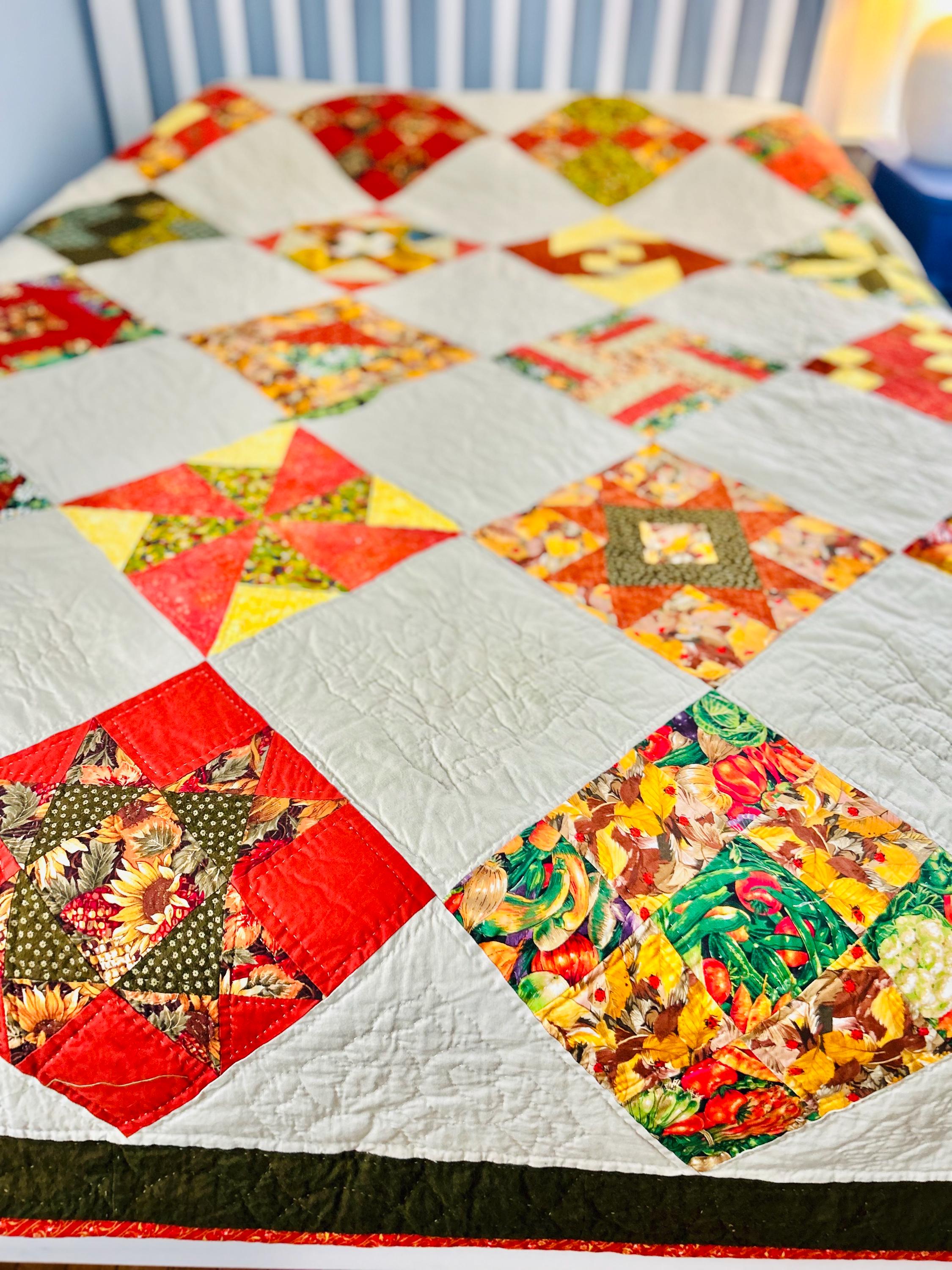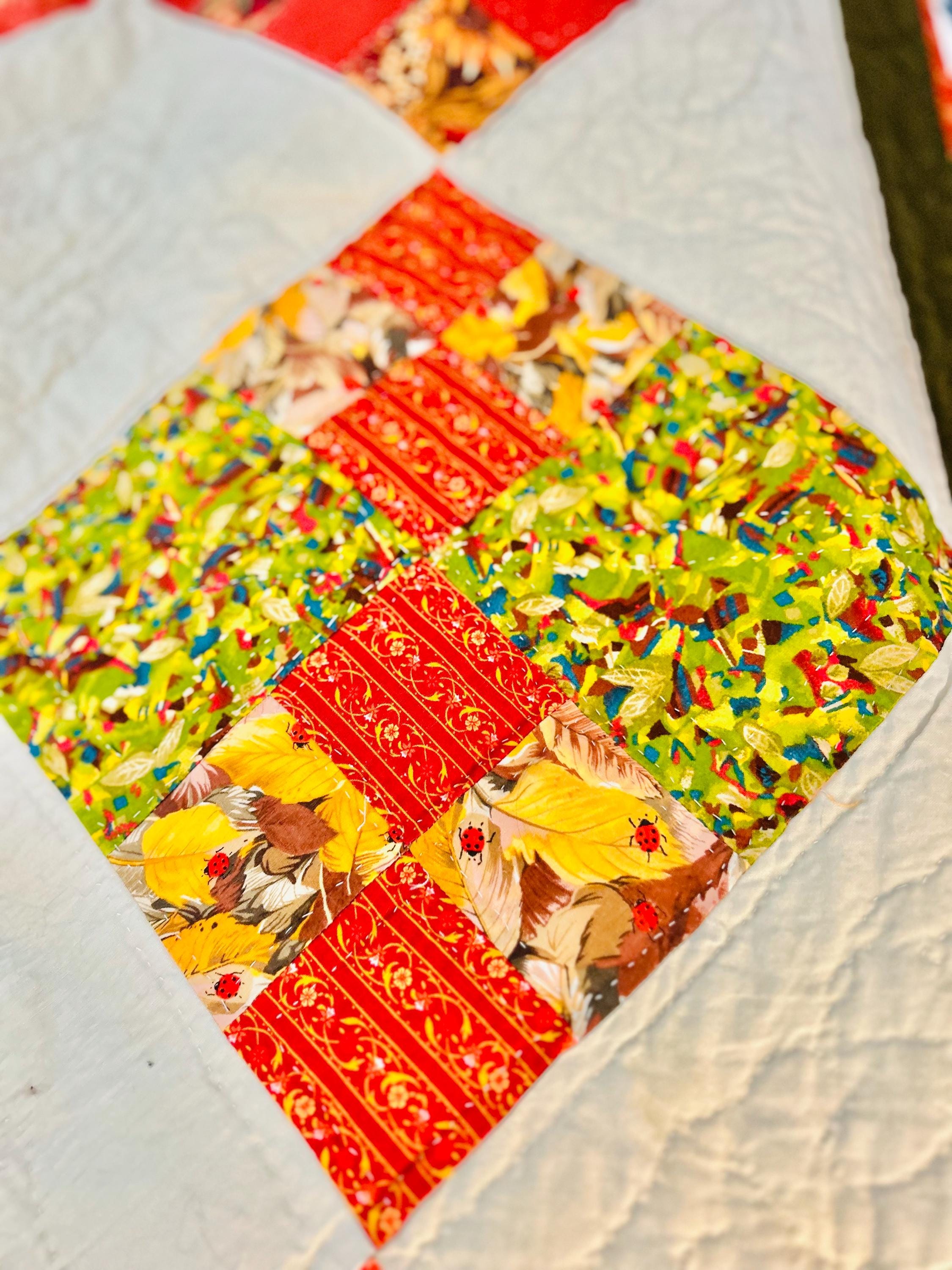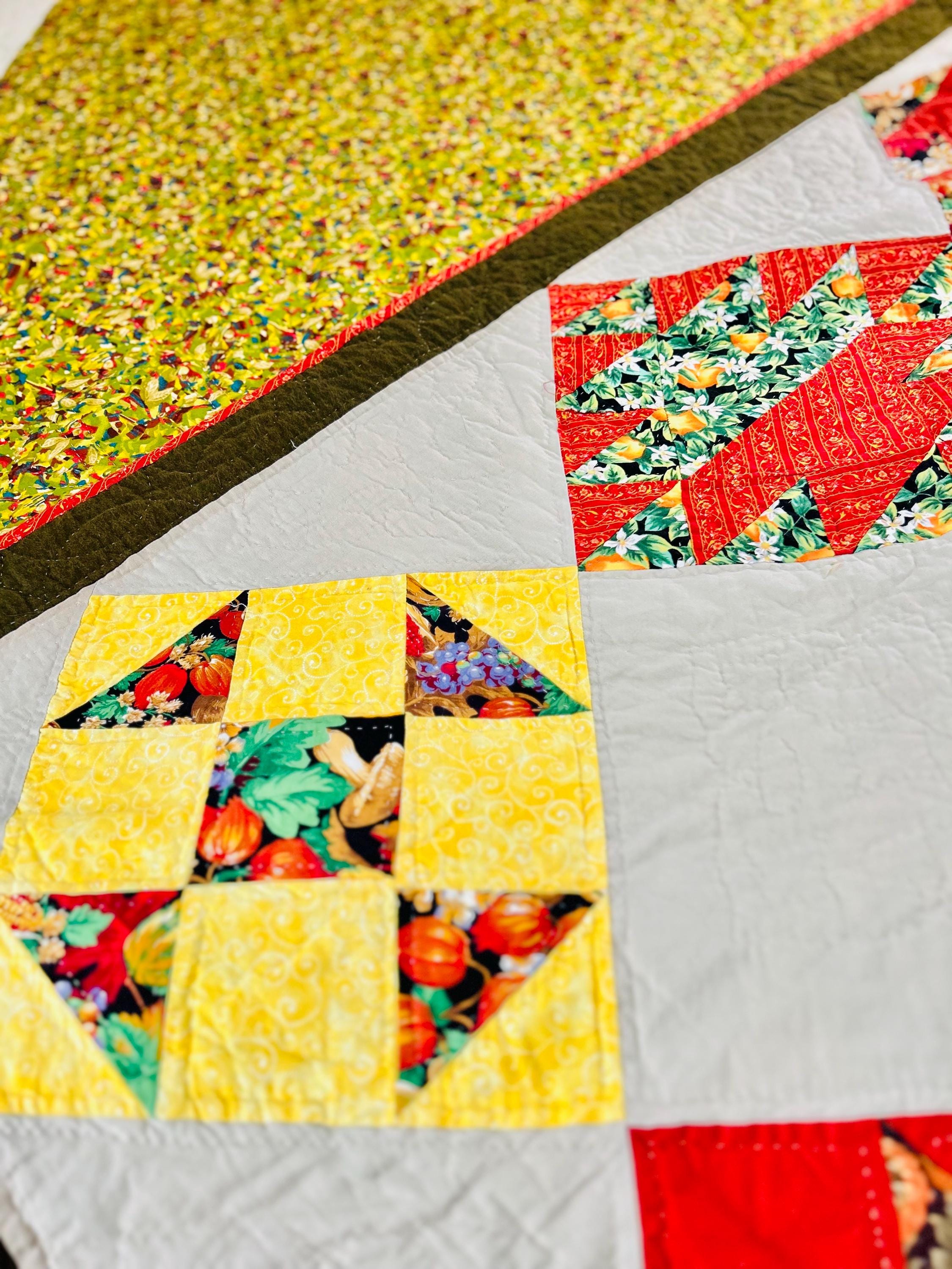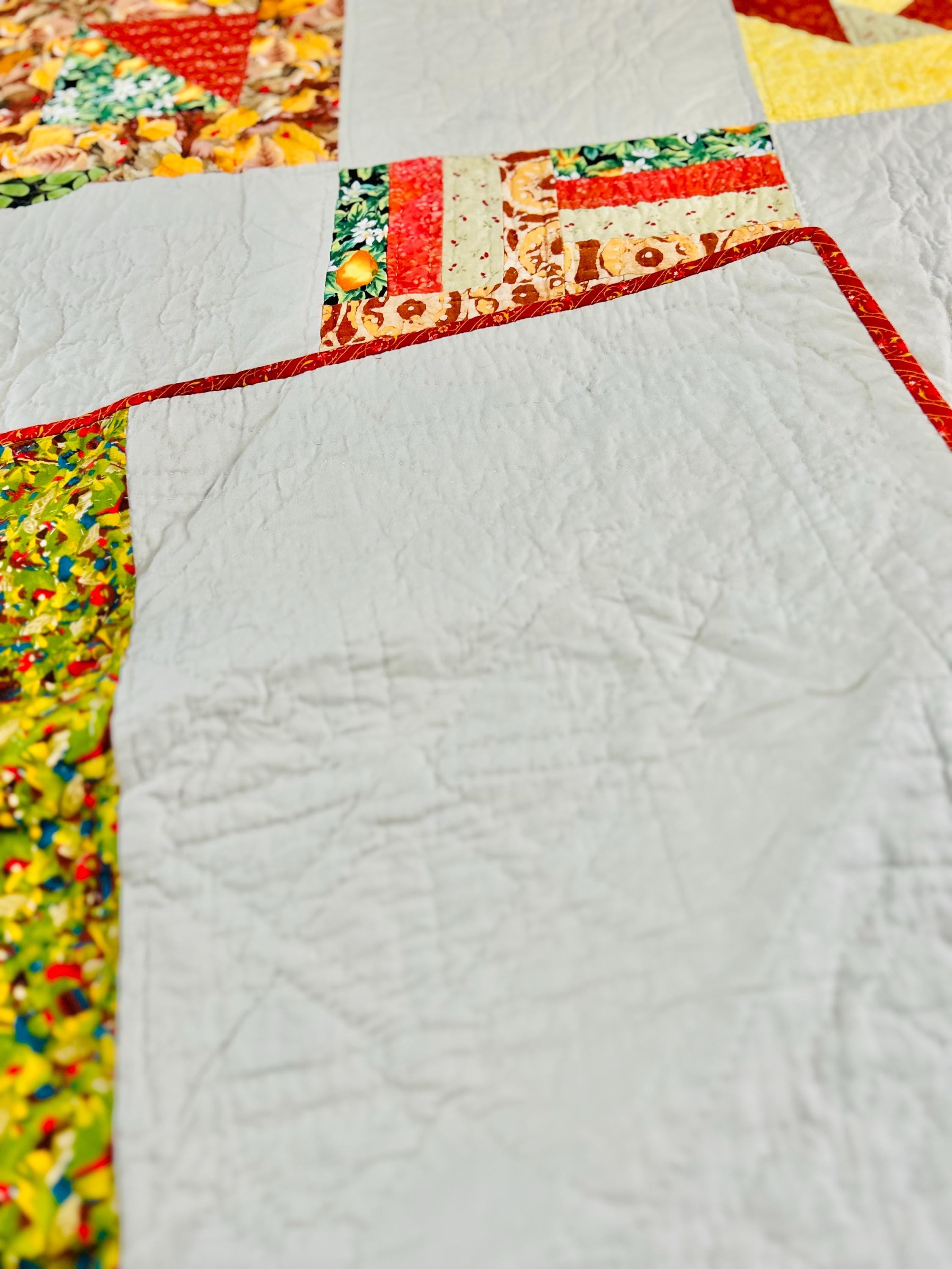 The back is a cotton green, red and yellow geometric pattern bordered on either side by light tan cotton (see photos). The binding is a red and tan floral print that has been machine stitched to both sides . The batting is lightweight.