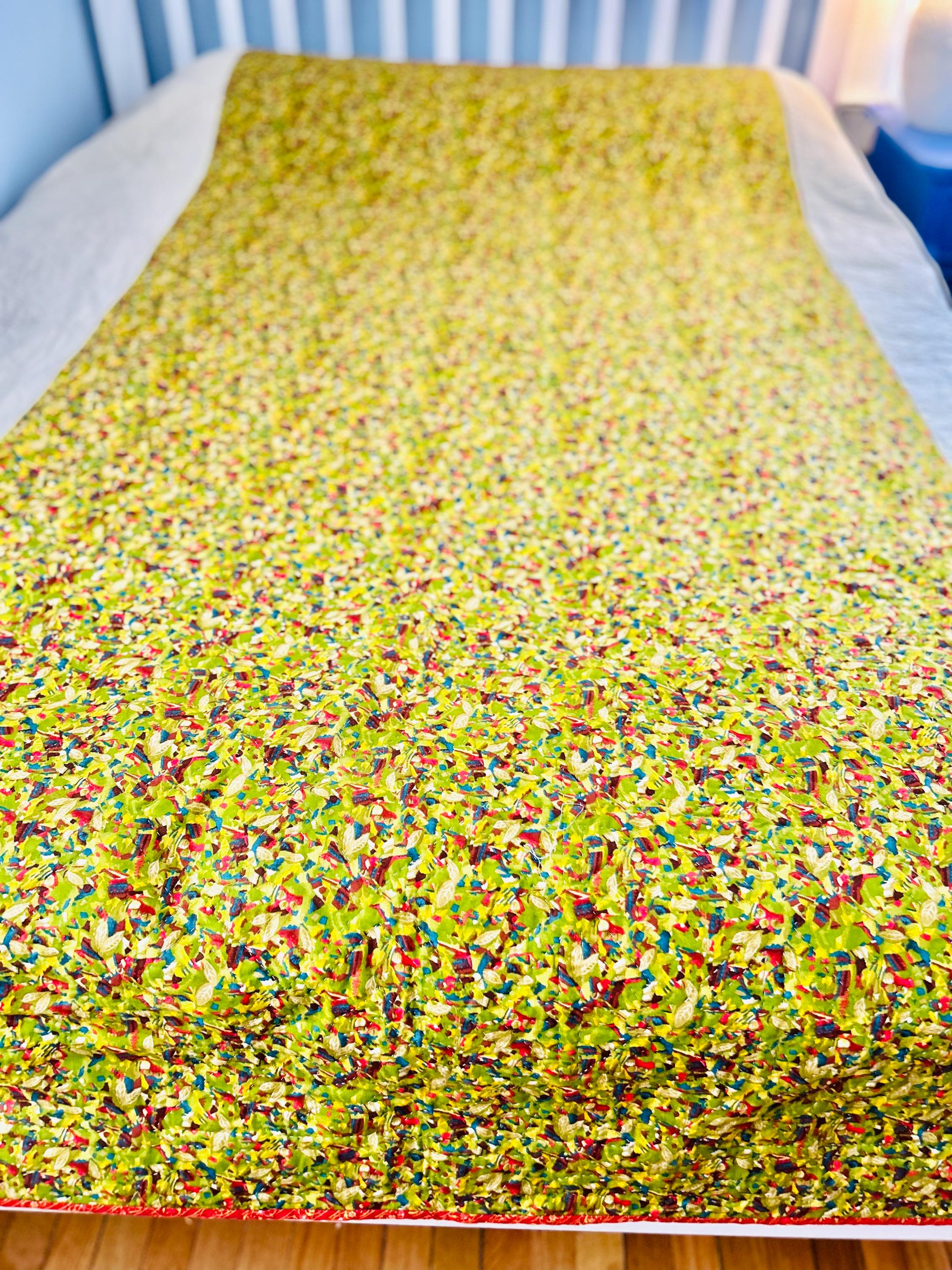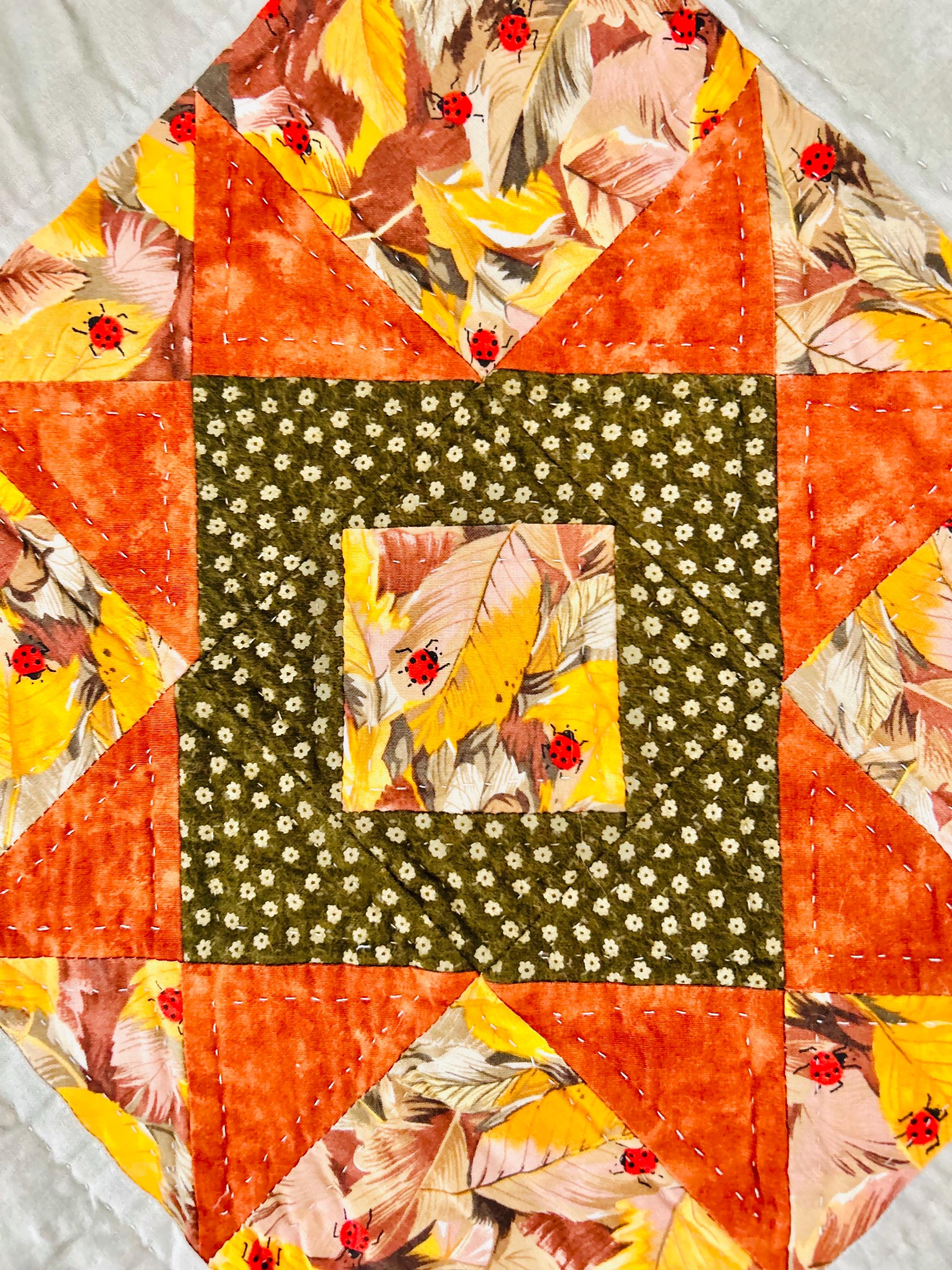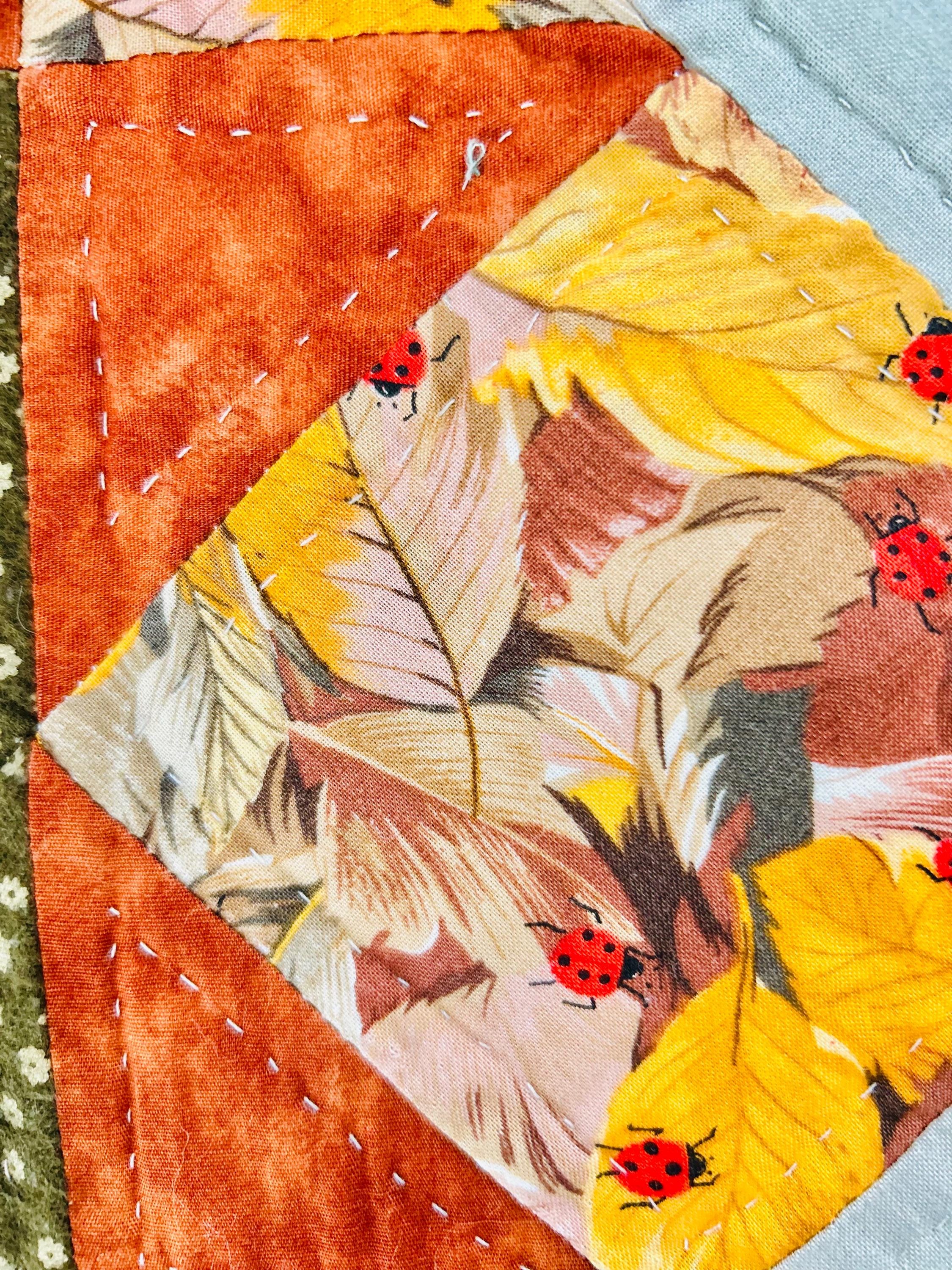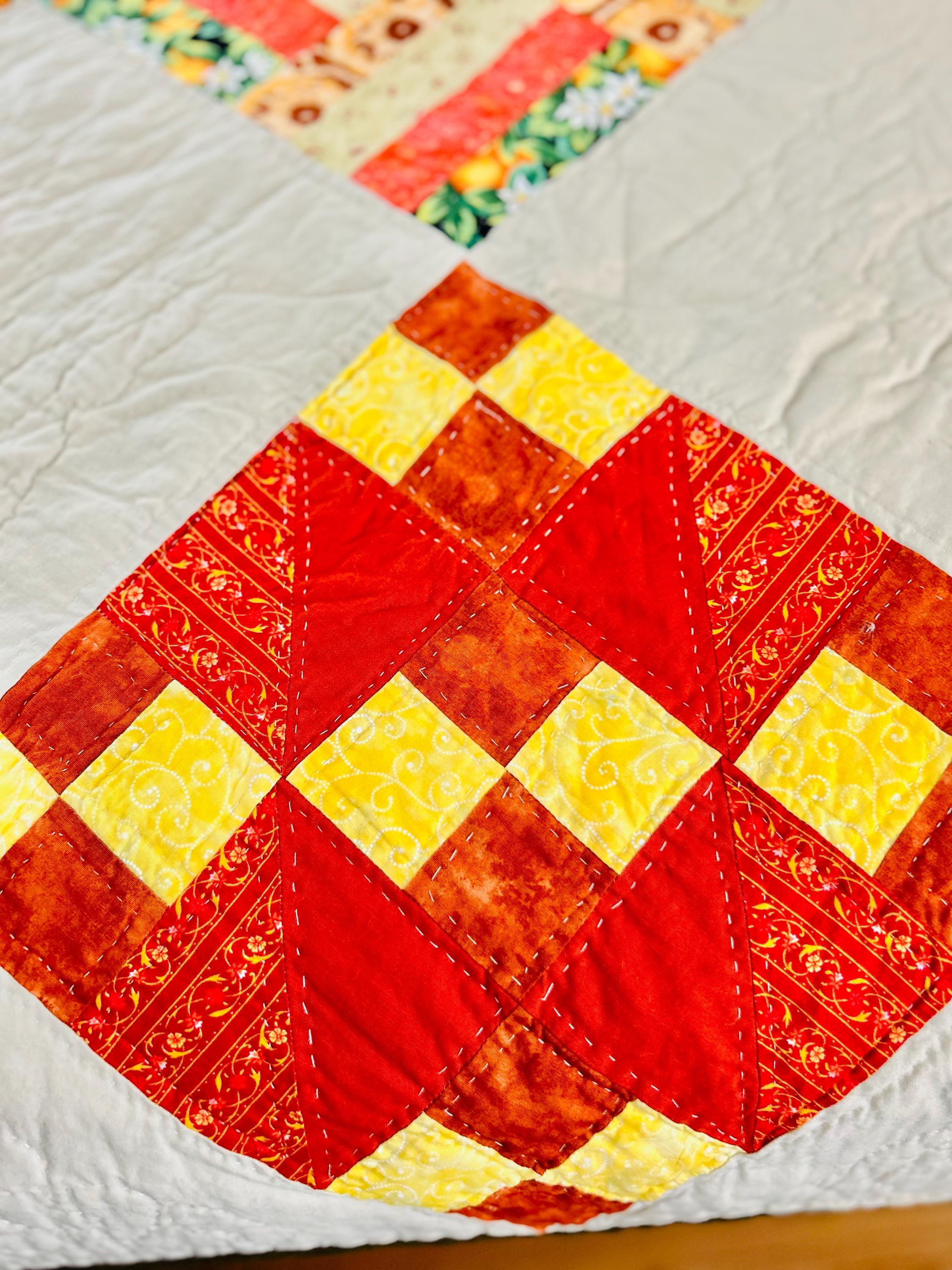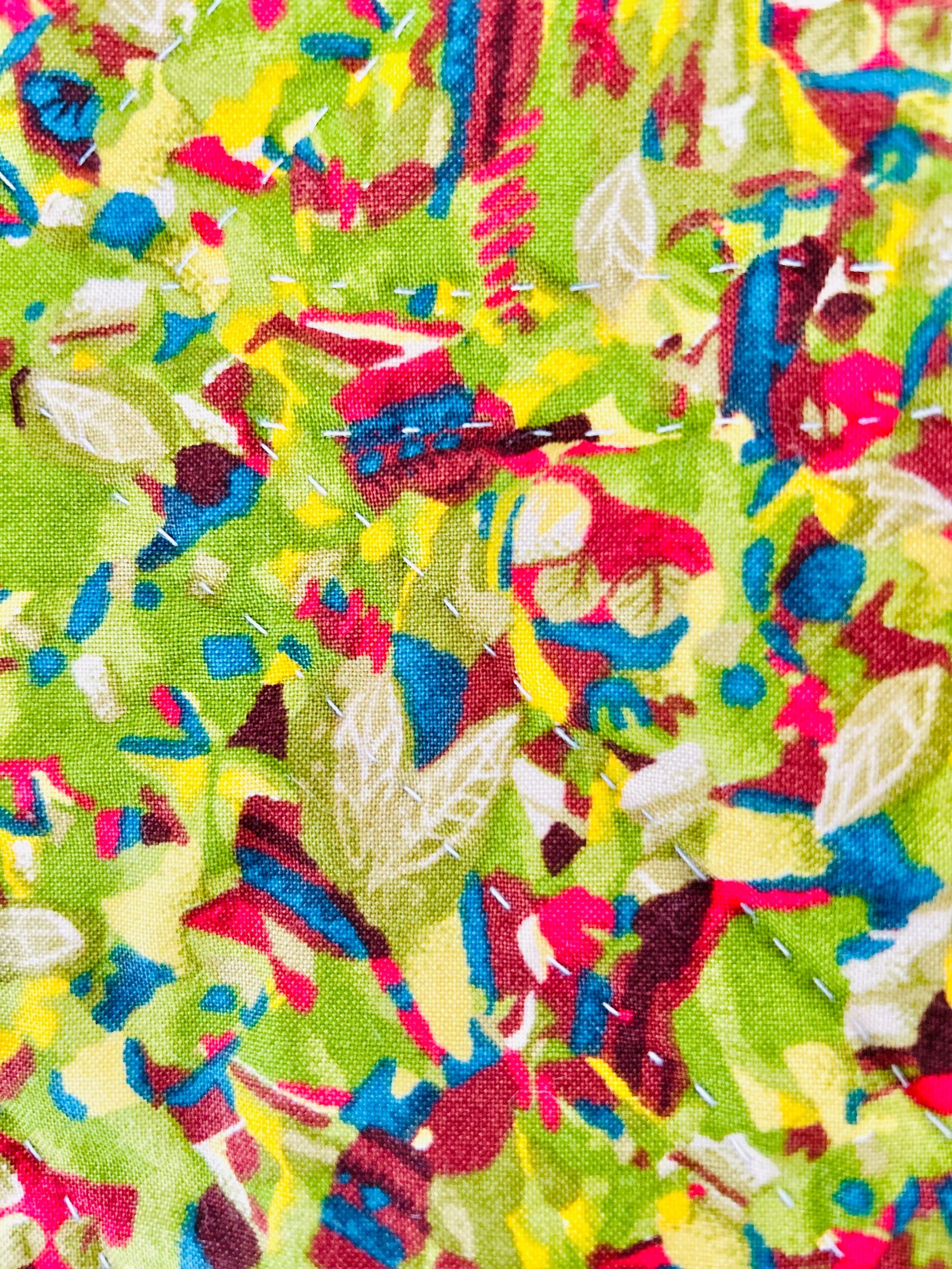 The back is a cotton green, red and yellow geometric pattern bordered on either side by light tan cotton (see photos). The binding is a red and tan floral print that has been machine stitched to both sides . The batting is lightweight.