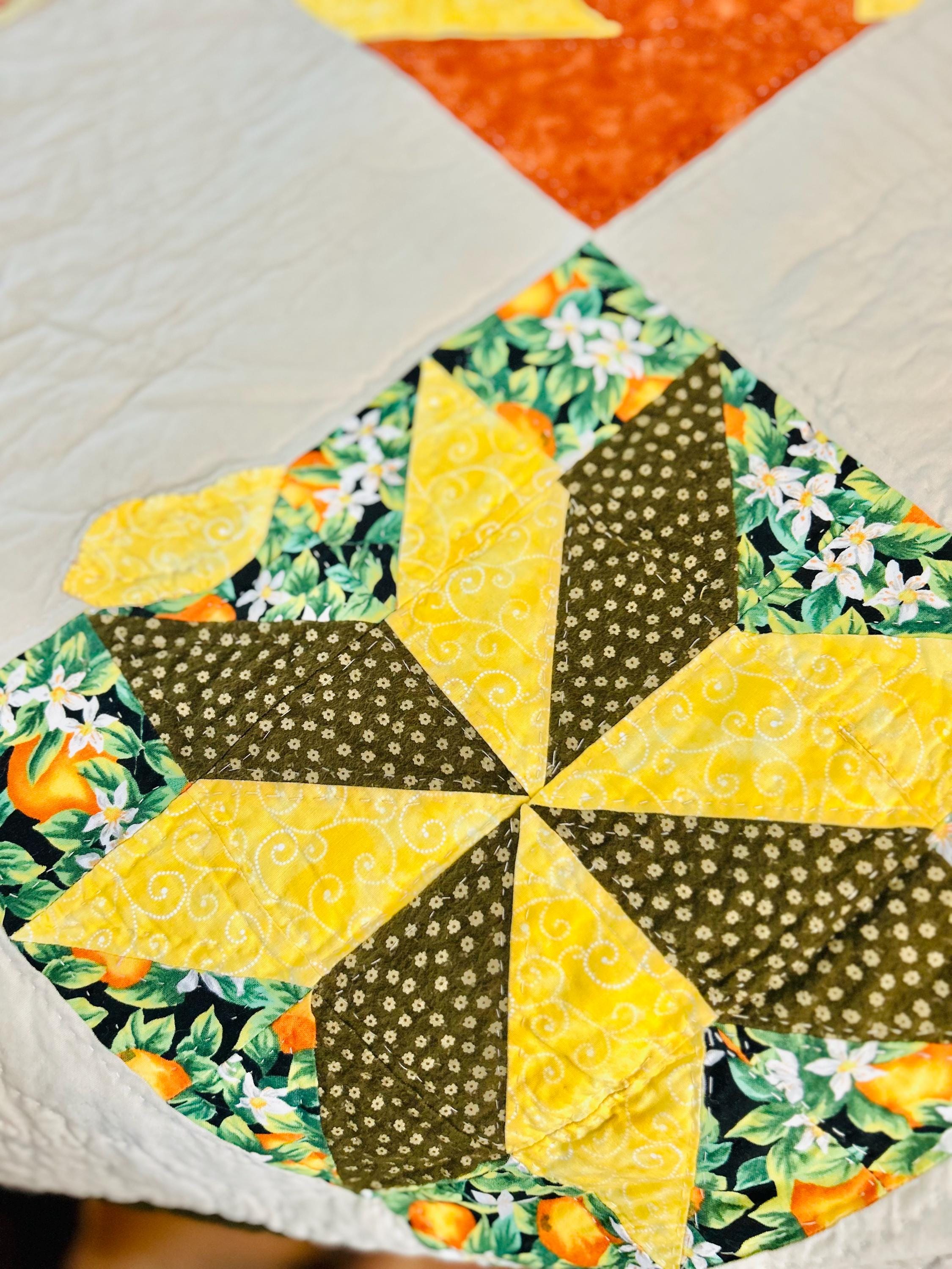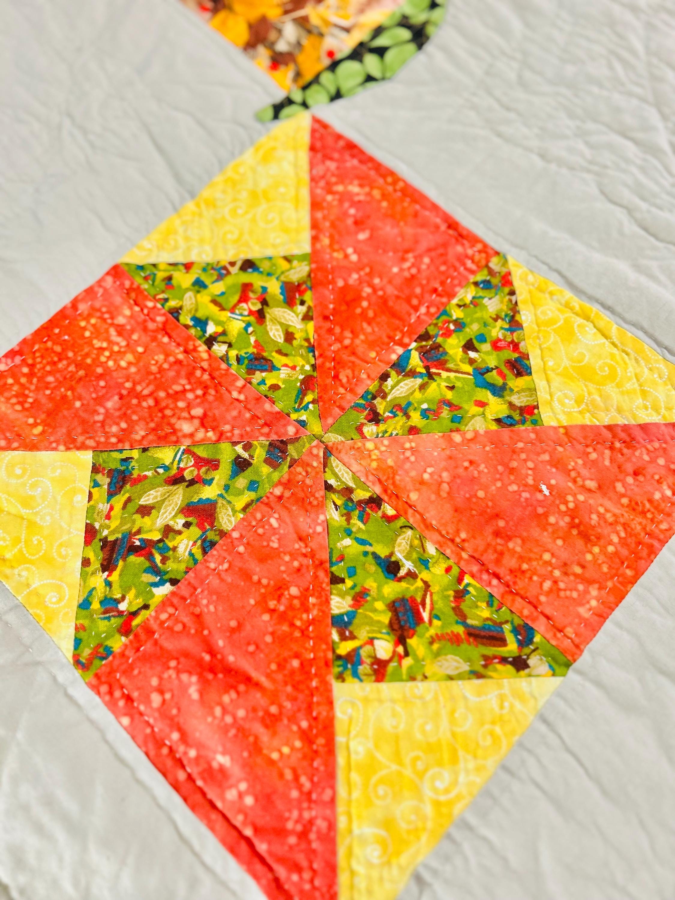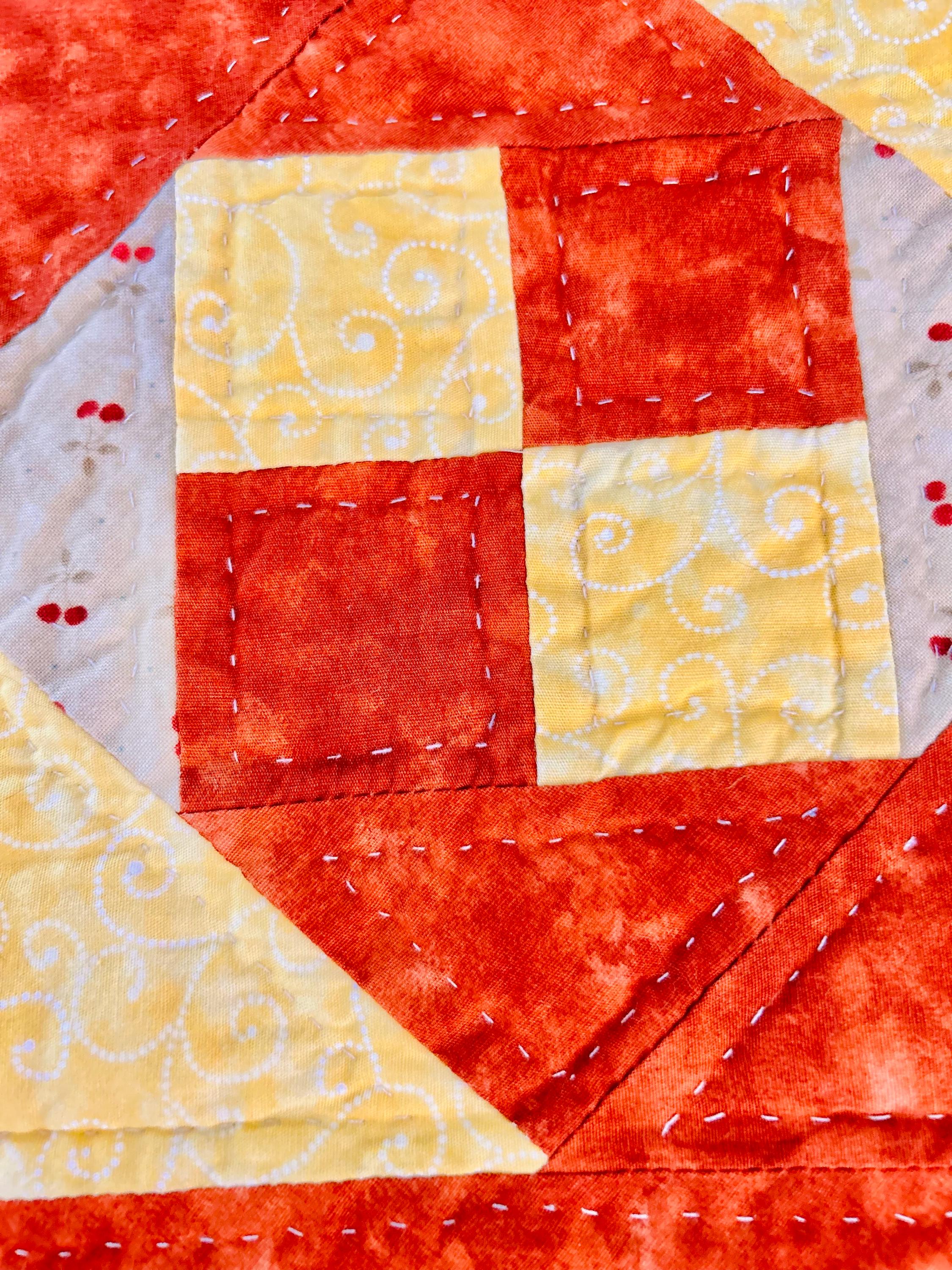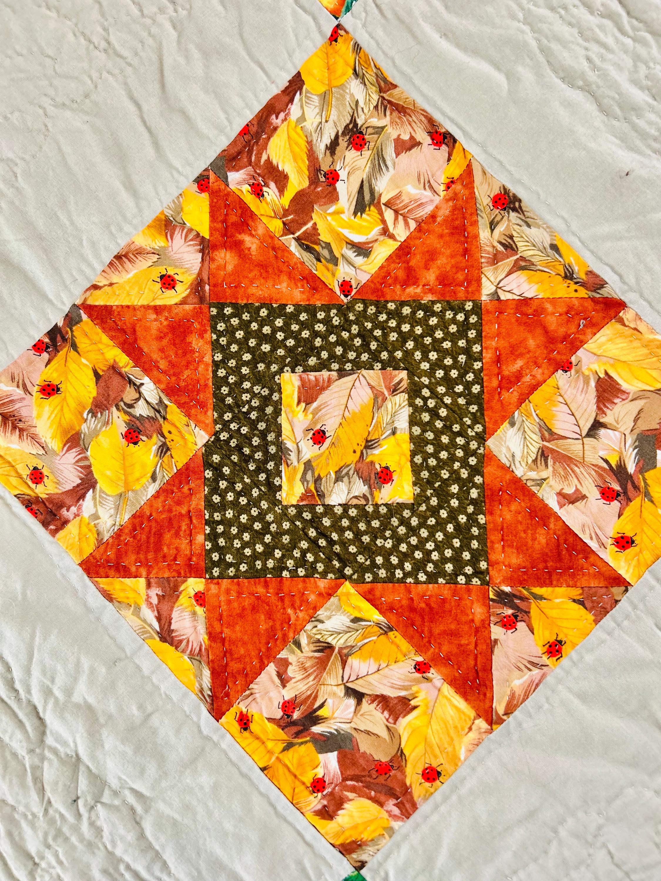 The back is a cotton green, red and yellow geometric pattern bordered on either side by light tan cotton (see photos). The binding is a red and tan floral print that has been machine stitched to both sides . The batting is lightweight.