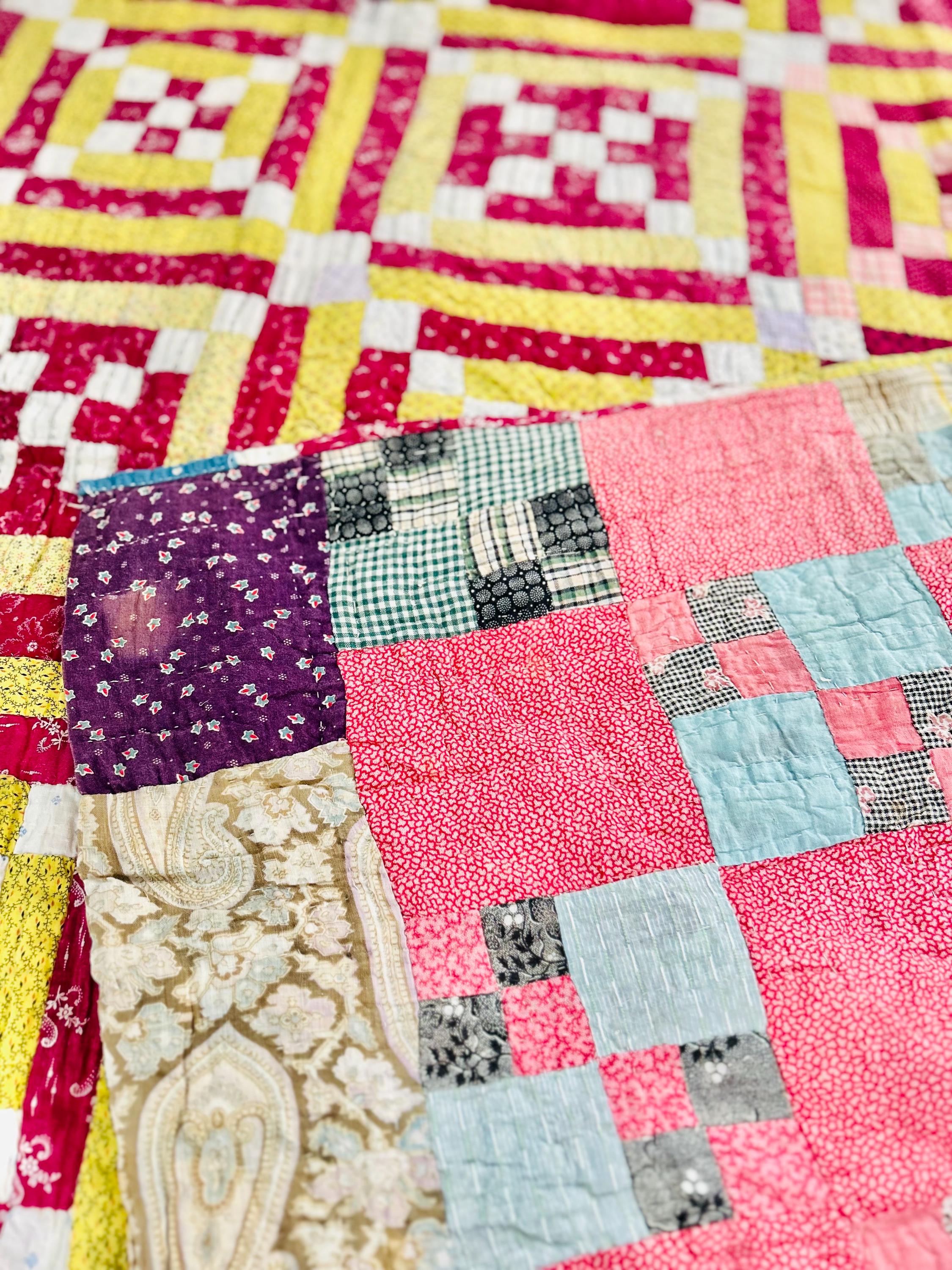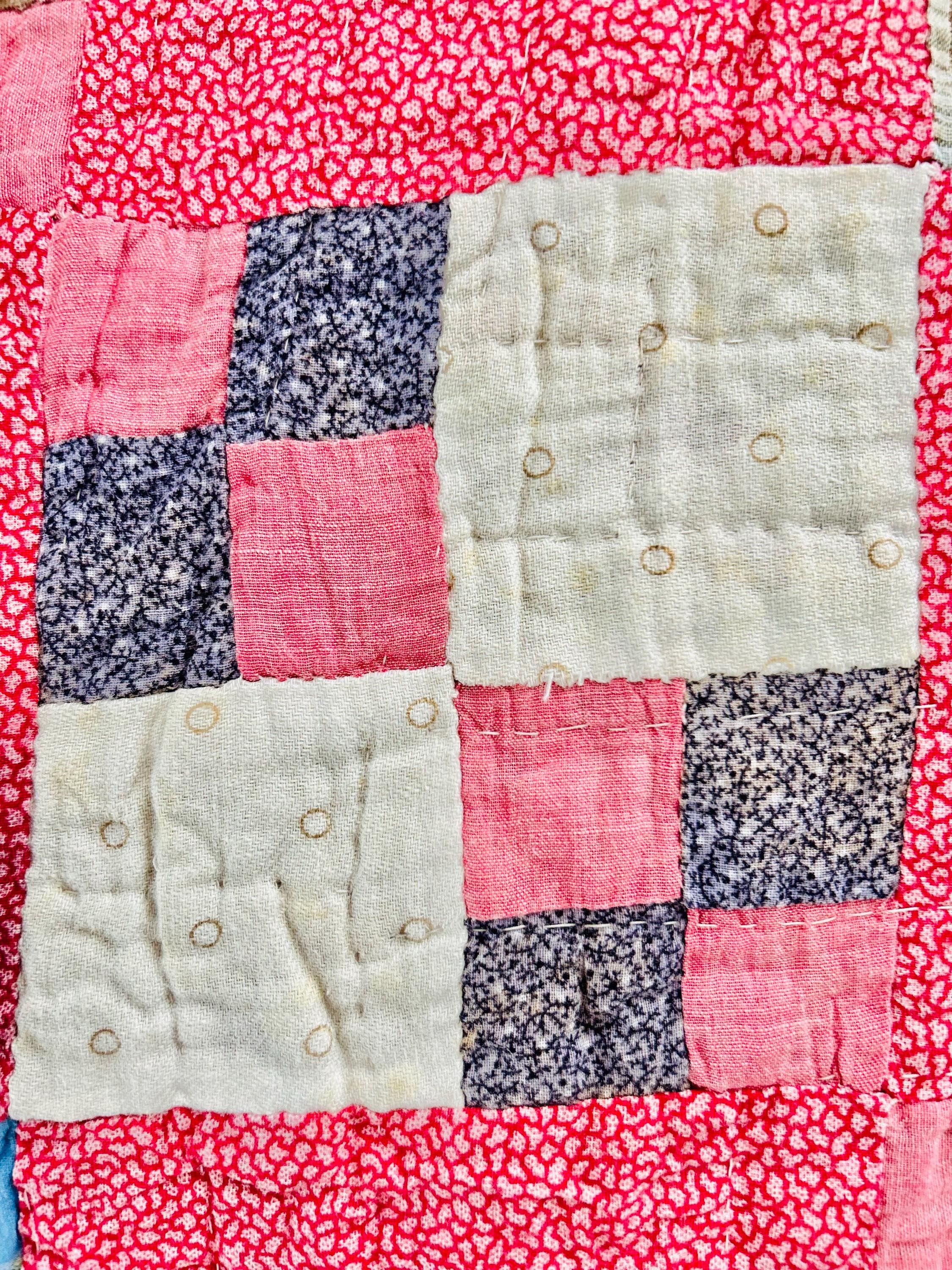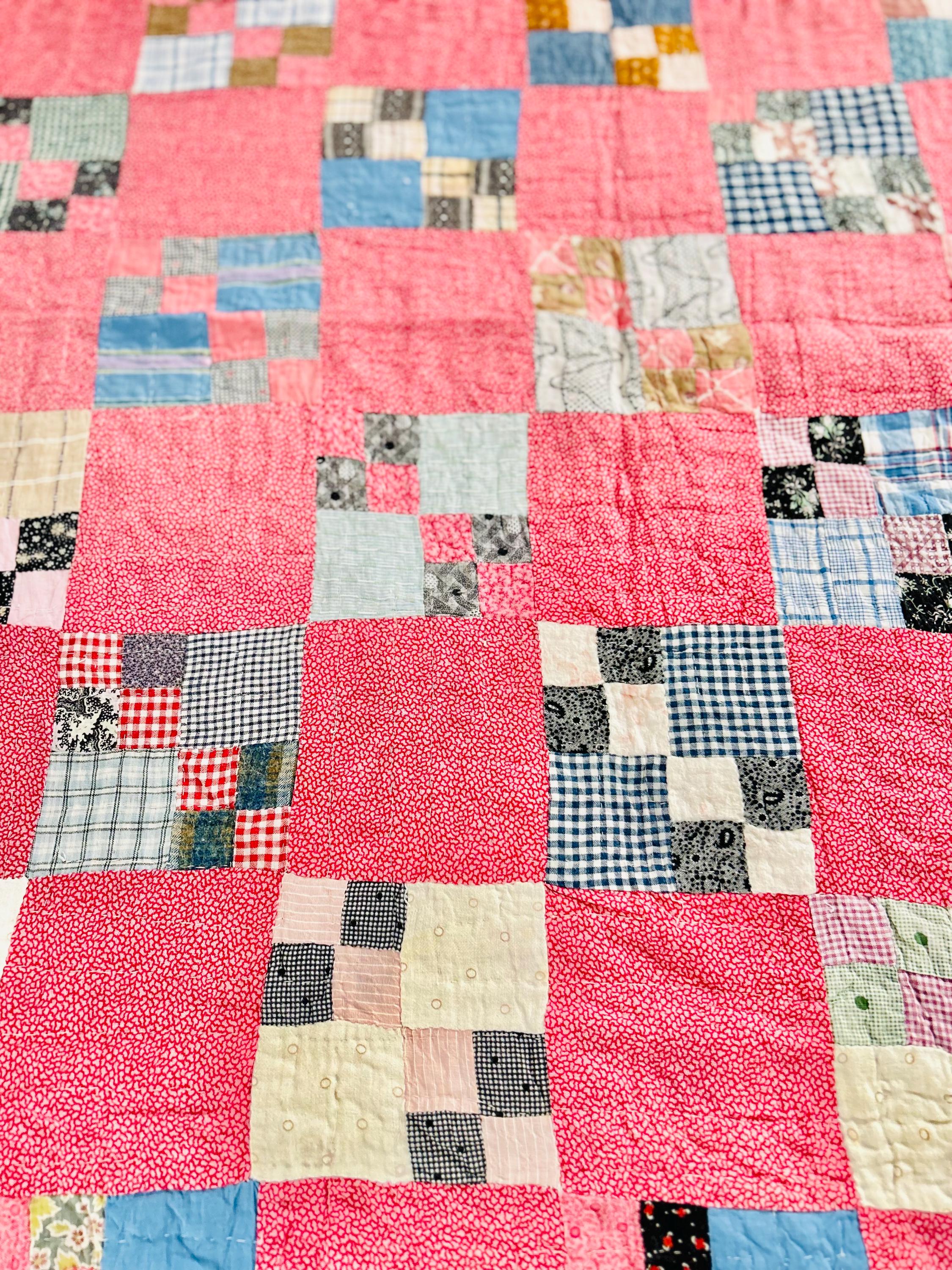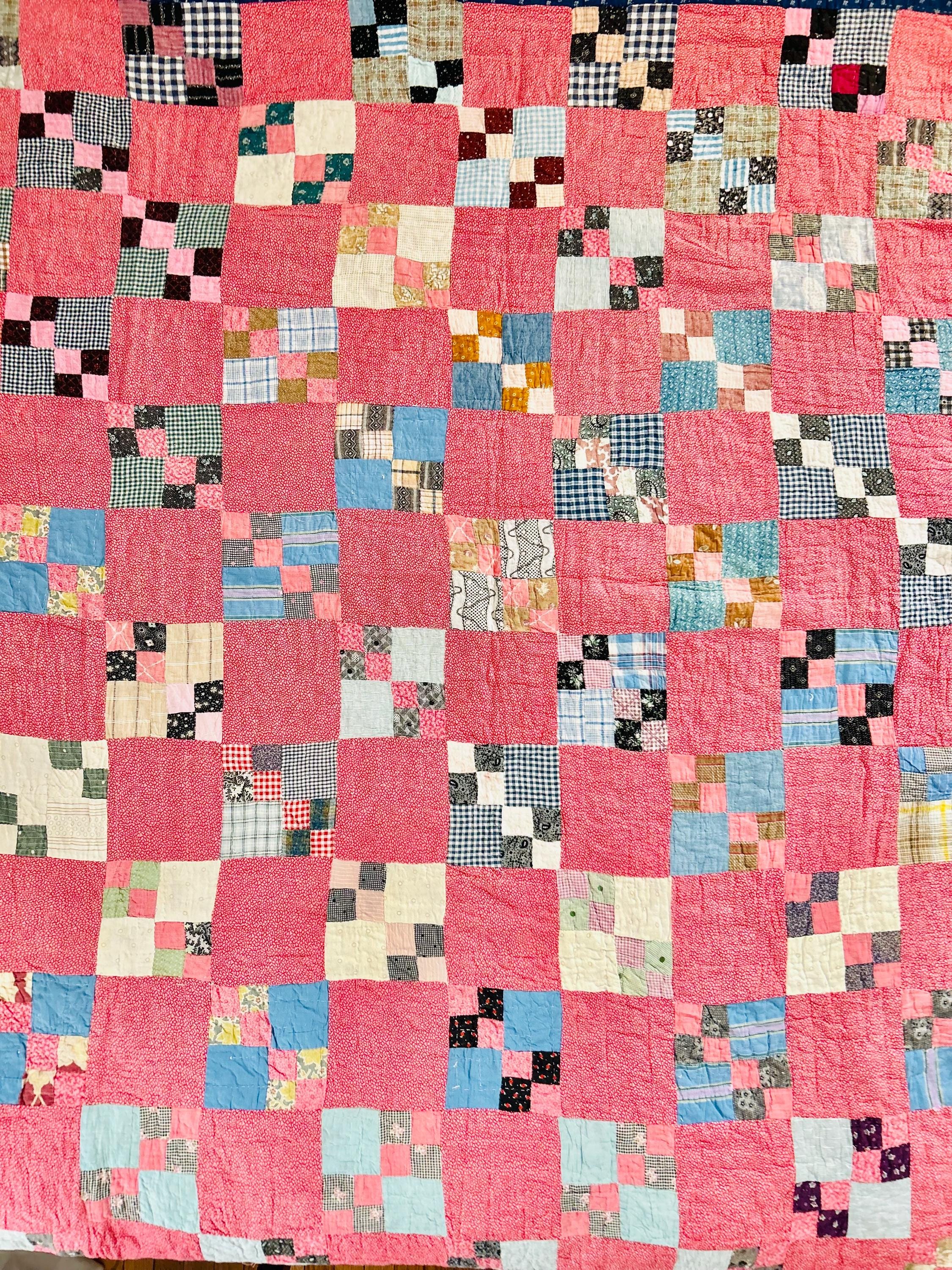 This wonderful Double Sided Quilt, circa 1890s, is a Double-Nine-Patch with Courthouse Steps on one side, and a Scrappy Double Four-Patch Quilt pattern on the flip side. The hand-quilting is in outlines of the patchwork on the Double-Nine Patch side of the quilt. This is a delightful and precious quilt, but it is in no way sophisticated or finely crafted. The quilting is mostly straight, but some of the patchwork curves where it's probably supposed to be straight and vice versa, adding to its considerable charm.