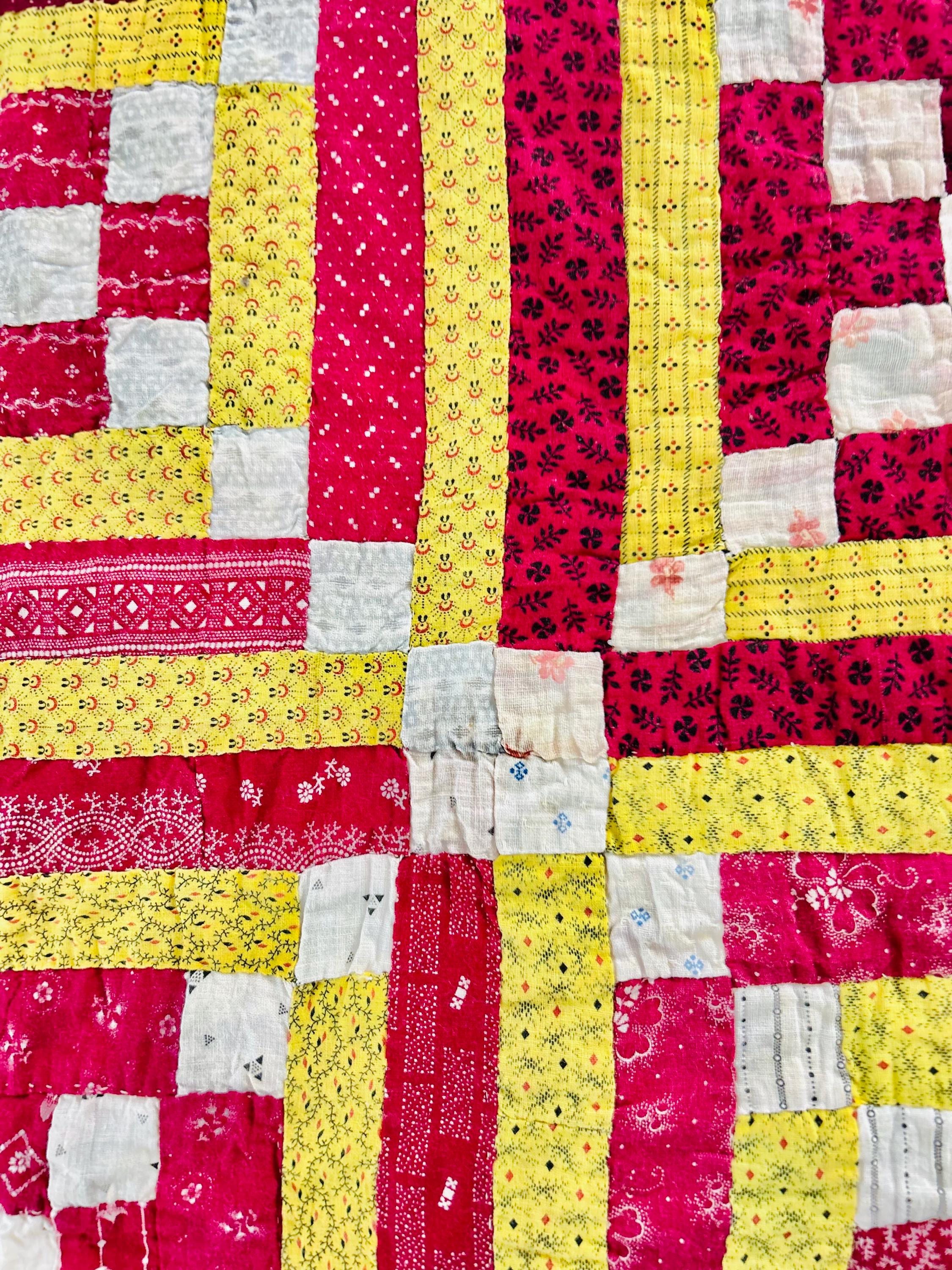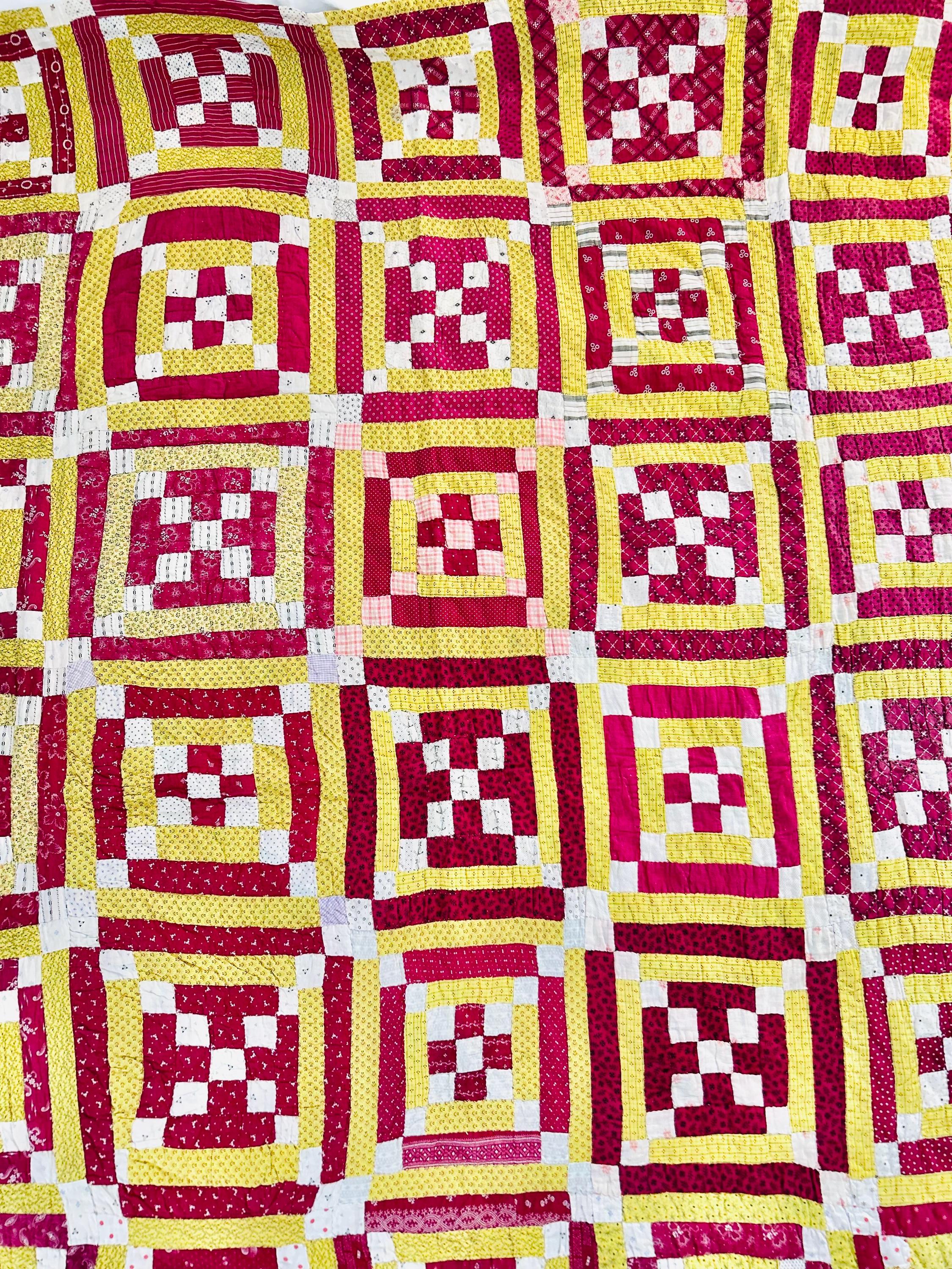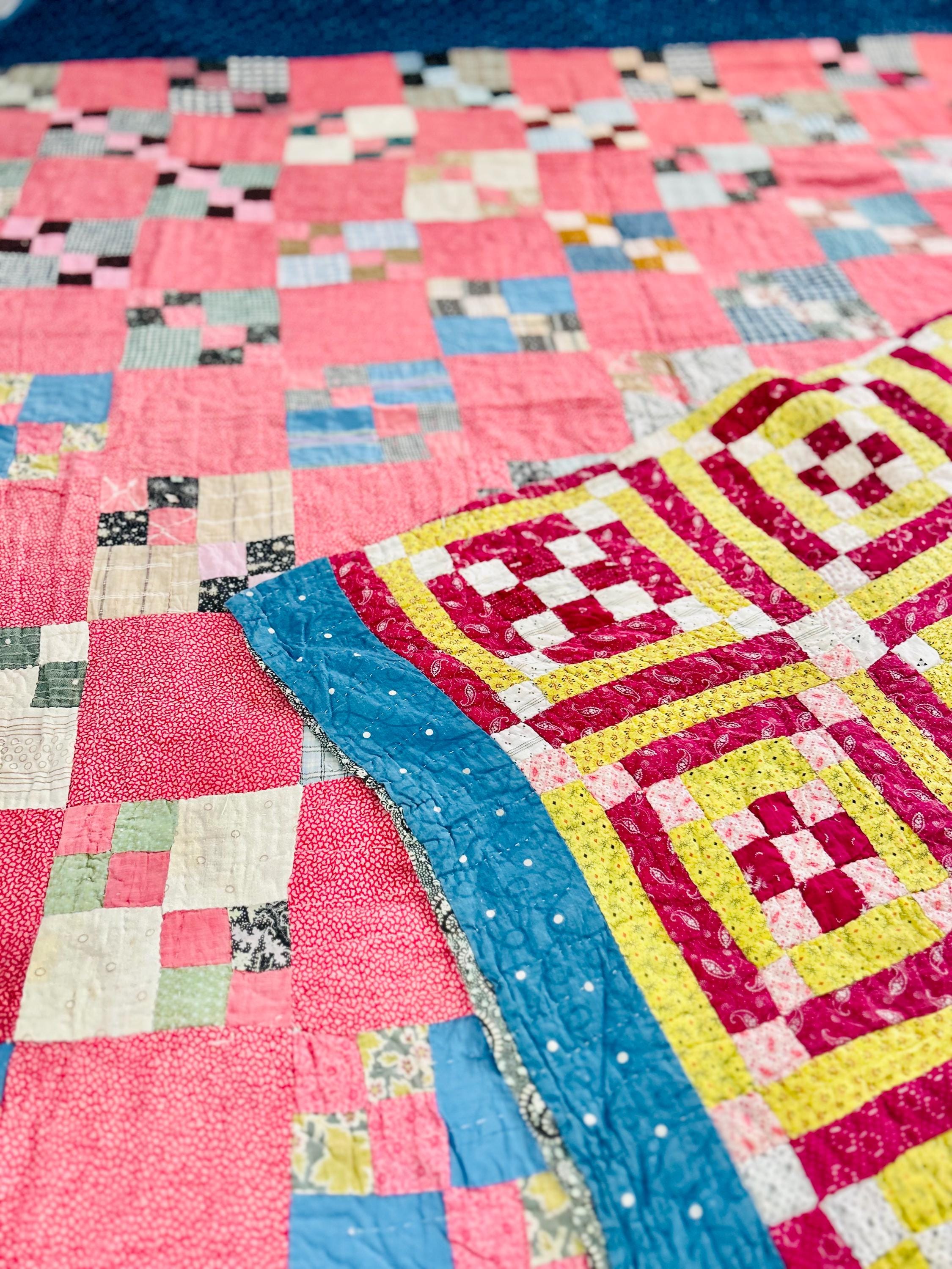 This wonderful Double Sided Quilt, circa 1890s, is a Double-Nine-Patch with Courthouse Steps on one side, and a Scrappy Double Four-Patch Quilt pattern on the flip side. The hand-quilting is in outlines of the patchwork on the Double-Nine Patch side of the quilt. This is a delightful and precious quilt, but it is in no way sophisticated or finely crafted. The quilting is mostly straight, but some of the patchwork curves where it's probably supposed to be straight and vice versa, adding to its considerable charm.