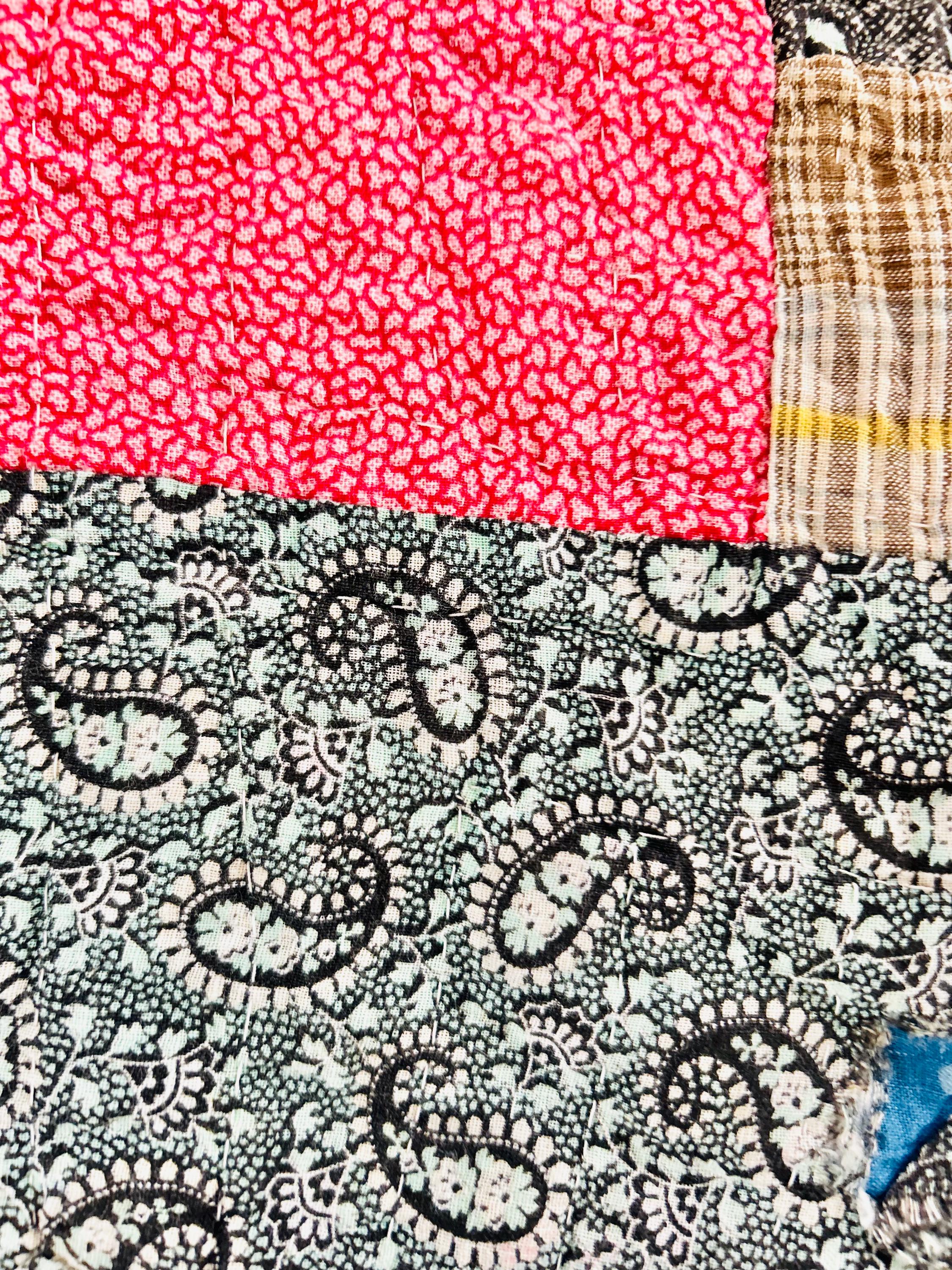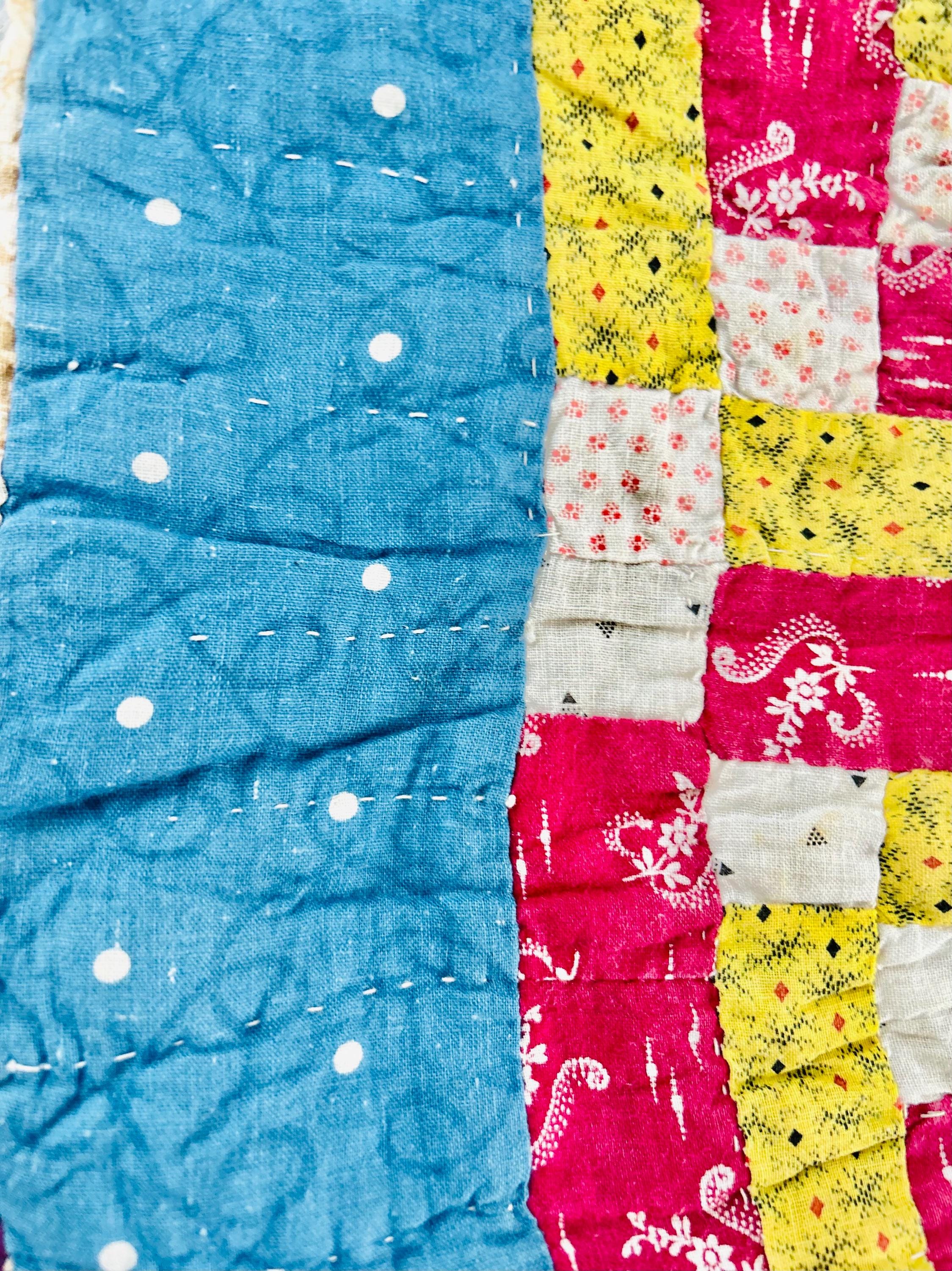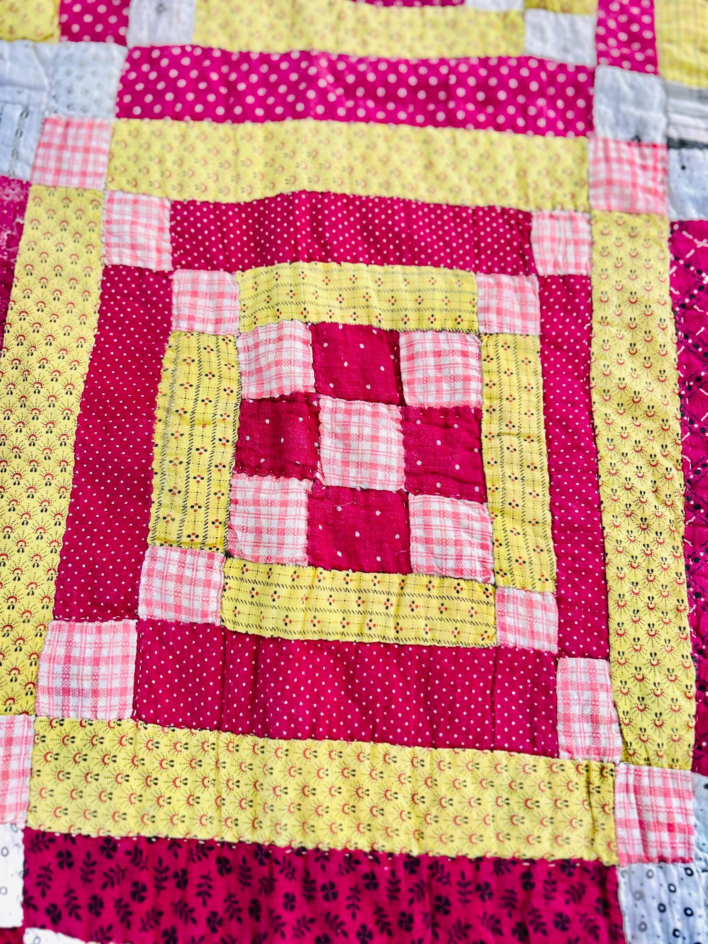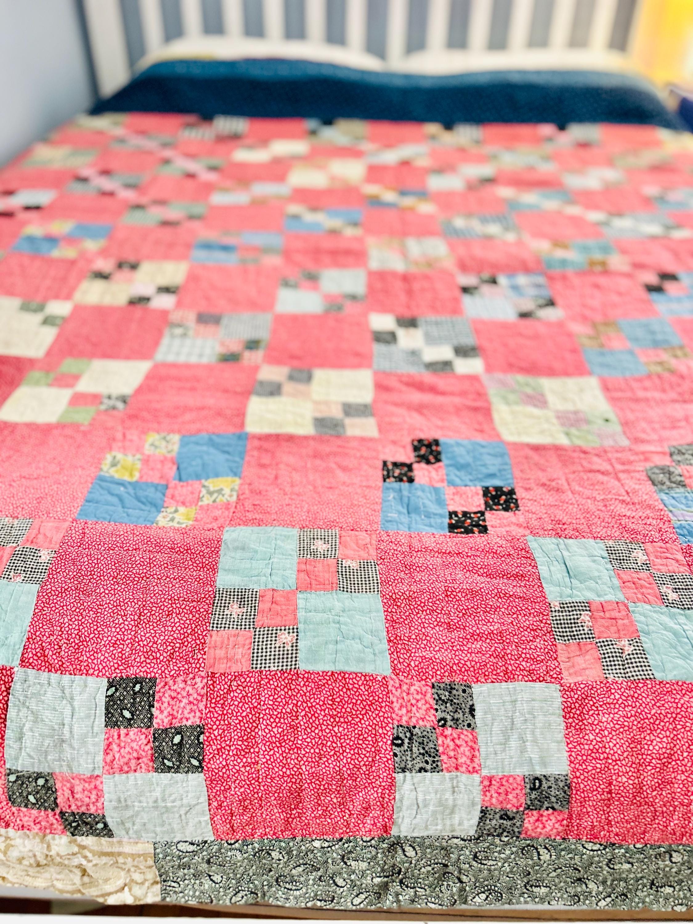 This wonderful Double Sided Quilt, circa 1890s, is a Double-Nine-Patch with Courthouse Steps on one side, and a Scrappy Double Four-Patch Quilt pattern on the flip side. The hand-quilting is in outlines of the patchwork on the Double-Nine Patch side of the quilt. This is a delightful and precious quilt, but it is in no way sophisticated or finely crafted. The quilting is mostly straight, but some of the patchwork curves where it's probably supposed to be straight and vice versa, adding to its considerable charm.