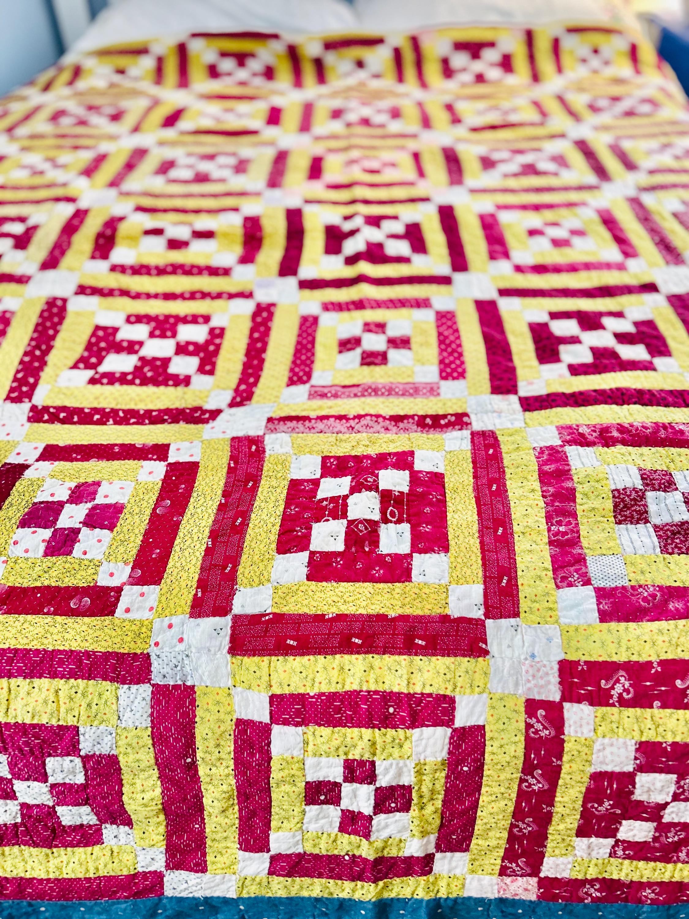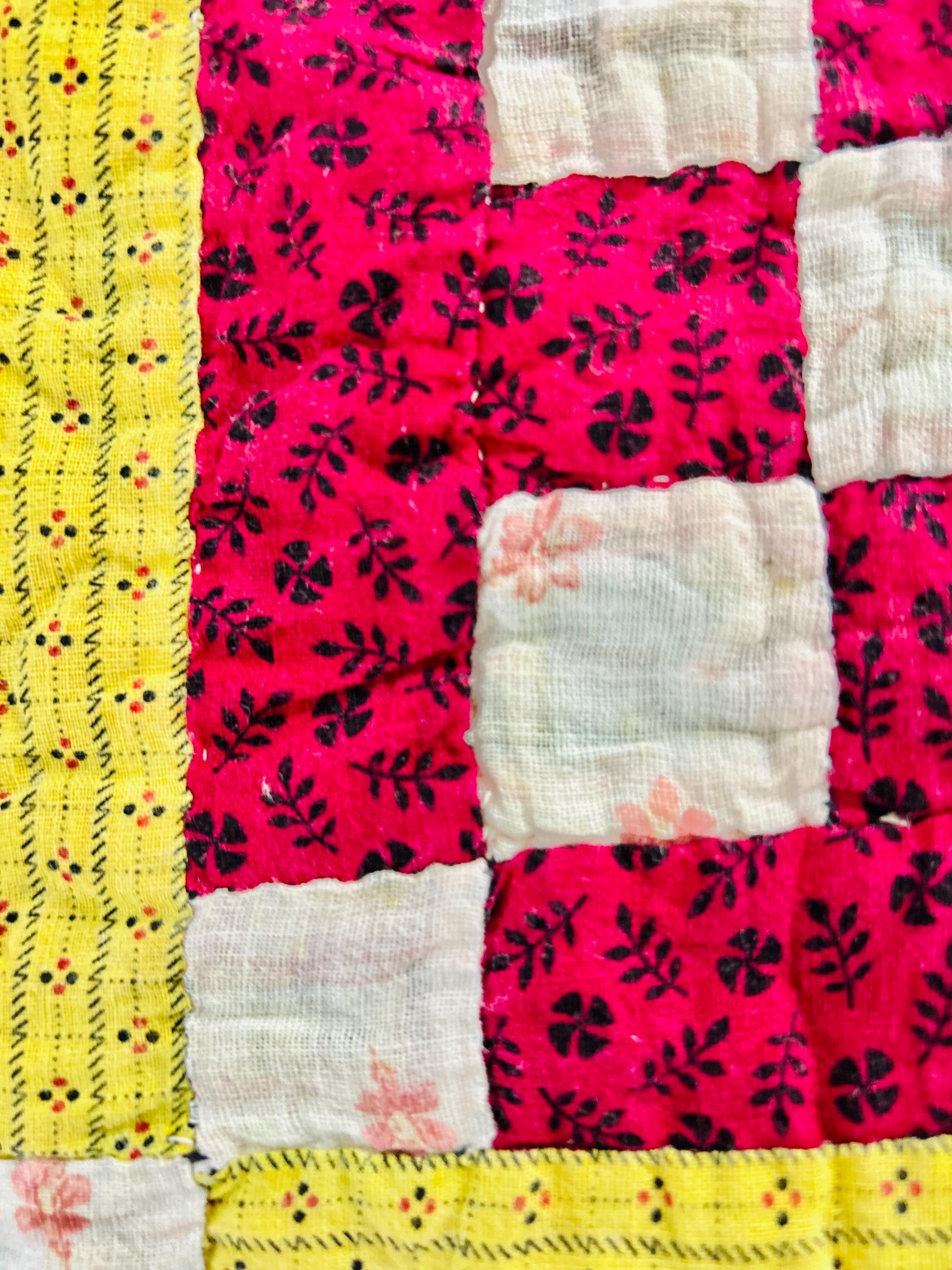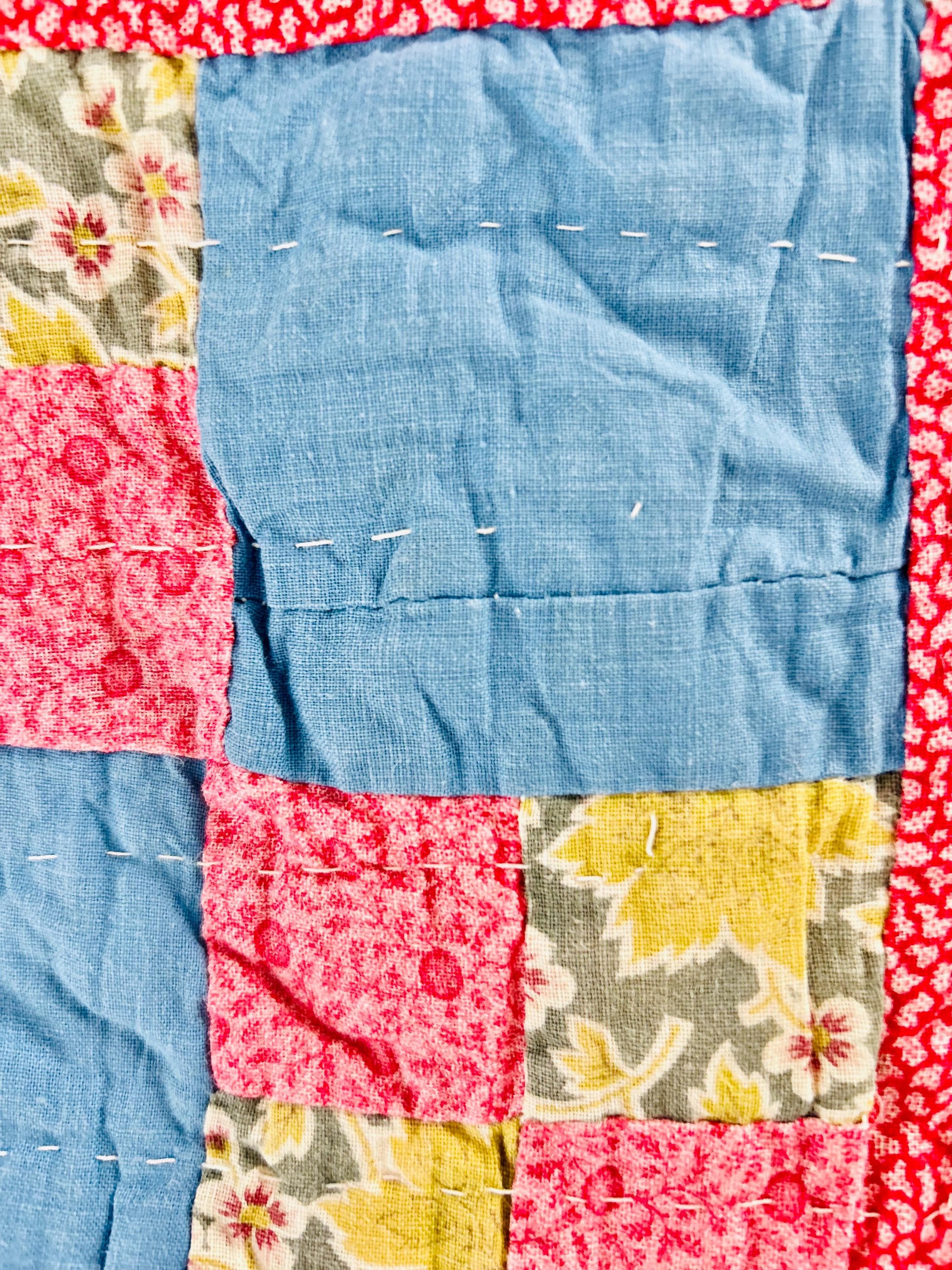 The edges of the Double Nine Patch side have been turned to the back and hand-stitched to form the binding. The cotton batting is unsized and lightweight.