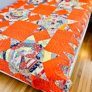 This unique quilt has been soaked, hand-washed and line-dried and measures 68 inches by 79 inches. From a smoke-free, pet-free home. Shown on a queen-size bed.