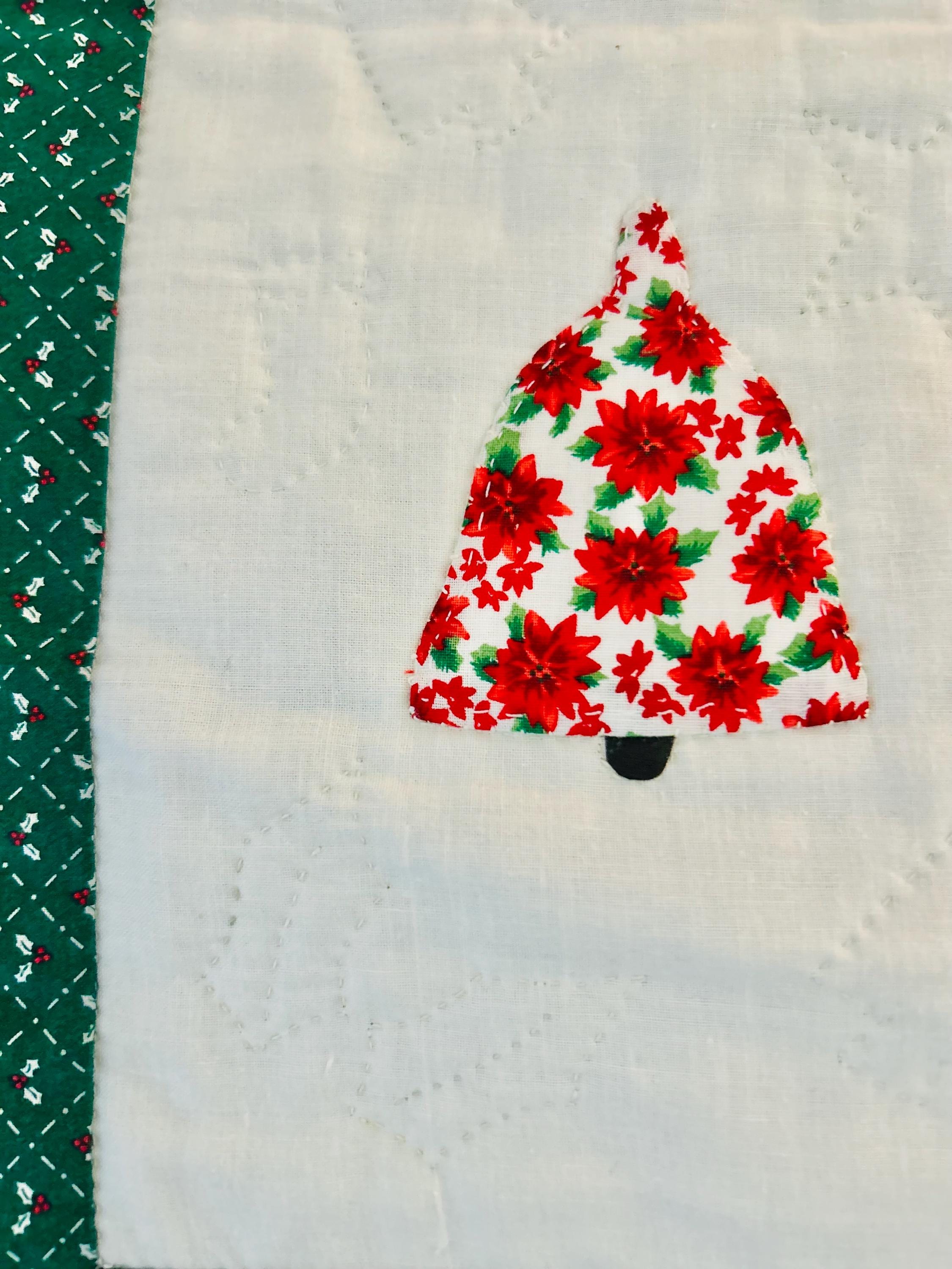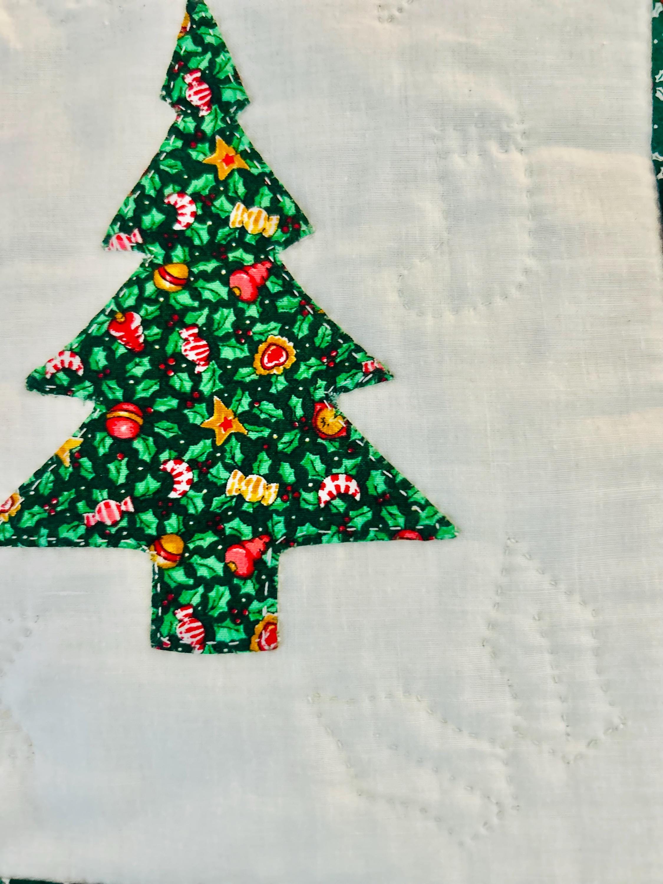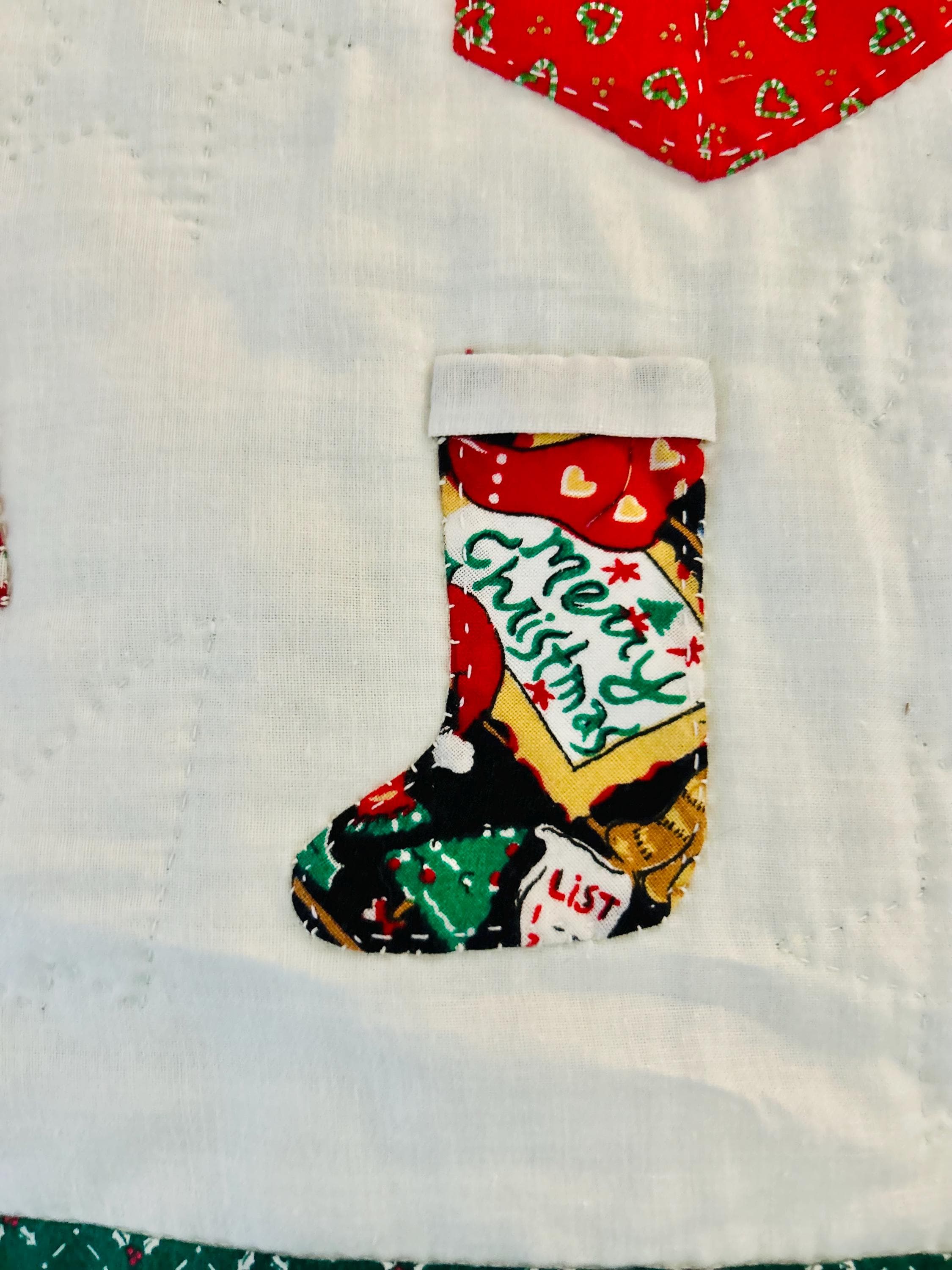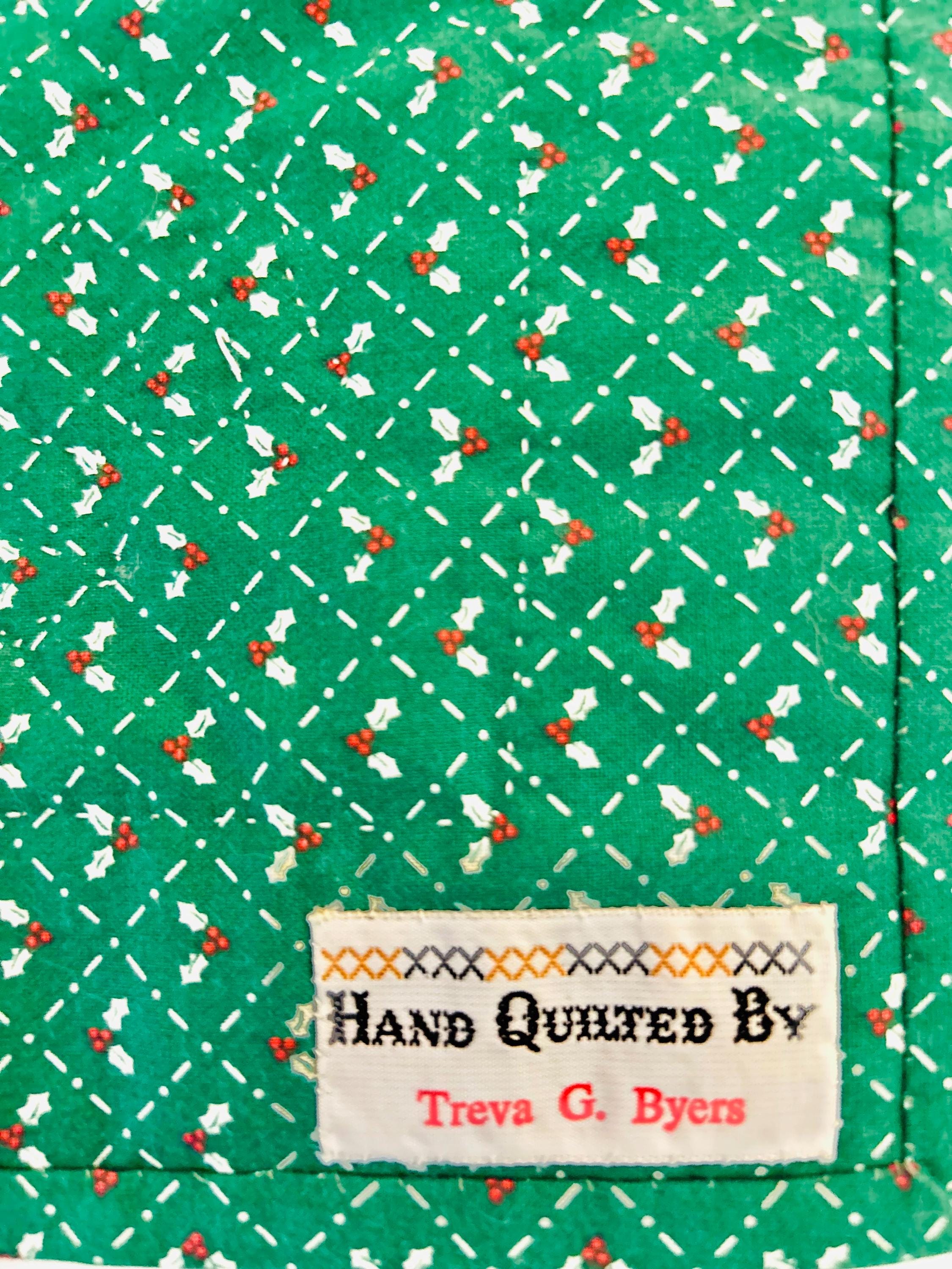 Vintage Hand-Appliqued and Hand-Quilted Christmas Table Mat or Table Runner. Signed Treva G. Byers. The hand-quilting is in stars, Christmas stockings, Holly and arrows.