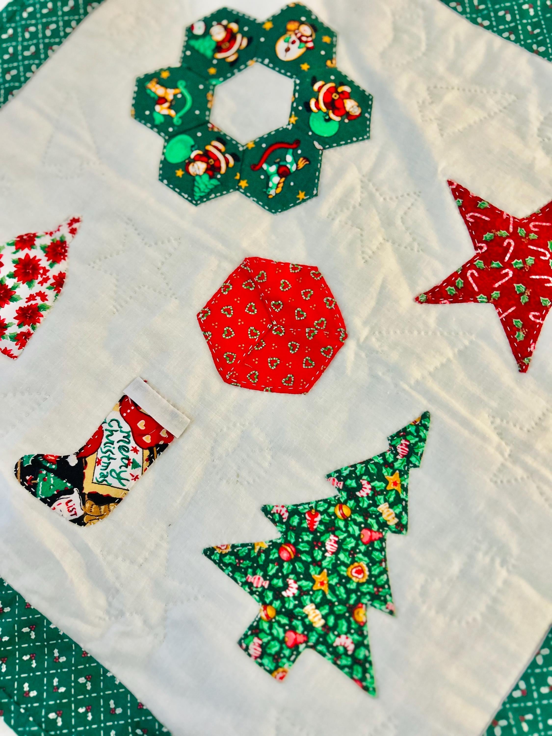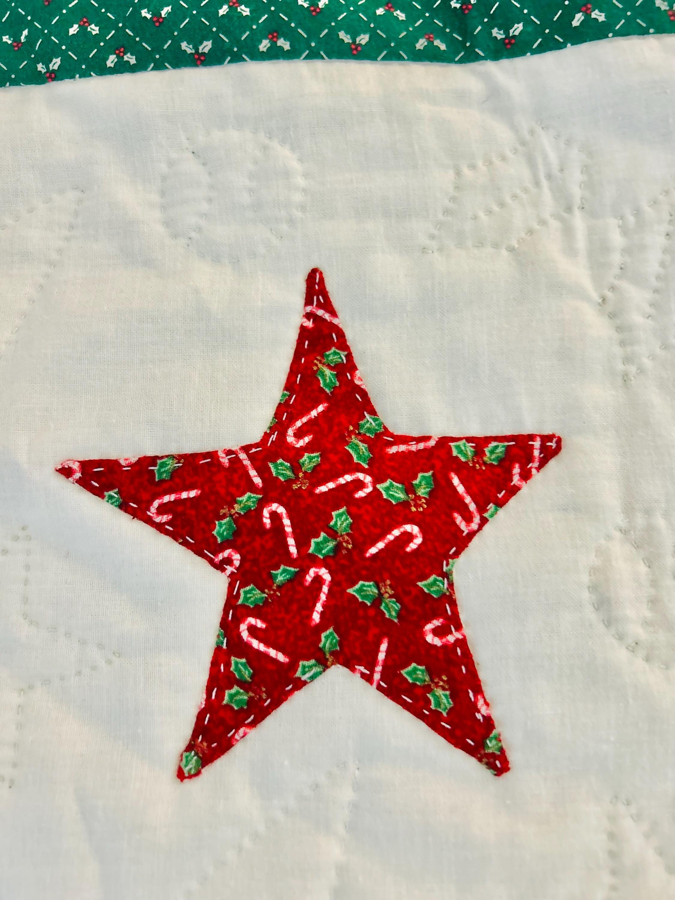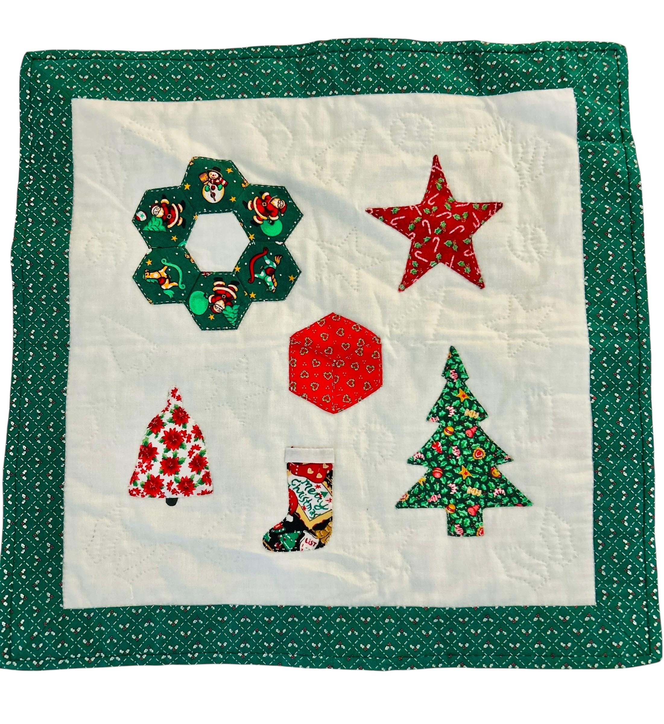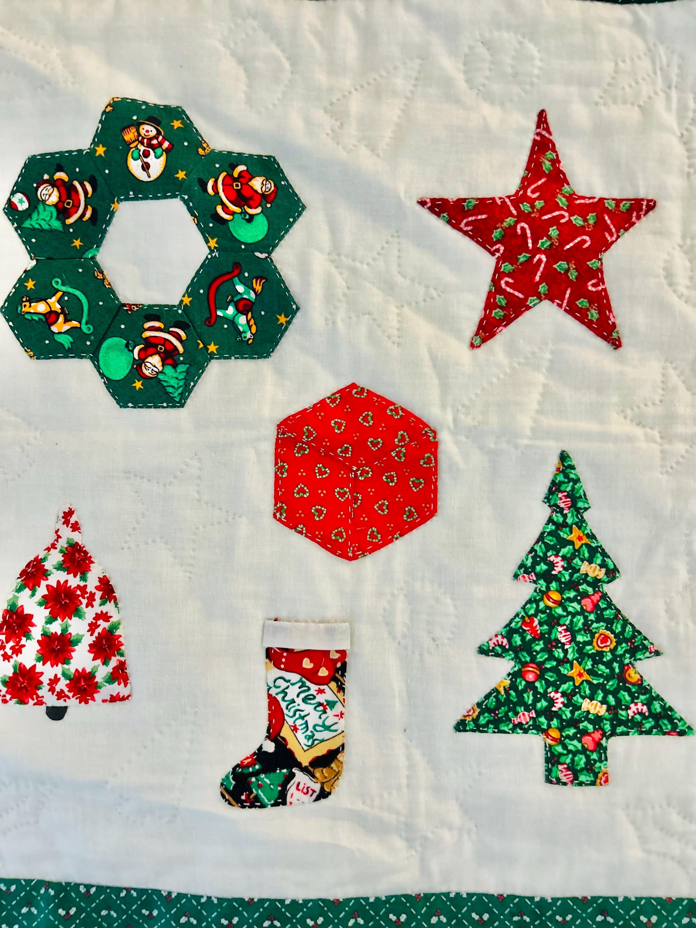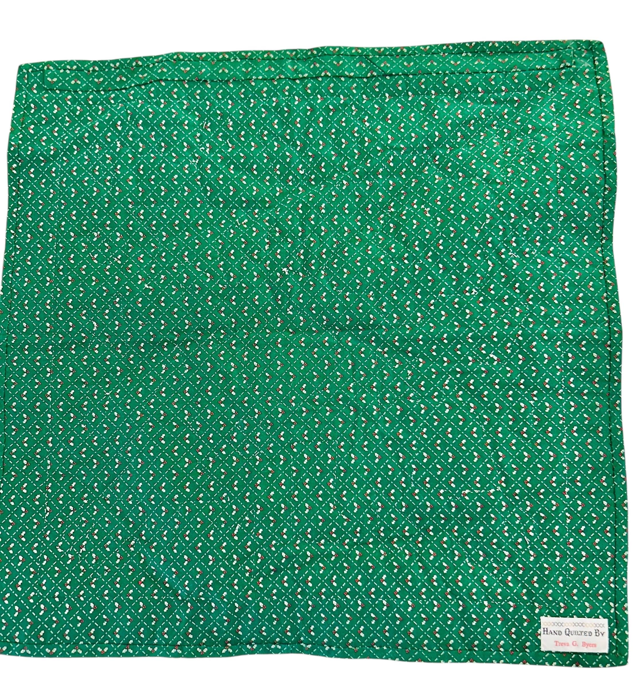 Vintage Hand-Appliqued and Hand-Quilted Christmas Table Mat or Table Runner. Signed Treva G. Byers. The hand-quilting is in stars, Christmas stockings, Holly and arrows.