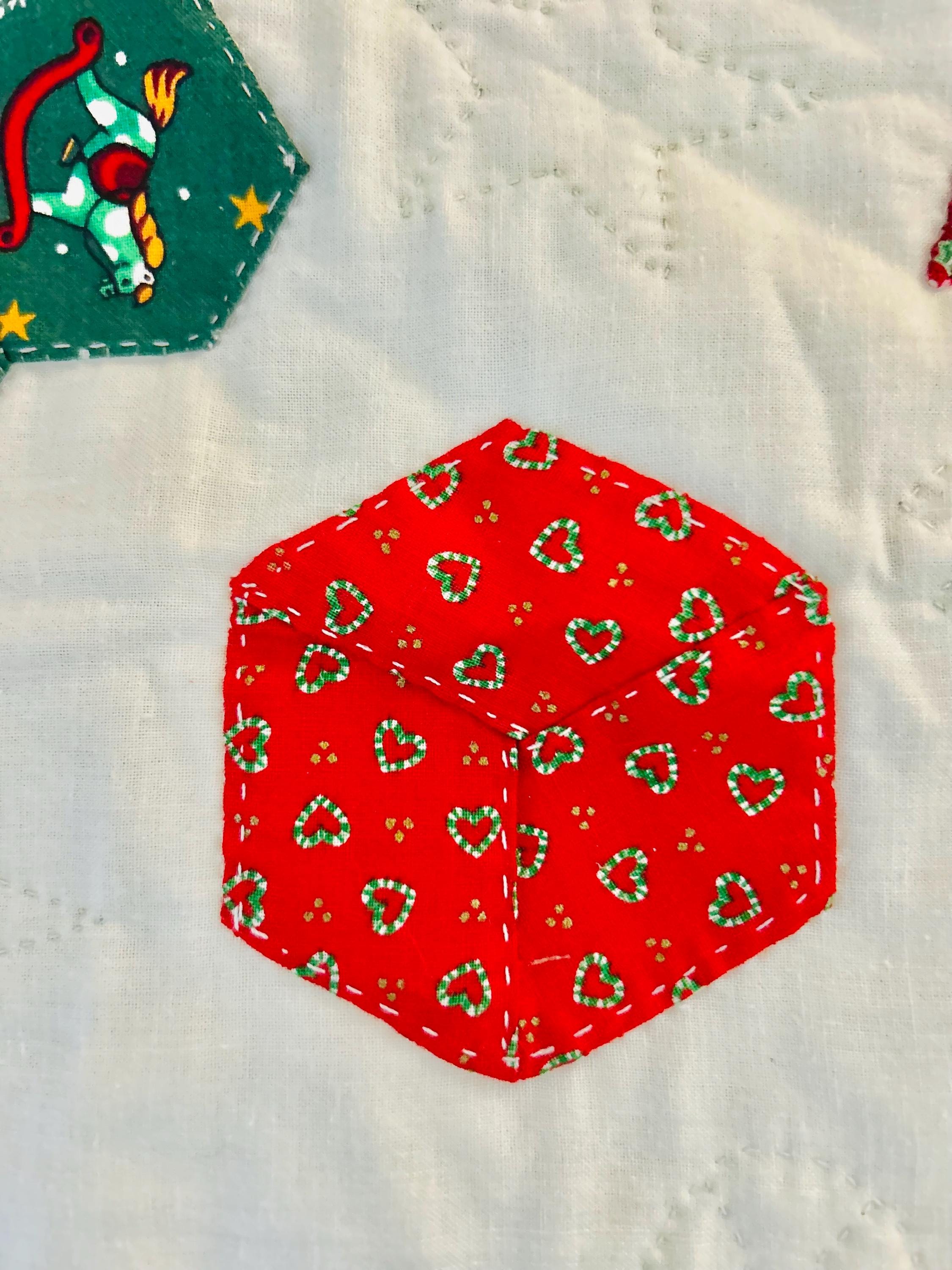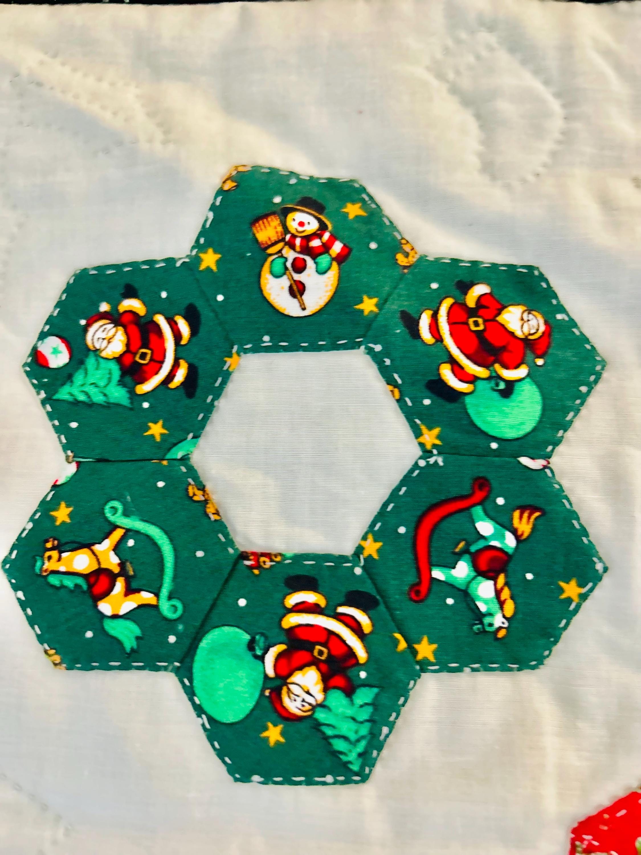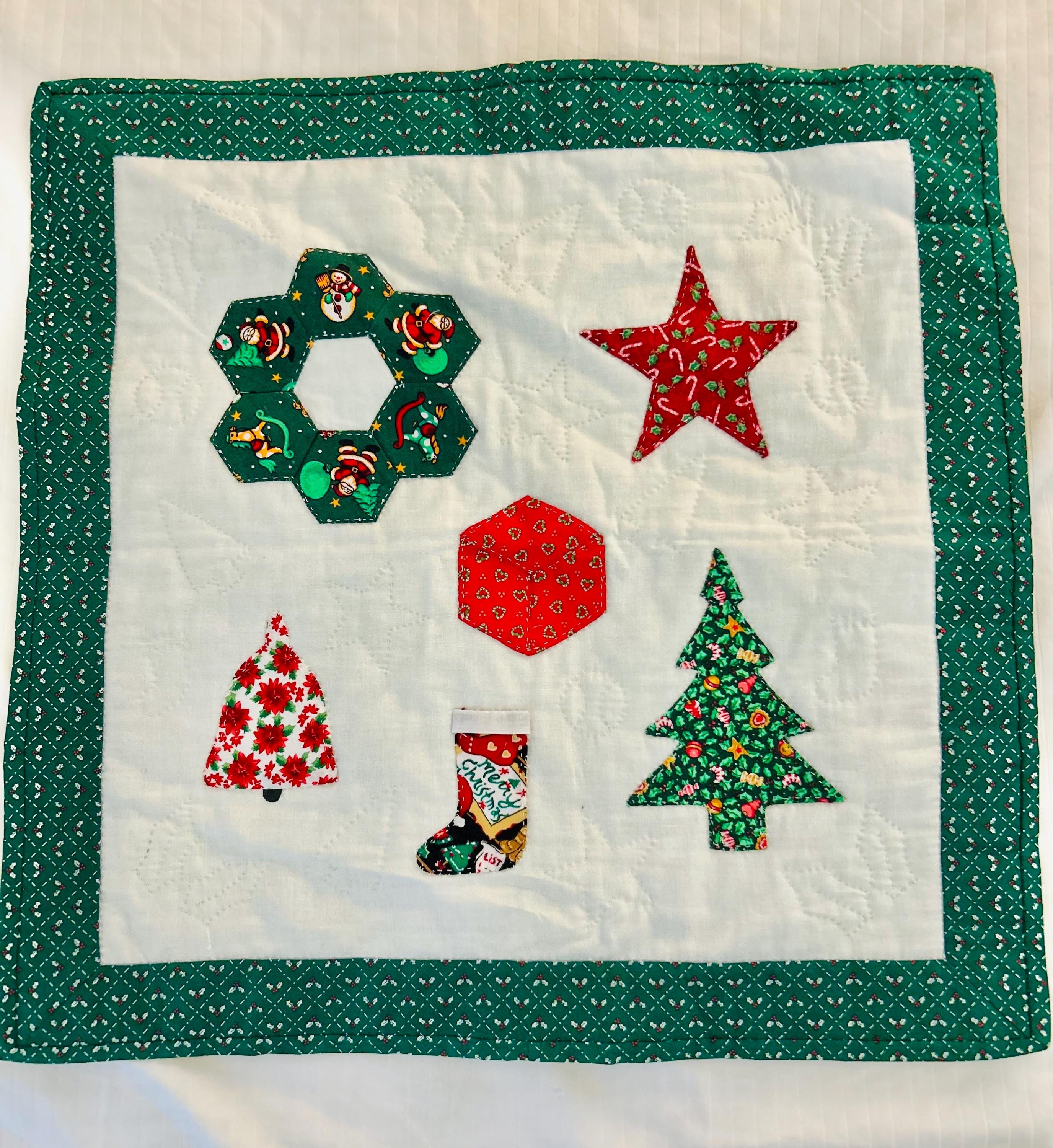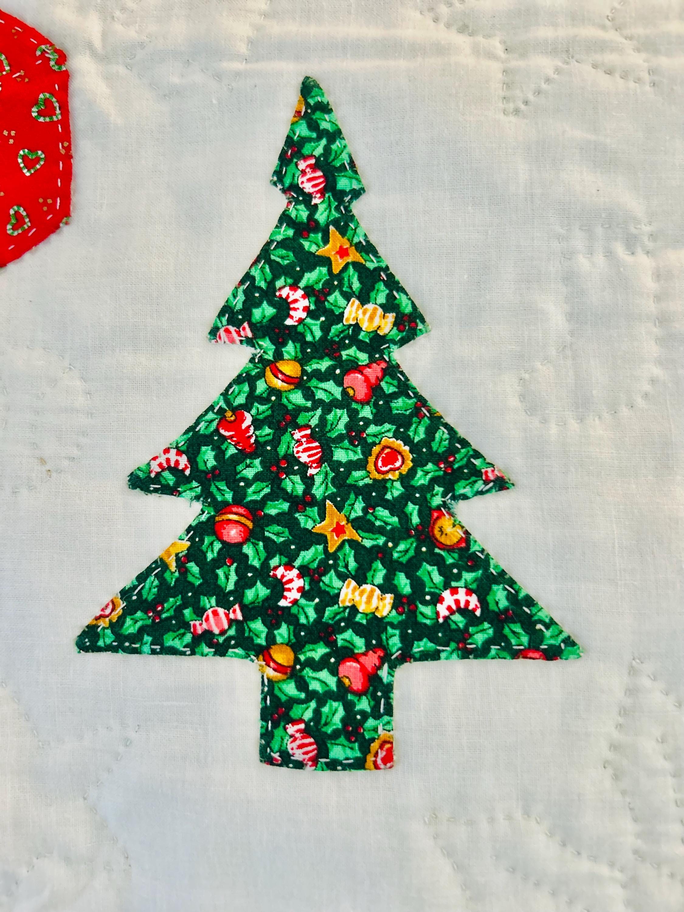 Vintage Hand-Appliqued and Hand-Quilted Christmas Table Mat or Table Runner. Signed Treva G. Byers. The hand-quilting is in stars, Christmas stockings, Holly and arrows.